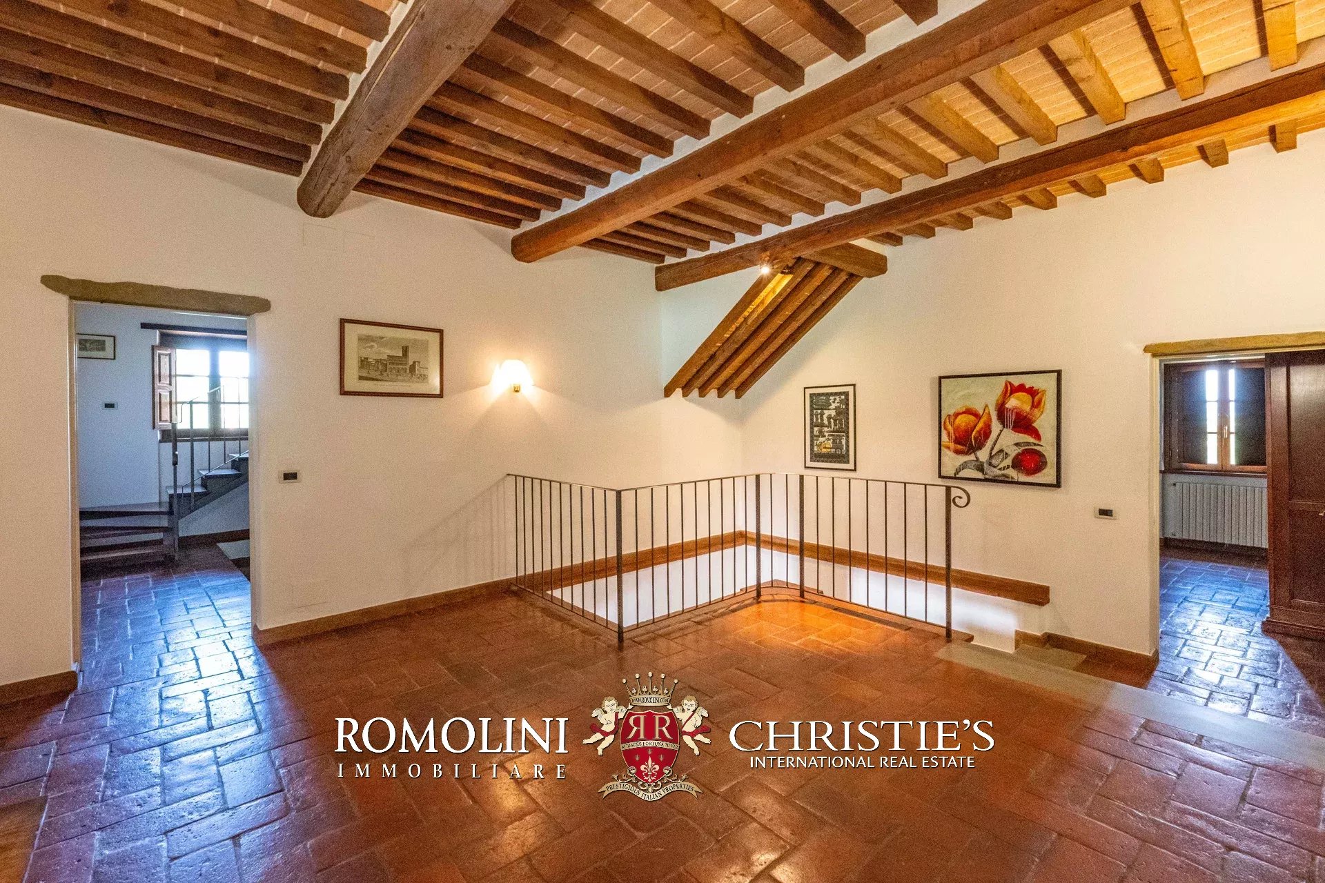- Piano primo: soggiorno con loggiato e terrazza con vista sul borgo di Lucignano, disimpegno centrale, studio privato, salottino e tre camere con bagno privato;