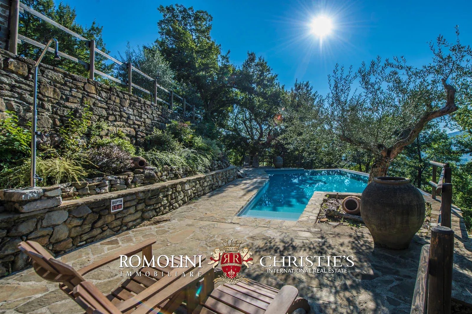 La piscina 8 × 4 m ha una forma irregolare e dispone di comodi scalini di accesso e di doccia esterna. Sono presenti, inoltre, un impianto di irrigazione e un impianto di illuminazione.