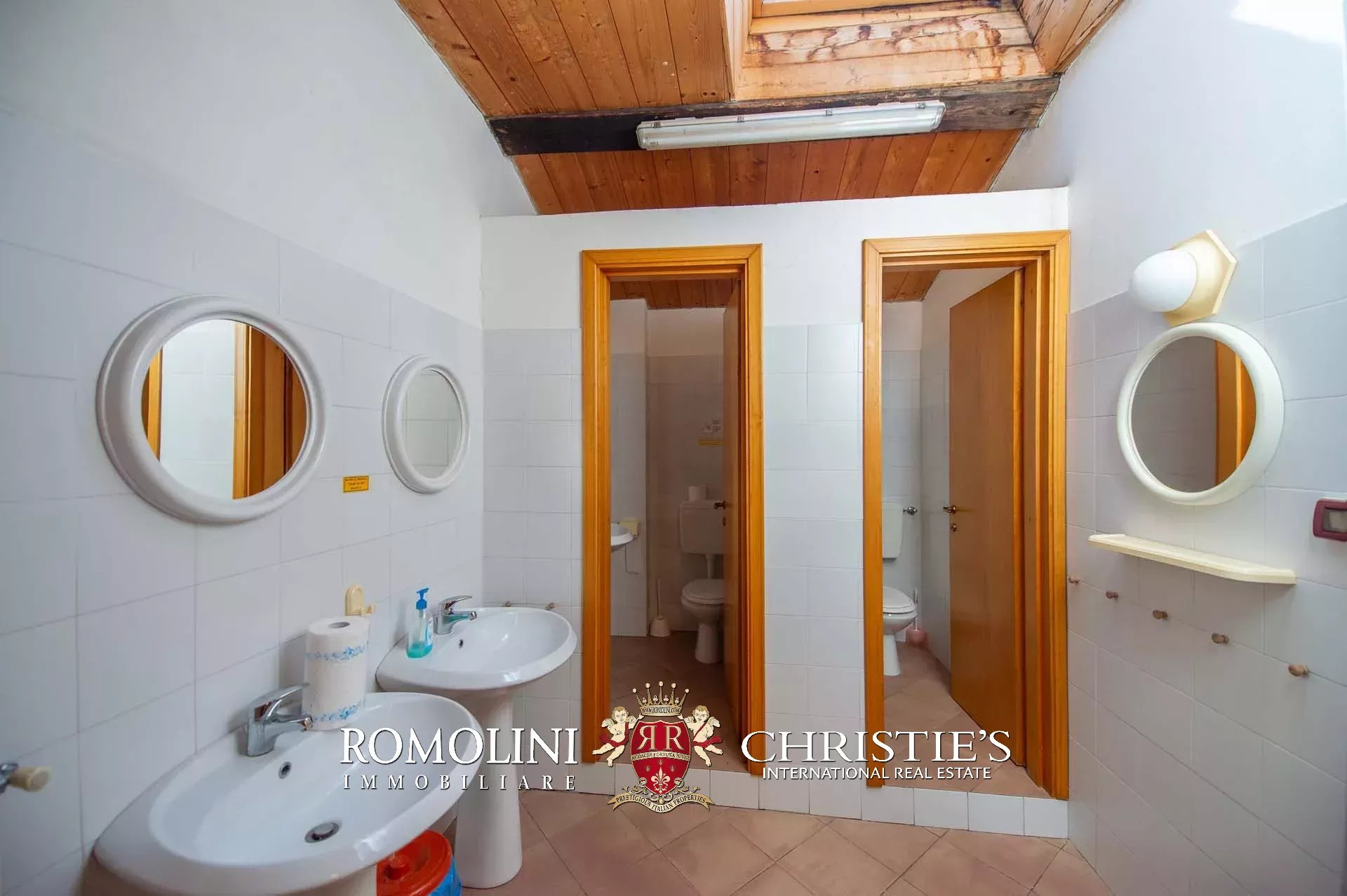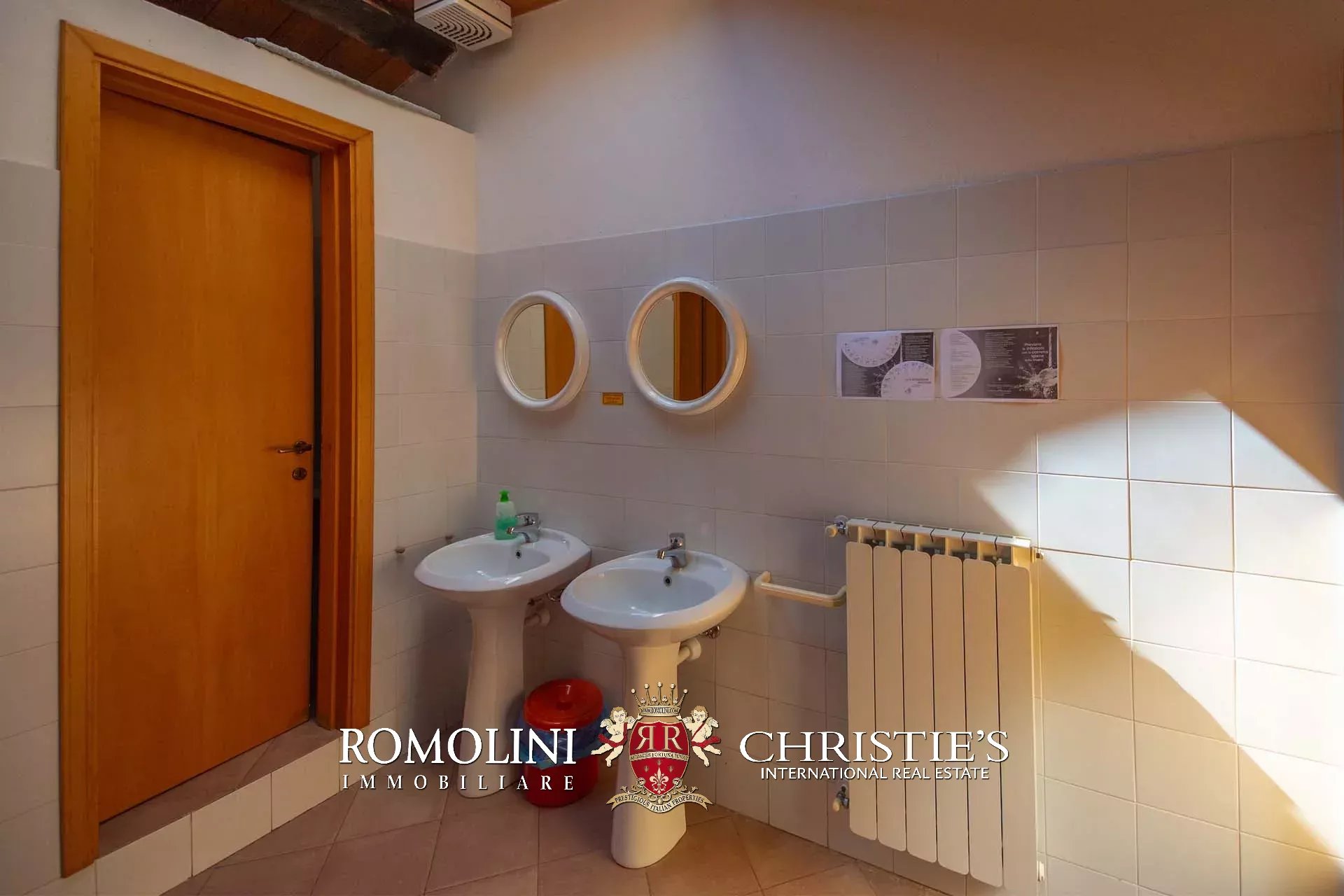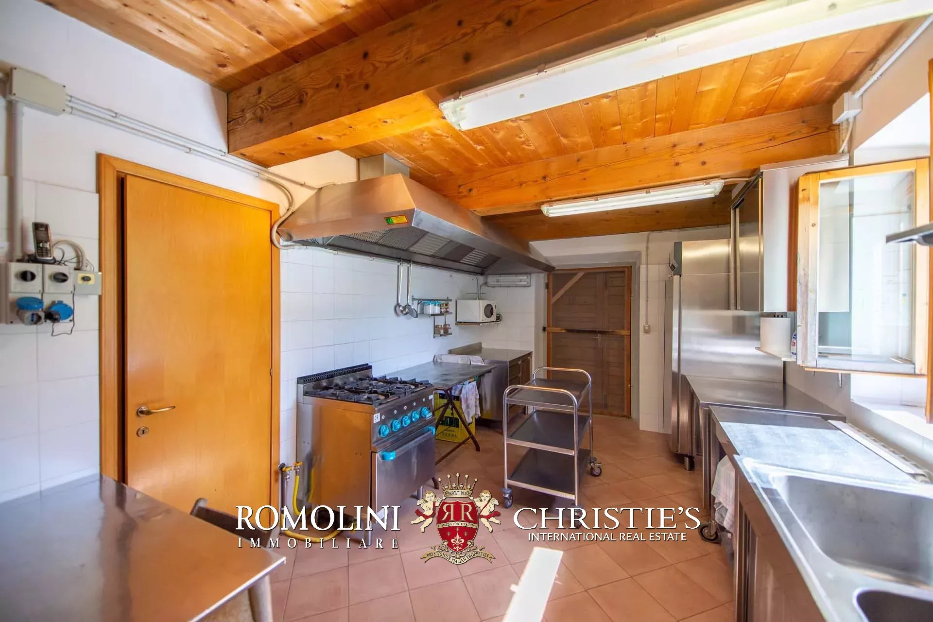 Nella parte ovest della casa al piano terreno sono presenti l’originale cucina con camino, due bagni e una cantina. Nella parte est sono invece presenti una stalla con sei box per cavalli, un magazzino e a nord un garage seminterrato a uso del proprietario. Al primo piano nella parte occidentale si trova l’appartamento della famiglia del titolare, mentre quella orientale è ad uso agrituristico con accesso dal lato nord. Alla parte agrituristica si accede attraverso una loggia aperta di circa 50 mq. Nell’ingresso si trovano un locale adibito a direzione, la scala di accesso al secondo piano, e l’ingresso della grande sala da pranzo. Allo stesso piano si trova la cucina del ristorante, con la dispensa e un bagno di servizio. Il secondo piano è riservato alle camere e ai bagni per gli ospiti dell’agriturismo. La soffitta a cui si accede con scala a pioli è in parte abitabile.