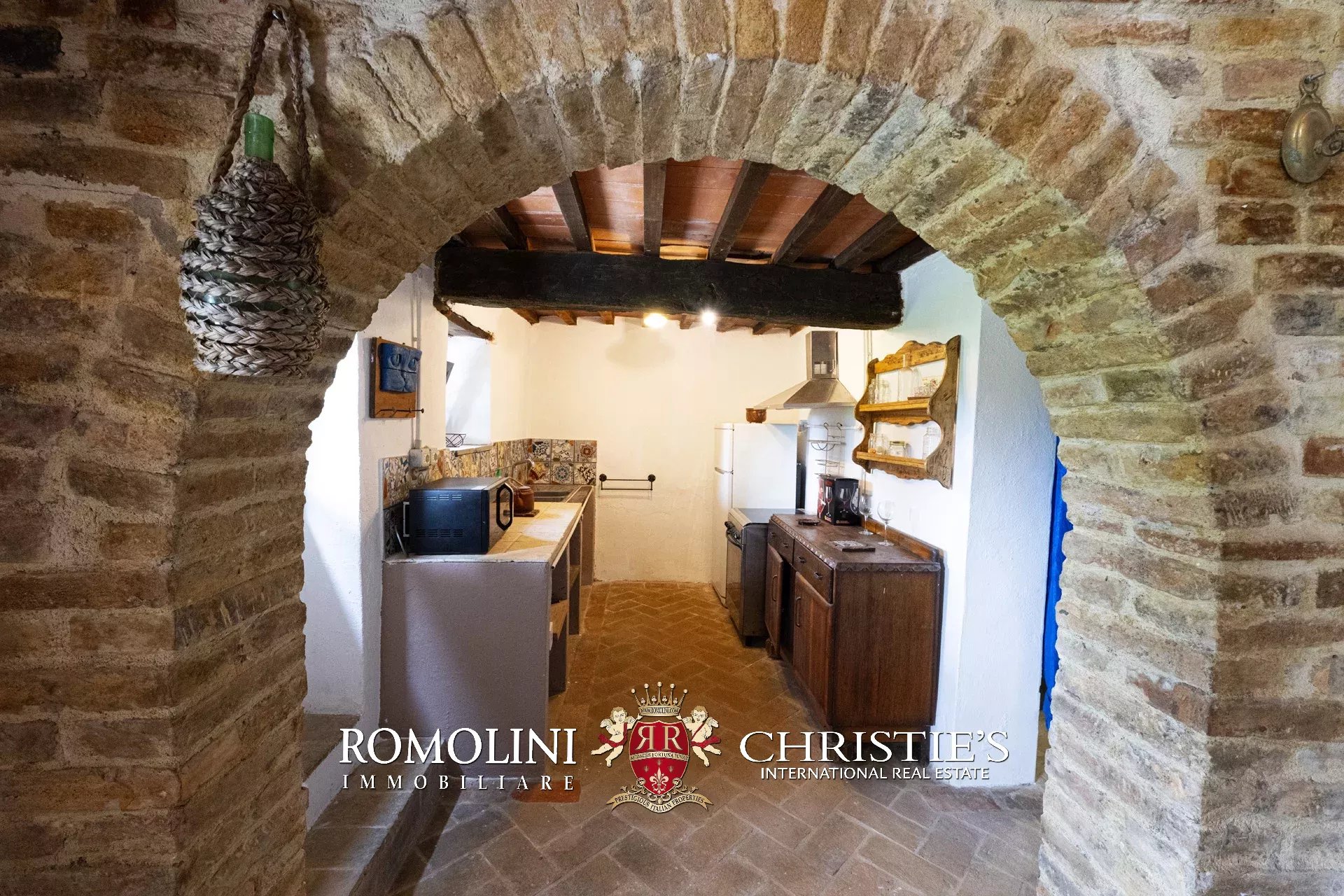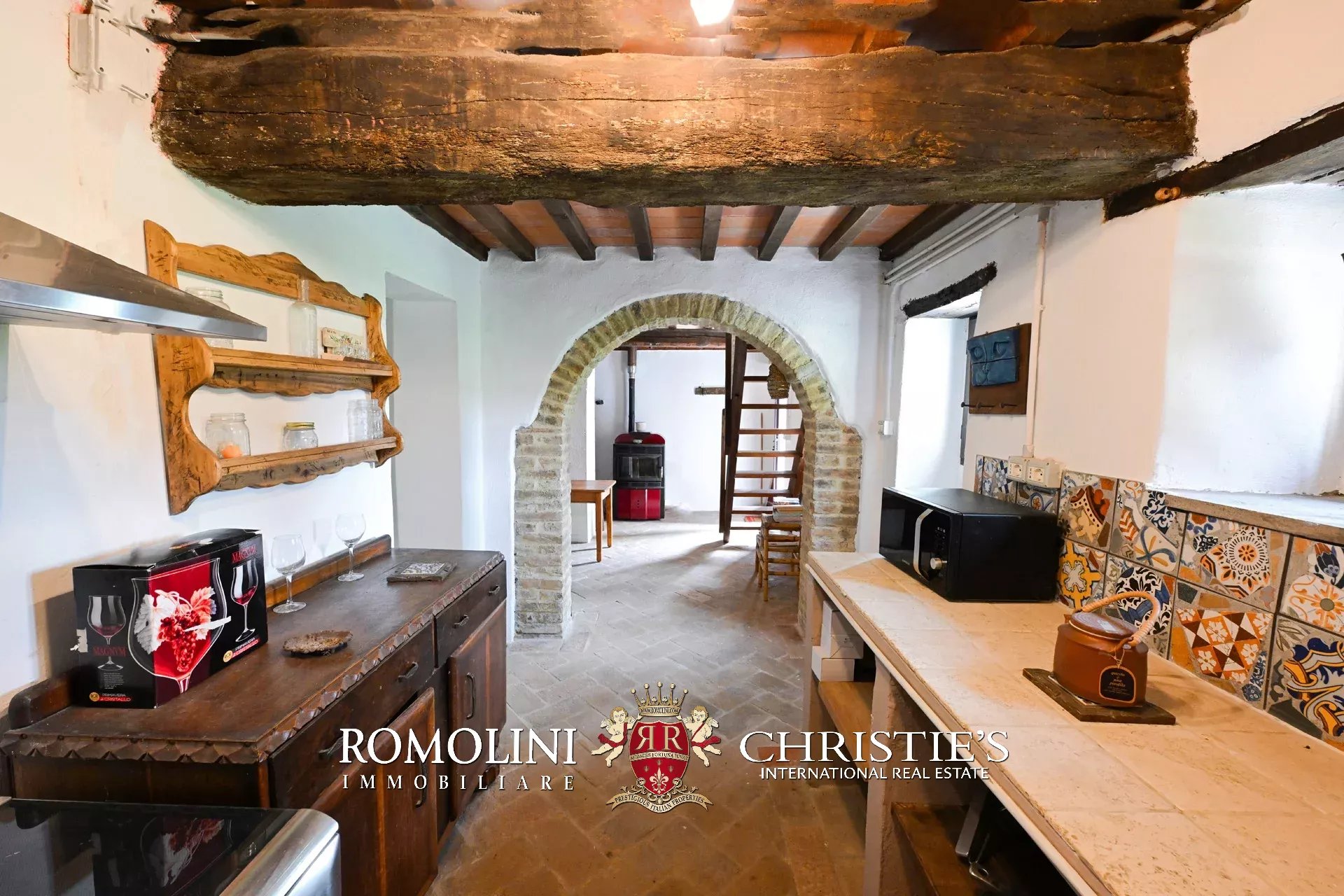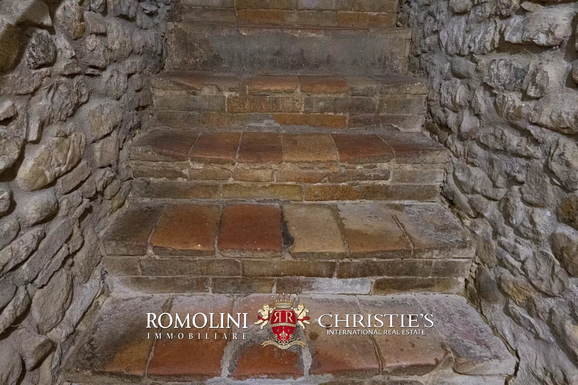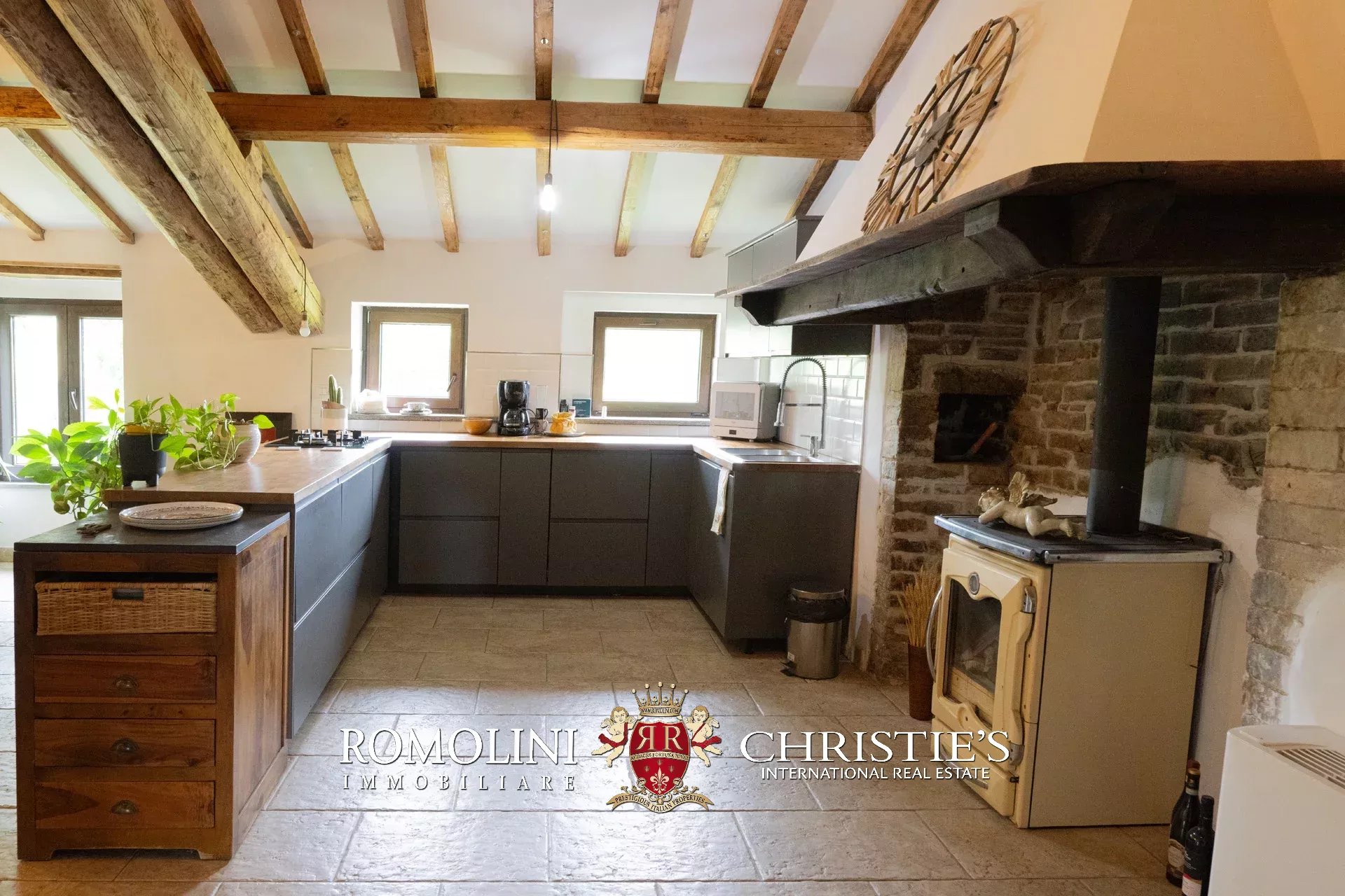 Le facciate esterne del casale sono rivestite in pietra tipica della zona, impreziosite da stuccature tono su tono che ne esaltano l’armonia cromatica. All'interno, i sottosolai presentano le tradizionali travature in legno, che conferiscono un tocco di autenticità e calore agli ambienti. Gli archi in mattoncini e le scale in cotto originale aggiungono un ulteriore elemento di charme e storicità.