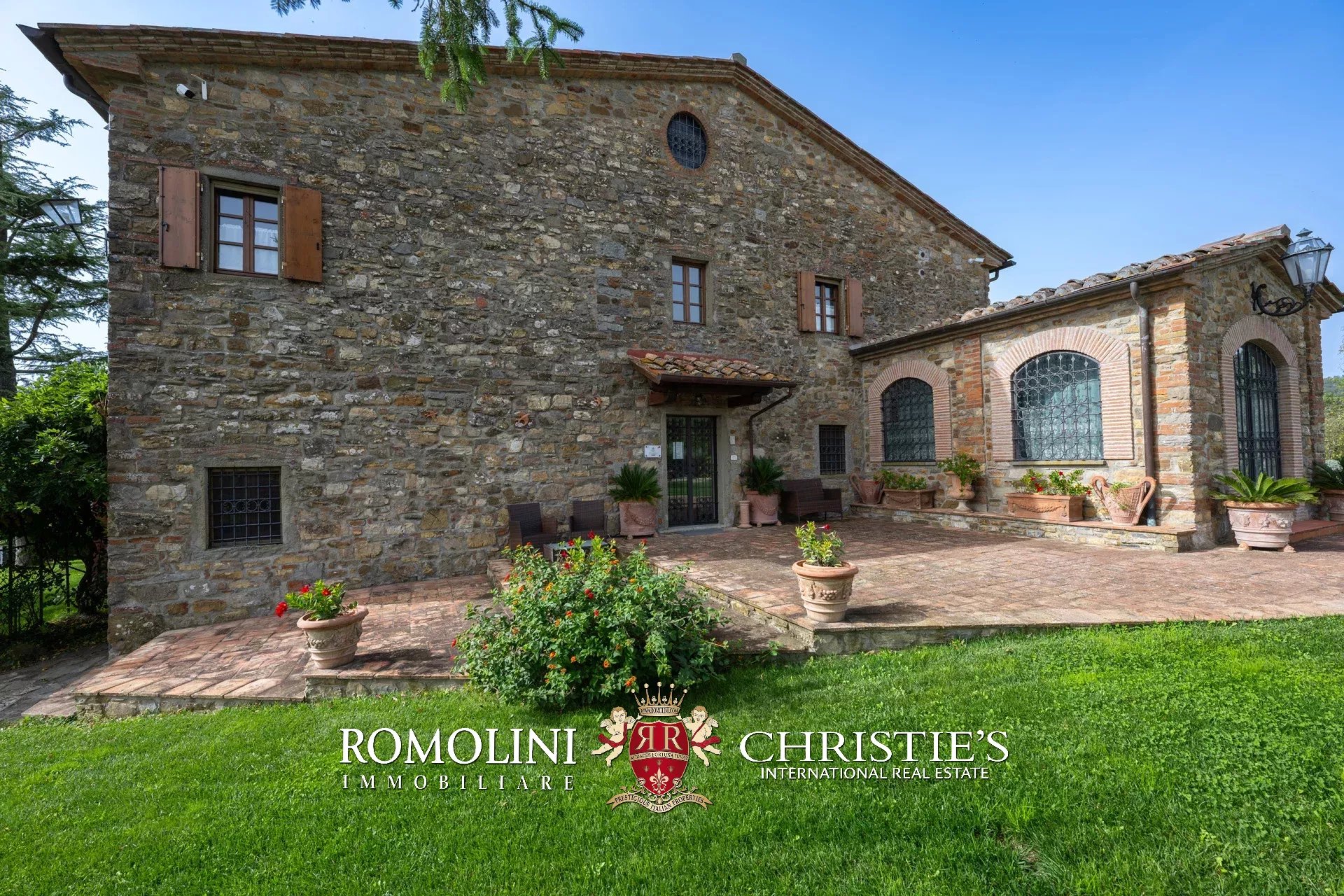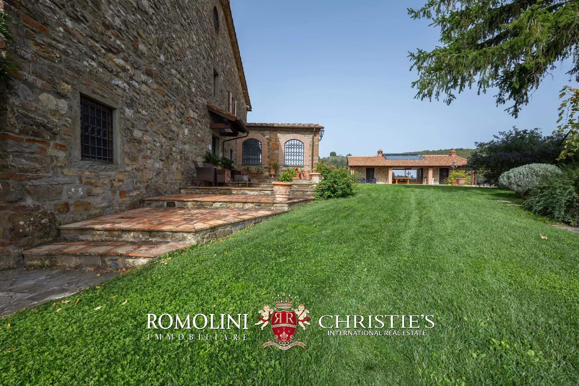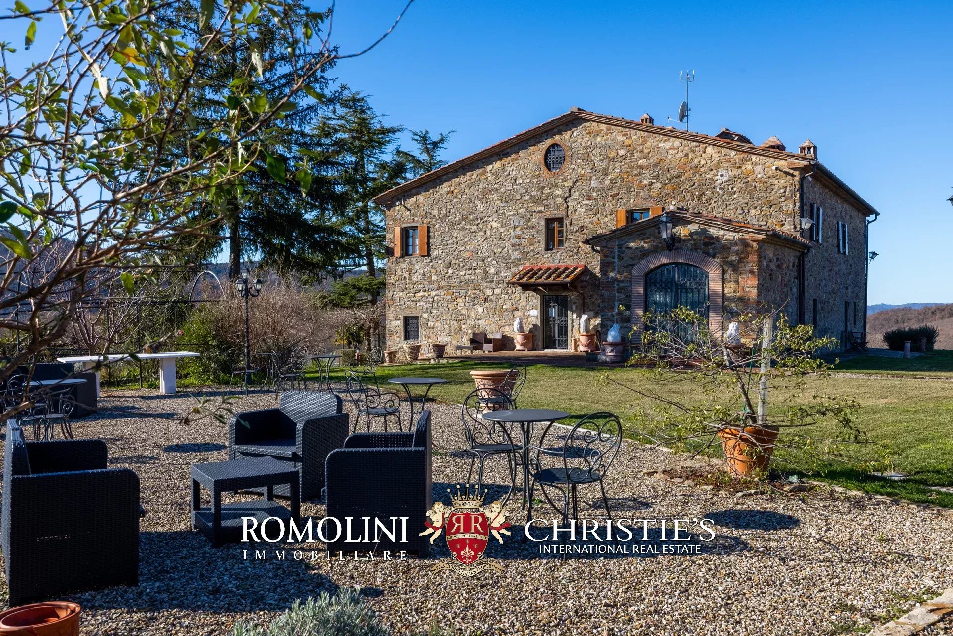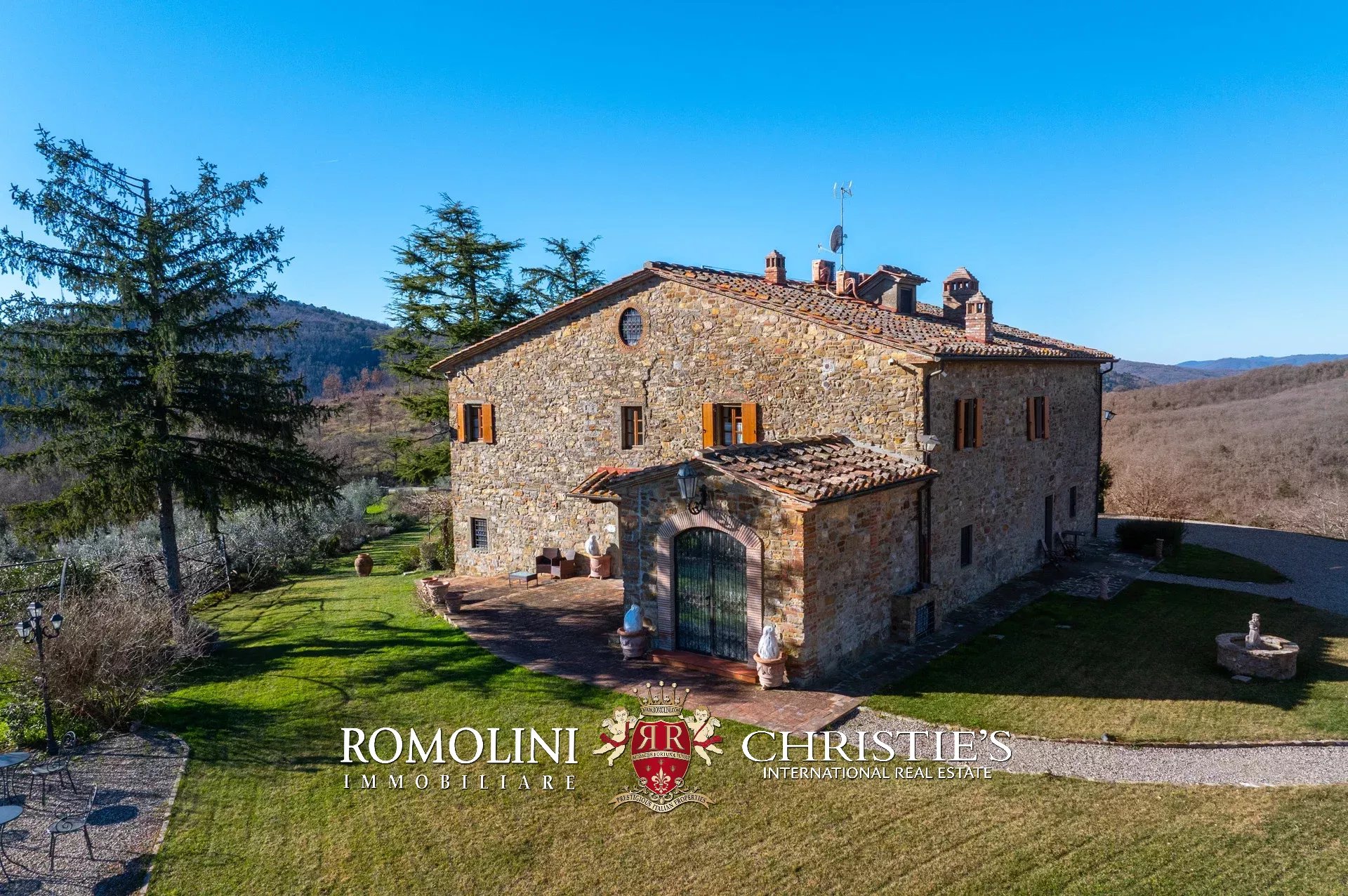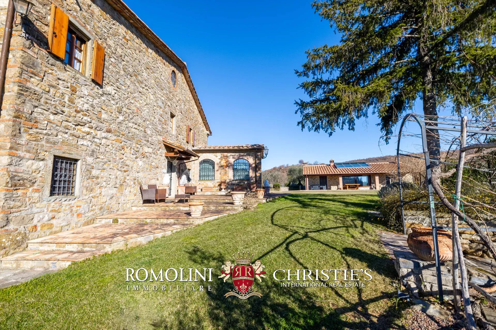 La villa (550 m², 5 camere e 6 bagni) è un grande edificio rustico in pietra, anticamente una torre longobarda, interamente ristrutturato nel 2021 e disposto su tre livelli. Al piano terra si trova un grande soggiorno con camino (originariamente la stalla per le vacche chianine da lavoro) disimpegno con forno a legna, cucina professionale con dispensa, bagno e camera con bagno en-suite corredata di zona giorno ricavata dalla chiusura di un’antica loggia. Un locale accessorio accessibile dall’esterno è dedicato a centrale termica ed accoglie la moderna ed efficiente caldaia a pellet utilizzata per il riscaldamento e la produzione di acqua calda sanitaria nella casa principale e nella dependance. Un portico di 45 m² completa l’edificio sul lato sud.
