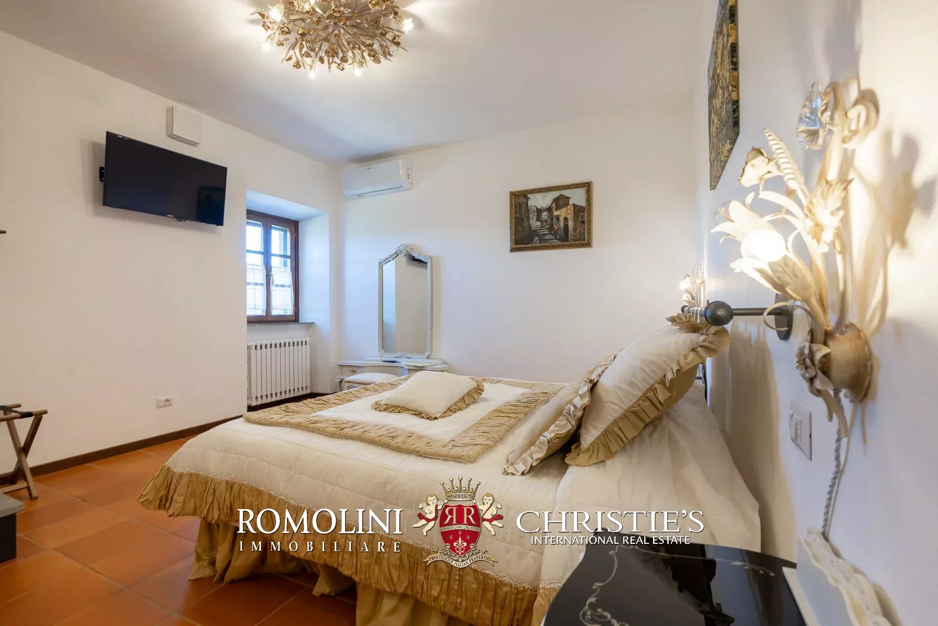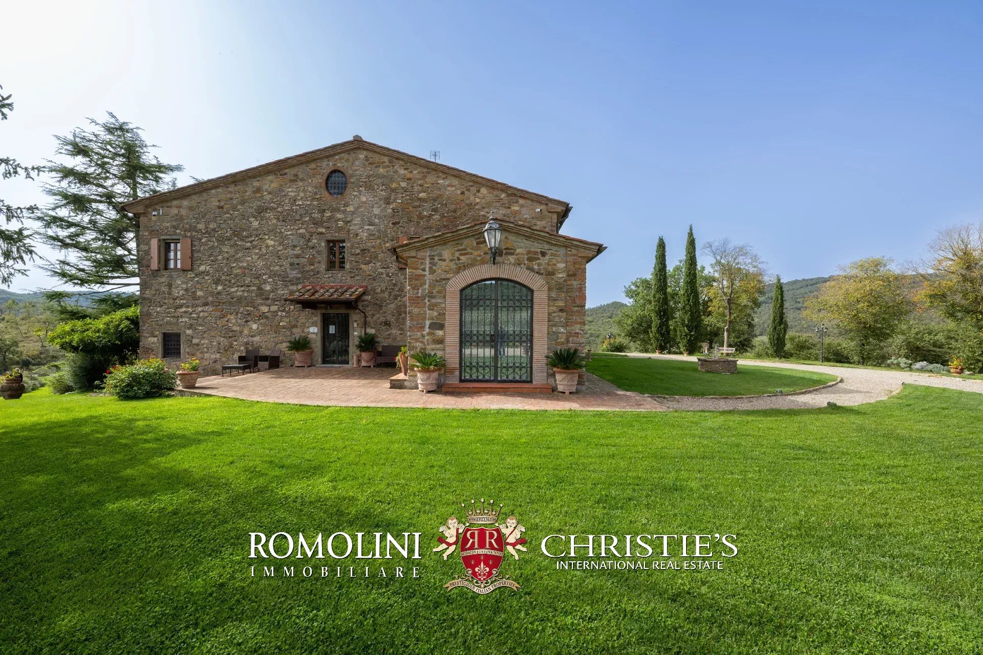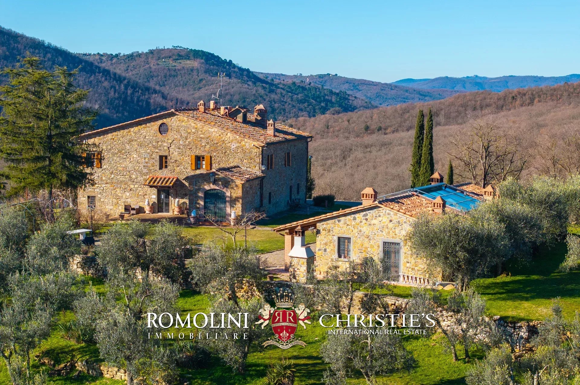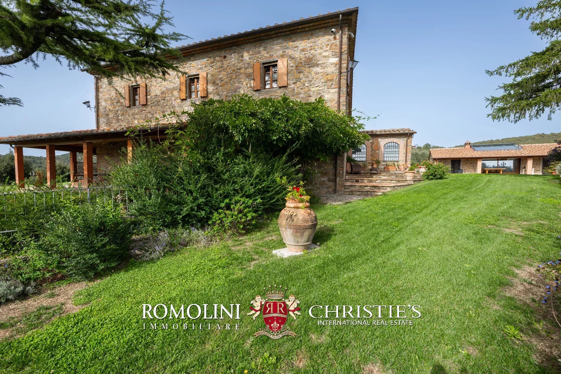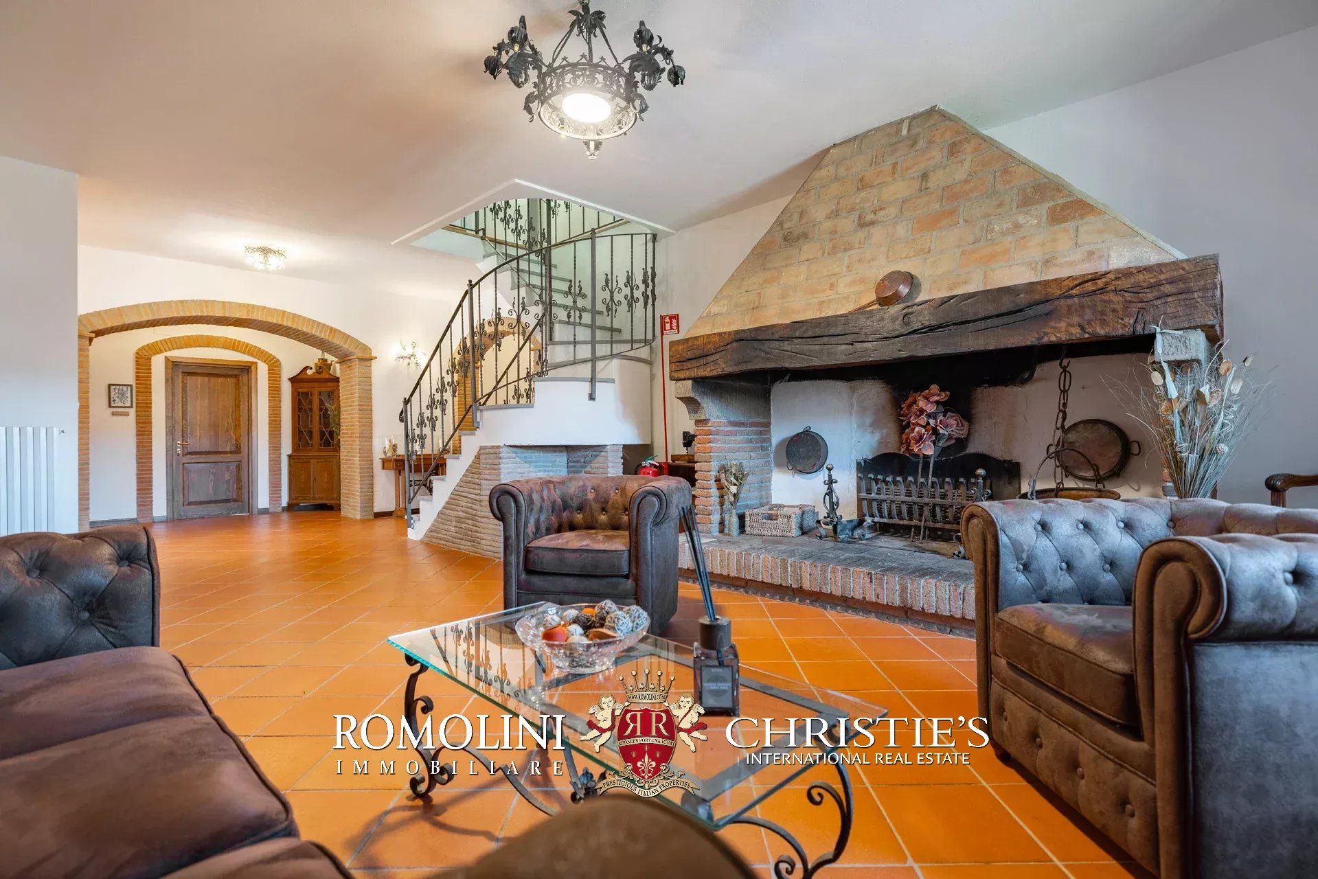 La villa (550 m², 5 camere e 6 bagni) è un grande edificio rustico in pietra, anticamente una torre longobarda, interamente ristrutturato nel 2021 e disposto su tre livelli. Al piano terra si trova un grande soggiorno con camino (originariamente la stalla per le vacche chianine da lavoro) disimpegno con forno a legna, cucina professionale con dispensa, bagno e camera con bagno en-suite corredata di zona giorno ricavata dalla chiusura di un’antica loggia. Un locale accessorio accessibile dall’esterno è dedicato a centrale termica ed accoglie la moderna ed efficiente caldaia a pellet utilizzata per il riscaldamento e la produzione di acqua calda sanitaria nella casa principale e nella dependance. Un portico di 45 m² completa l’edificio sul lato sud.