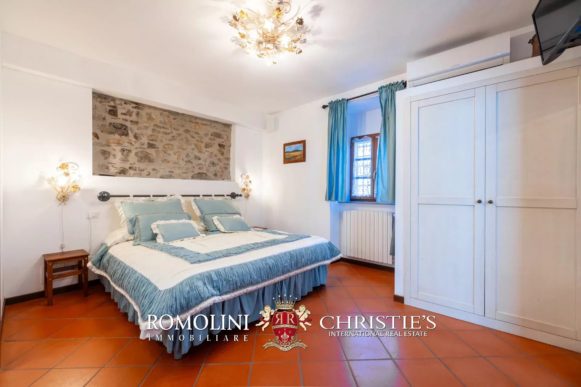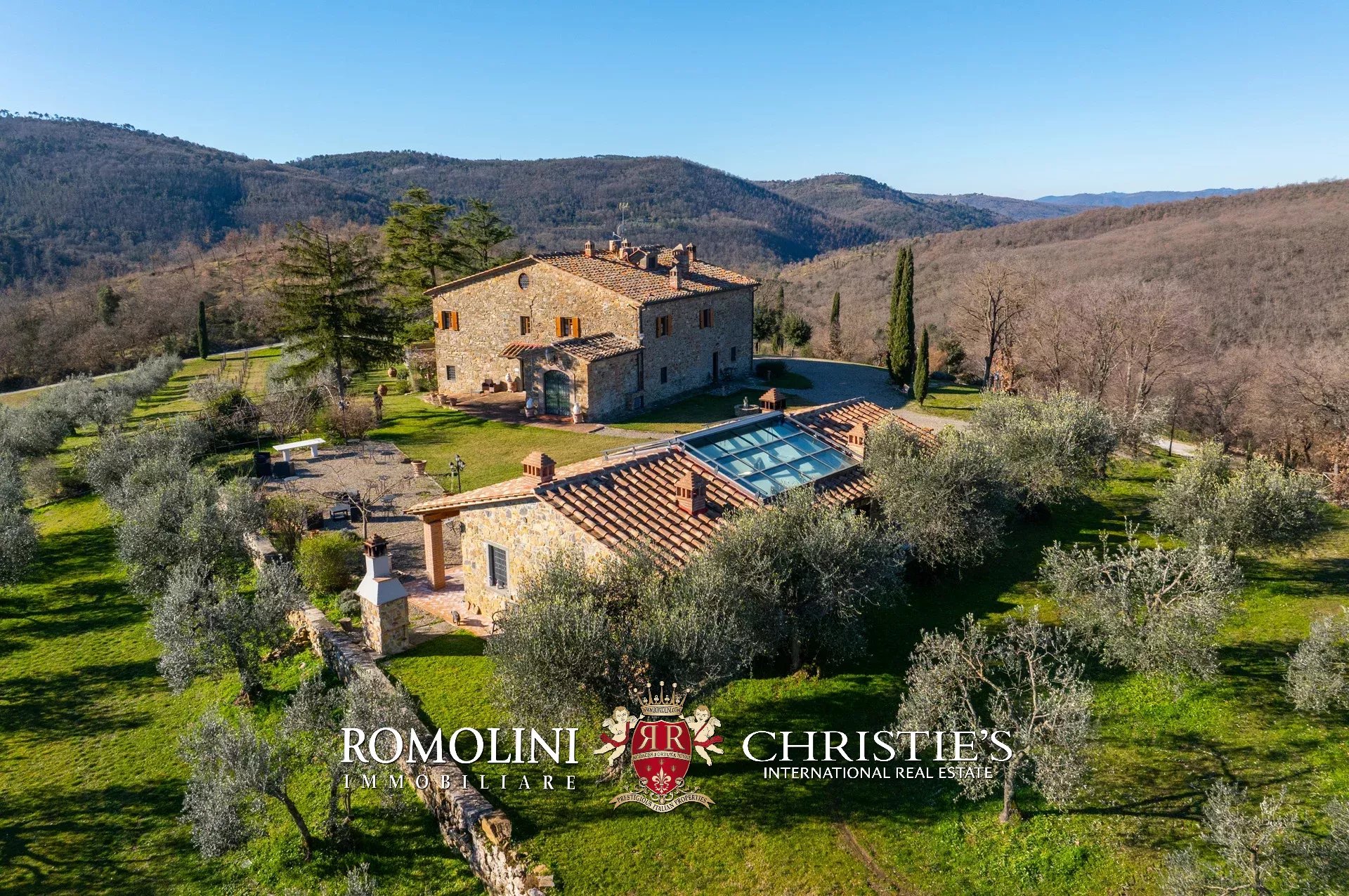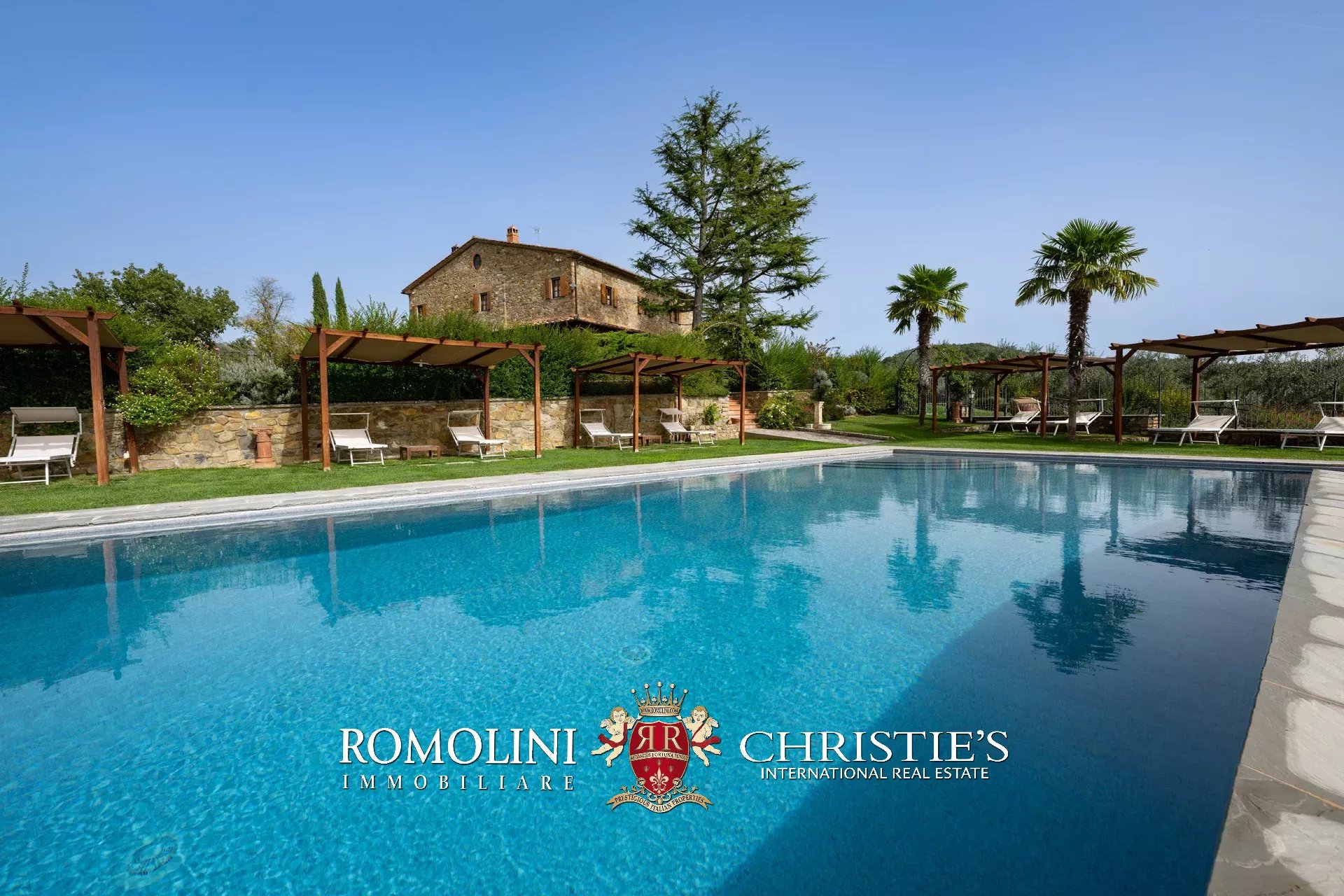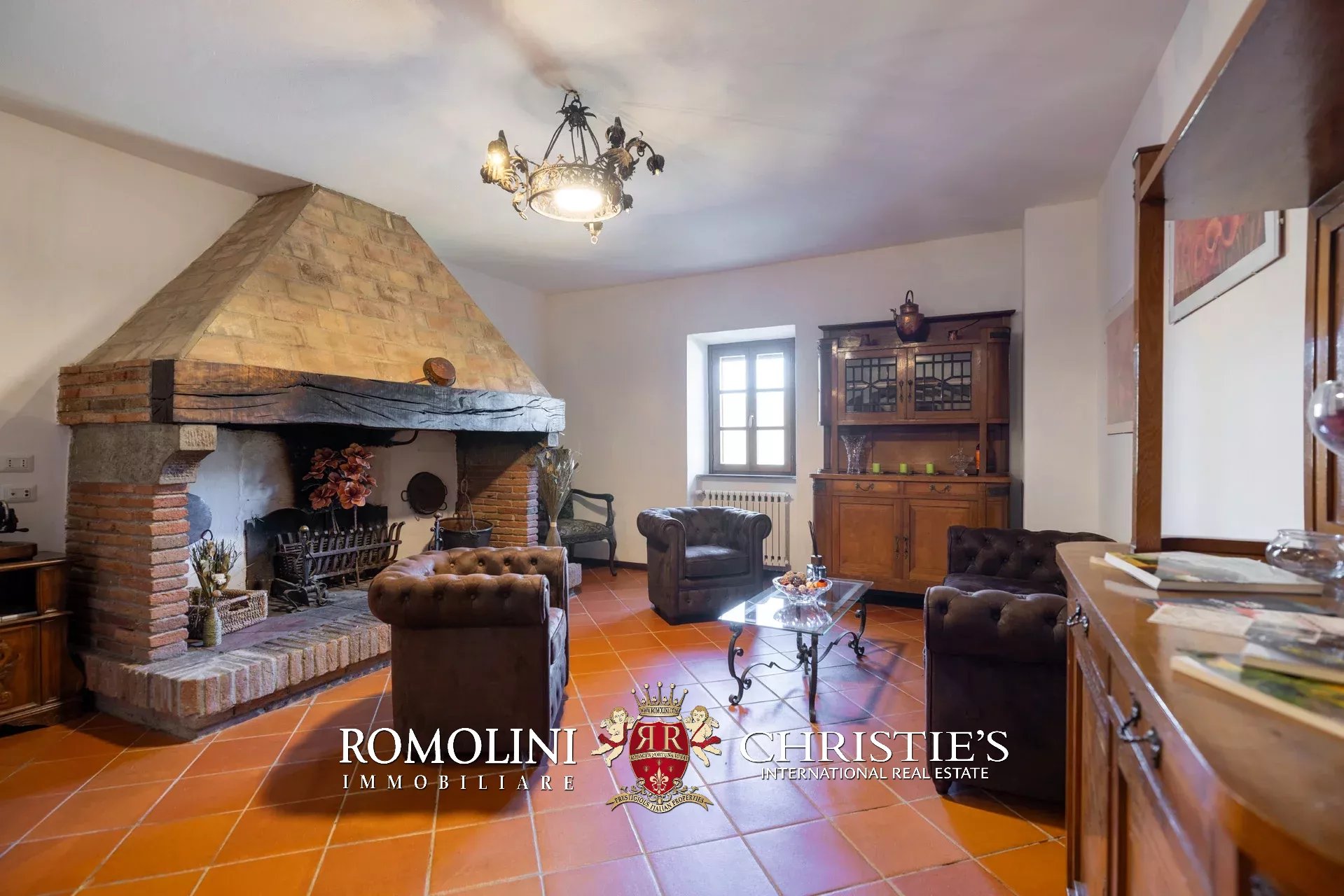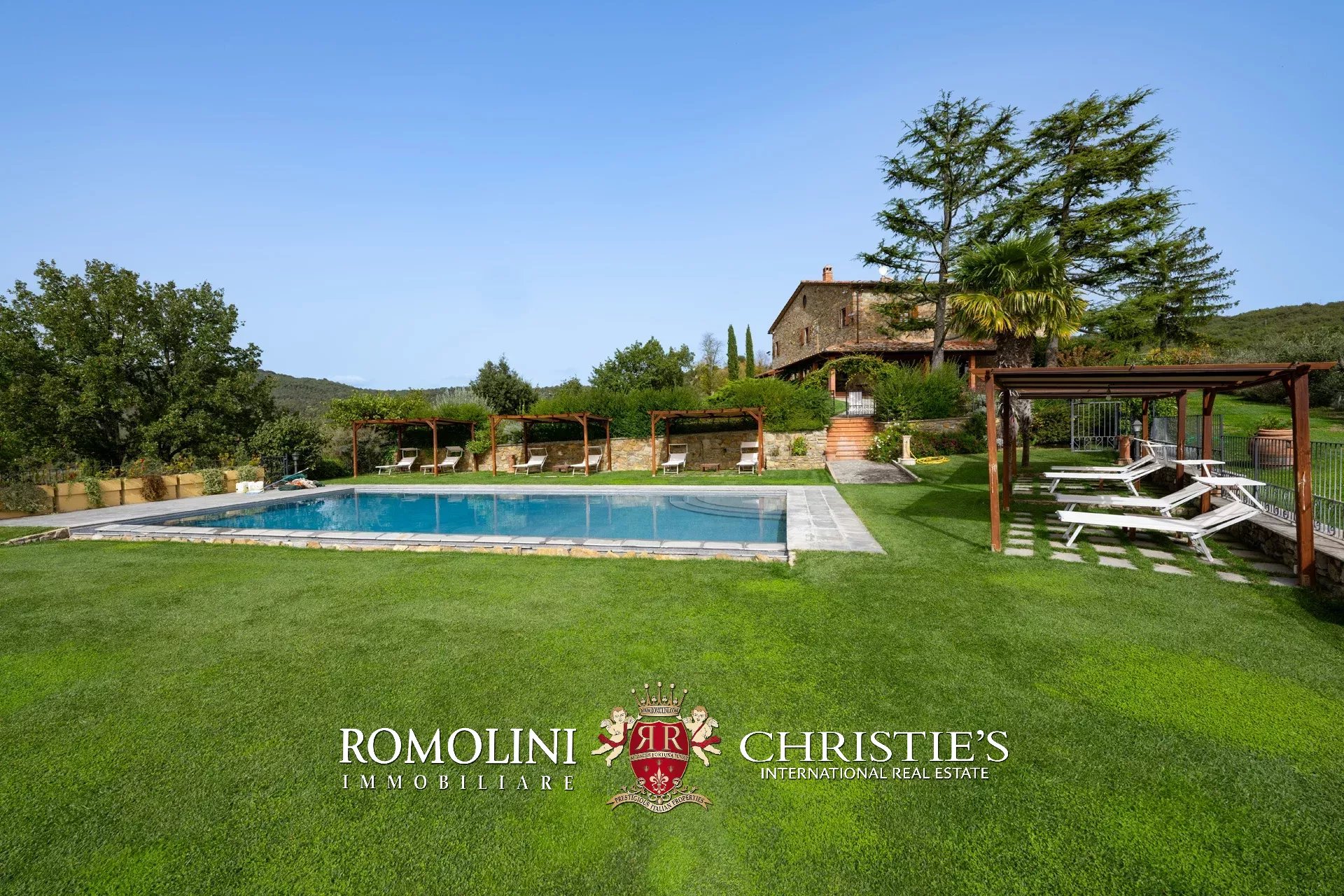 La villa (550 m², 5 camere e 6 bagni) è un grande edificio rustico in pietra, anticamente una torre longobarda, interamente ristrutturato nel 2021 e disposto su tre livelli. Al piano terra si trova un grande soggiorno con camino (originariamente la stalla per le vacche chianine da lavoro) disimpegno con forno a legna, cucina professionale con dispensa, bagno e camera con bagno en-suite corredata di zona giorno ricavata dalla chiusura di un’antica loggia. Un locale accessorio accessibile dall’esterno è dedicato a centrale termica ed accoglie la moderna ed efficiente caldaia a pellet utilizzata per il riscaldamento e la produzione di acqua calda sanitaria nella casa principale e nella dependance. Un portico di 45 m² completa l’edificio sul lato sud.