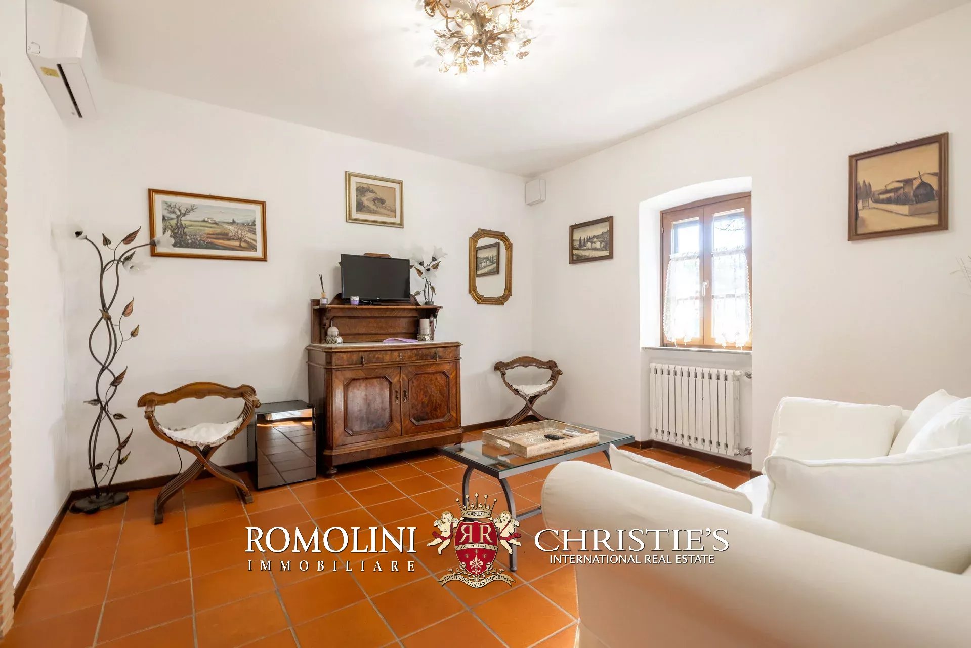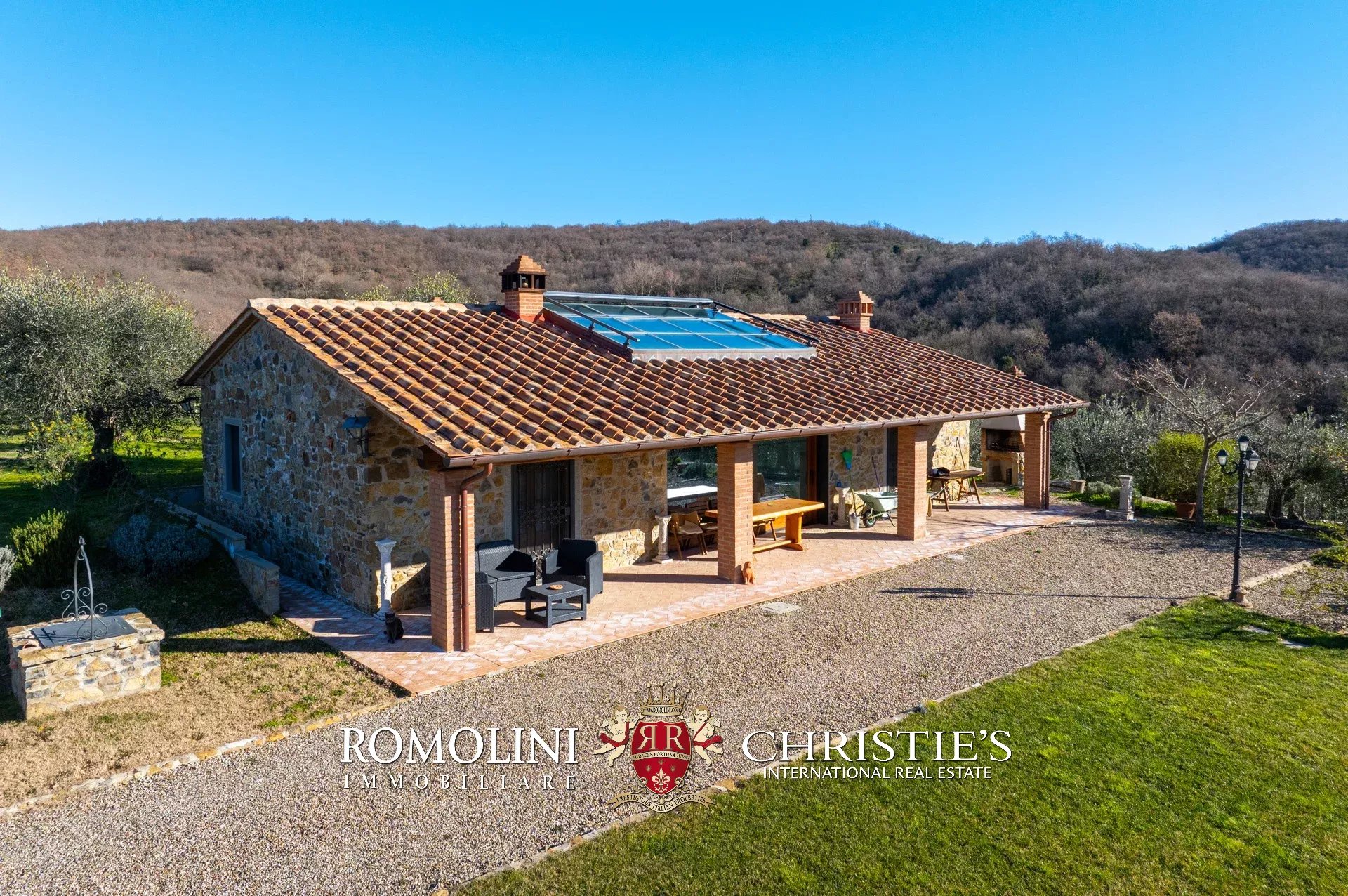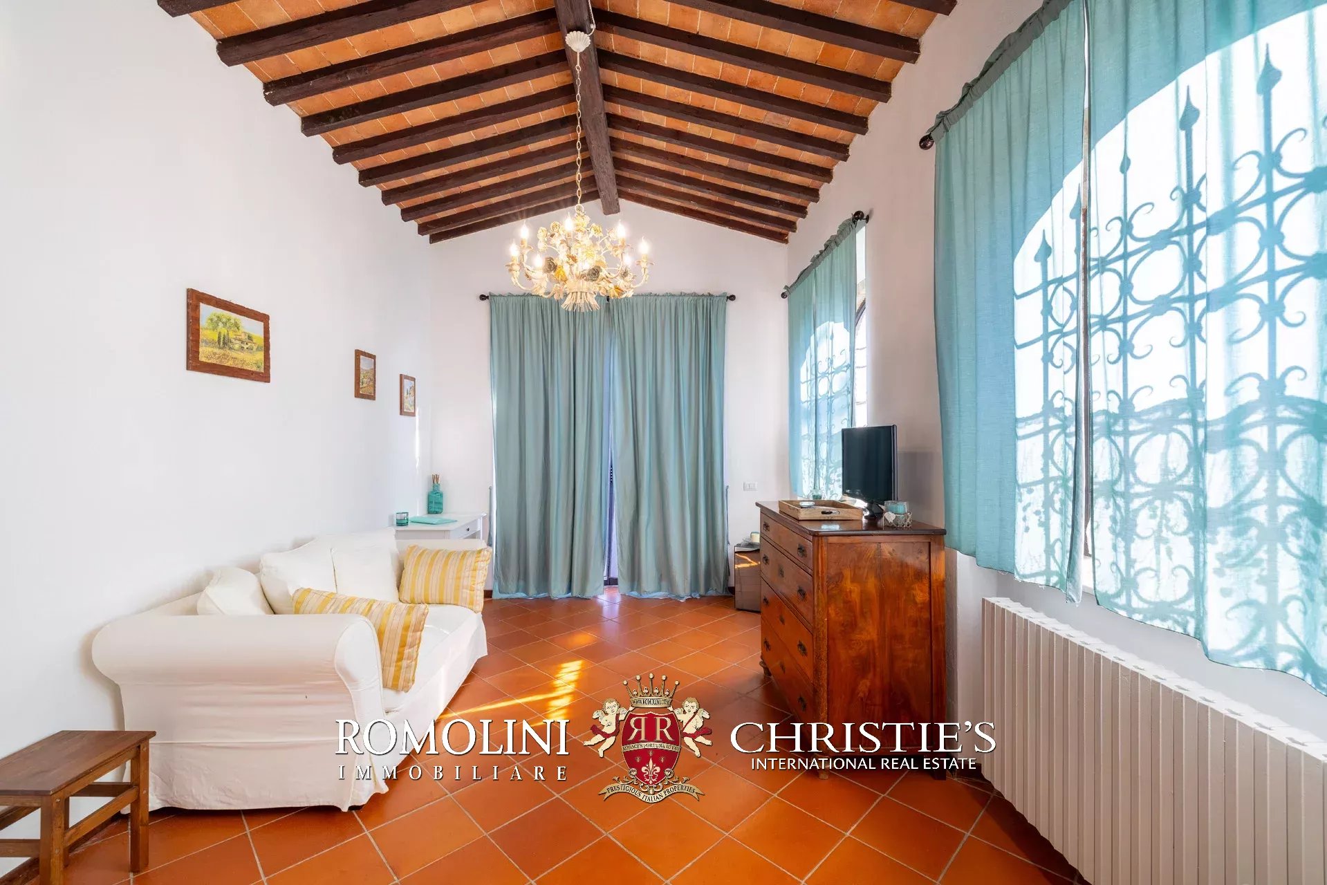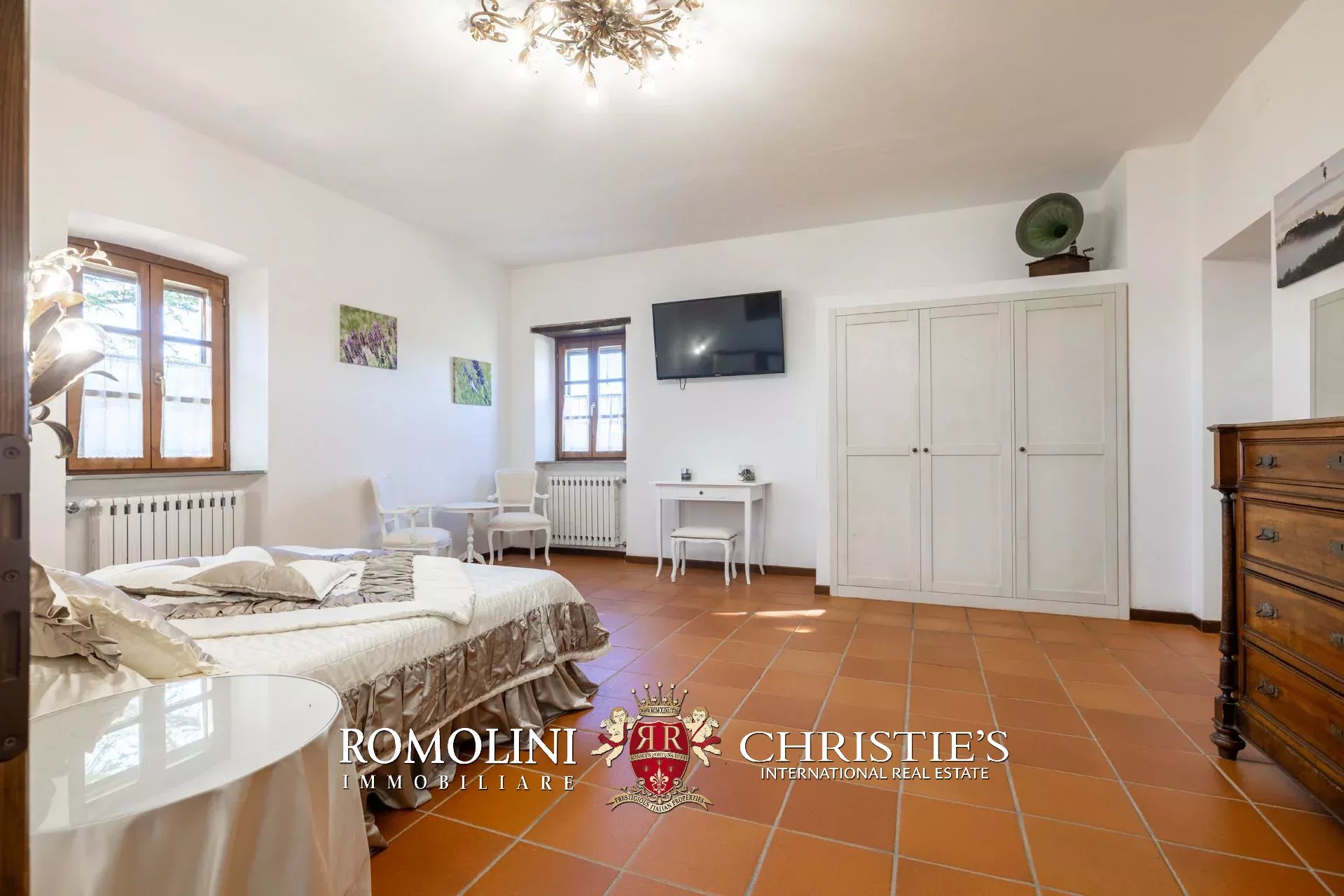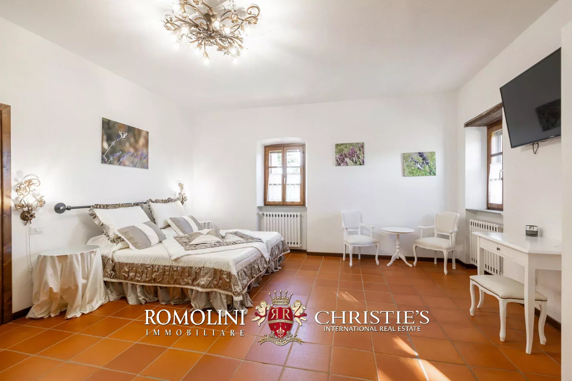 La villa (550 m², 5 camere e 6 bagni) è un grande edificio rustico in pietra, anticamente una torre longobarda, interamente ristrutturato nel 2021 e disposto su tre livelli. Al piano terra si trova un grande soggiorno con camino (originariamente la stalla per le vacche chianine da lavoro) disimpegno con forno a legna, cucina professionale con dispensa, bagno e camera con bagno en-suite corredata di zona giorno ricavata dalla chiusura di un’antica loggia. Un locale accessorio accessibile dall’esterno è dedicato a centrale termica ed accoglie la moderna ed efficiente caldaia a pellet utilizzata per il riscaldamento e la produzione di acqua calda sanitaria nella casa principale e nella dependance. Un portico di 45 m² completa l’edificio sul lato sud.