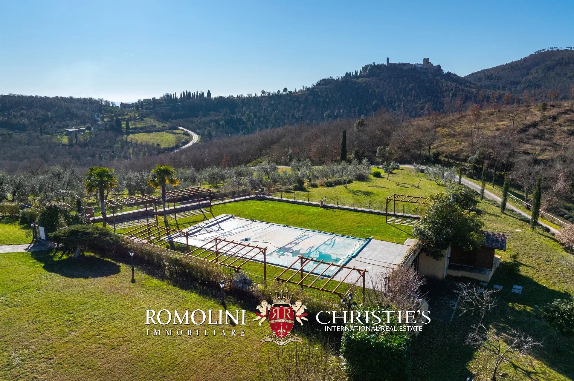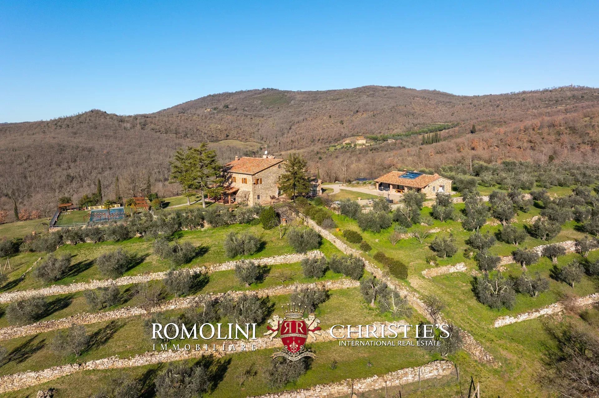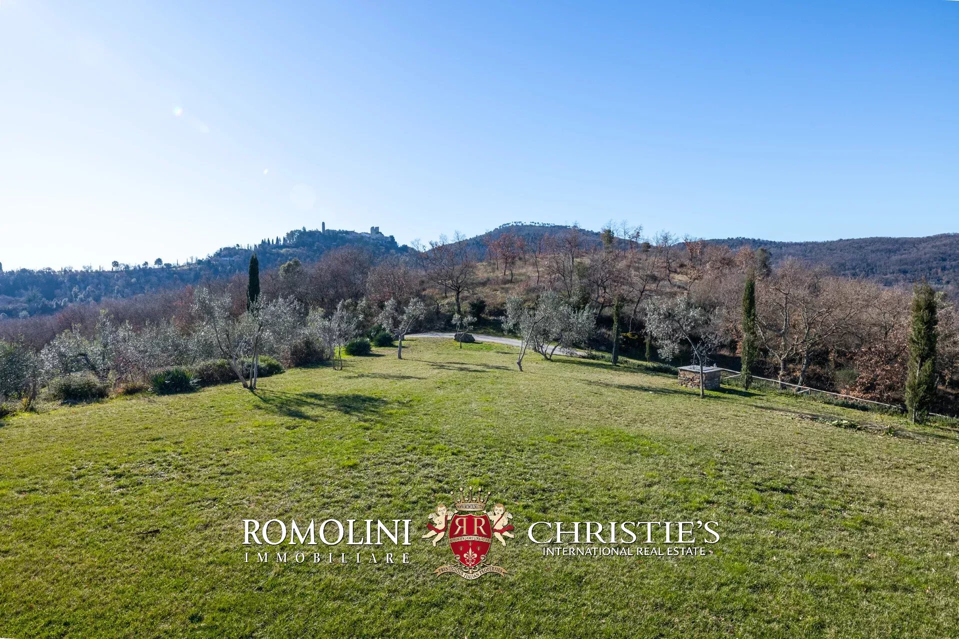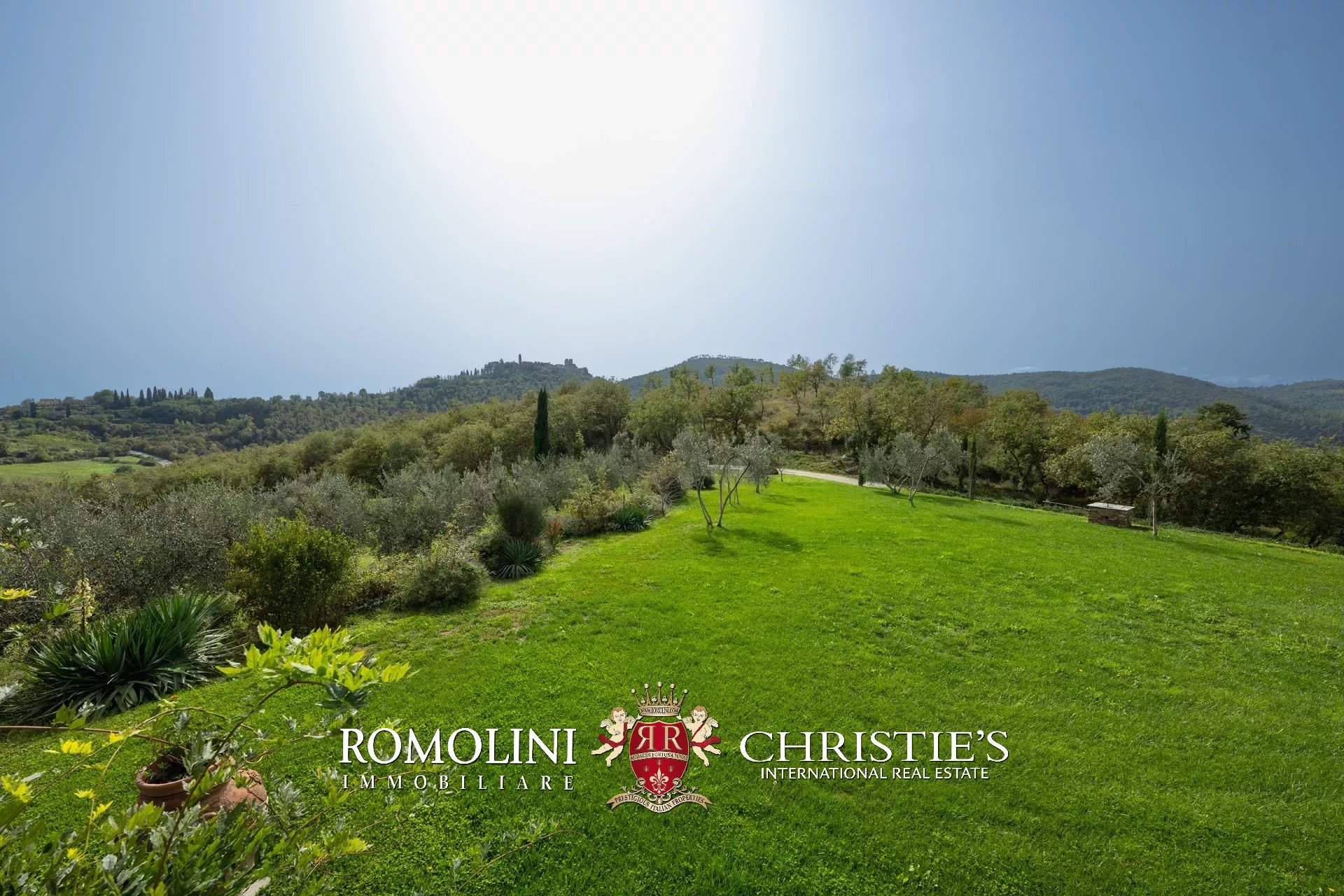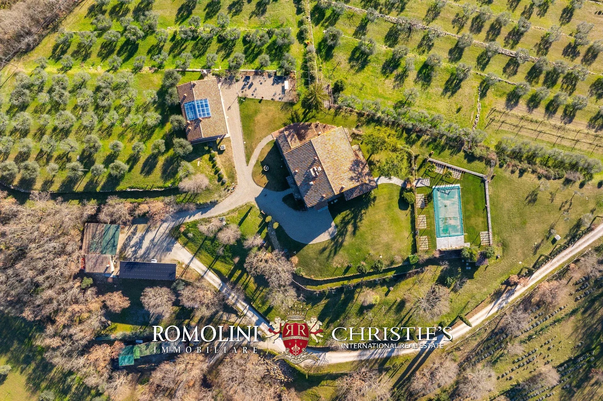In un corpo unico tutto intorno ai fabbricati, il terreno degrada dolcemente dalla sommità della collina dove si trovano i fabbricati verso valle. Di fatto la proprietà con la sua estensione di circa 12,0 ettari (di cui 5,0 ha recintati) include la collina nella sua totalità, in un paesaggio che passa dal parco fiorito intorno alla villa agli oliveti e ai vigneti tipici del territorio.