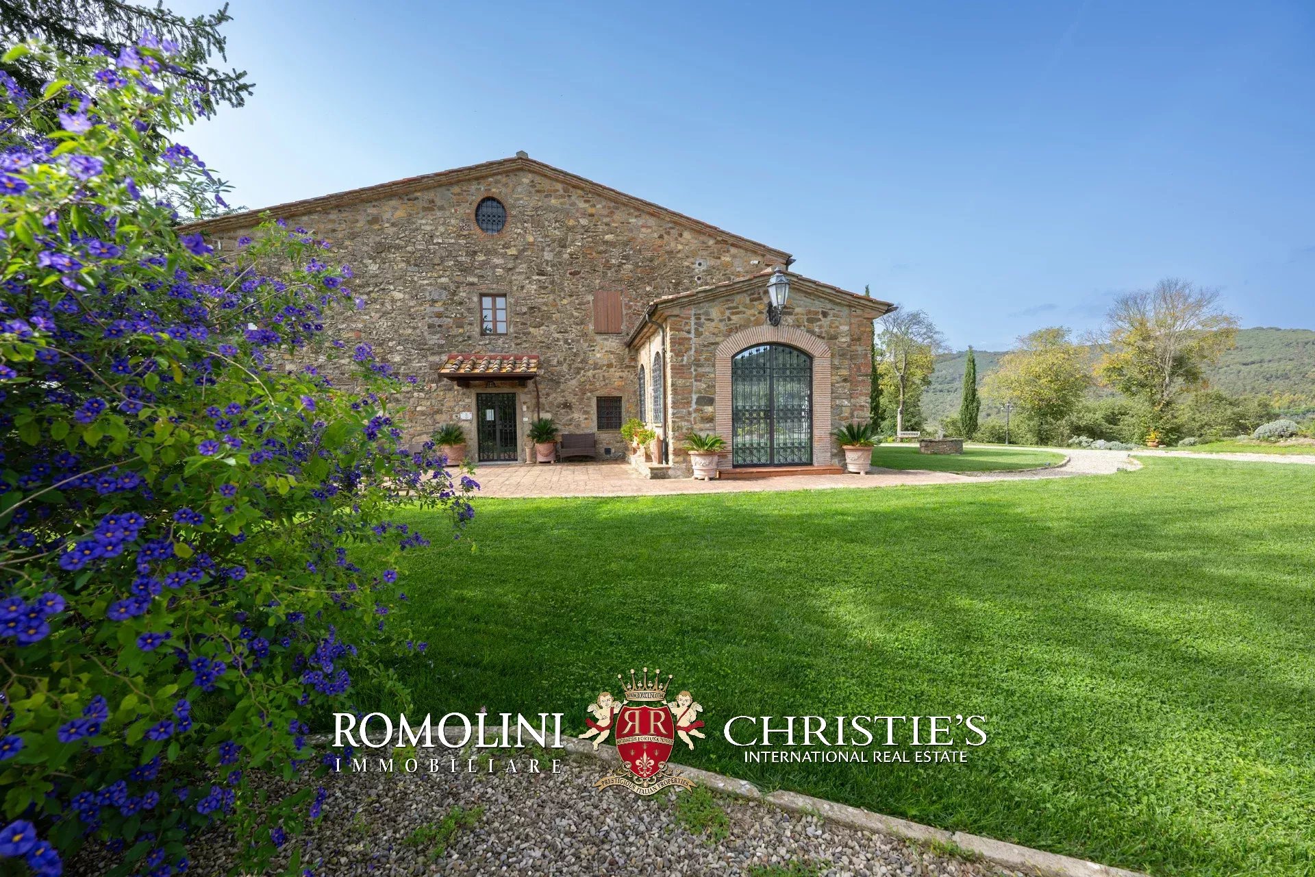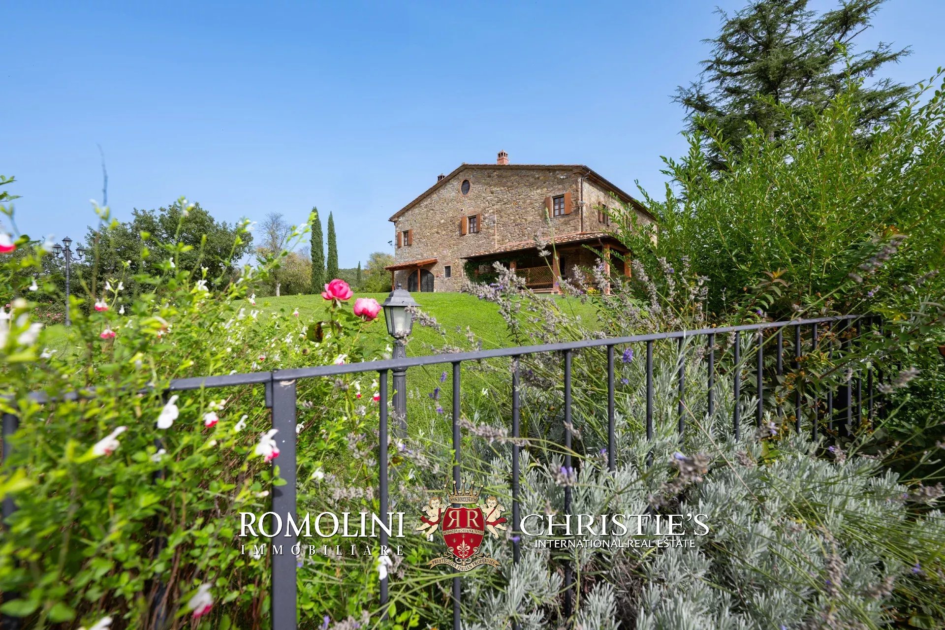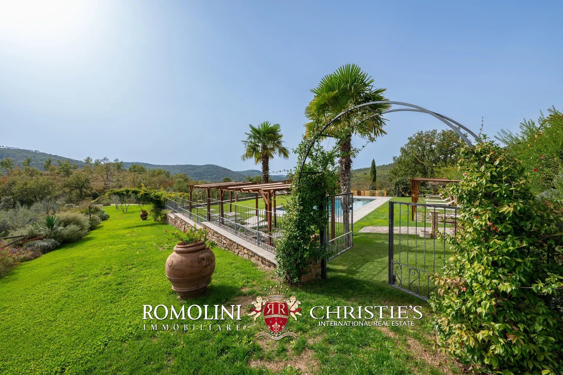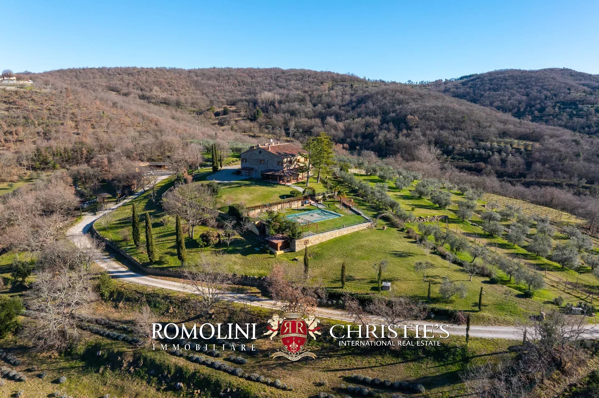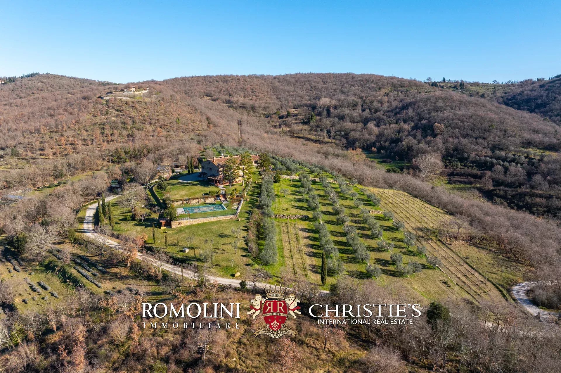 In un corpo unico tutto intorno ai fabbricati, il terreno degrada dolcemente dalla sommità della collina dove si trovano i fabbricati verso valle. Di fatto la proprietà con la sua estensione di circa 12,0 ettari (di cui 5,0 ha recintati) include la collina nella sua totalità, in un paesaggio che passa dal parco fiorito intorno alla villa agli oliveti e ai vigneti tipici del territorio.