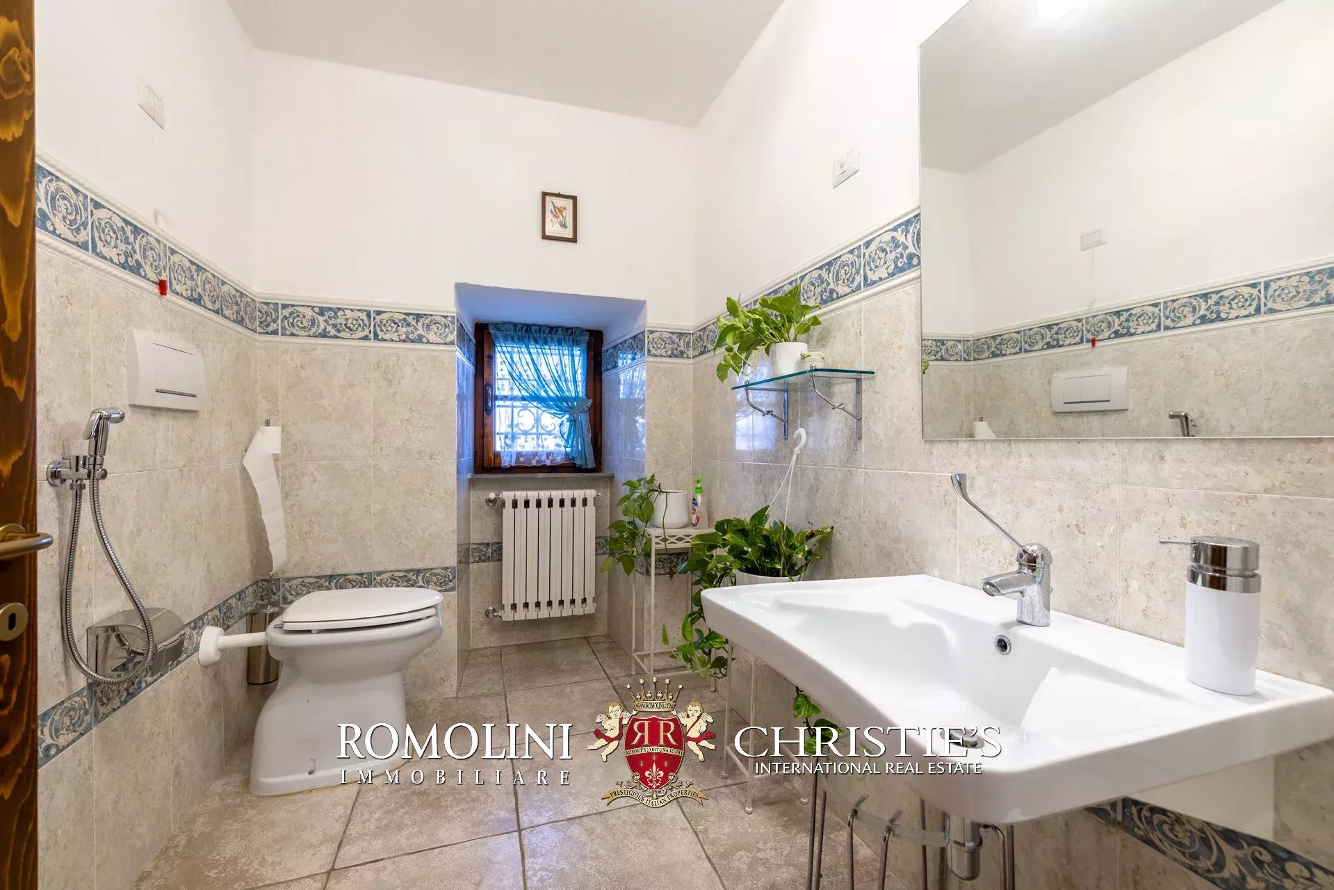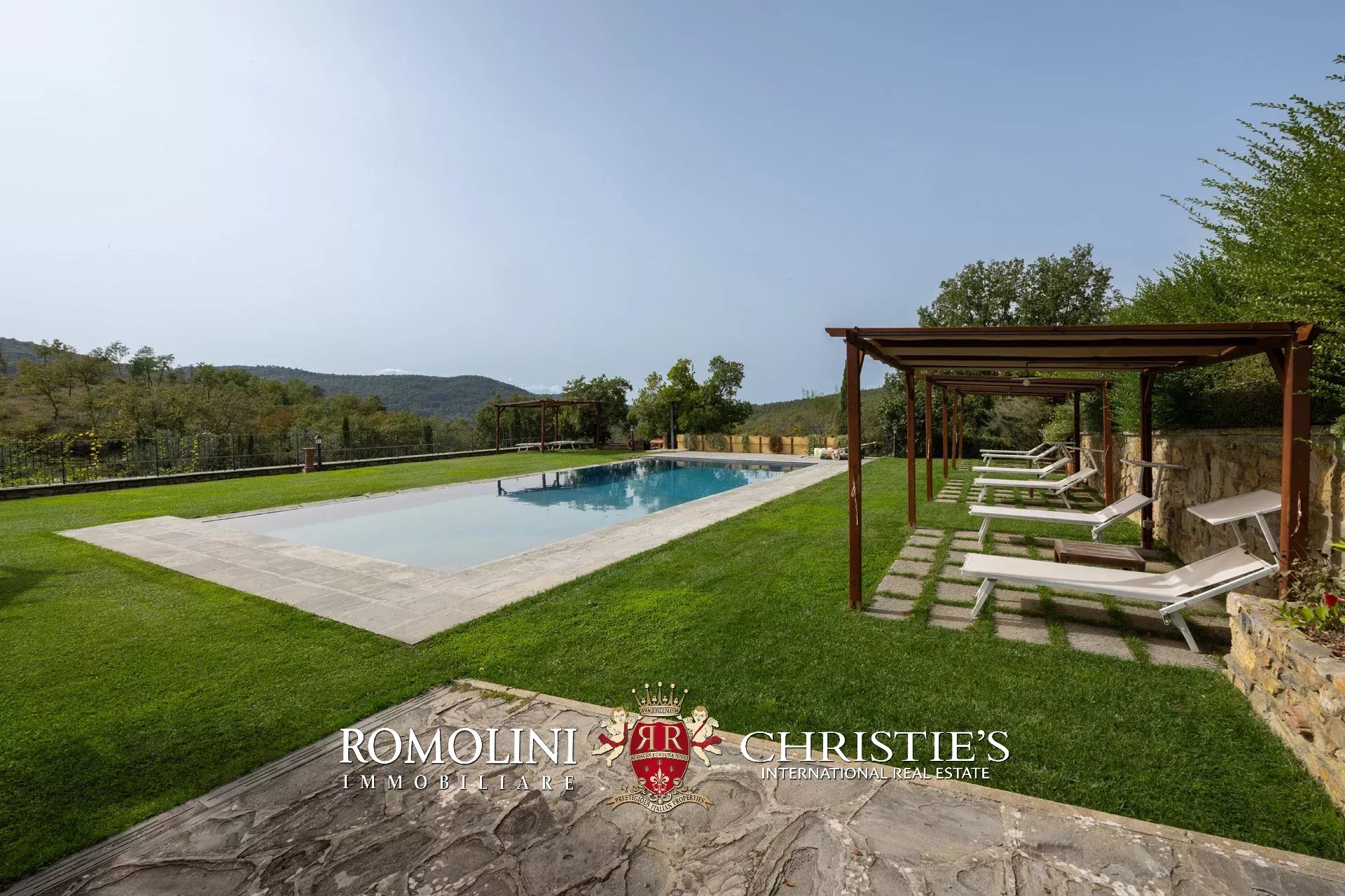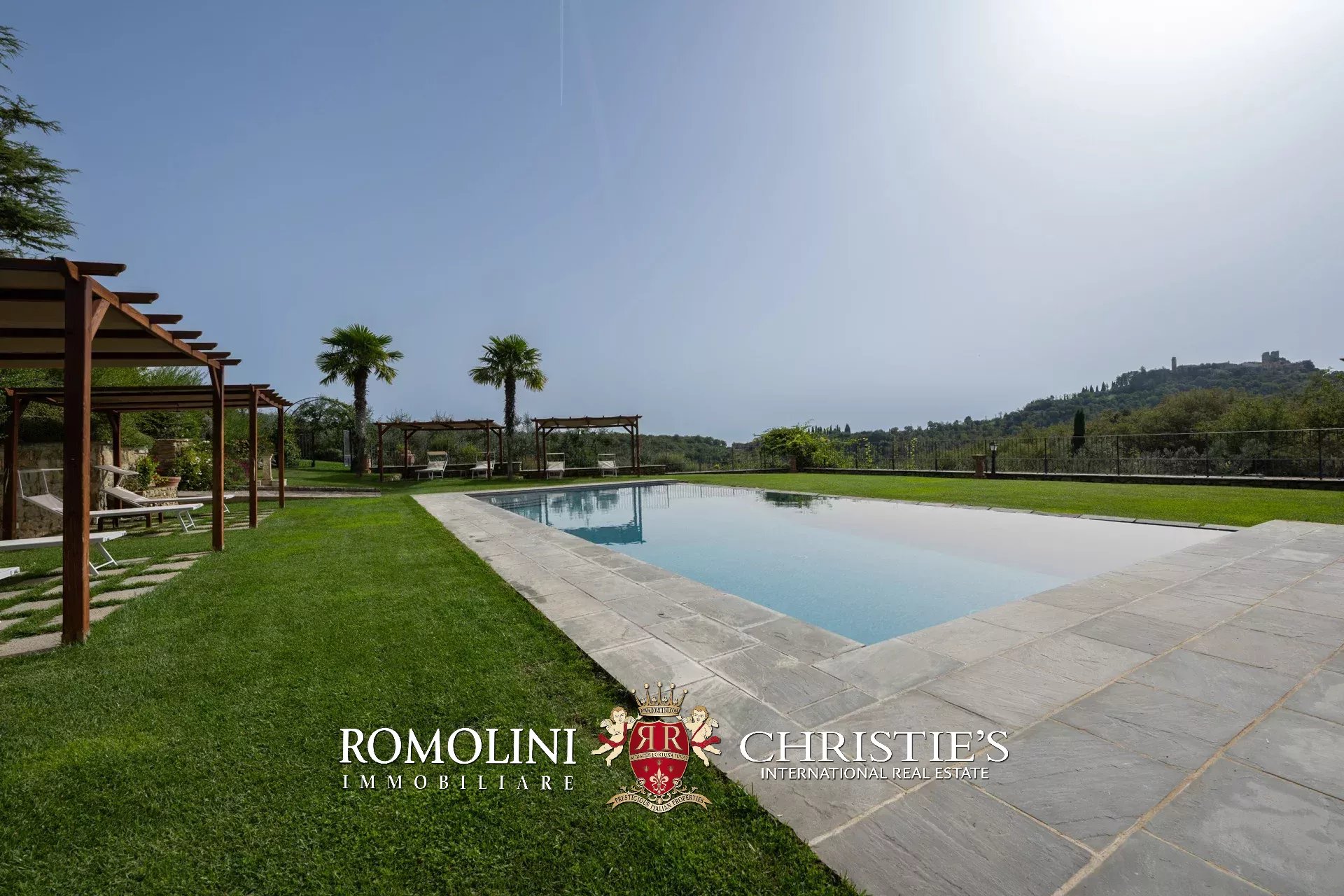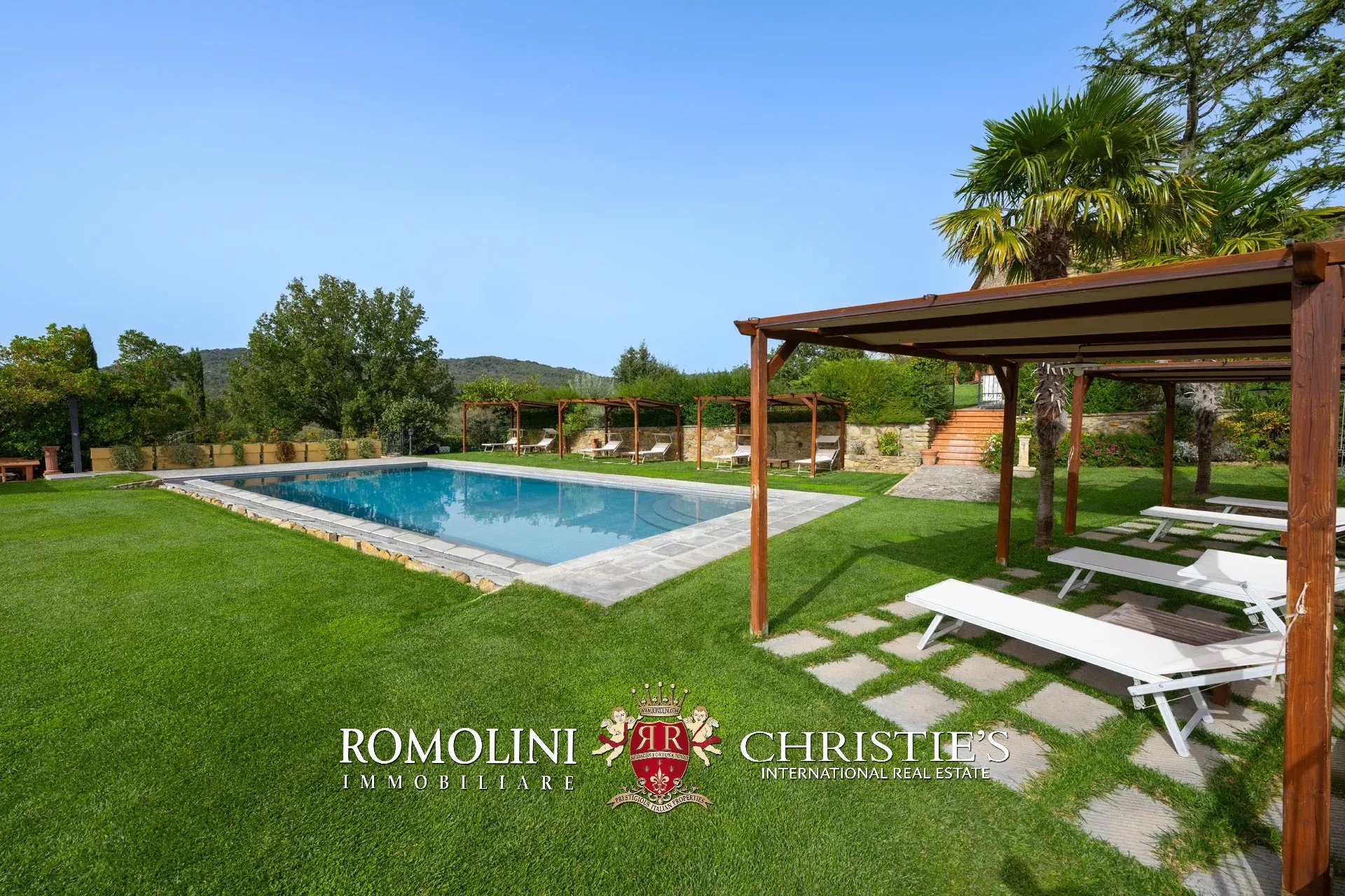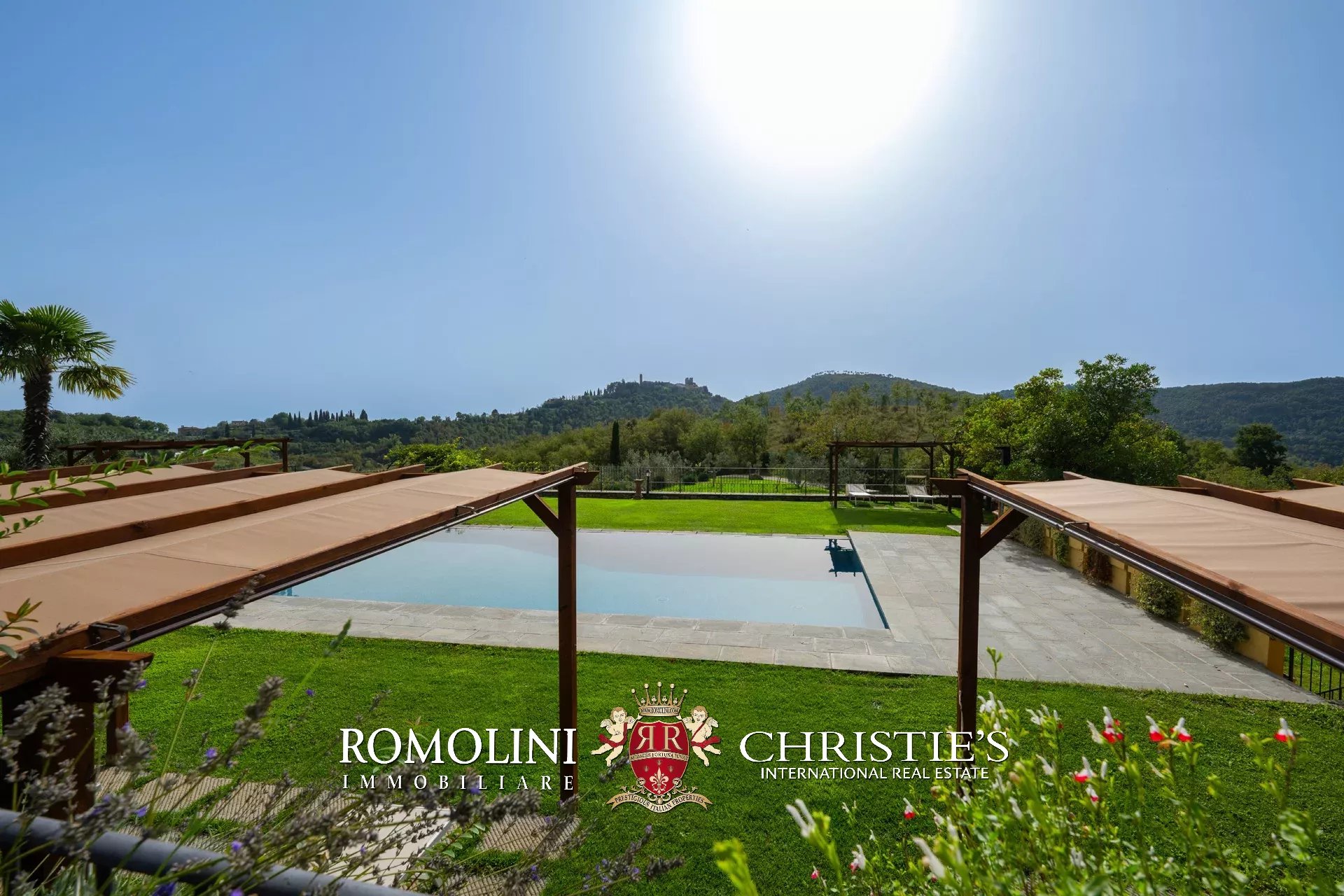 In un corpo unico tutto intorno ai fabbricati, il terreno degrada dolcemente dalla sommità della collina dove si trovano i fabbricati verso valle. Di fatto la proprietà con la sua estensione di circa 12,0 ettari (di cui 5,0 ha recintati) include la collina nella sua totalità, in un paesaggio che passa dal parco fiorito intorno alla villa agli oliveti e ai vigneti tipici del territorio.