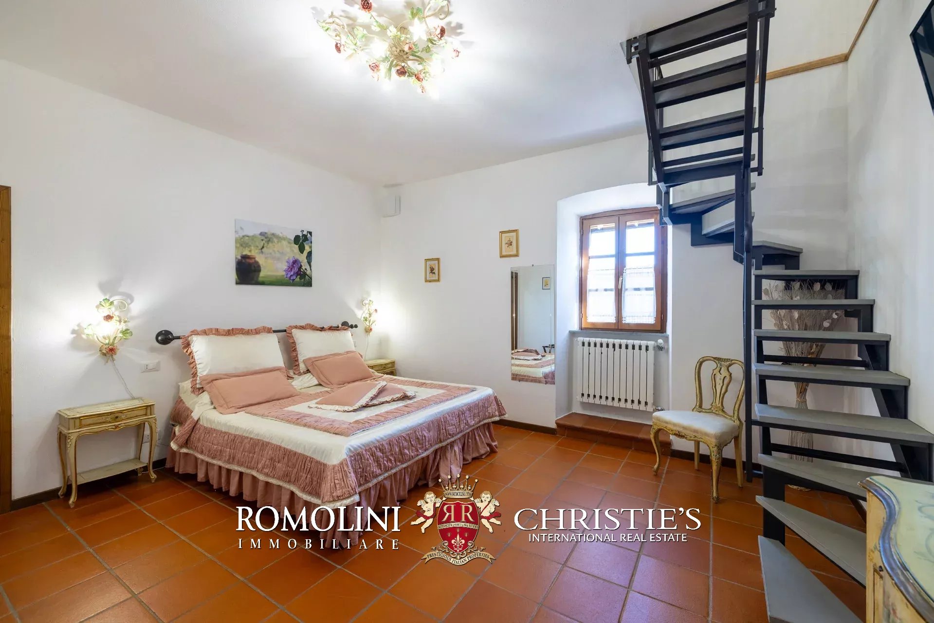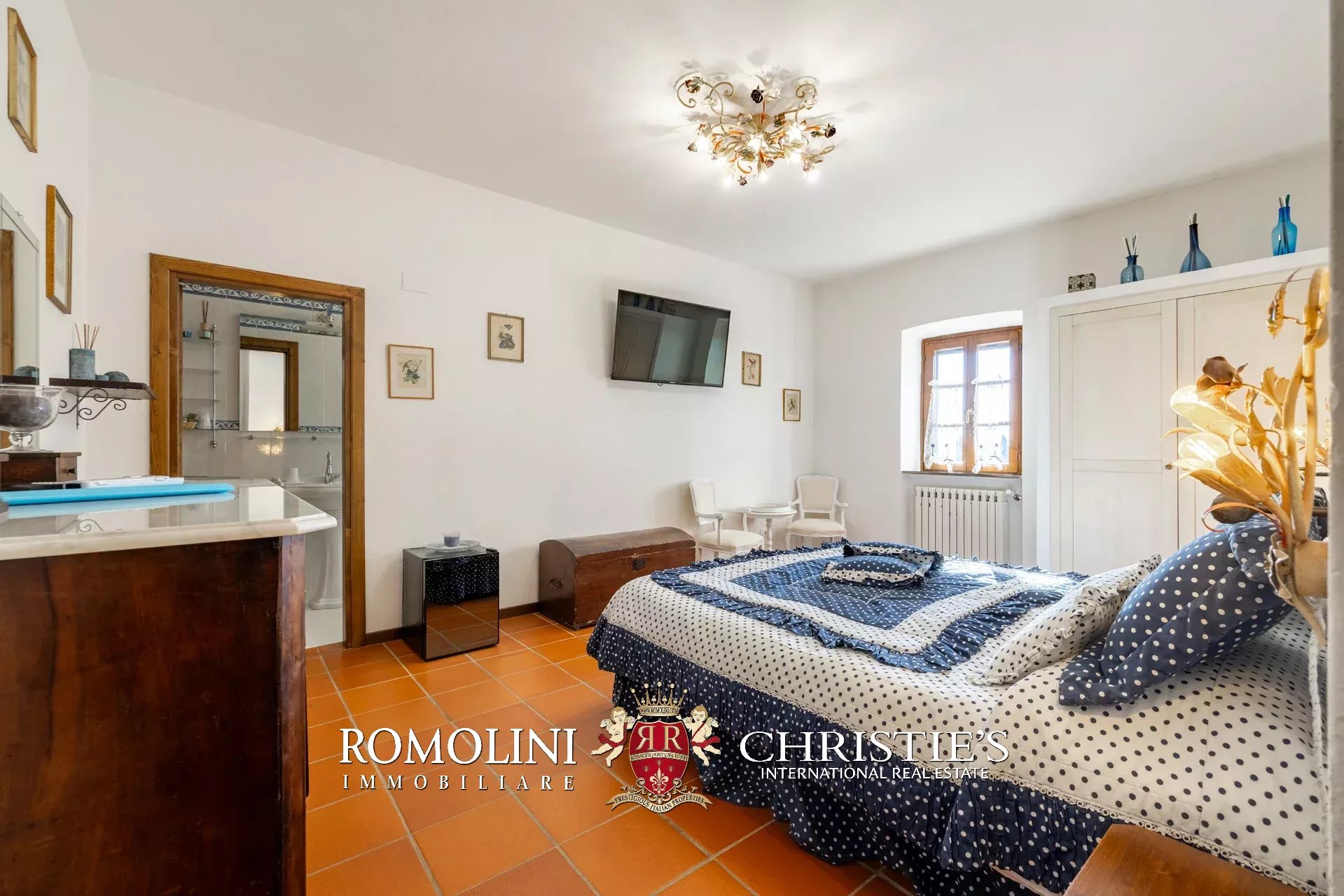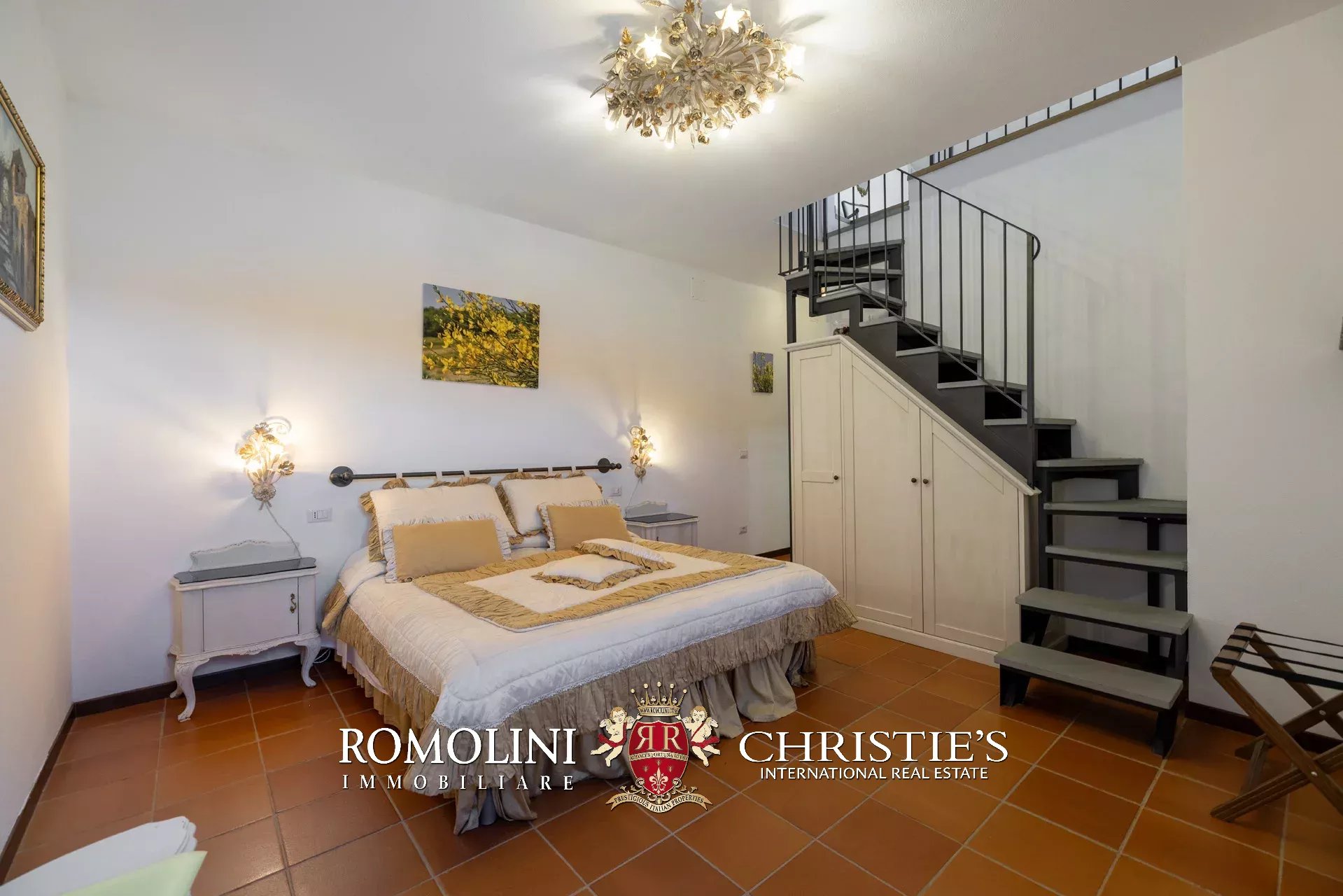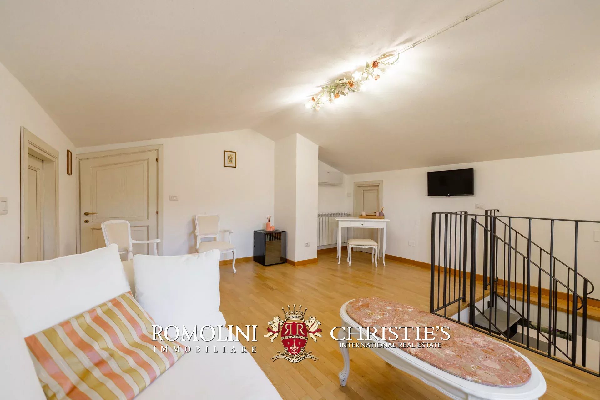 Al piano superiore, il disimpegno centrale conduce a una graziosa sala TV con camino e a quattro camere con bagno en-suite, due delle quali collegate a delle mansarde esclusive molto utili come depositi e/o cabine armadio.