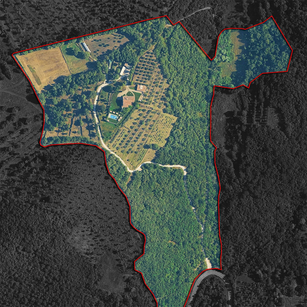 A livello agricolo la proprietà può contare su un piccolo vigneto (3.000 m²), un oliveto (1,3 ha), campi di lavanda (7.200 m²), piante da frutto (circa 2.000 m²) e estensioni di seminativo dove vengono coltivati ortaggi (anche in serra) e noccioli (2.000 m²). Il resto della proprietà è destinato a boschi che assicurano privacy e luoghi per camminate ed escursioni.