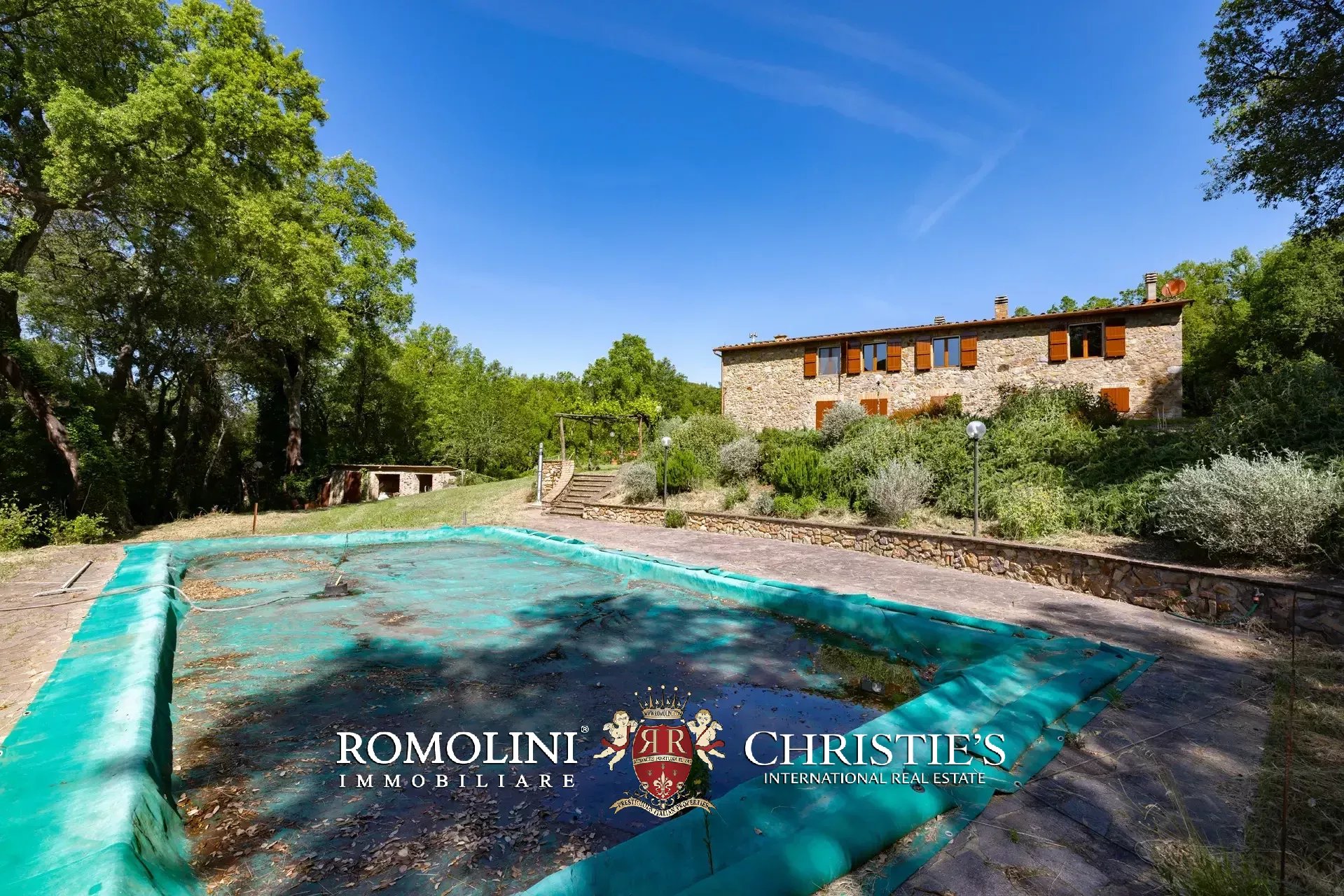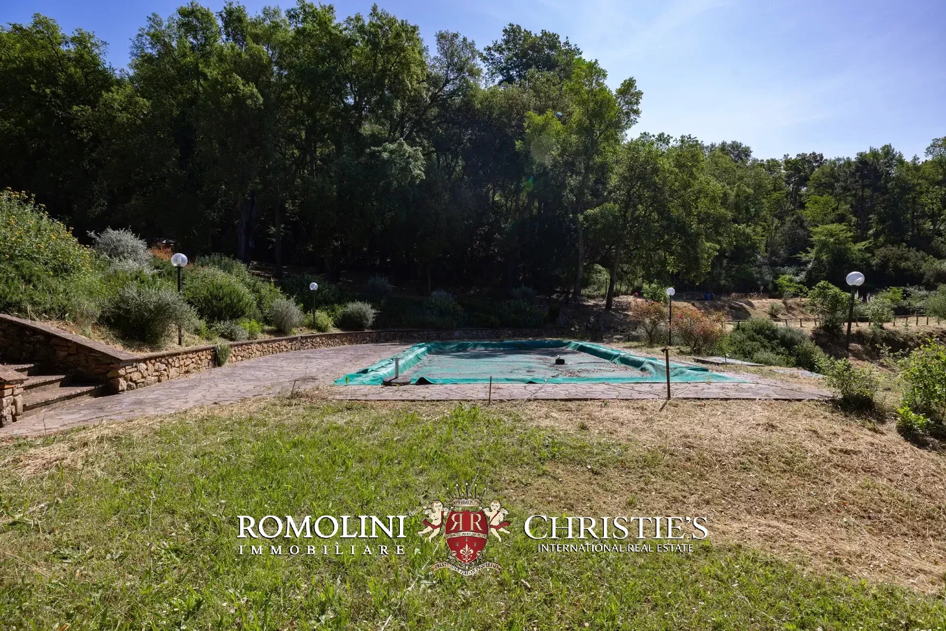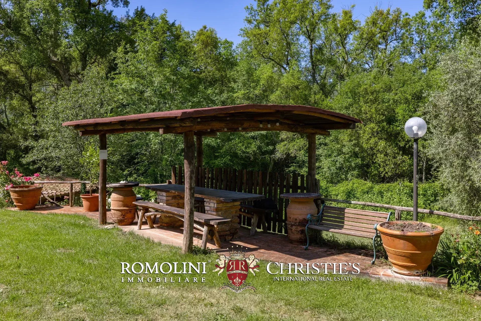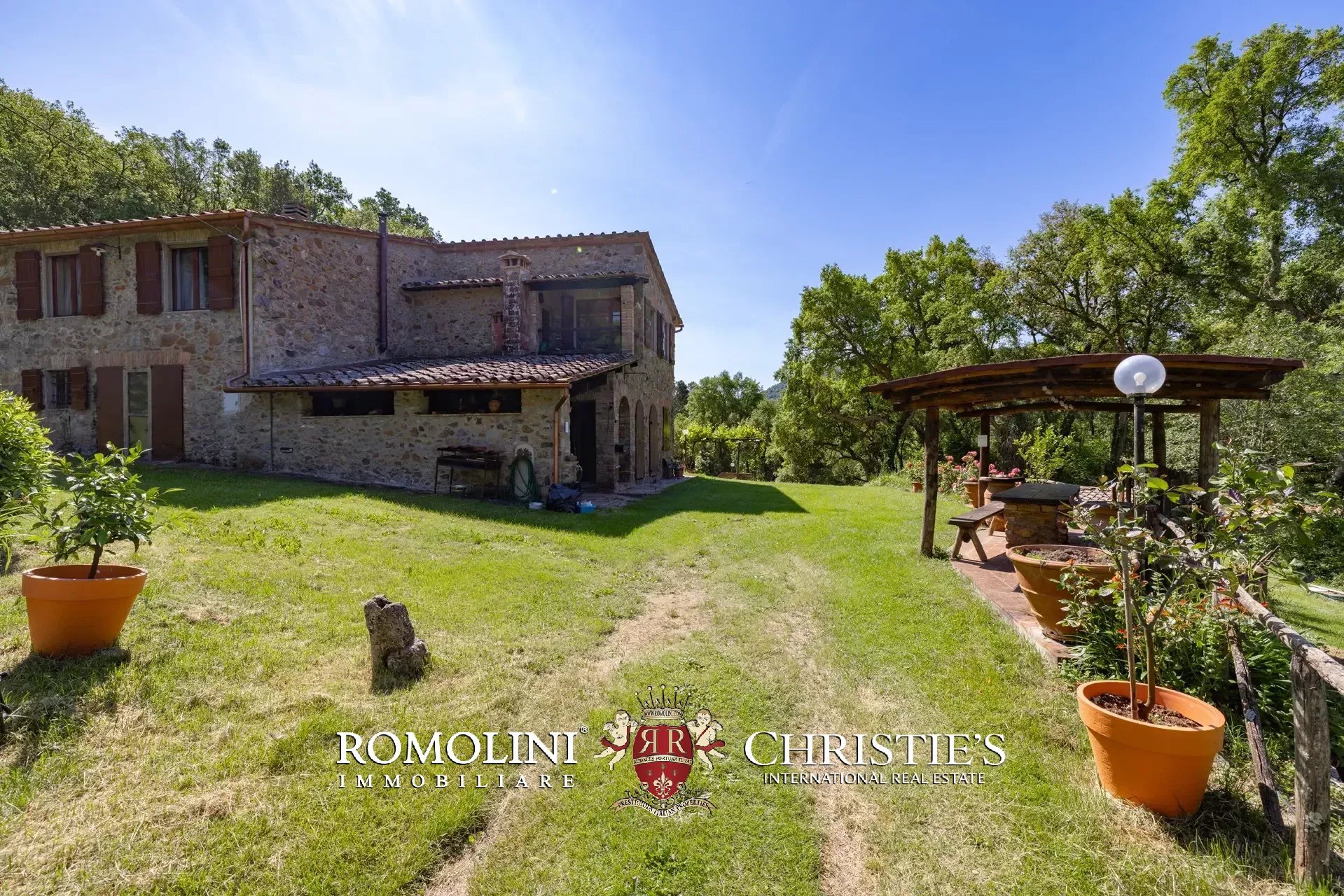 Il casale è circondato da 7.100 m² di giardino, ben curato e interamente recintato a protezione contro gli animali selvatici. A breve distanza dall’edificio trovano posto una bella piscina 12 × 6 m illuminata e una pergola con forno a legna, ideale per cene e aperitivi all’aperto.