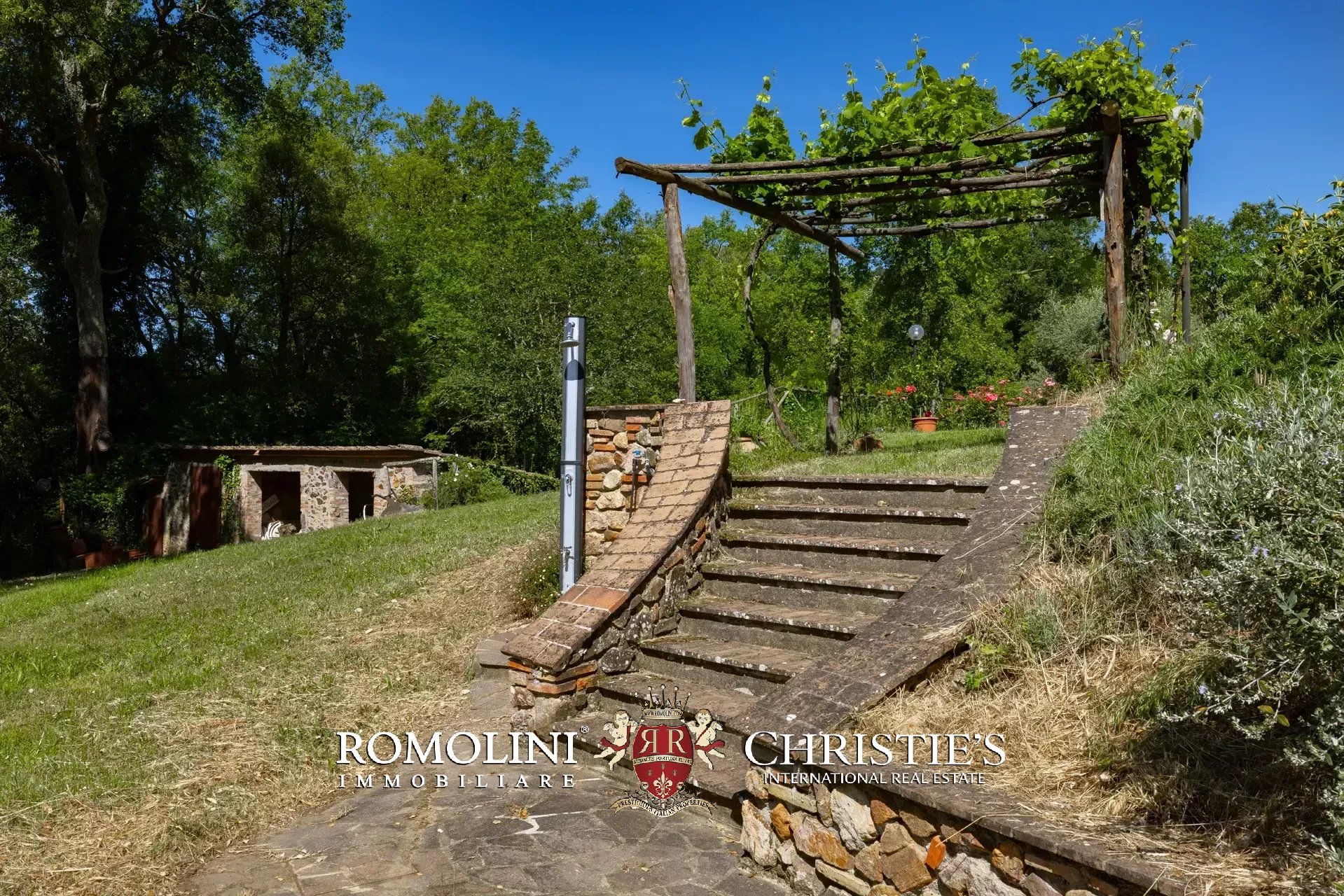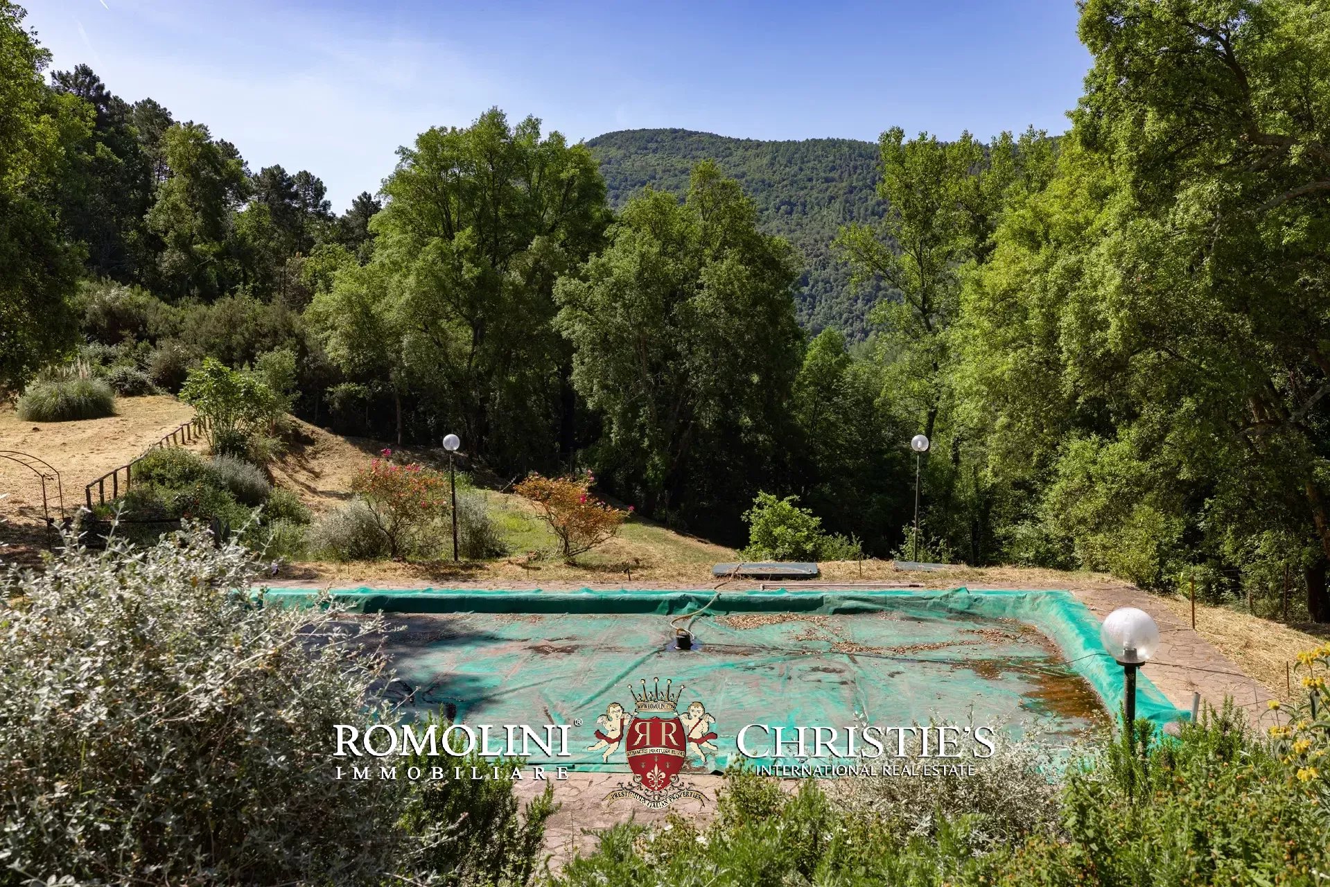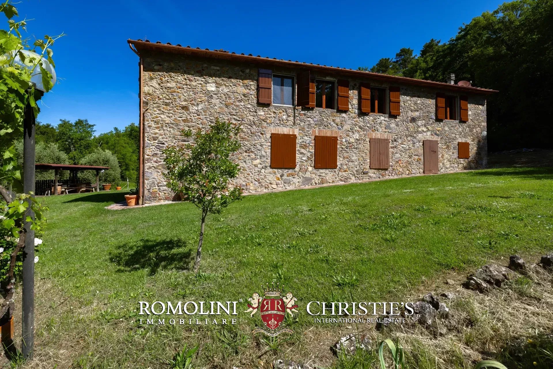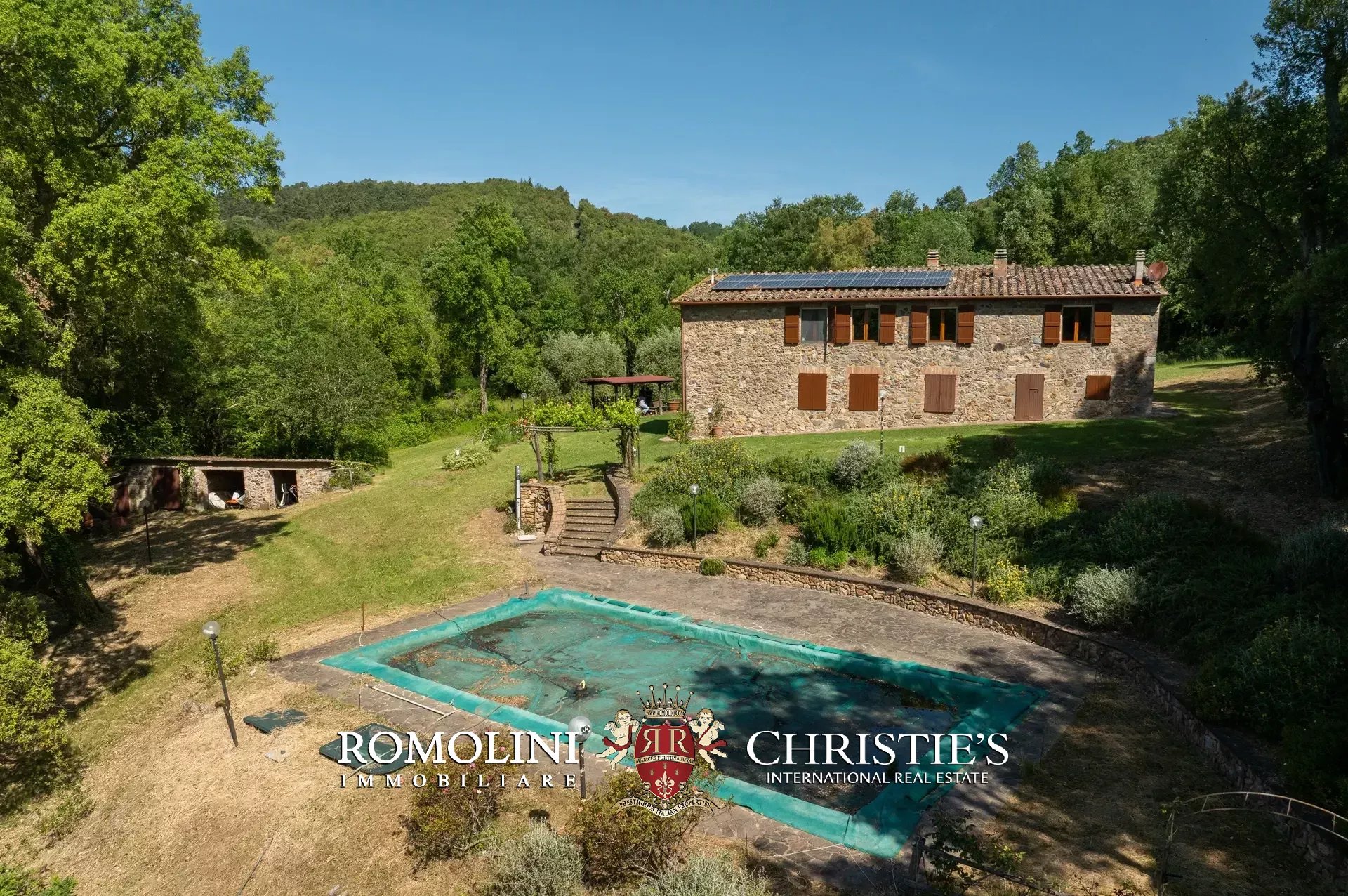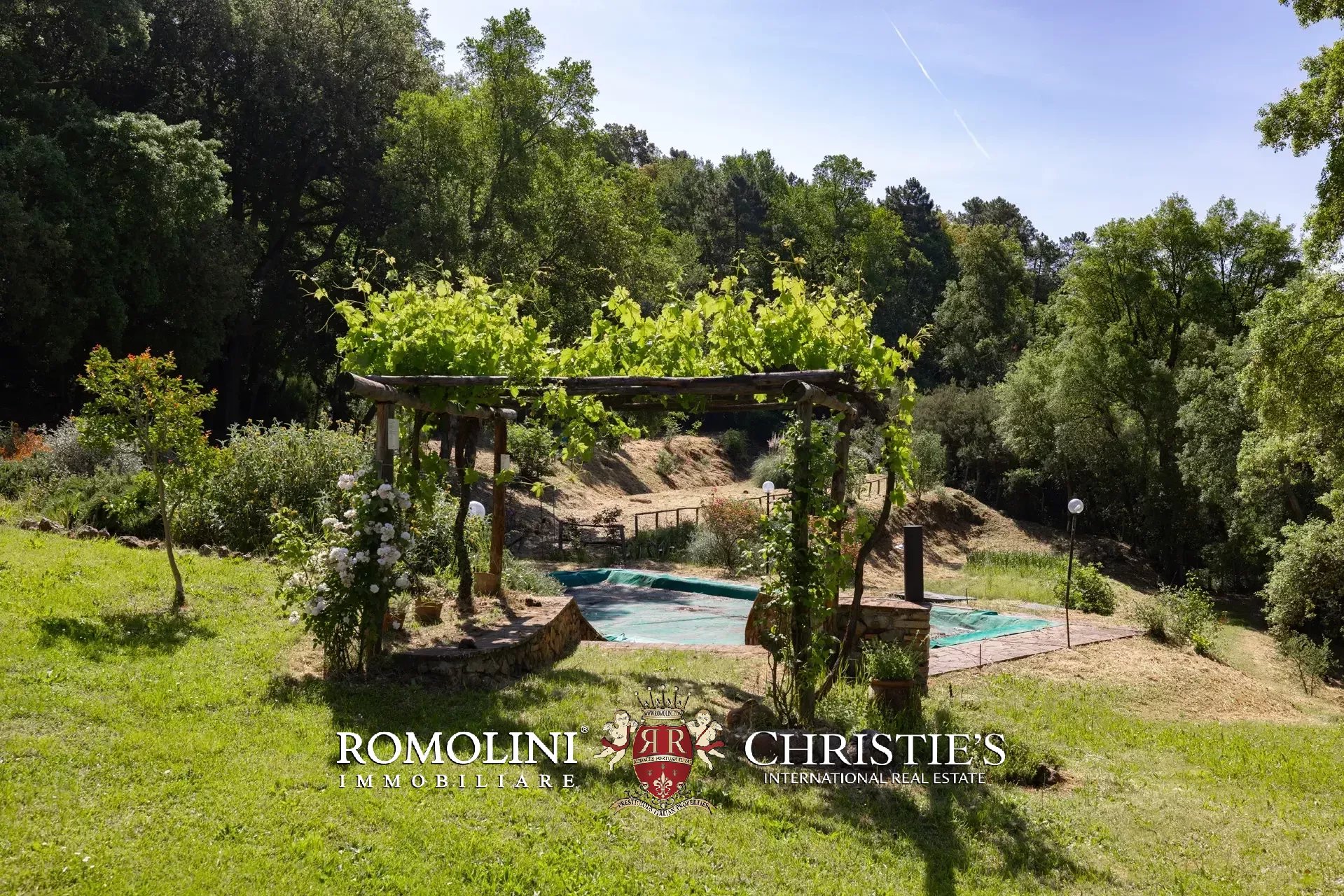 Il casale è circondato da 7.100 m² di giardino, ben curato e interamente recintato a protezione contro gli animali selvatici. A breve distanza dall’edificio trovano posto una bella piscina 12 × 6 m illuminata e una pergola con forno a legna, ideale per cene e aperitivi all’aperto.