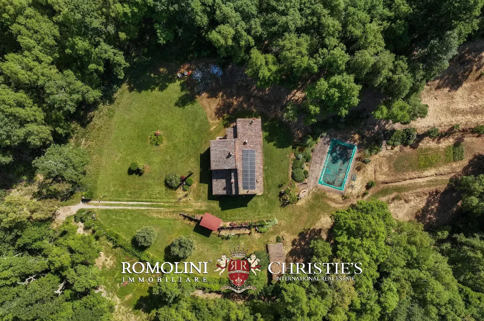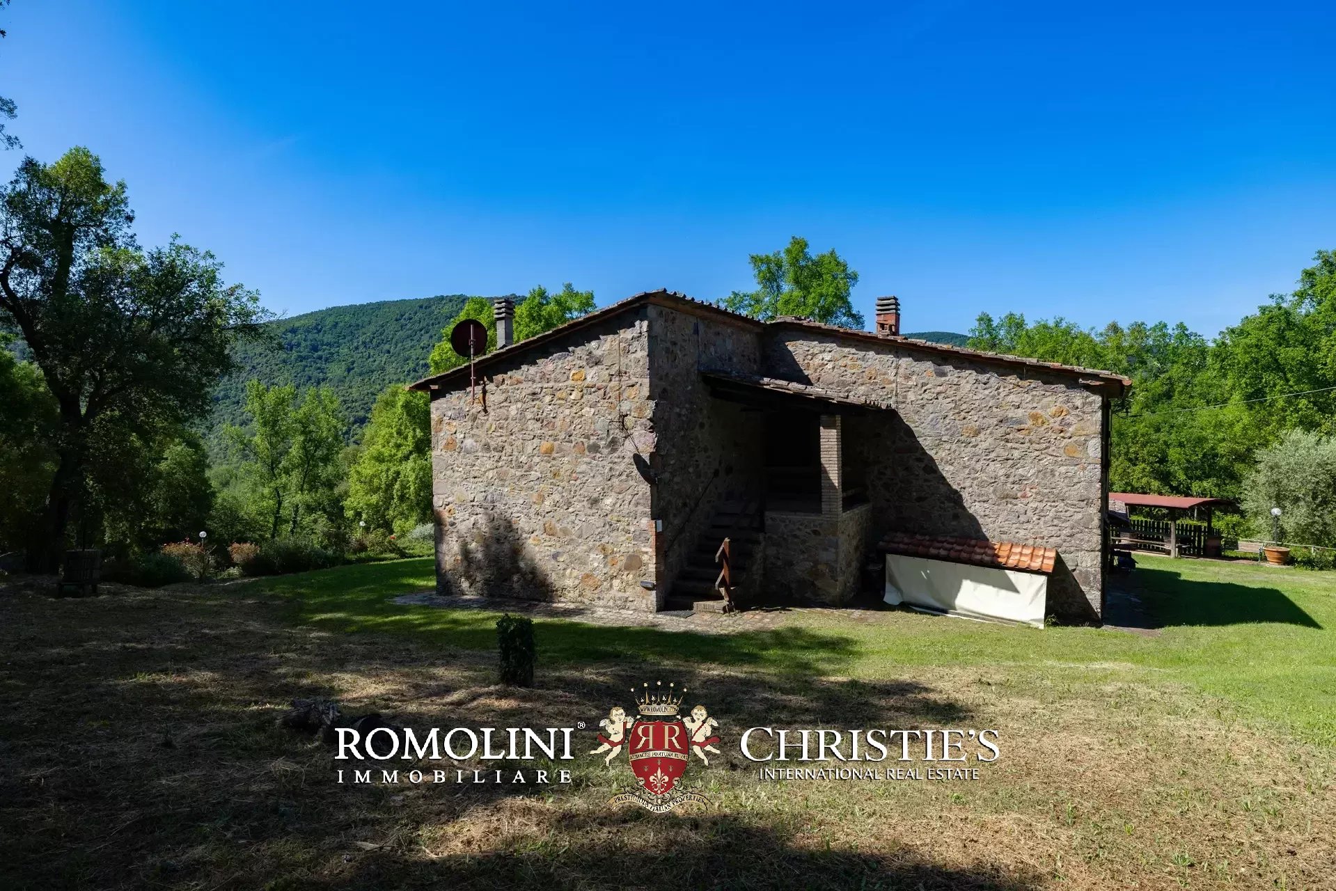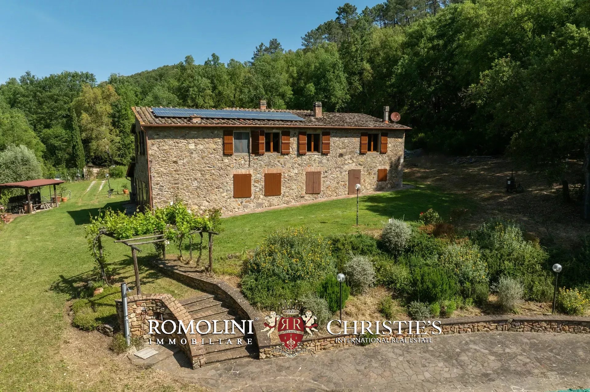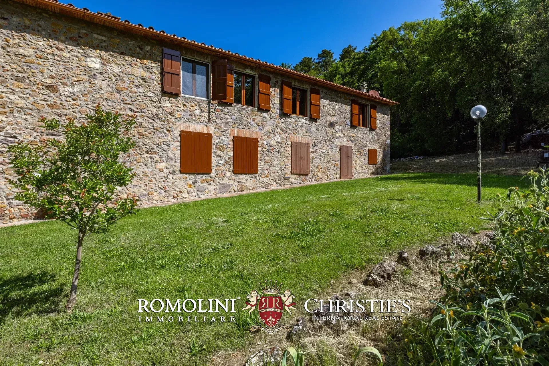 Il casale è circondato da 7.100 m² di giardino, ben curato e interamente recintato a protezione contro gli animali selvatici. A breve distanza dall’edificio trovano posto una bella piscina 12 × 6 m illuminata e una pergola con forno a legna, ideale per cene e aperitivi all’aperto.