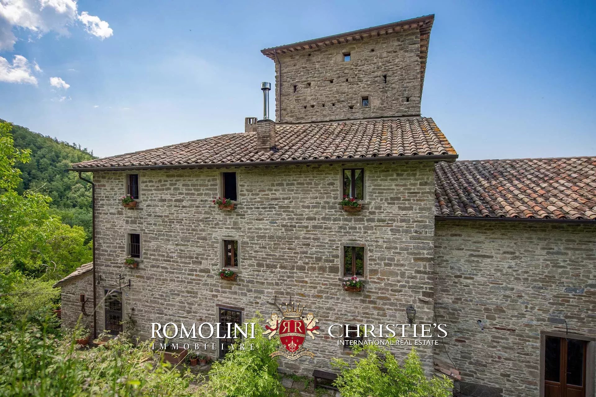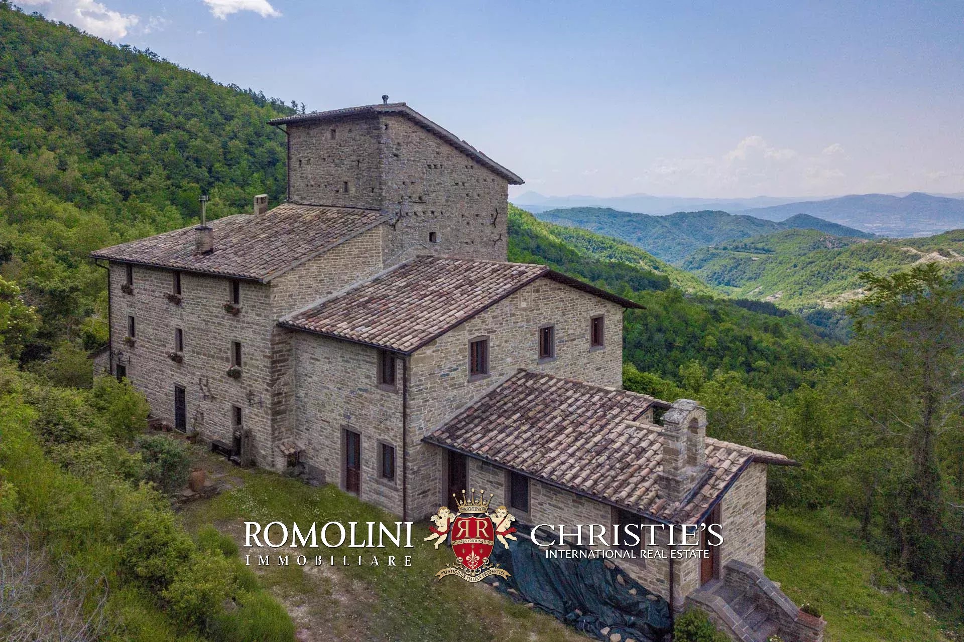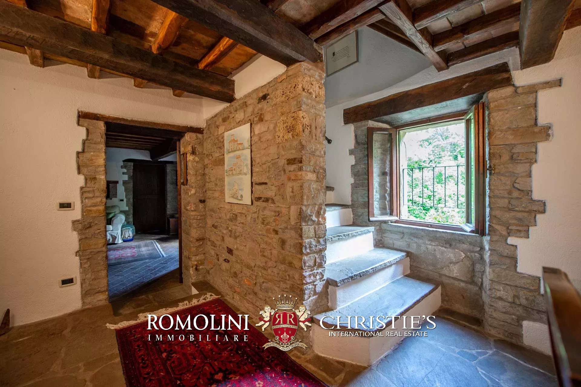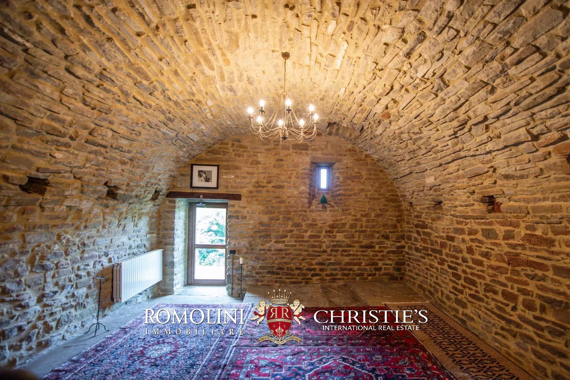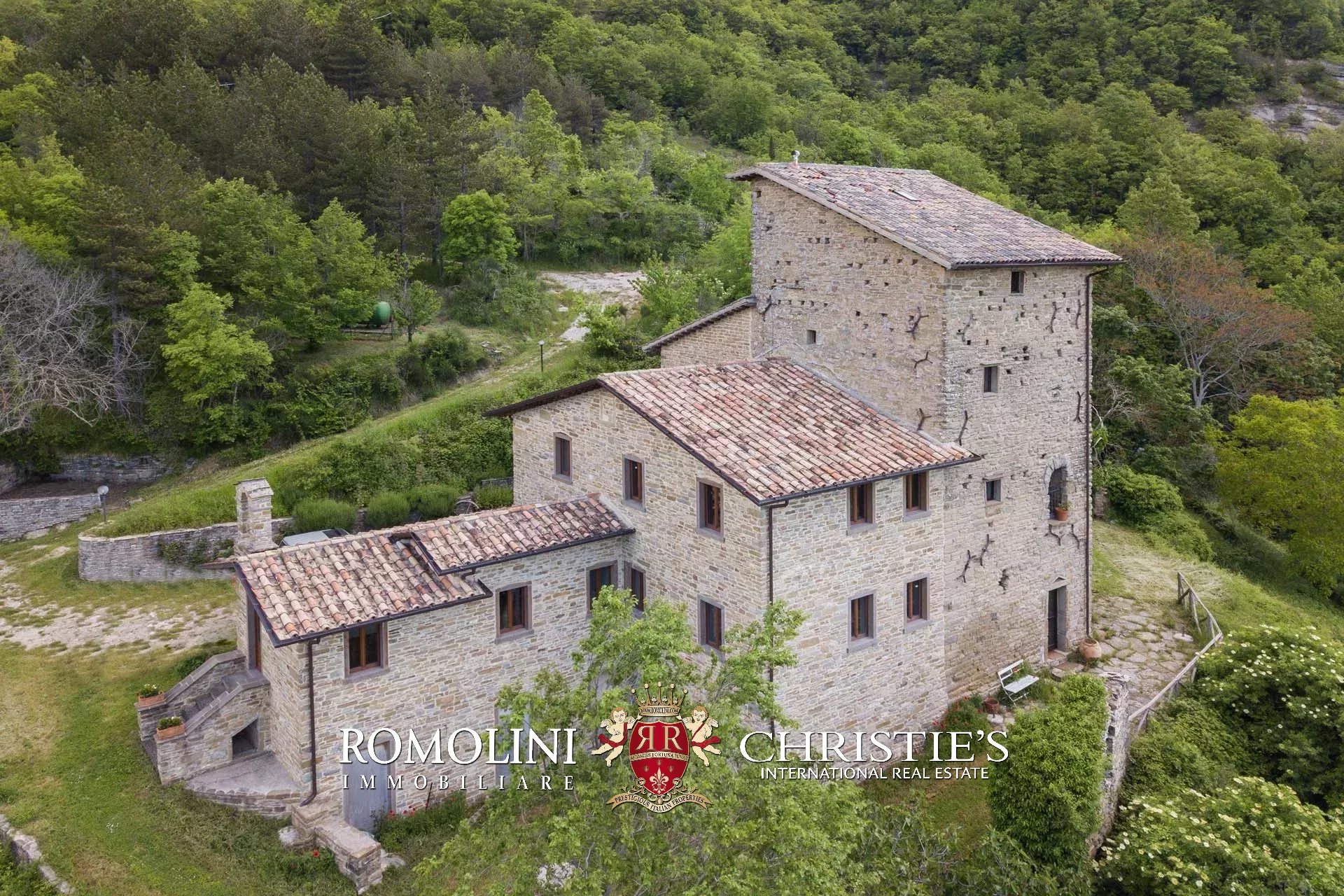 Il casale (505 m², 8 camere e 8 bagni) è diviso in due sezioni, comunicanti al piano terra rialzato ma altrimenti totalmente indipendenti e dotate ognuna del proprio accesso esclusivo. La struttura è il risultato dell’ampliamento di una torre di osservazione longobarda risalente al VII secolo e ancora ben visibile. La fortificazione fu costruita a difesa di un piccolo borgo rurale del IV secolo costruito dai monaci locali come rifugio per i pellegrini che passavano per il vicino valico di Bocca Trabaria.