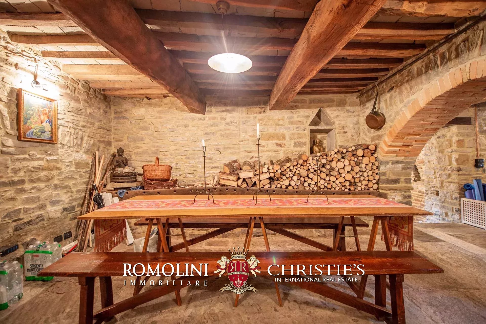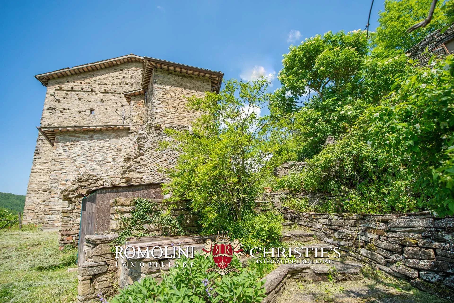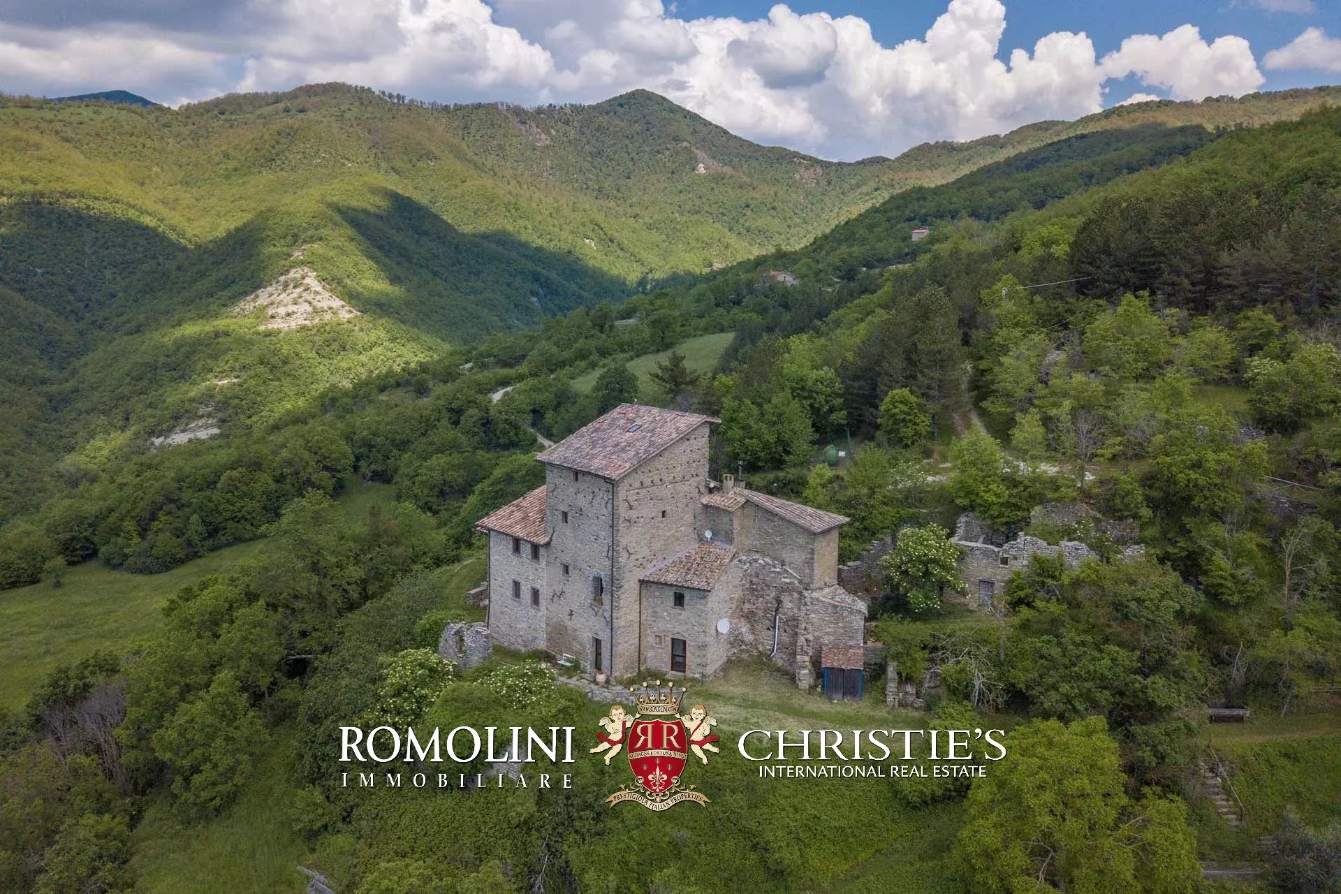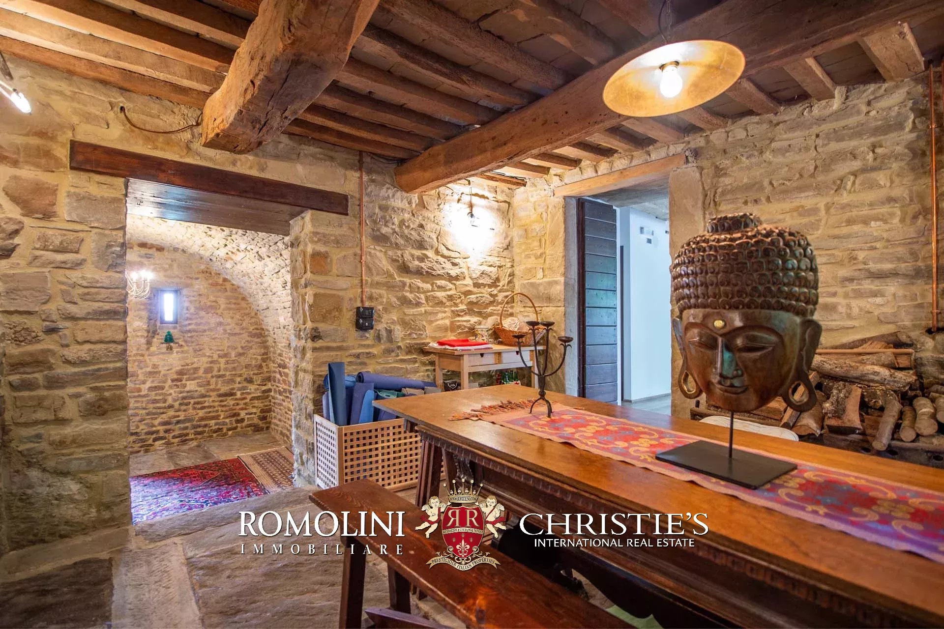 Il casale (505 m², 8 camere e 8 bagni) è diviso in due sezioni, comunicanti al piano terra rialzato ma altrimenti totalmente indipendenti e dotate ognuna del proprio accesso esclusivo. La struttura è il risultato dell’ampliamento di una torre di osservazione longobarda risalente al VII secolo e ancora ben visibile. La fortificazione fu costruita a difesa di un piccolo borgo rurale del IV secolo costruito dai monaci locali come rifugio per i pellegrini che passavano per il vicino valico di Bocca Trabaria.