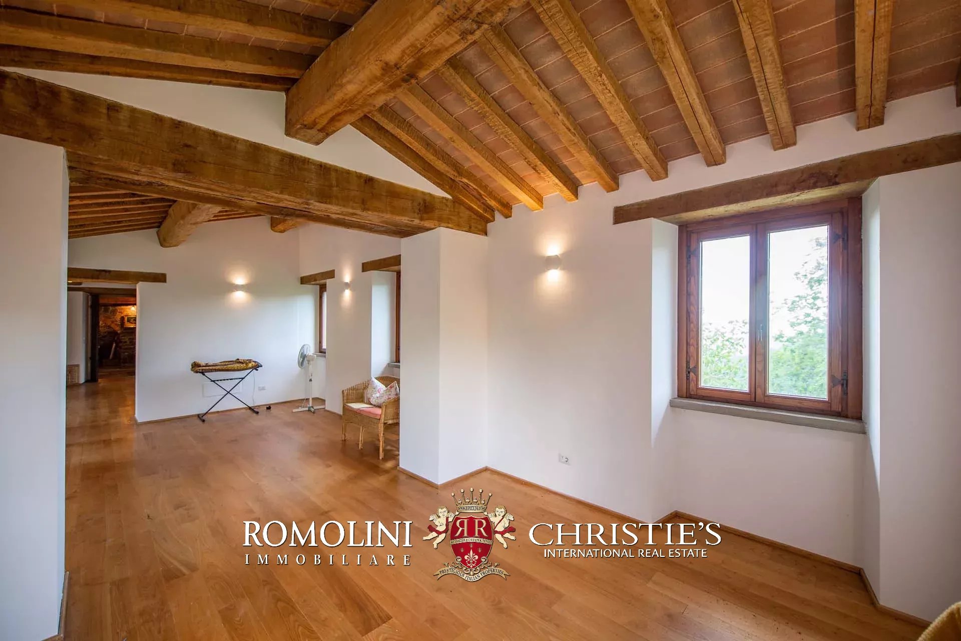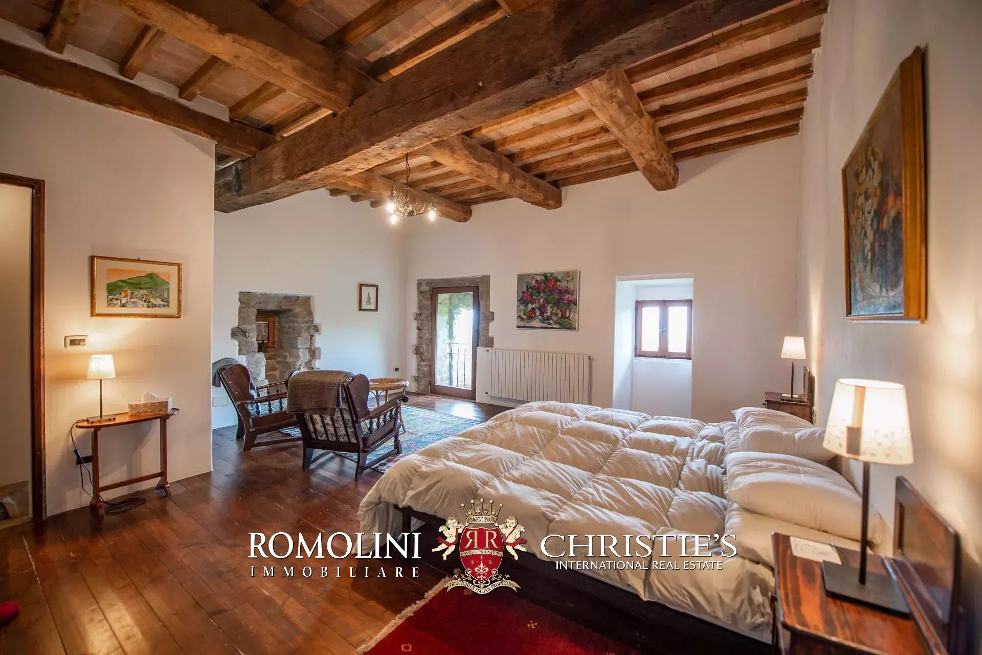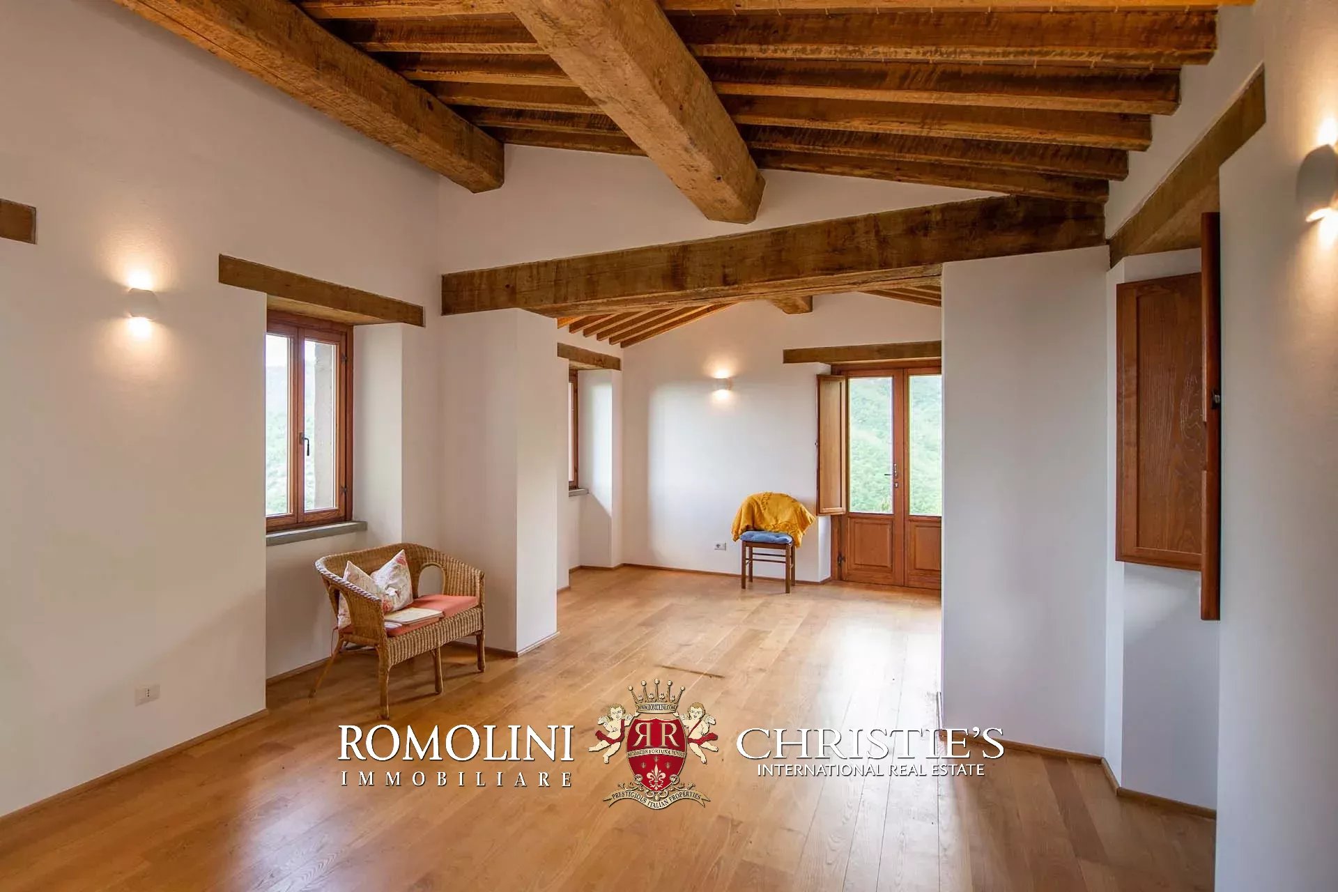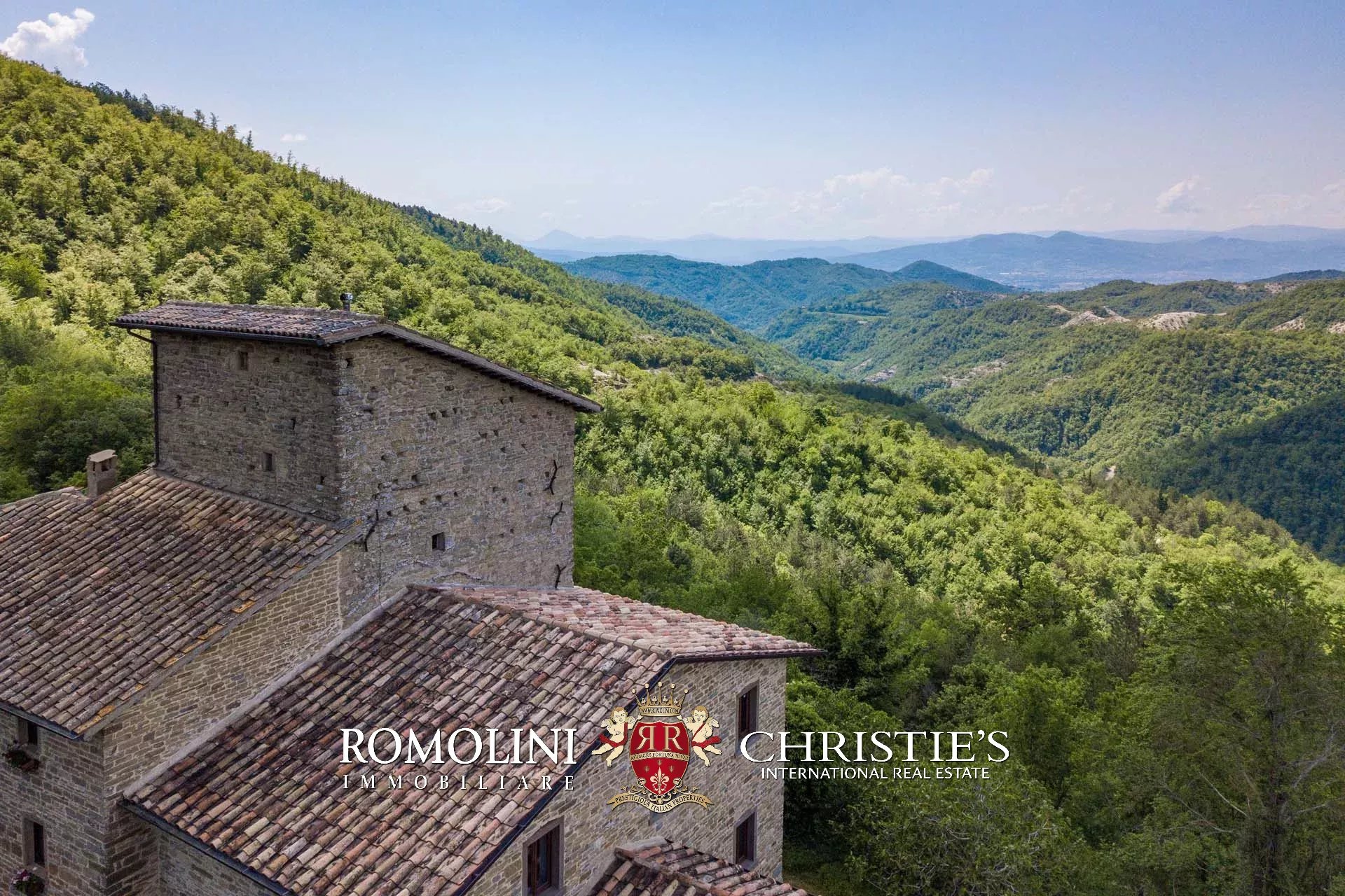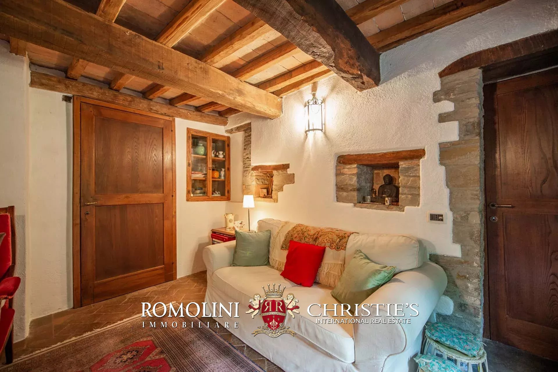 Il casale (505 m², 8 camere e 8 bagni) è diviso in due sezioni, comunicanti al piano terra rialzato ma altrimenti totalmente indipendenti e dotate ognuna del proprio accesso esclusivo. La struttura è il risultato dell’ampliamento di una torre di osservazione longobarda risalente al VII secolo e ancora ben visibile. La fortificazione fu costruita a difesa di un piccolo borgo rurale del IV secolo costruito dai monaci locali come rifugio per i pellegrini che passavano per il vicino valico di Bocca Trabaria.