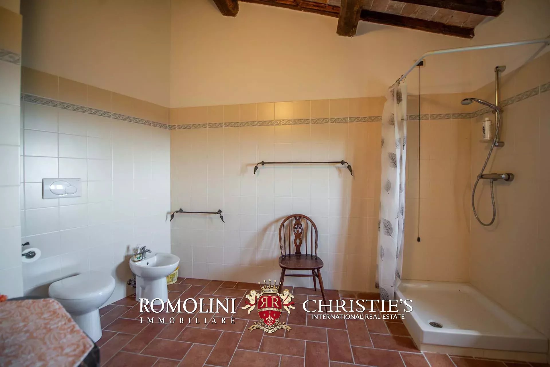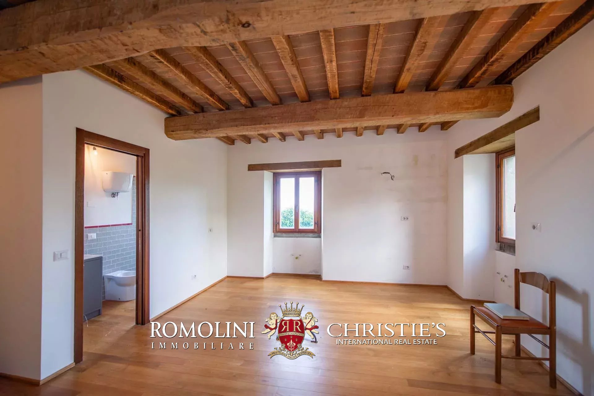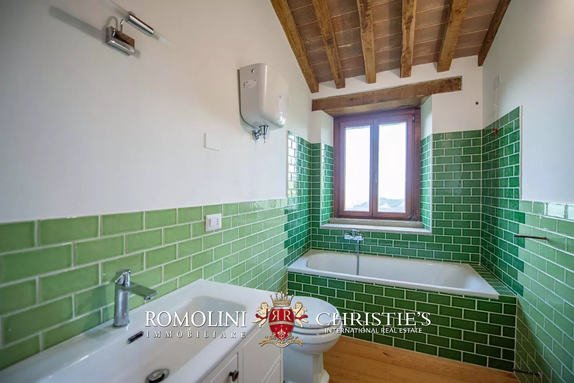 La porzione più antica del casale (215 m², 5 camere e 4 bagni) è quella orientale, ben riconoscibile dalla torre. Dal piano terra rialzato, l’ingresso a comune conduce a un piccolo disimpegno con scala che sale al primo piano. Si arriva così a un soggiorno centrale con camino che disimpegna la camera padronale con bagno privato e una piccola camera per gli ospiti. Salendo ancora, la scala arriva alla cucina (direttamente sopra il soggiorno) che disimpegna un bagno, una camera e una seconda camera con bagno privato e cabina armadio. Una piccola scala, posta nel disimpegno che introduce alla camera, conduce all’ultimo livello della torre dove è stata ricavata una spaziosa camera panoramica con bagno e soppalco.