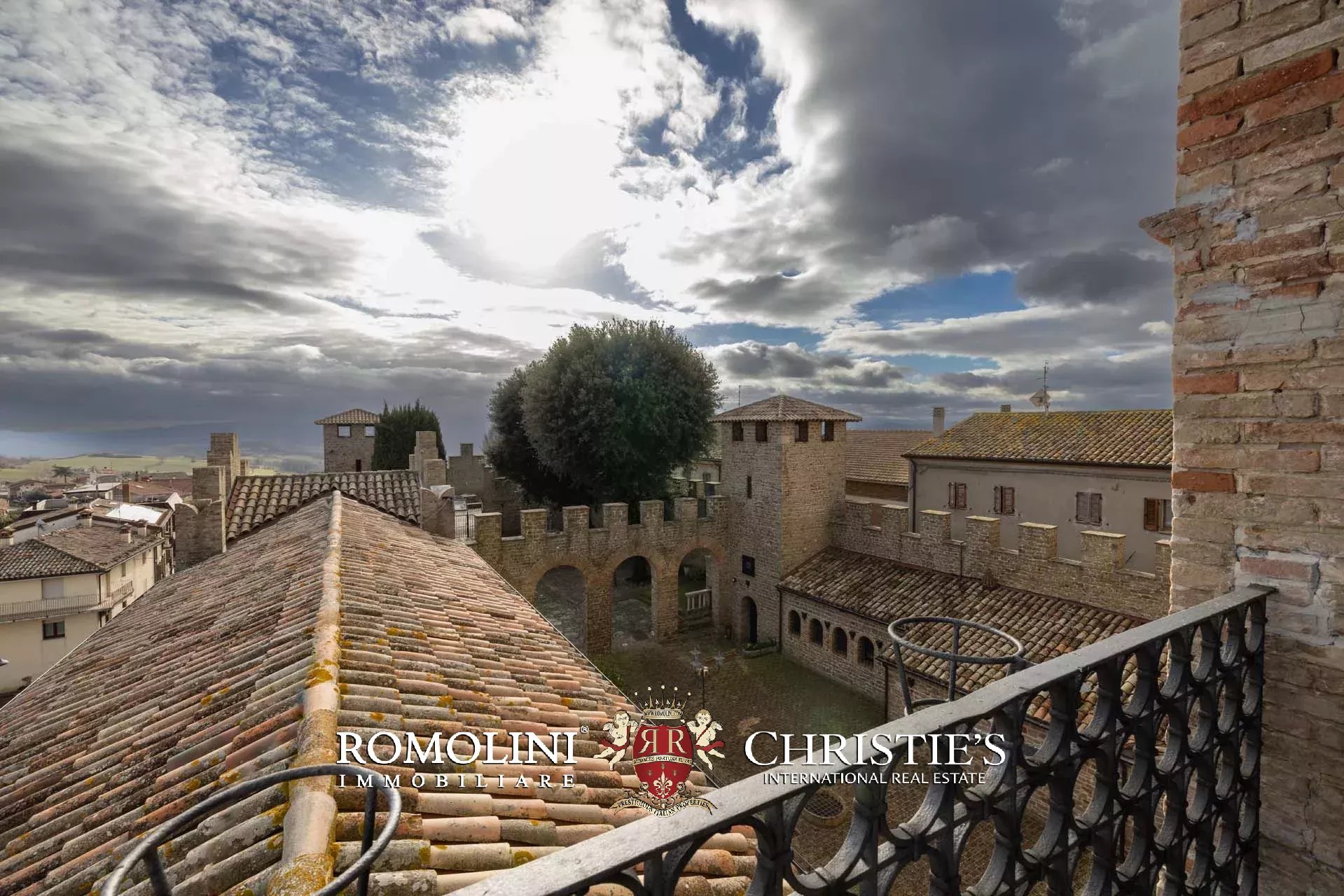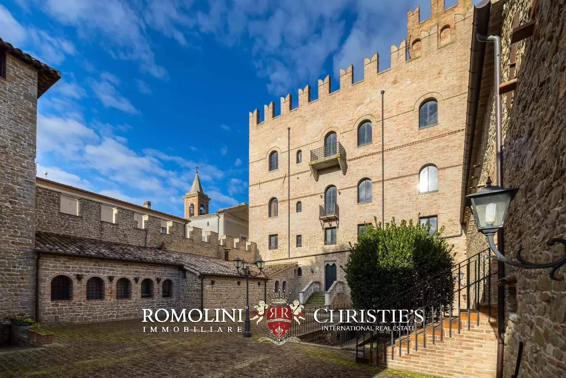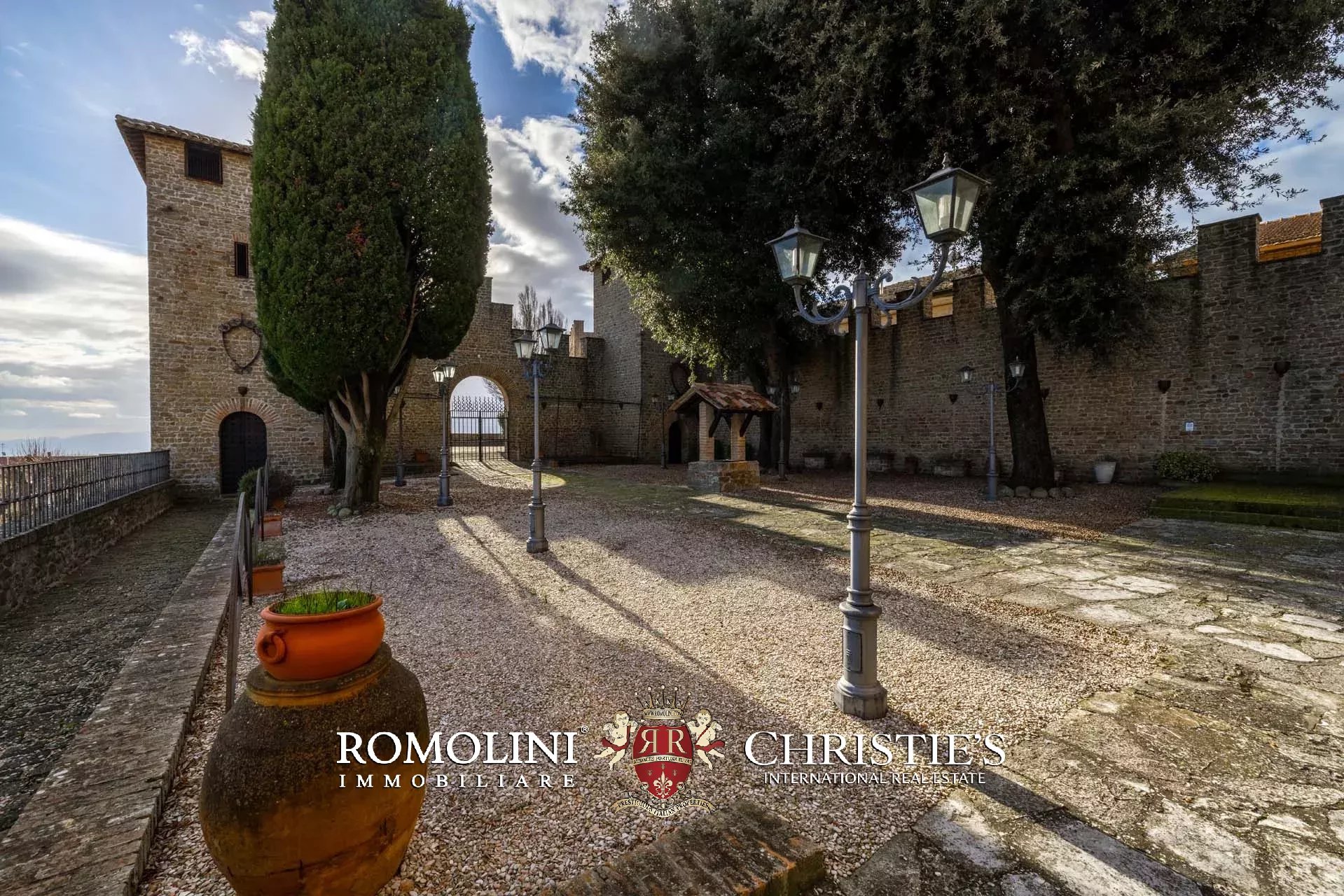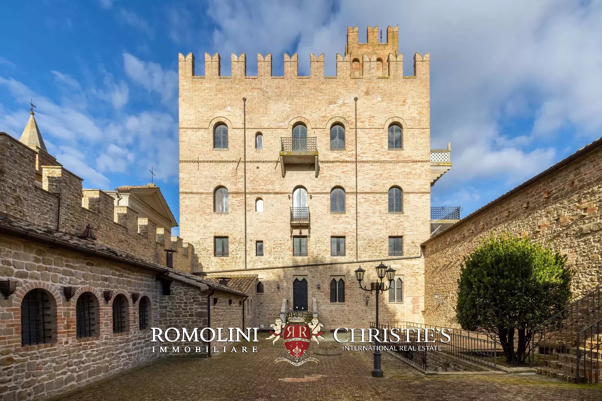 La proprietà, edificata intorno al 1290 e ampliata nei secoli successivi, è racchiusa da imponenti mura merlate che garantiscono elevata privacy pur trovandosi nel centro del borgo. Il complesso si sviluppa attorno a una scenografica corte interna ed è caratterizzato dalla maestosa torre principale, visibile anche a notevole distanza, oltre a ulteriori torri perimetrali e suggestivi ambienti sotterranei.