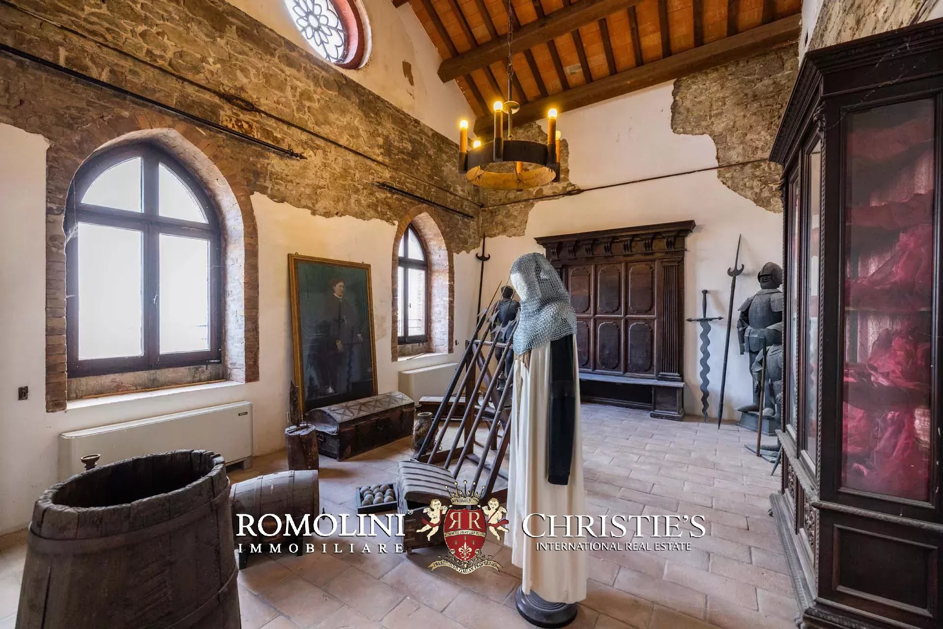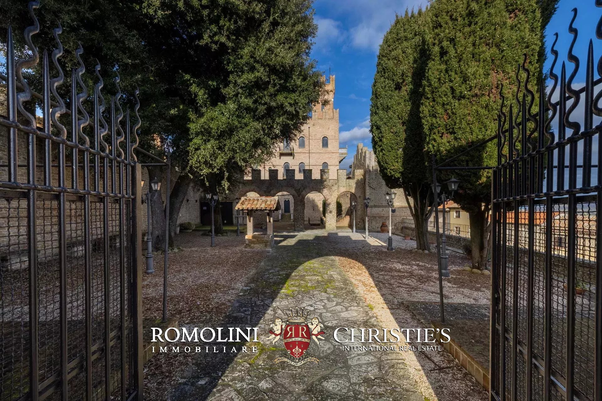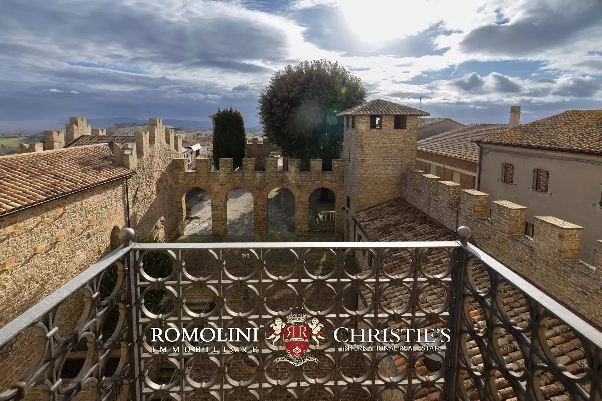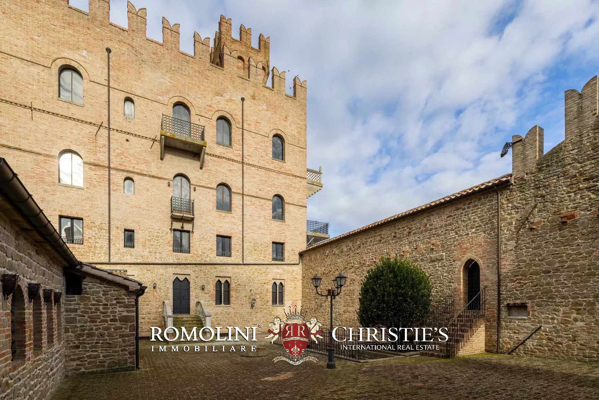 La proprietà, edificata intorno al 1290 e ampliata nei secoli successivi, è racchiusa da imponenti mura merlate che garantiscono elevata privacy pur trovandosi nel centro del borgo. Il complesso si sviluppa attorno a una scenografica corte interna ed è caratterizzato dalla maestosa torre principale, visibile anche a notevole distanza, oltre a ulteriori torri perimetrali e suggestivi ambienti sotterranei.