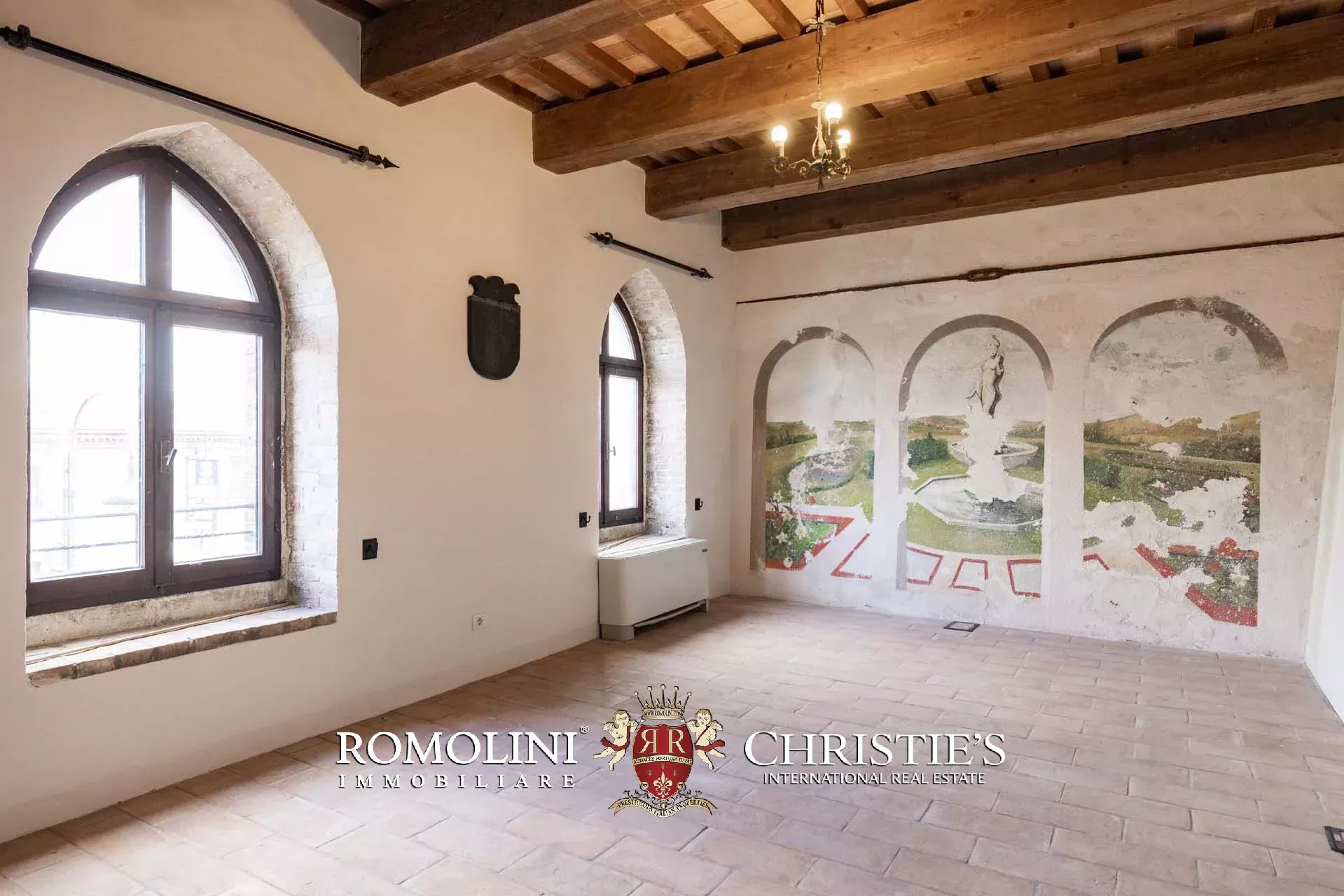 Il terzo e il quarto piano comprendono due raffinati appartamenti caratterizzati da soffitti con travi originali e ambienti impreziositi da affreschi storici, probabilmente antiche residenze private delle famiglie nobili che si sono succedute nella proprietà. Entrambi i livelli dispongono di splendide terrazze panoramiche, una con vista verso il mare e una affacciata sulla corte interna del castello.