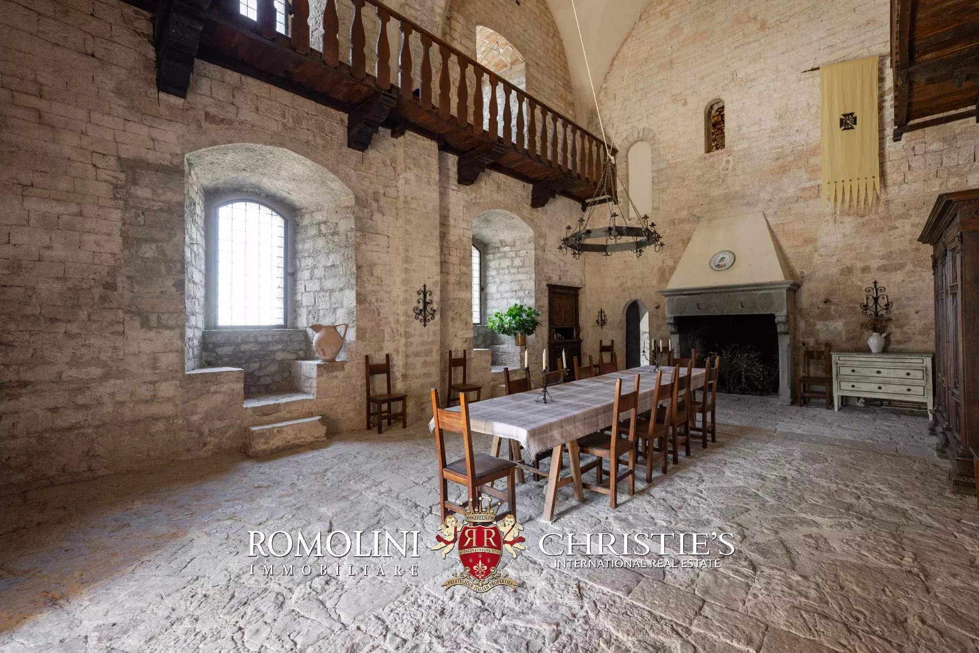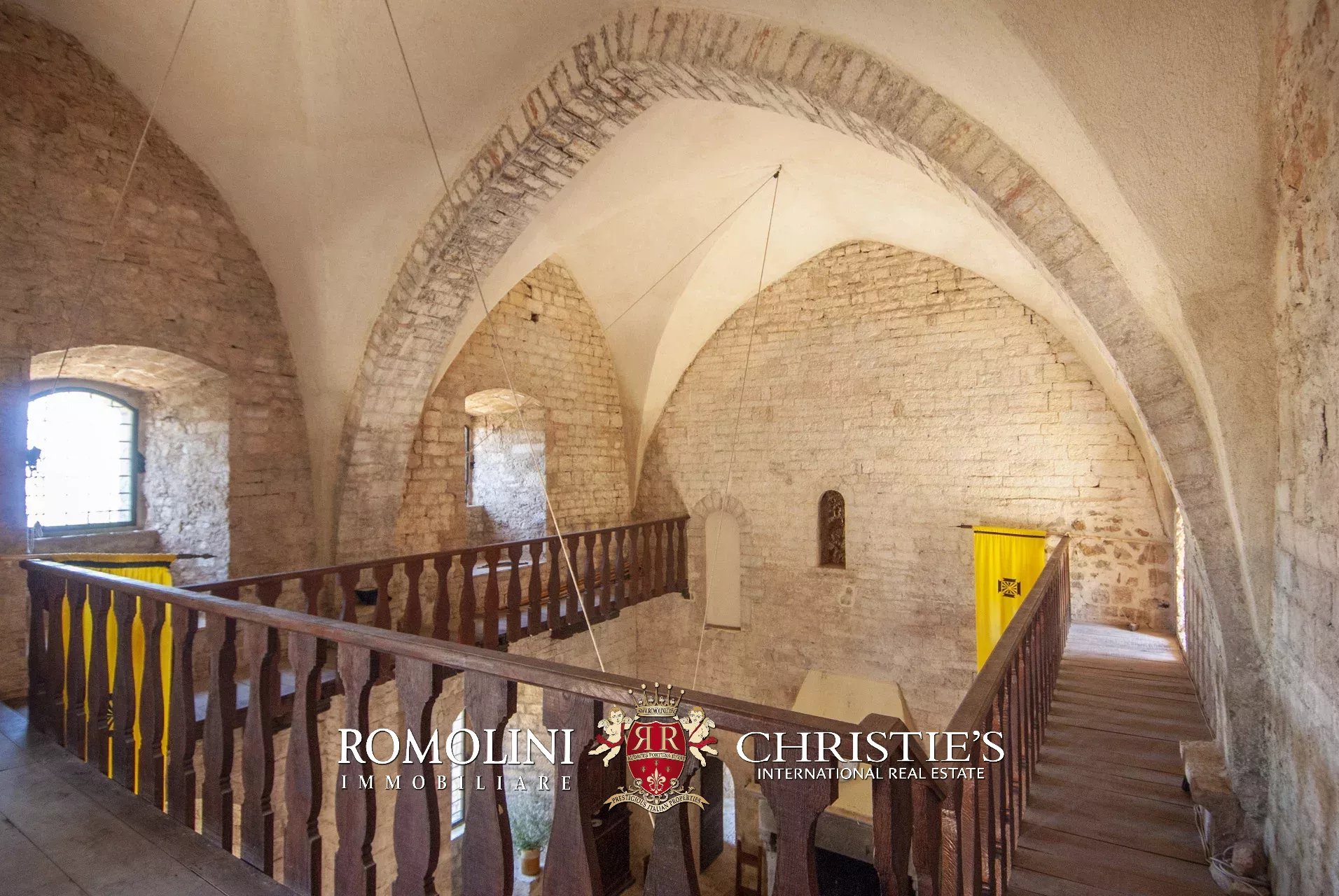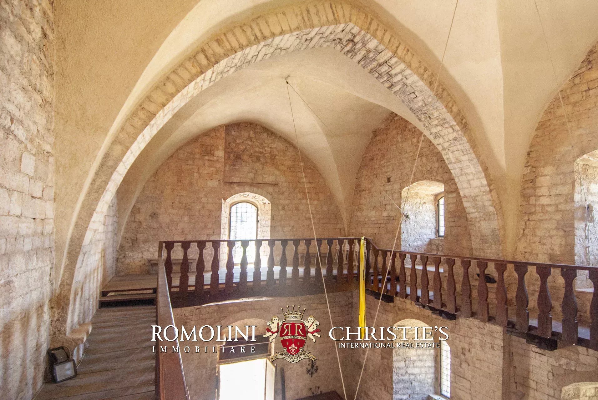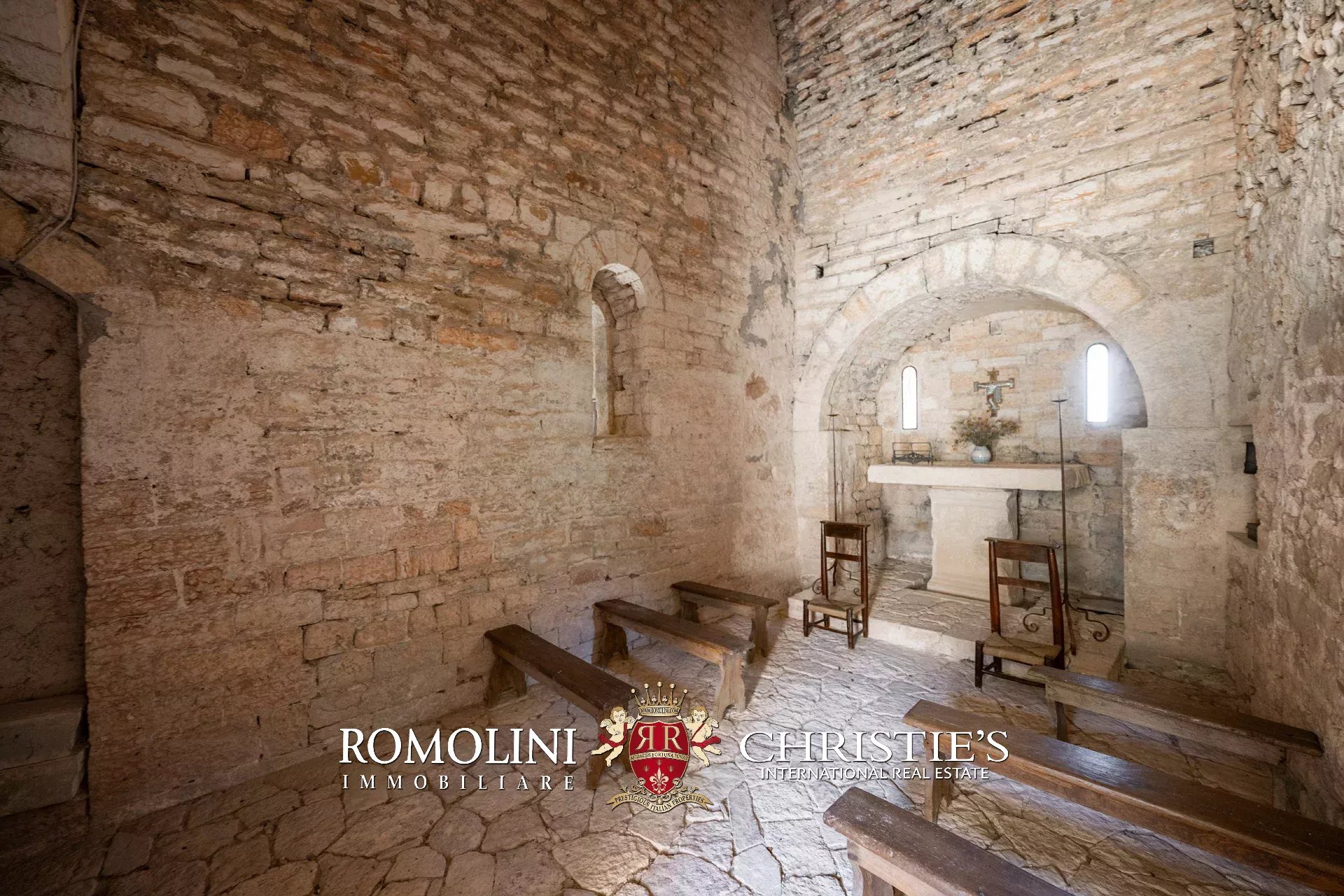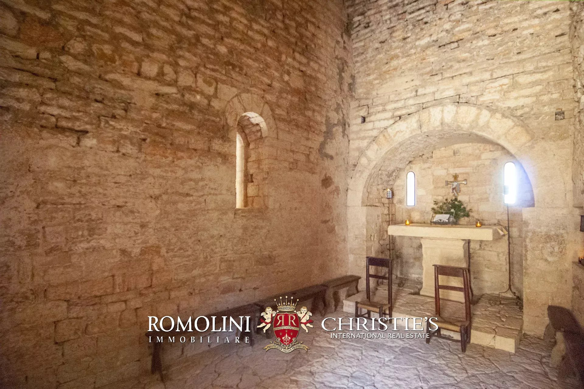 La pieve romanica (152 m², 1 bagno) è stata convertita in un bellissimo salone con camino che mantiene inalterato l’aspetto originario dell’edificio con grandi colonne e soffitti con volte a crociera. Sul retro si trova una piccola stanza di servizio con bagno. Al piano superiore, accessibile comunque all’esterno trovandosi l’edificio posto lungo il pendio, si trova la vecchia cappella consacrata e una balaustra lignea che corre tutto attorno al salone del piano inferiore.