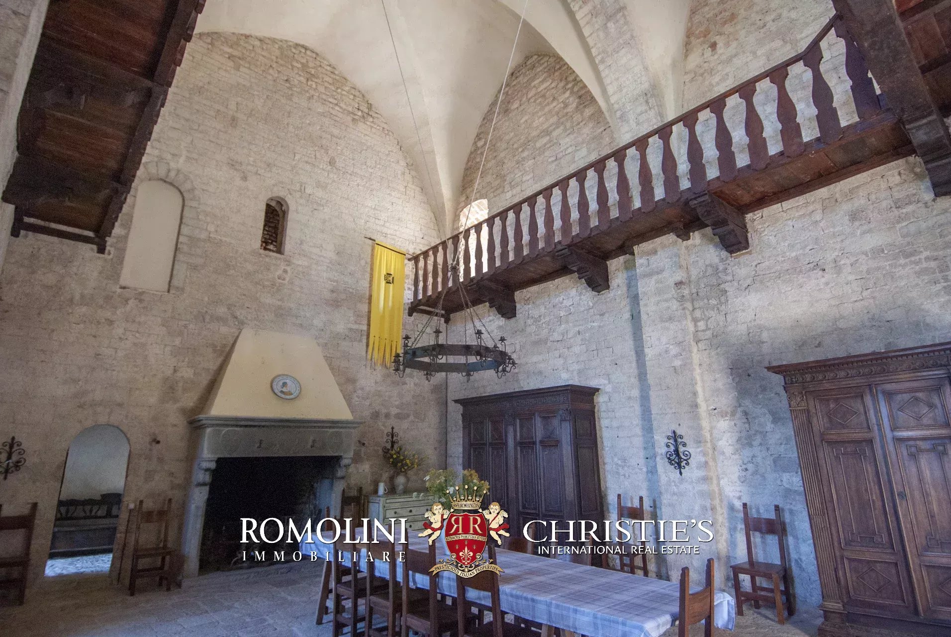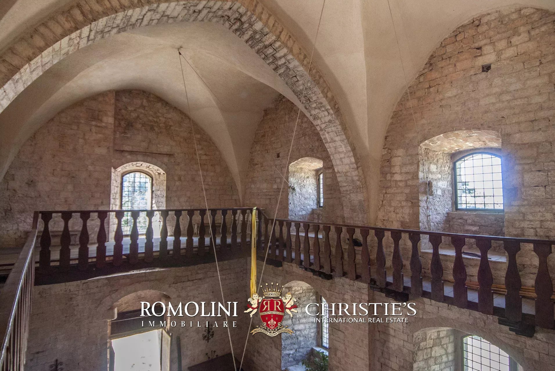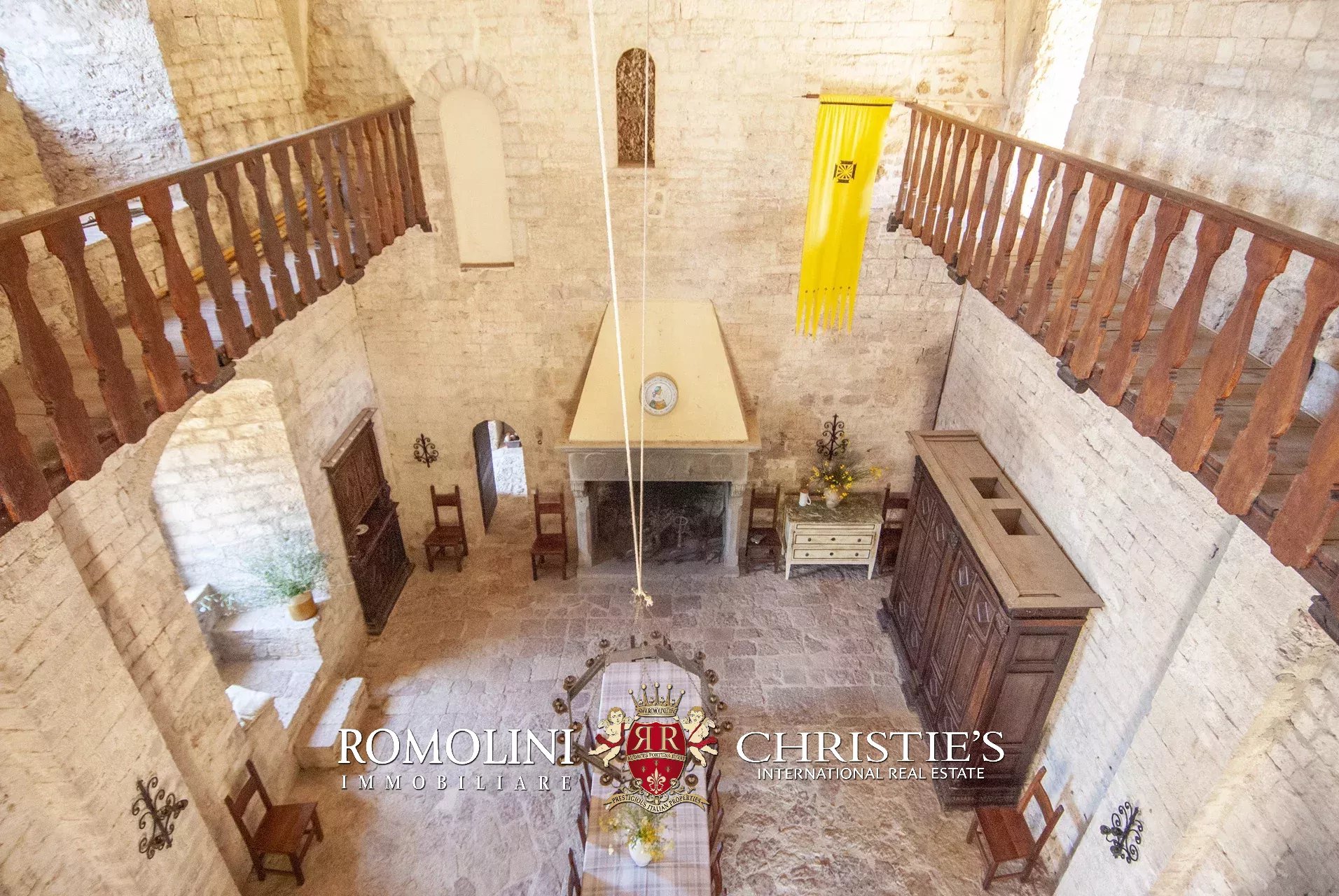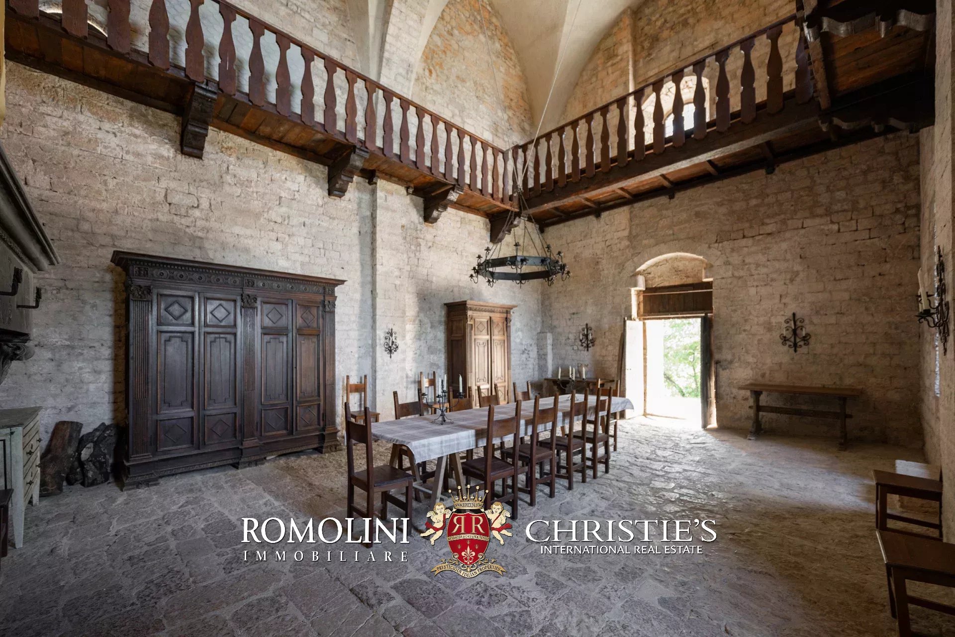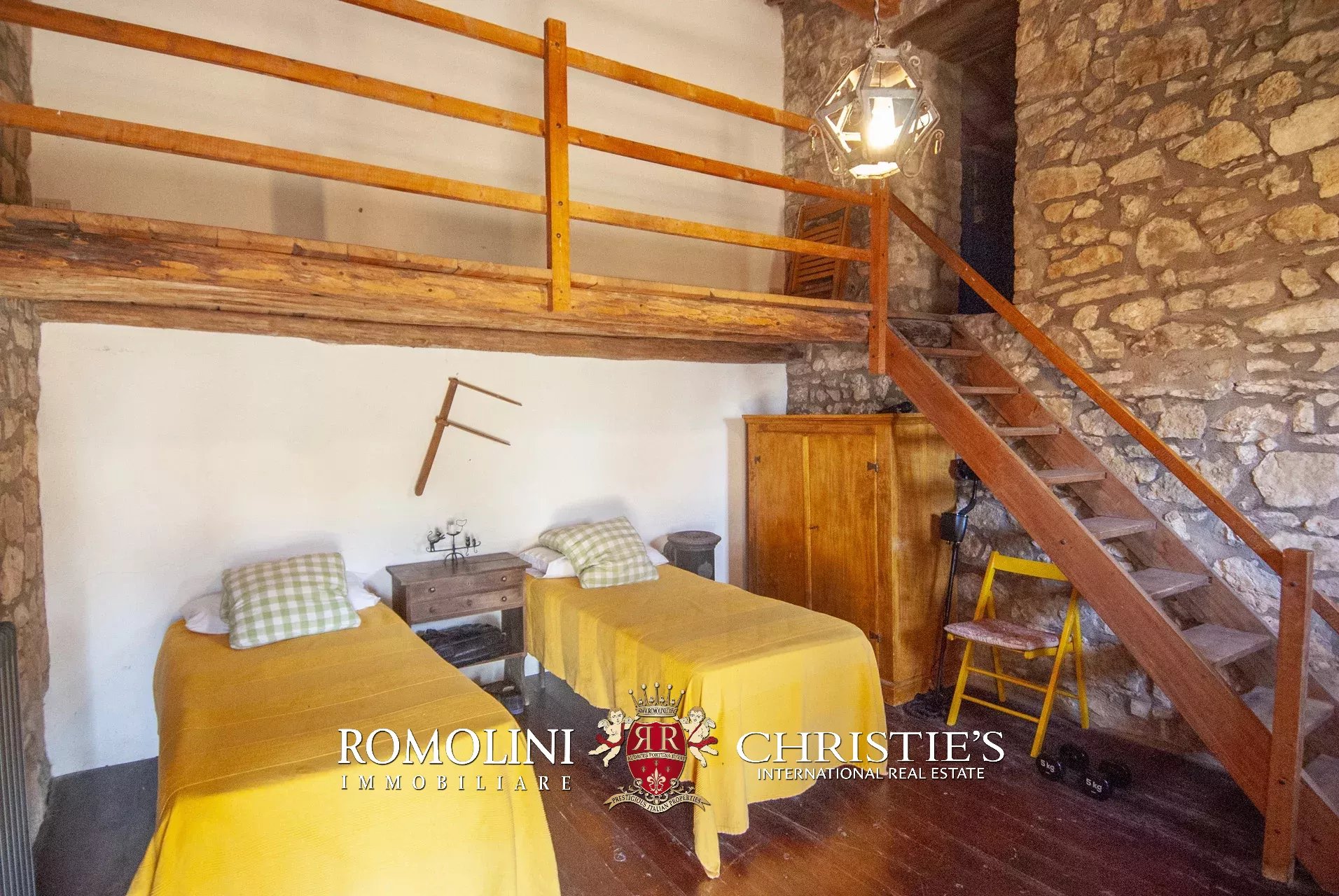 La pieve romanica (152 m², 1 bagno) è stata convertita in un bellissimo salone con camino che mantiene inalterato l’aspetto originario dell’edificio con grandi colonne e soffitti con volte a crociera. Sul retro si trova una piccola stanza di servizio con bagno. Al piano superiore, accessibile comunque all’esterno trovandosi l’edificio posto lungo il pendio, si trova la vecchia cappella consacrata e una balaustra lignea che corre tutto attorno al salone del piano inferiore.