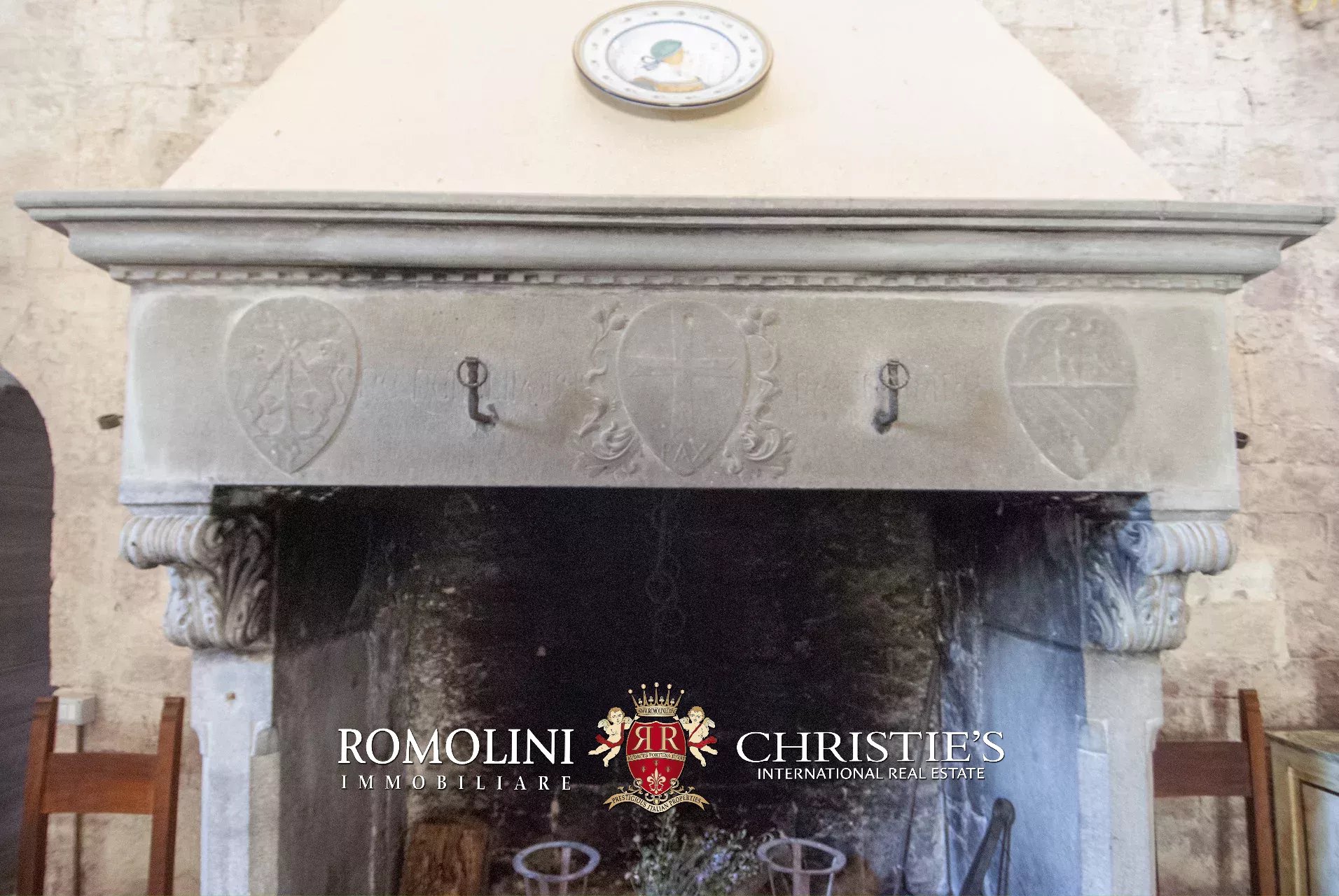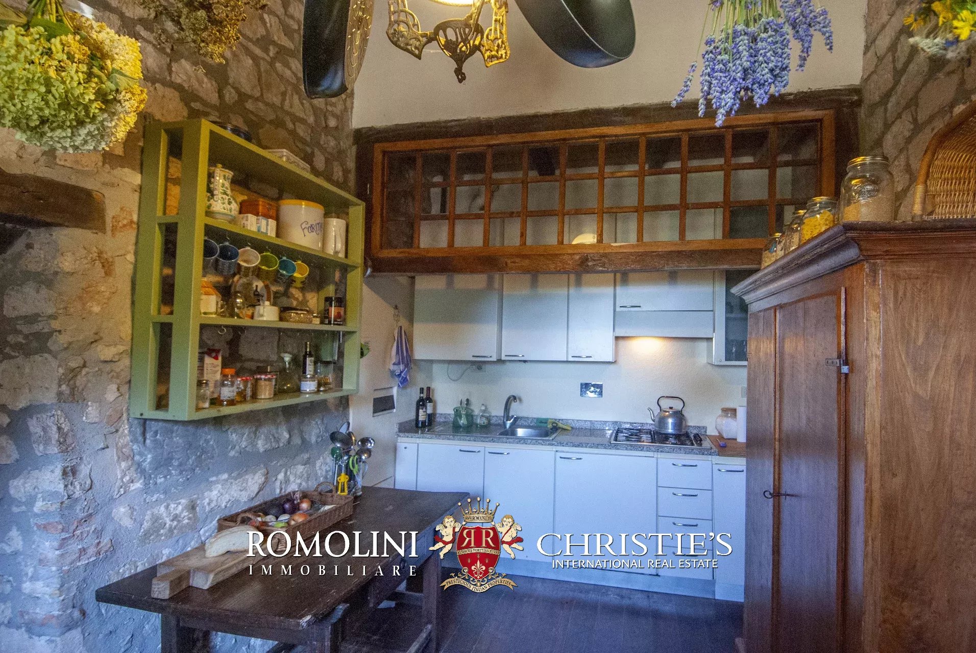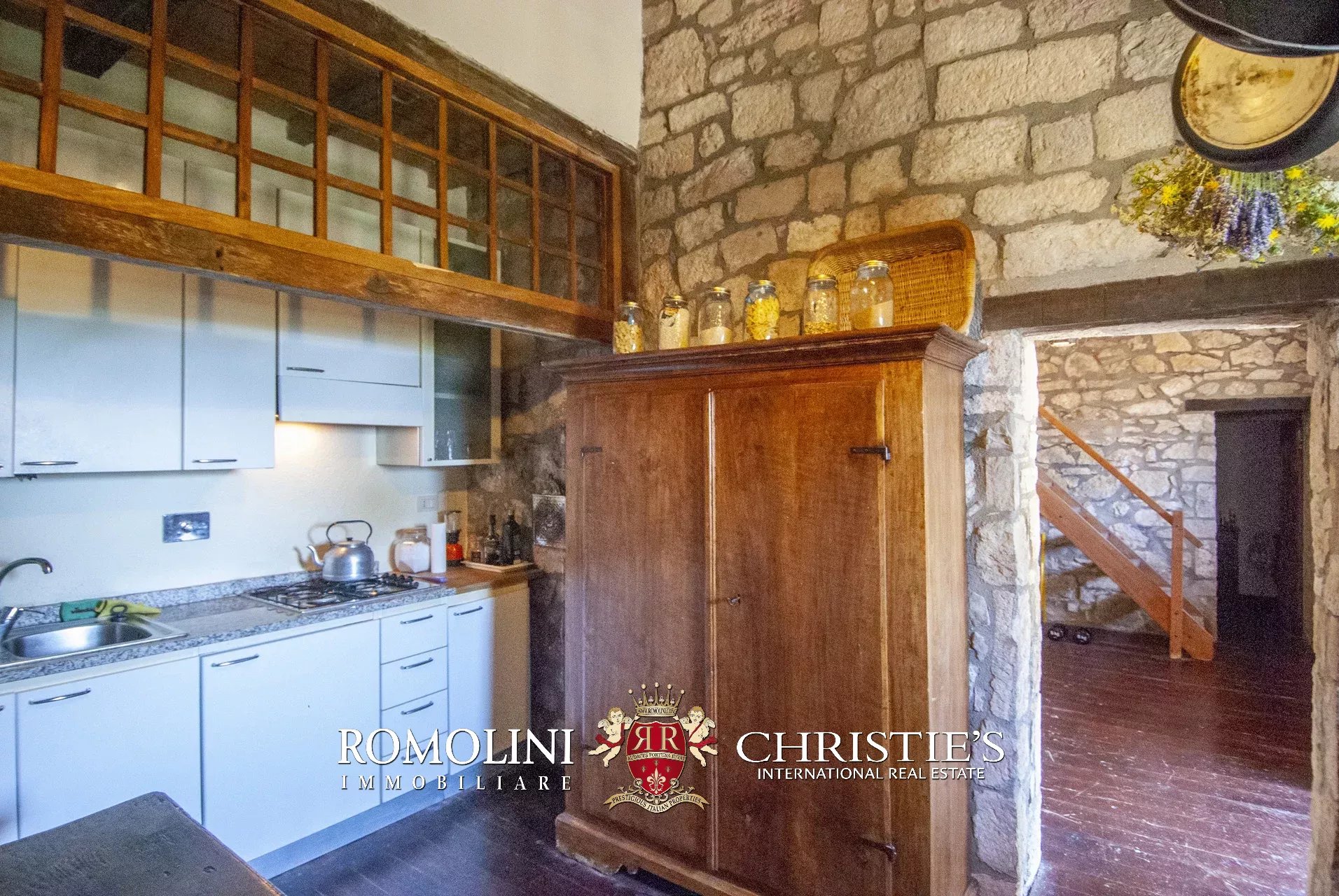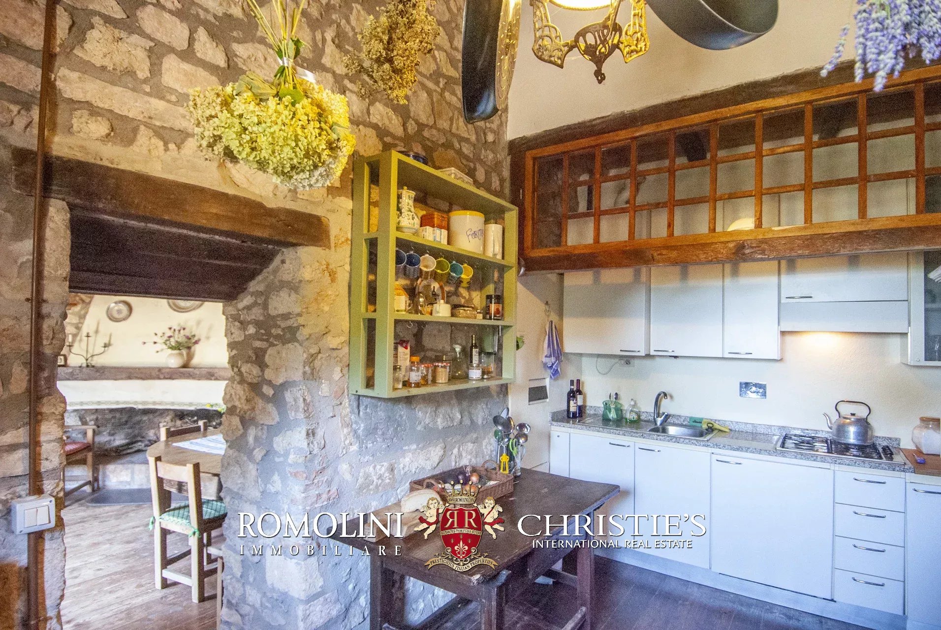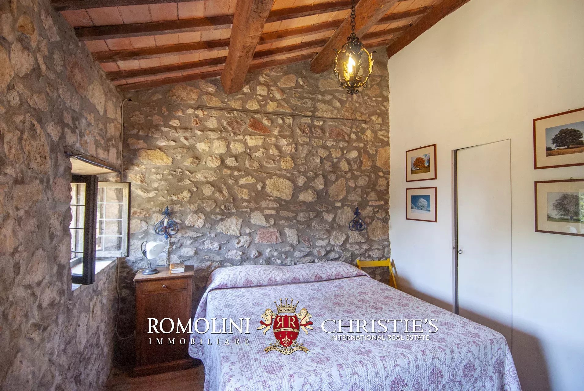 La pieve romanica (152 m², 1 bagno) è stata convertita in un bellissimo salone con camino che mantiene inalterato l’aspetto originario dell’edificio con grandi colonne e soffitti con volte a crociera. Sul retro si trova una piccola stanza di servizio con bagno. Al piano superiore, accessibile comunque all’esterno trovandosi l’edificio posto lungo il pendio, si trova la vecchia cappella consacrata e una balaustra lignea che corre tutto attorno al salone del piano inferiore.