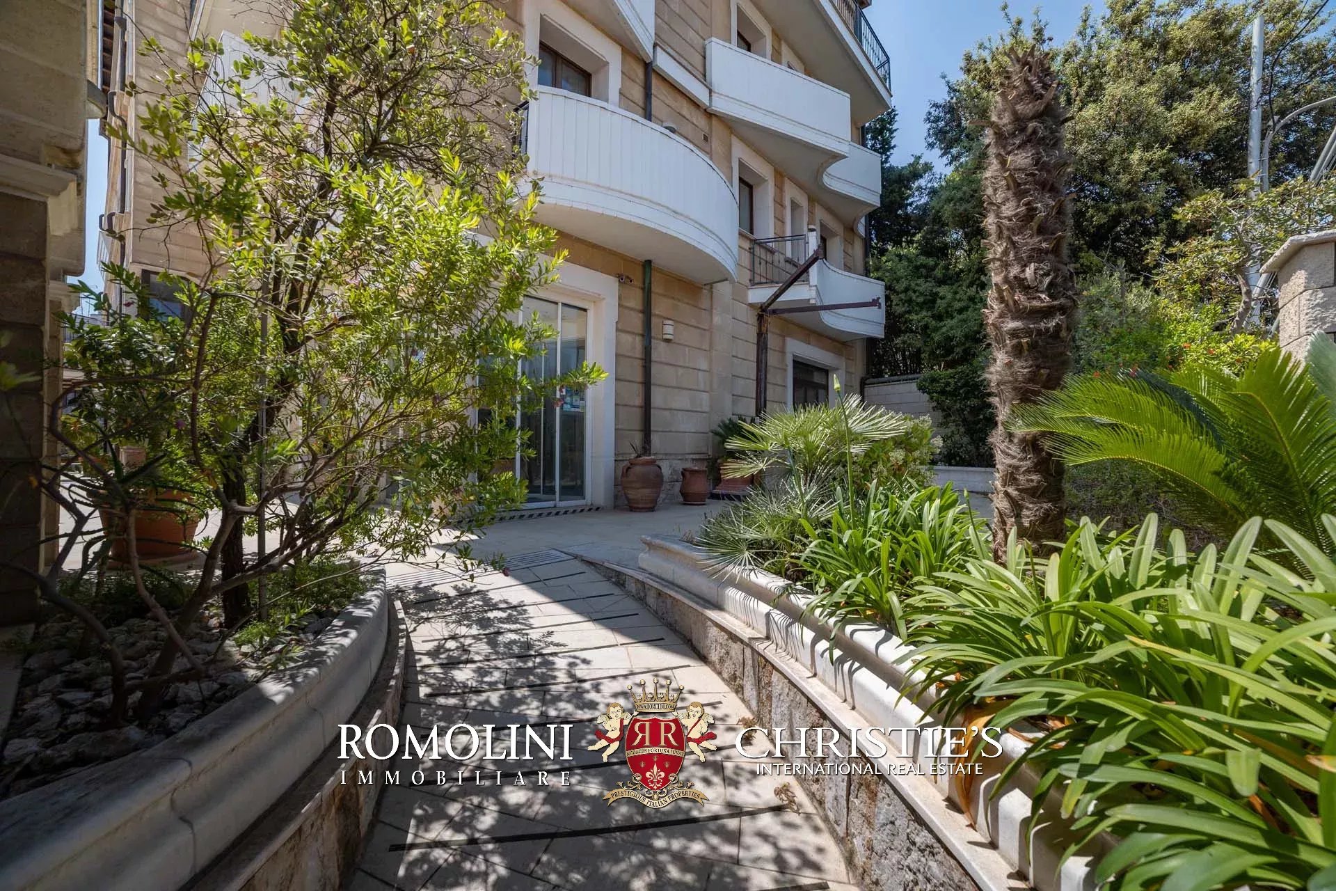 Gli spazi esterni (circa 550 m²) sono tutti sistemati a verde e lastricati. La piscina 14 × 7 m (di forma irregolare) è posta in un angolo del complesso, riparata dall’arredo vegetale che circonda la proprietà su tutti i lati. Sul retro dell’edificio una scala sale alla terrazza pavimentata del primo piano dove si trova poi anche una scala che sale ai livelli superiori: questo permette agli ospiti di raggiungere le camere direttamente dall’esterno senza dover passare dalla hall dell’hotel.