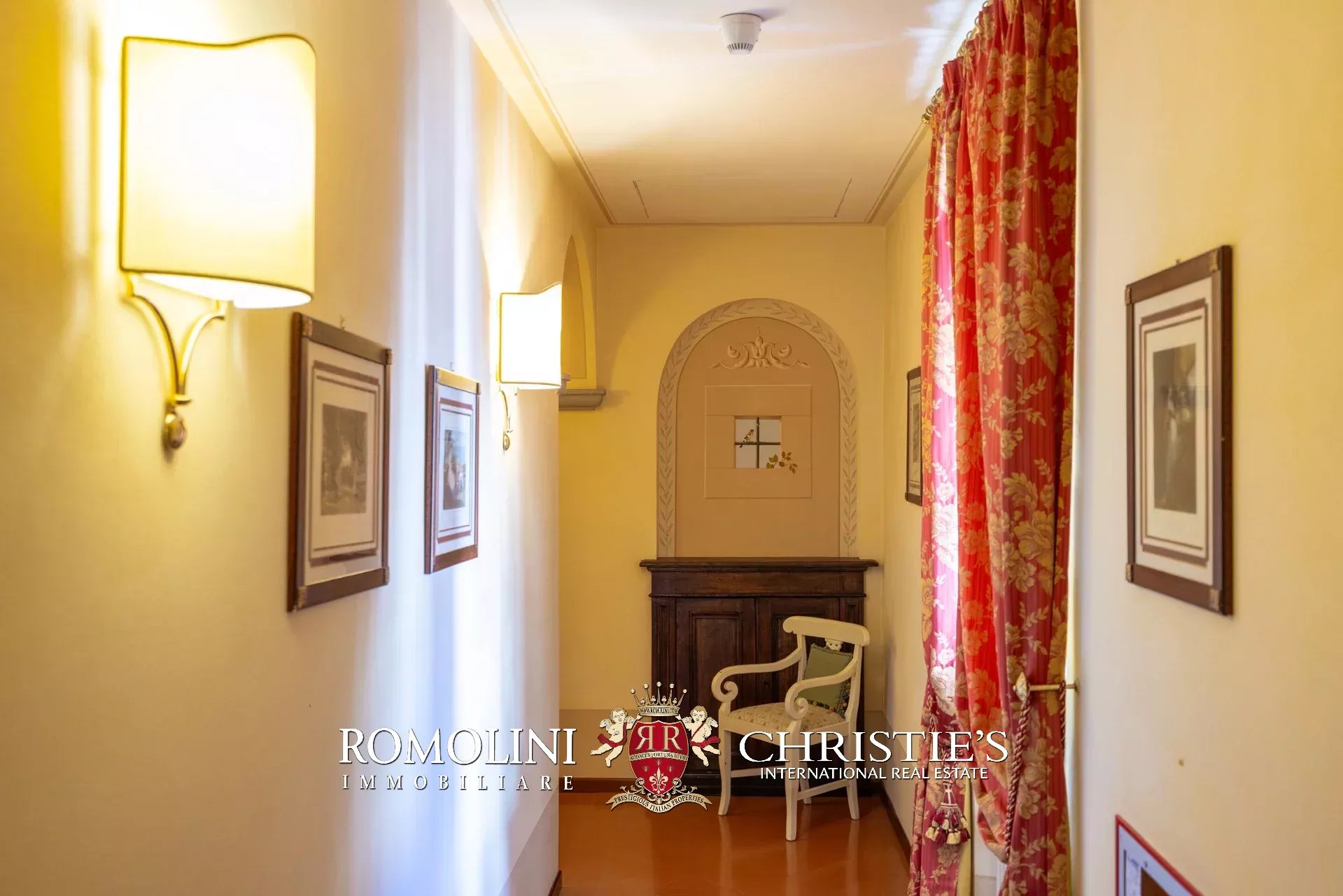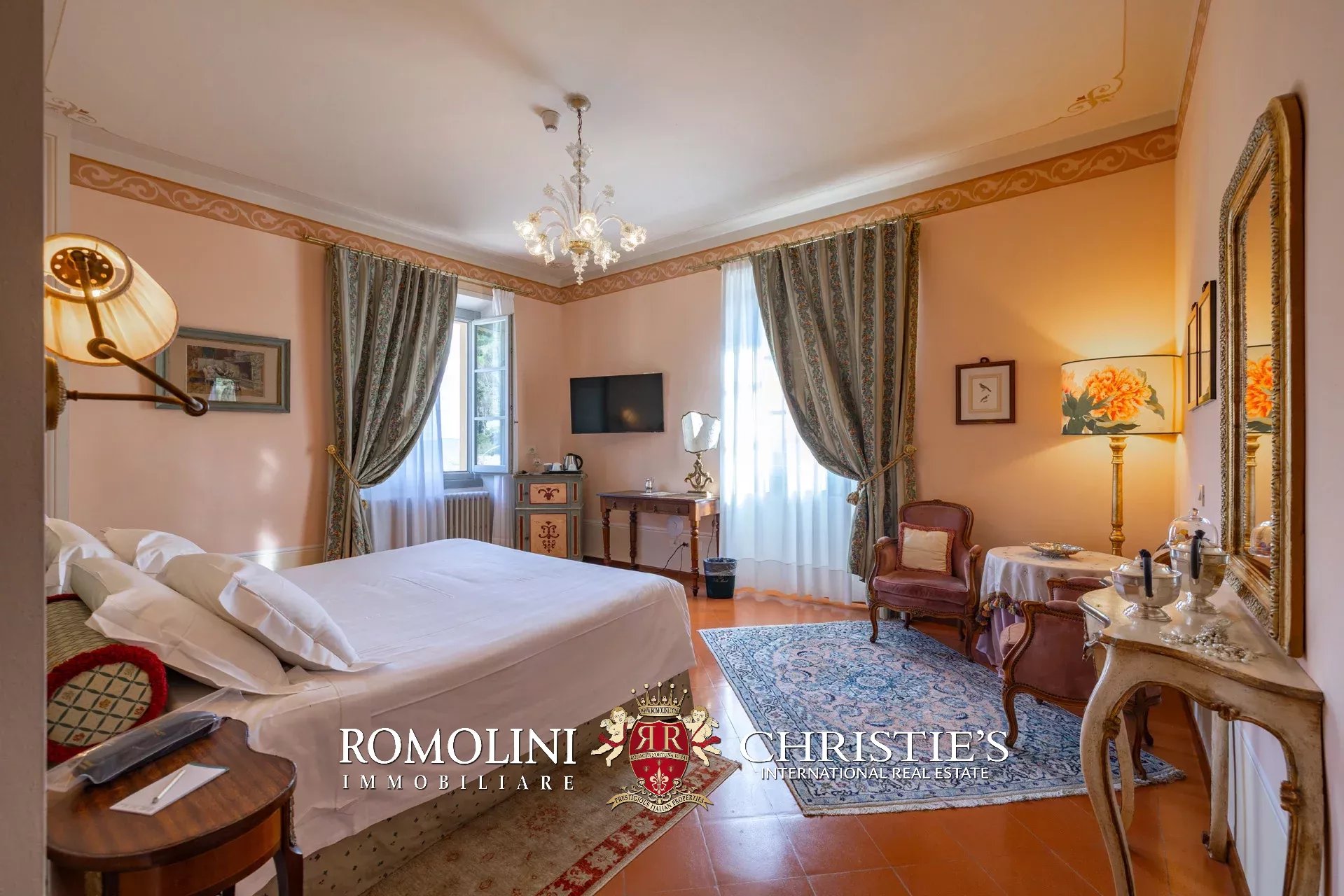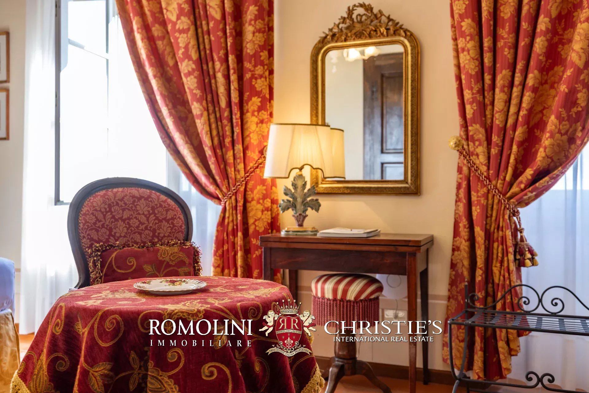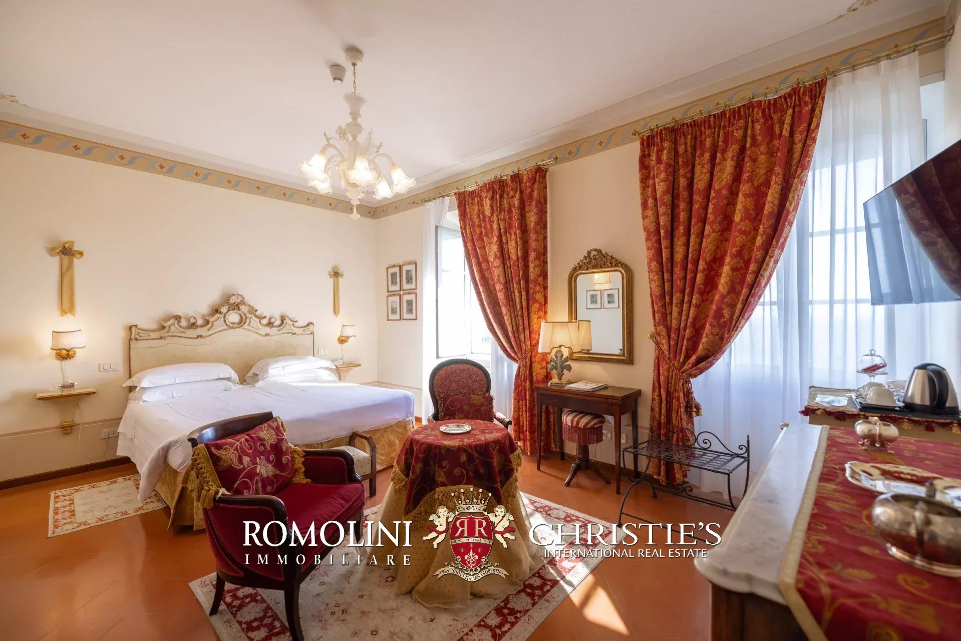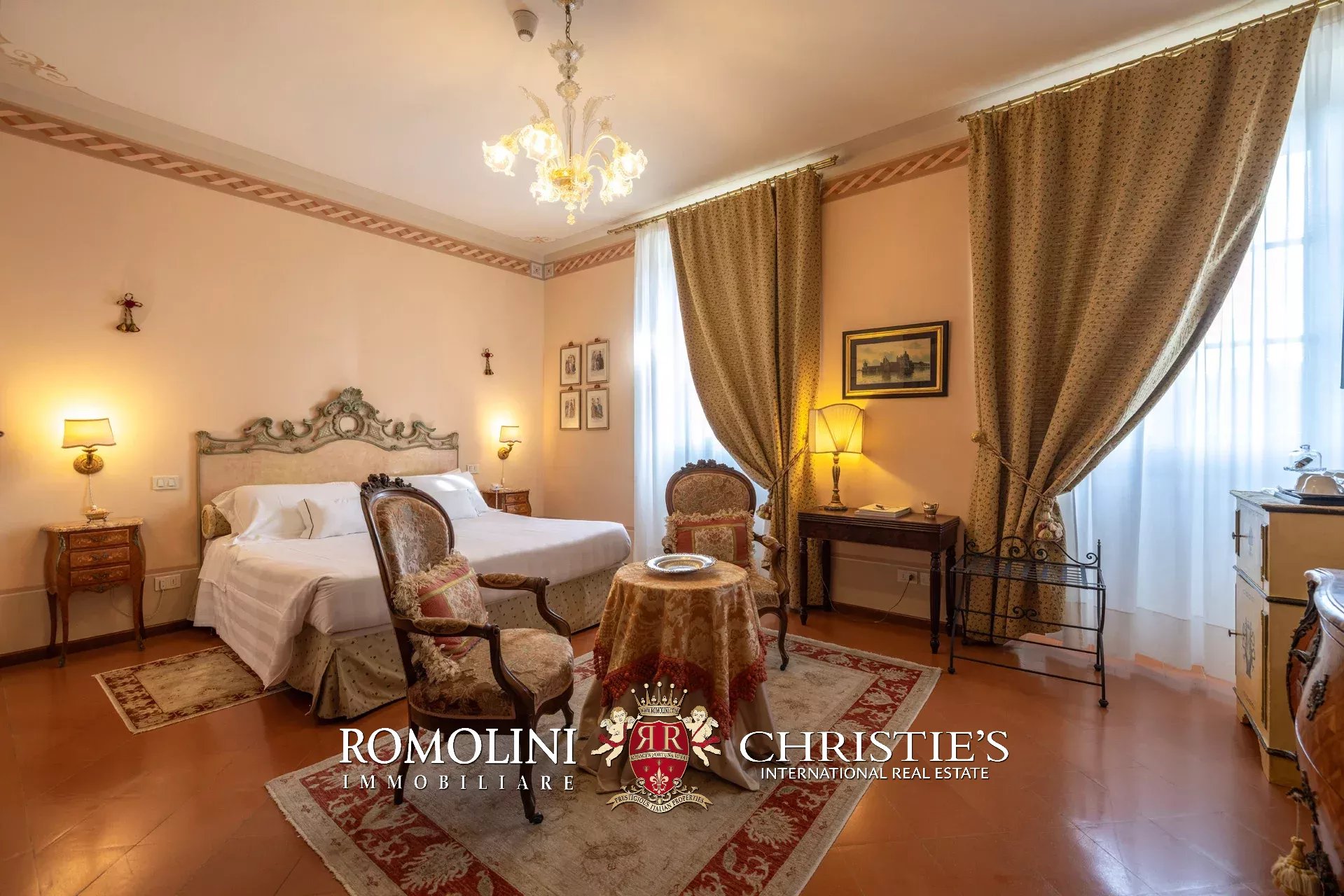 Tutto trasmette un senso di lusso e di prestigio, di ricercatezza e di eleganza. L’arredamento è composto da pezzi di alto antiquariato e tessuti preziosi, le pareti e i soffitti sono stati decorati da prestigiose maestranze toscane e i bagni realizzati rigorosamente in stile. Il riscaldamento è indipendente e zonale regolabile per ogni singola stanza.