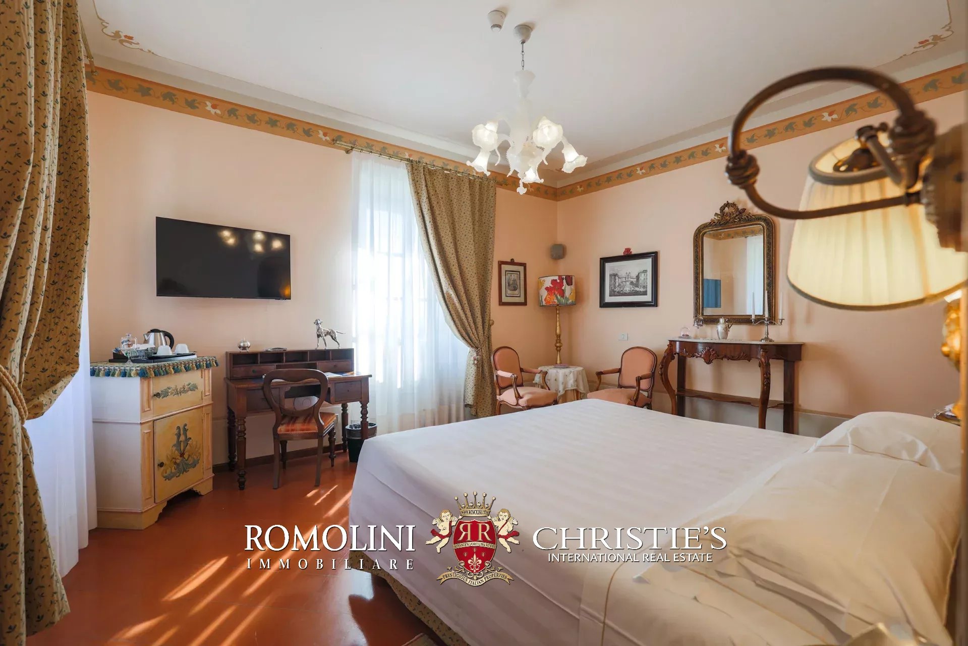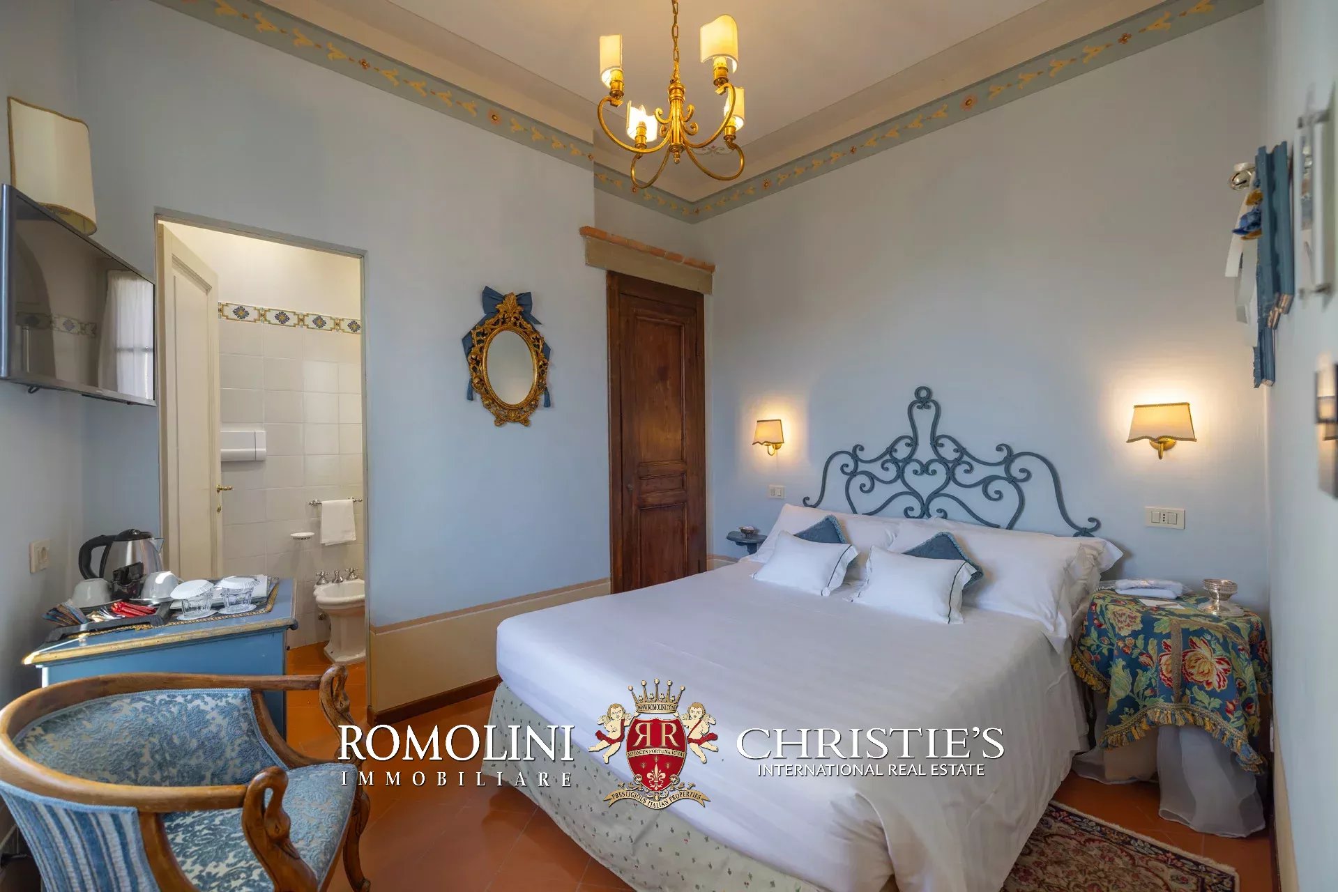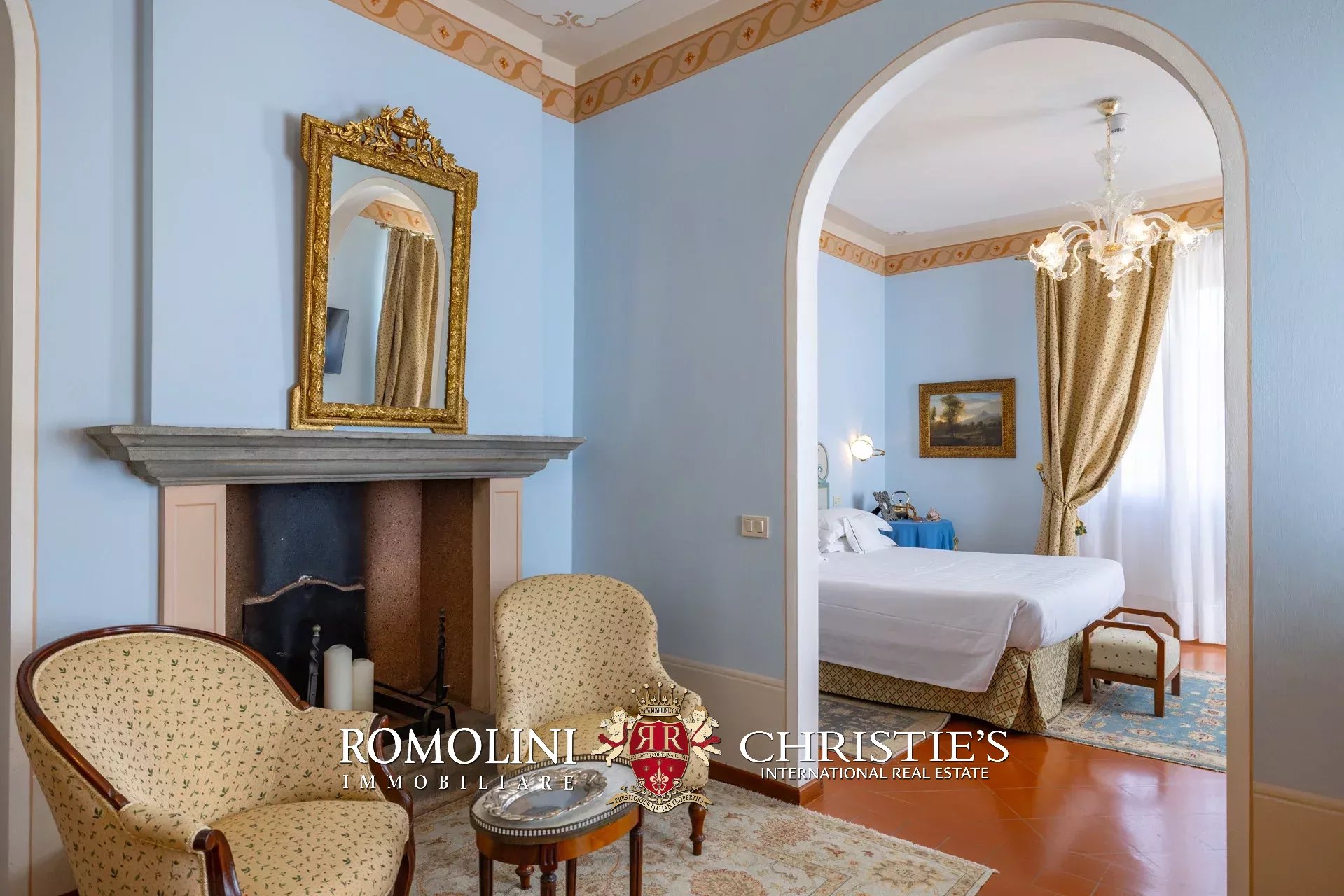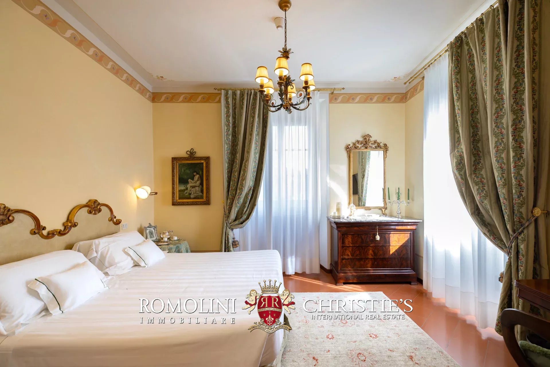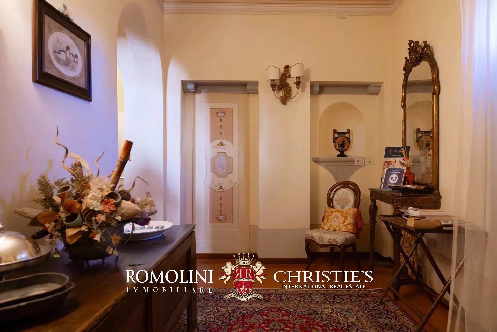 Tutto trasmette un senso di lusso e di prestigio, di ricercatezza e di eleganza. L’arredamento è composto da pezzi di alto antiquariato e tessuti preziosi, le pareti e i soffitti sono stati decorati da prestigiose maestranze toscane e i bagni realizzati rigorosamente in stile. Il riscaldamento è indipendente e zonale regolabile per ogni singola stanza.