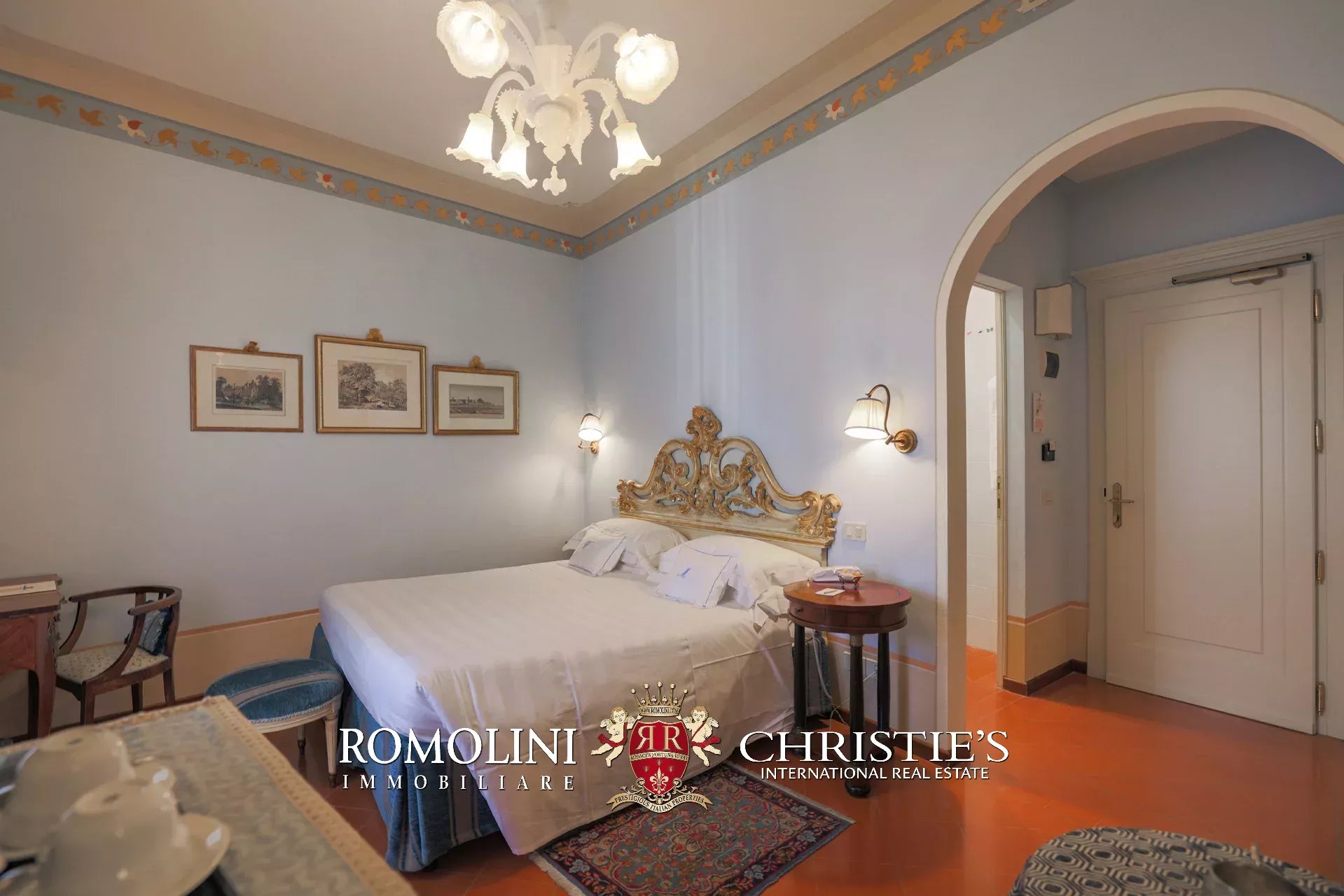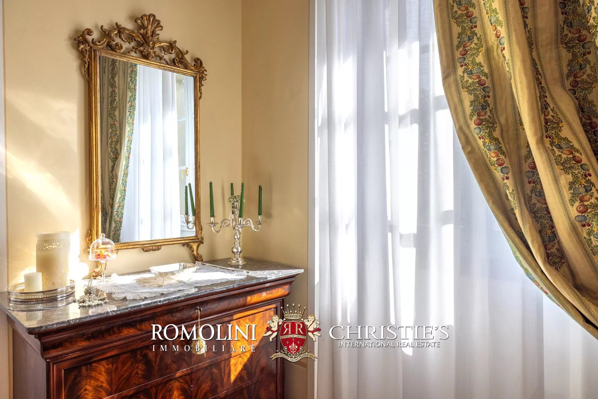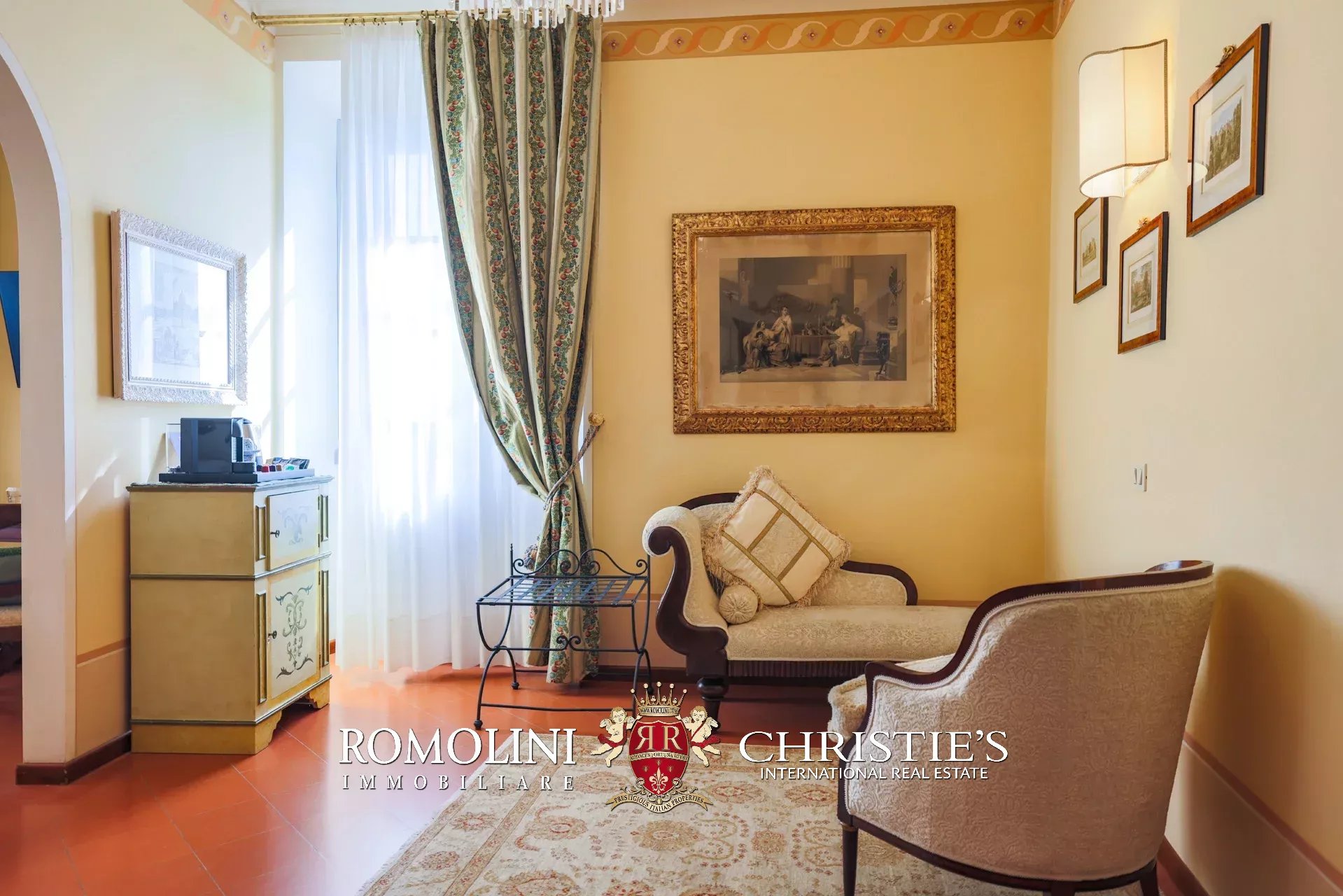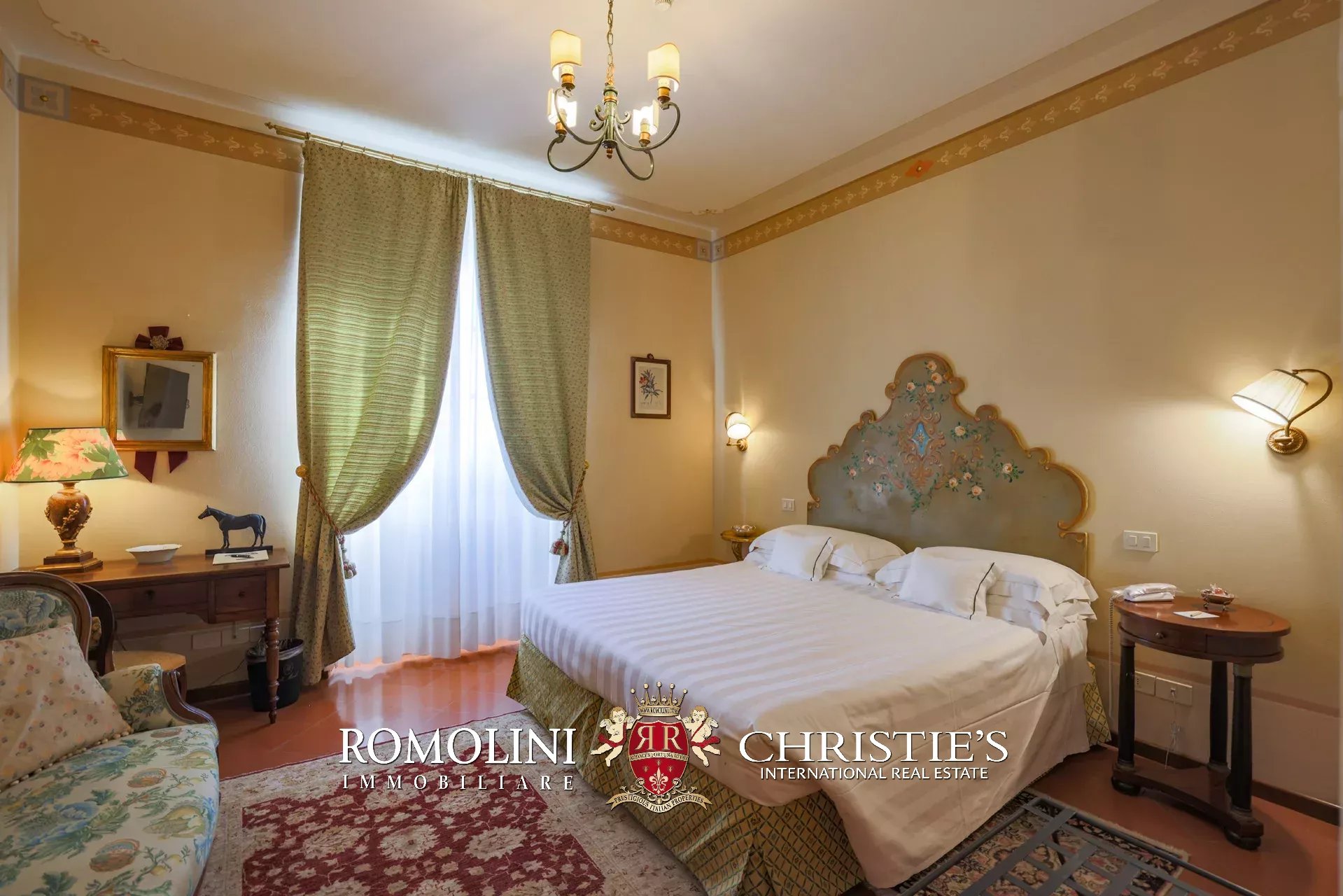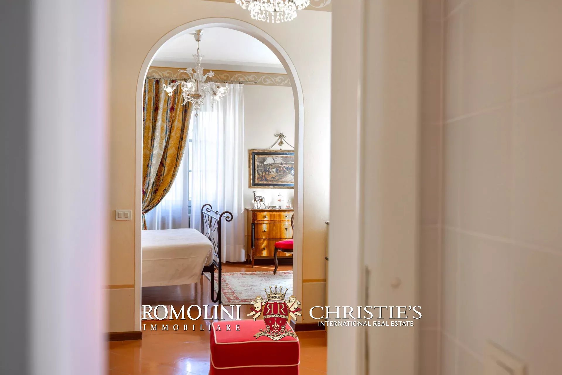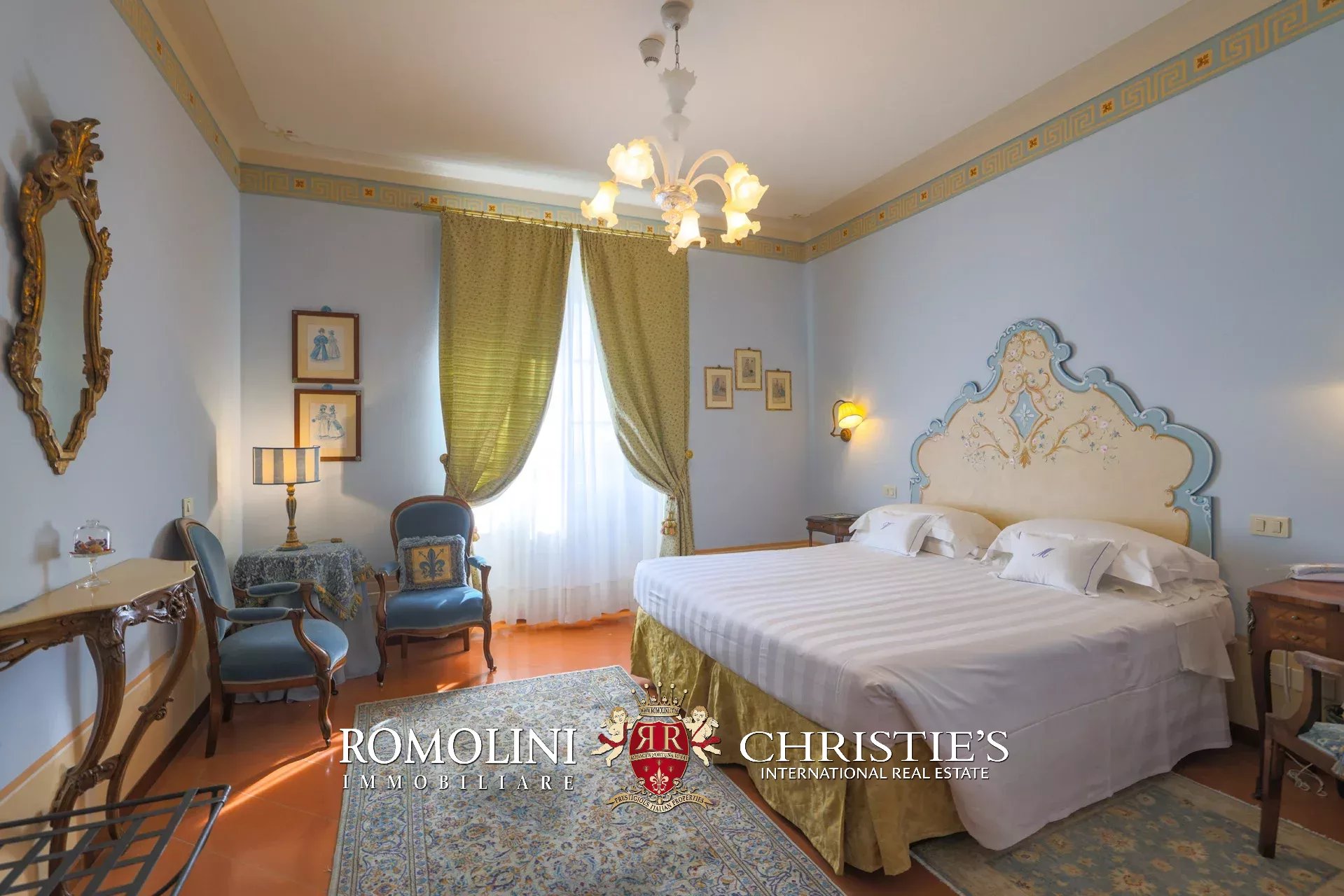 Tutto trasmette un senso di lusso e di prestigio, di ricercatezza e di eleganza. L’arredamento è composto da pezzi di alto antiquariato e tessuti preziosi, le pareti e i soffitti sono stati decorati da prestigiose maestranze toscane e i bagni realizzati rigorosamente in stile. Il riscaldamento è indipendente e zonale regolabile per ogni singola stanza.