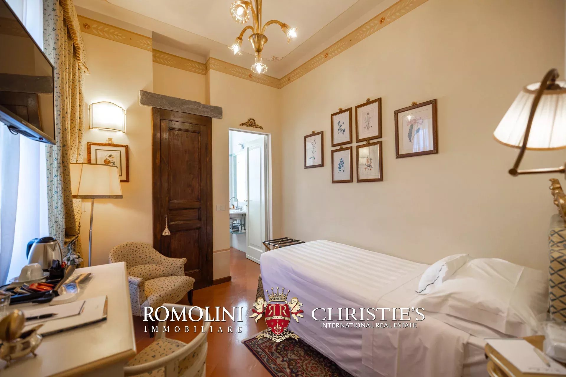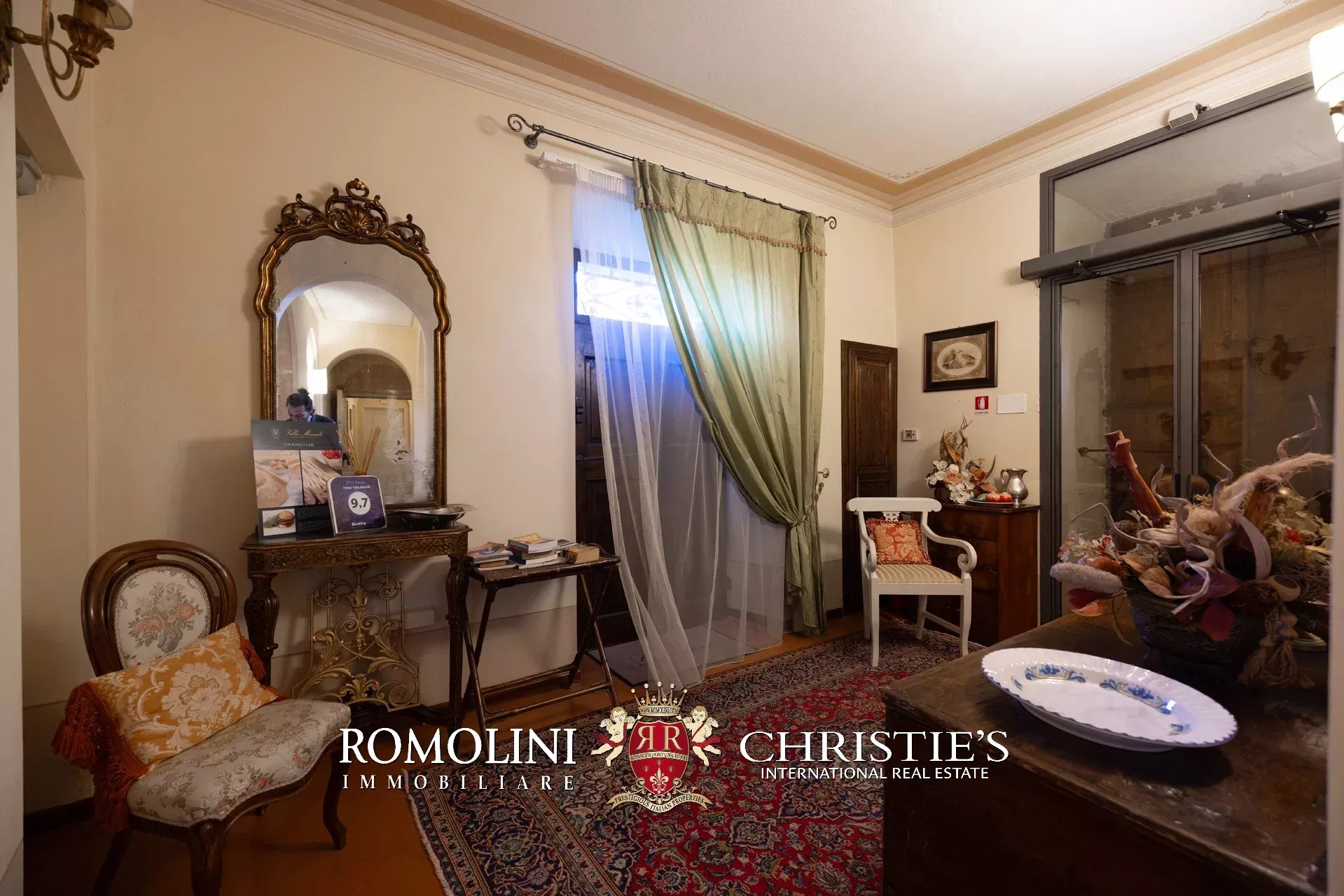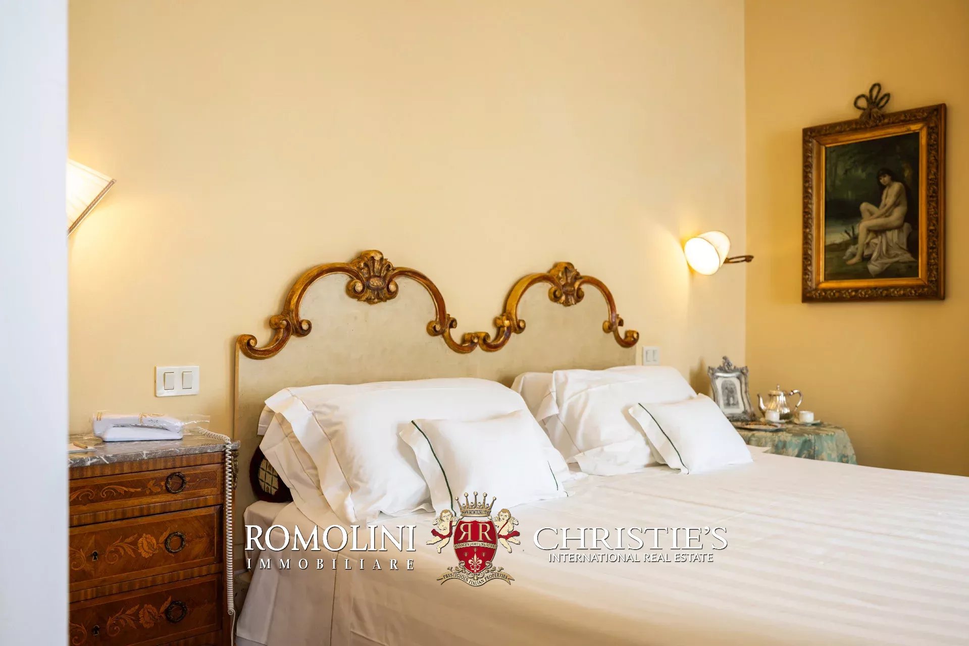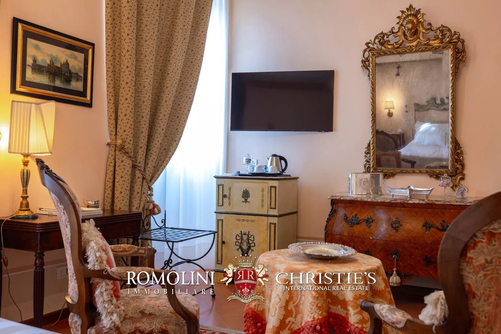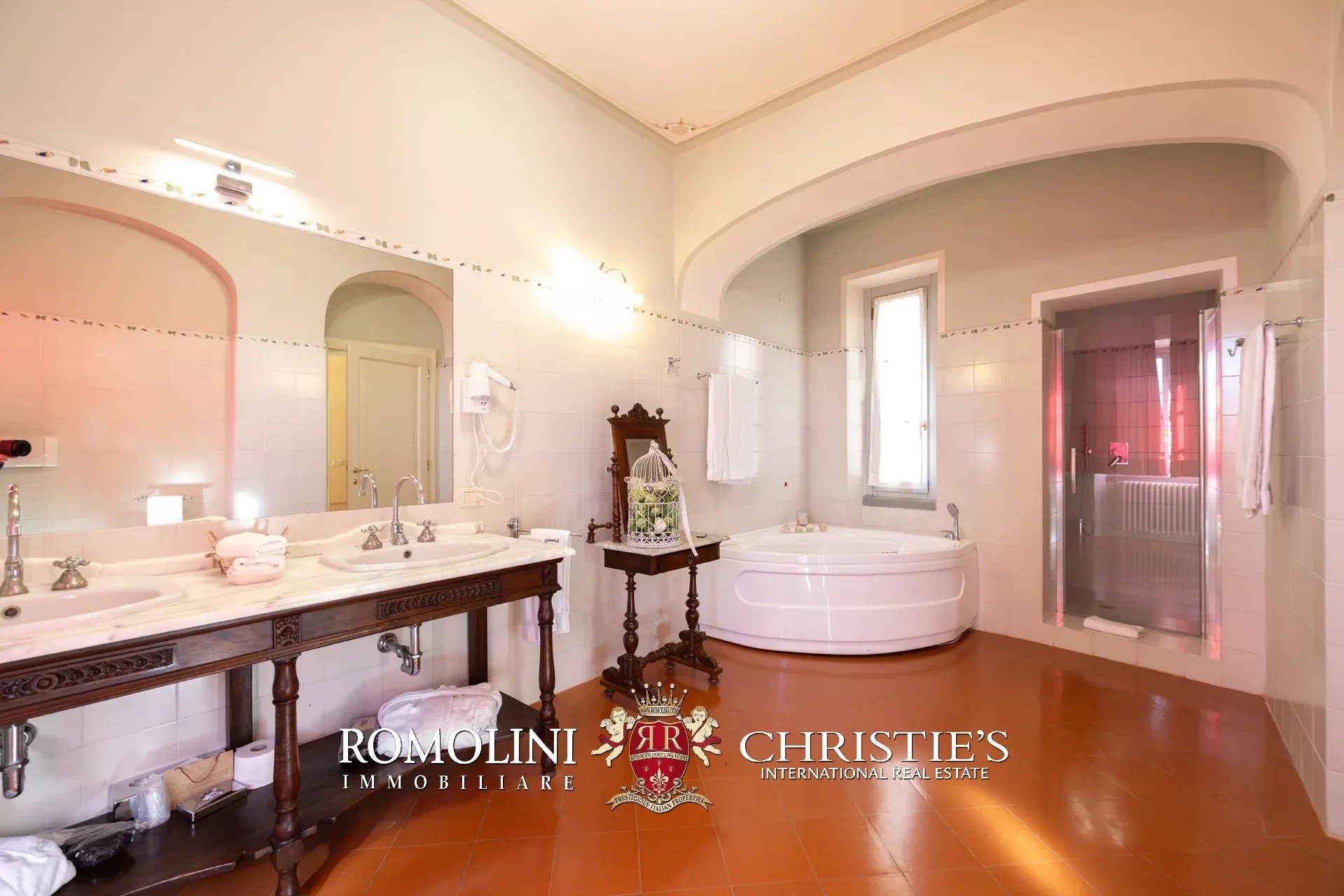 Tutto trasmette un senso di lusso e di prestigio, di ricercatezza e di eleganza. L’arredamento è composto da pezzi di alto antiquariato e tessuti preziosi, le pareti e i soffitti sono stati decorati da prestigiose maestranze toscane e i bagni realizzati rigorosamente in stile. Il riscaldamento è indipendente e zonale regolabile per ogni singola stanza.