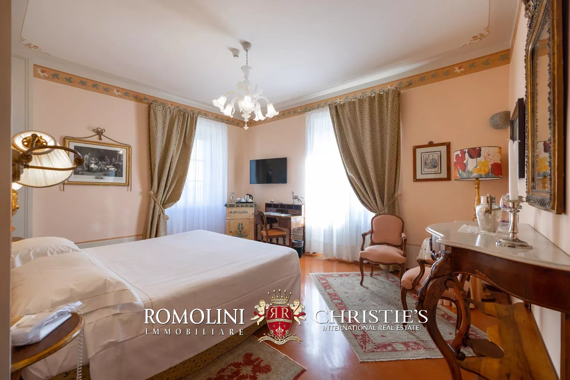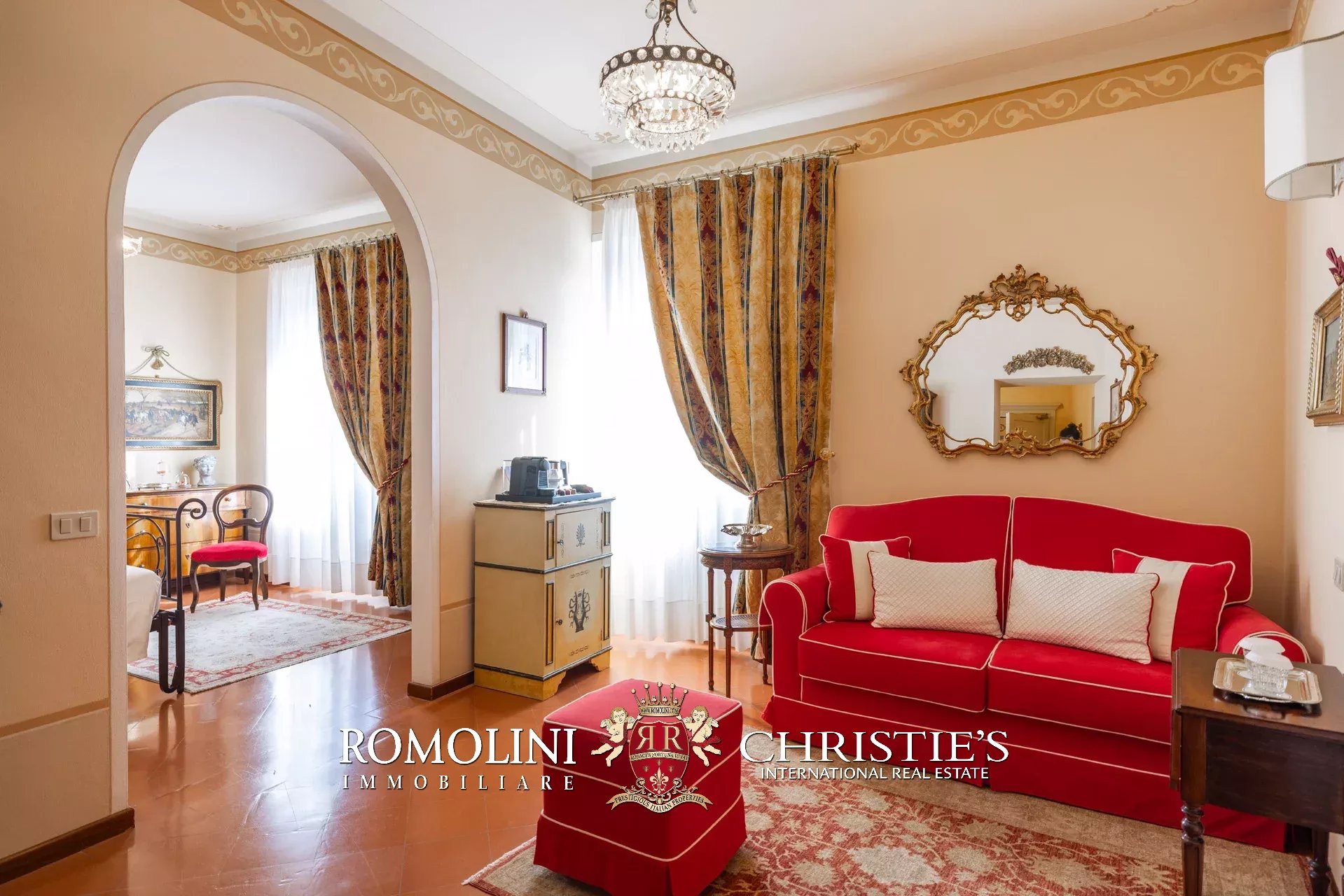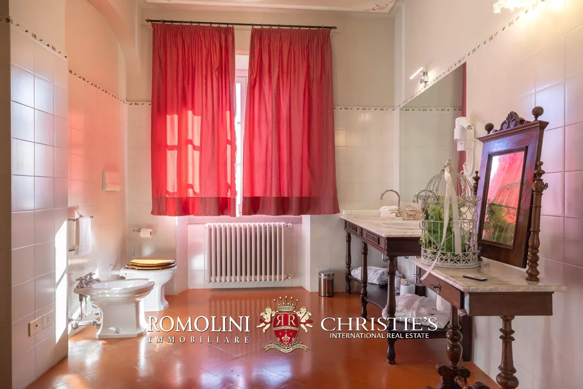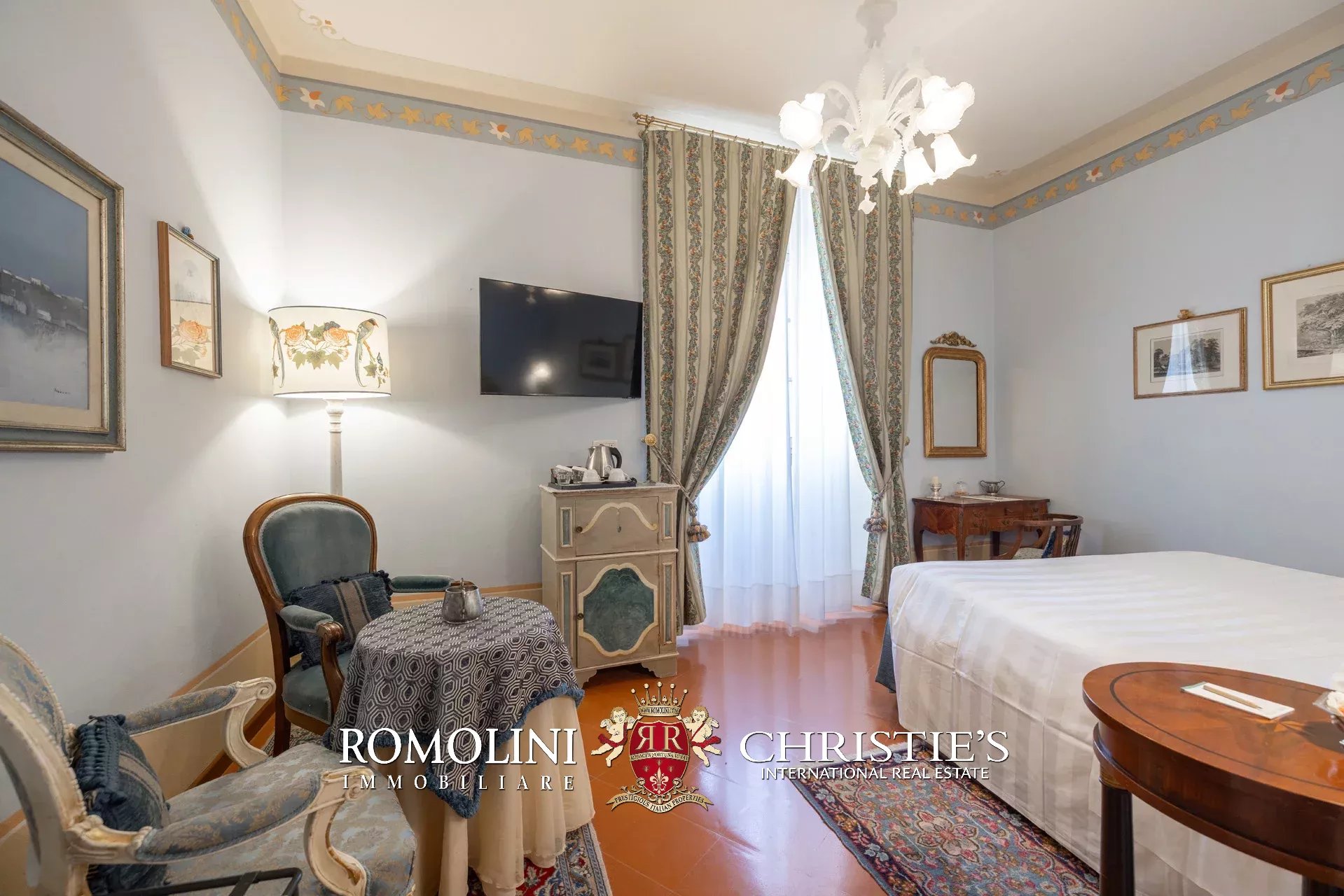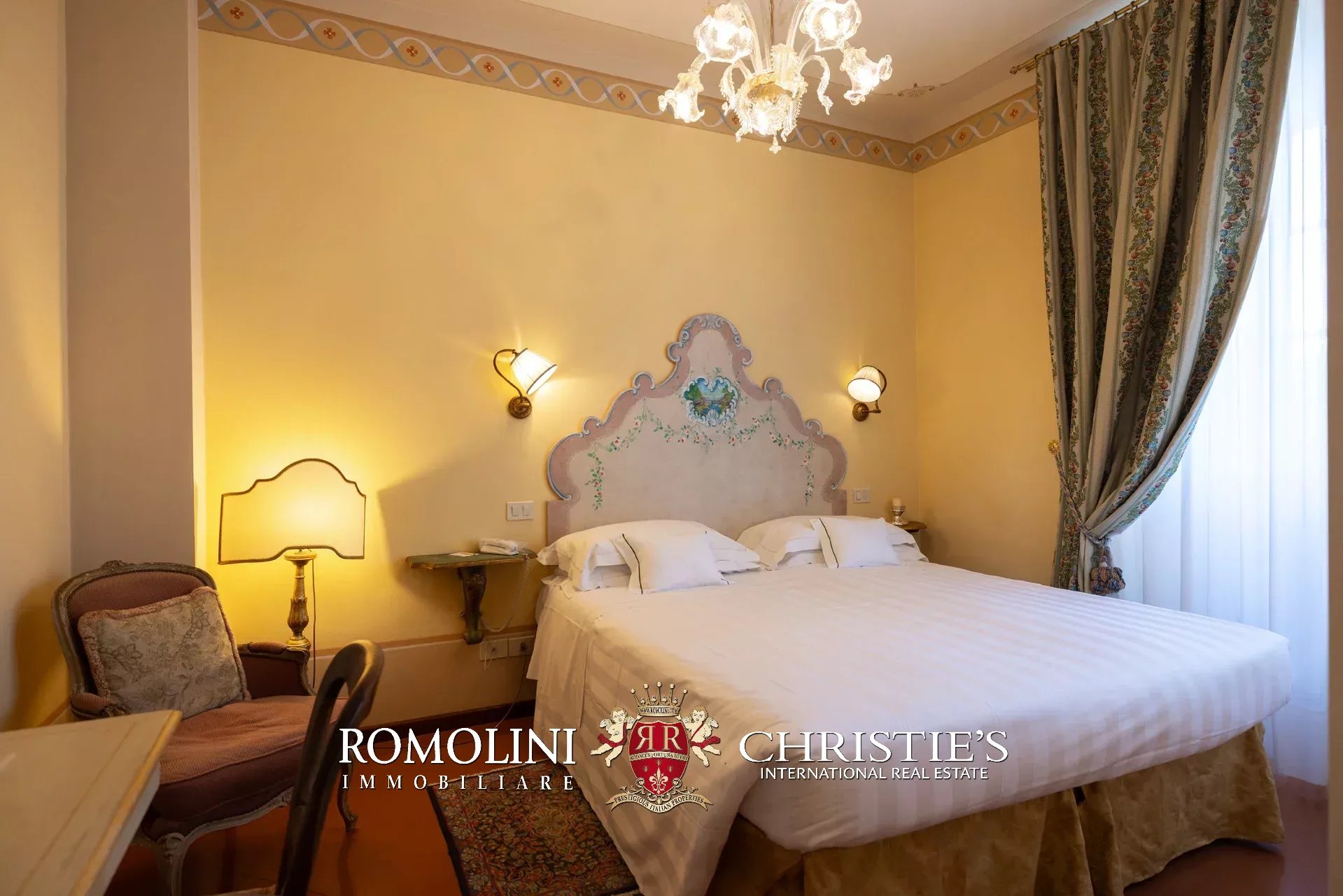Tutto trasmette un senso di lusso e di prestigio, di ricercatezza e di eleganza. L’arredamento è composto da pezzi di alto antiquariato e tessuti preziosi, le pareti e i soffitti sono stati decorati da prestigiose maestranze toscane e i bagni realizzati rigorosamente in stile. Il riscaldamento è indipendente e zonale regolabile per ogni singola stanza.