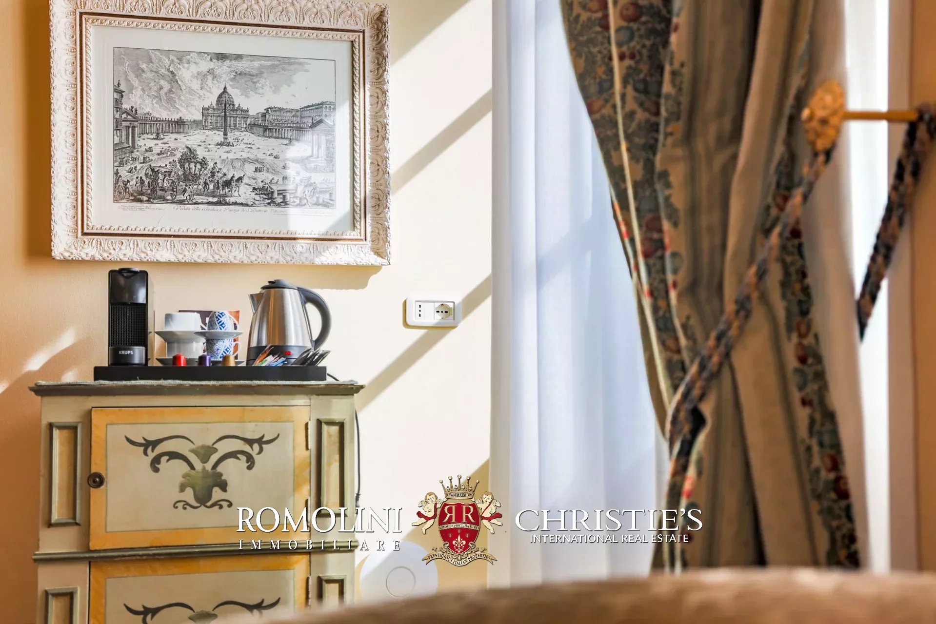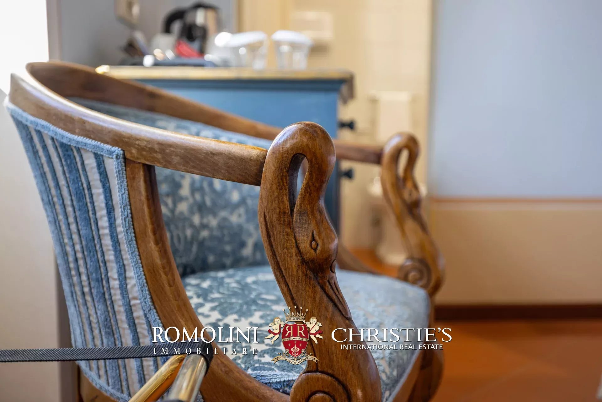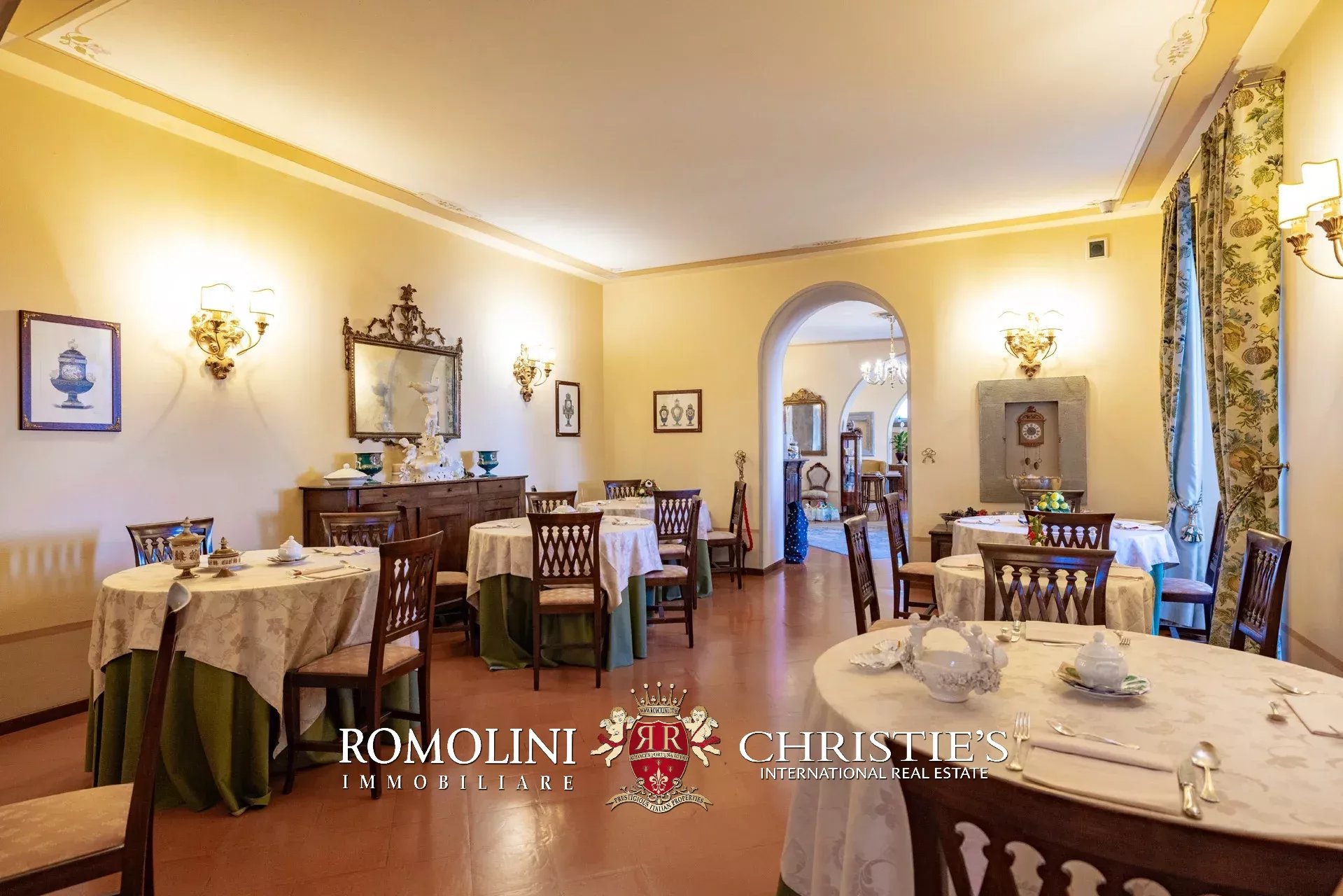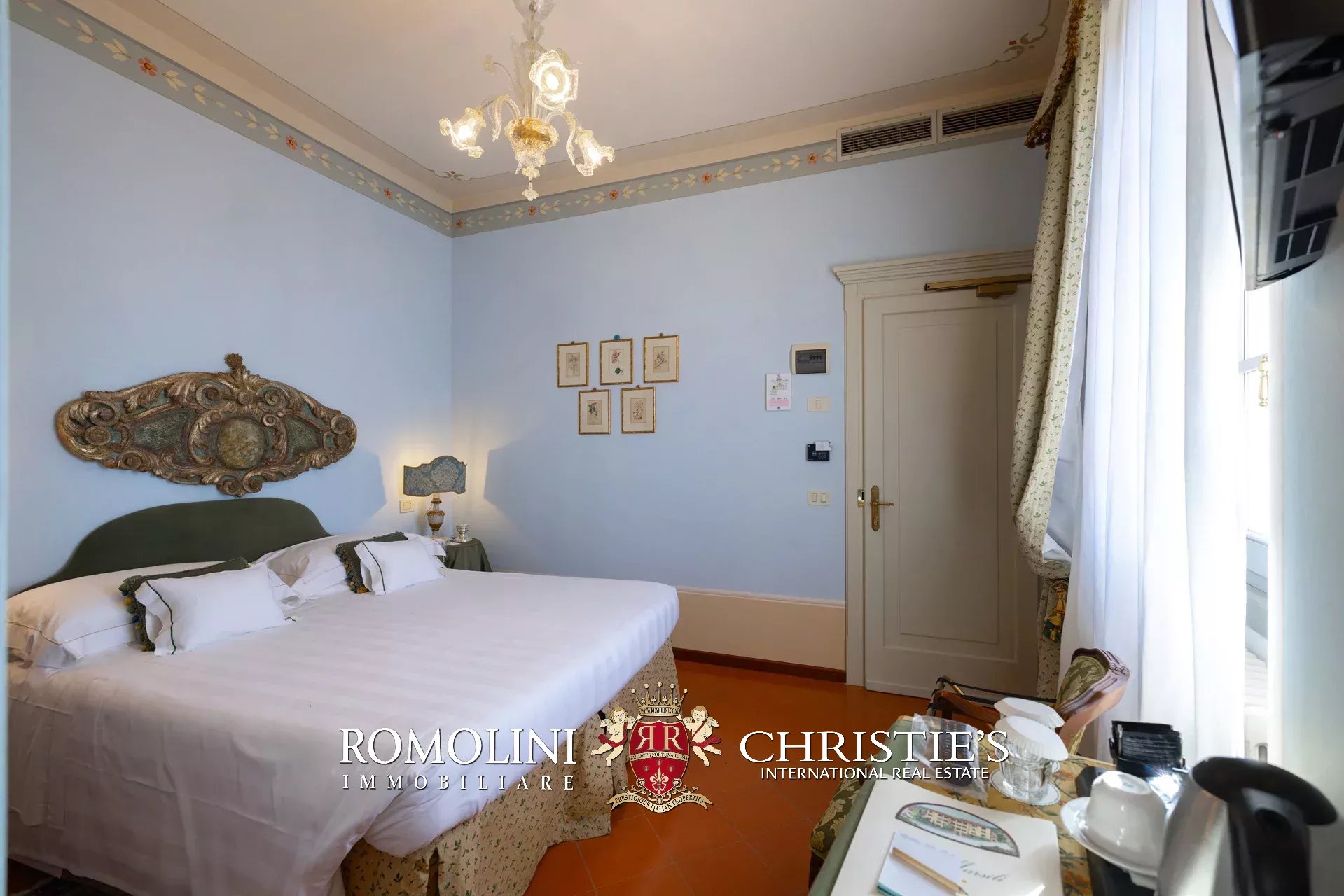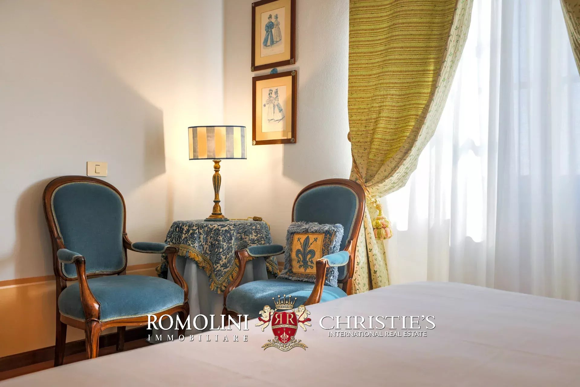 Tutto trasmette un senso di lusso e di prestigio, di ricercatezza e di eleganza. L’arredamento è composto da pezzi di alto antiquariato e tessuti preziosi, le pareti e i soffitti sono stati decorati da prestigiose maestranze toscane e i bagni realizzati rigorosamente in stile. Il riscaldamento è indipendente e zonale regolabile per ogni singola stanza.
