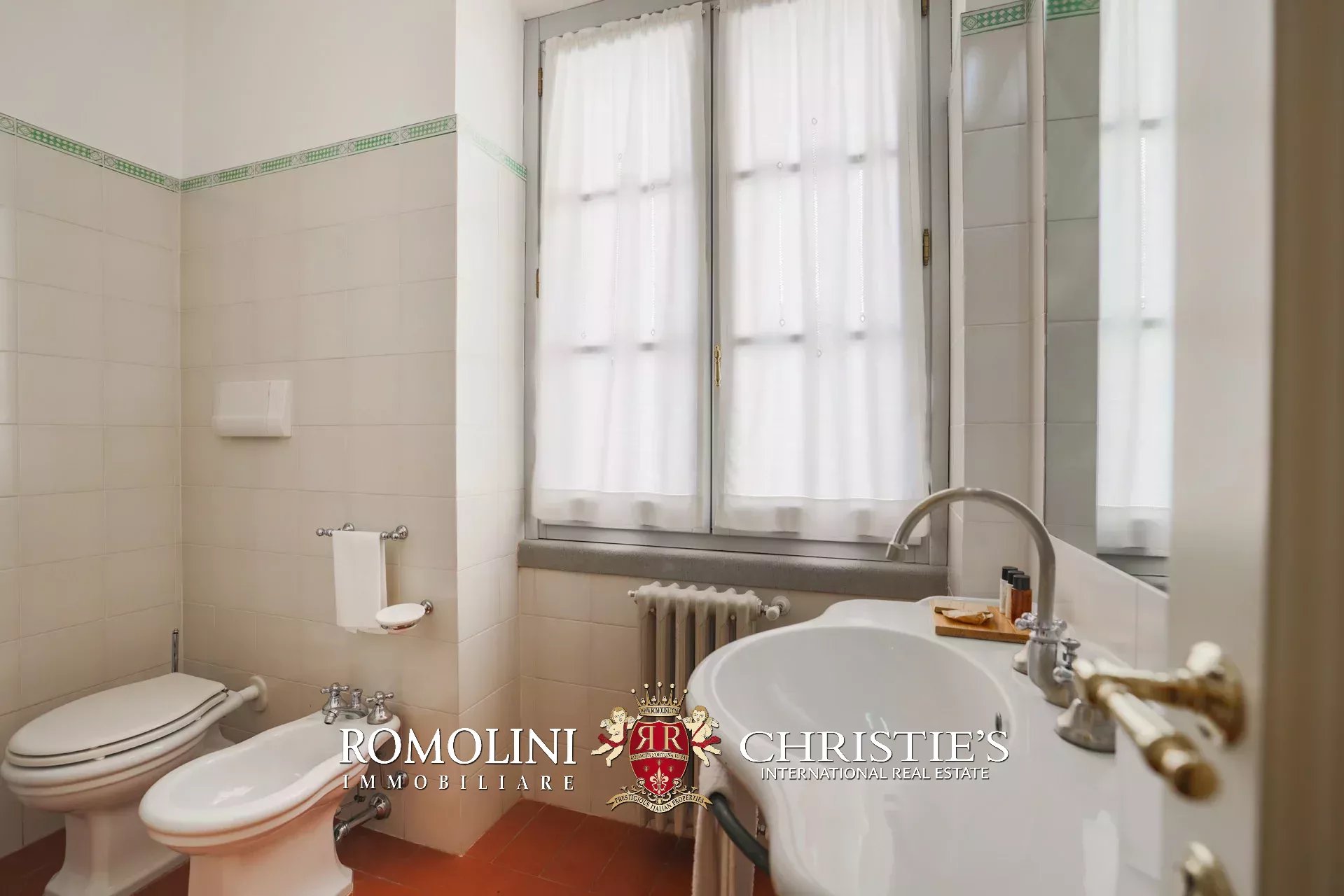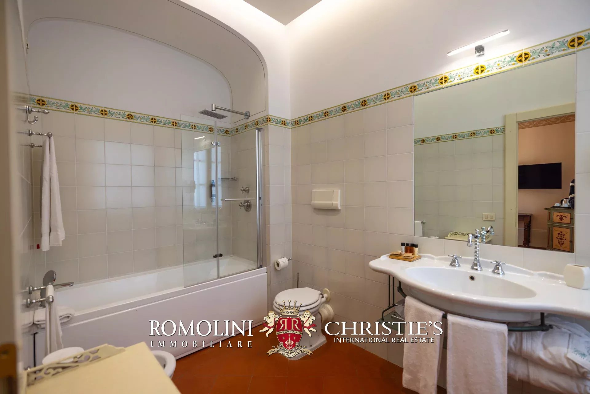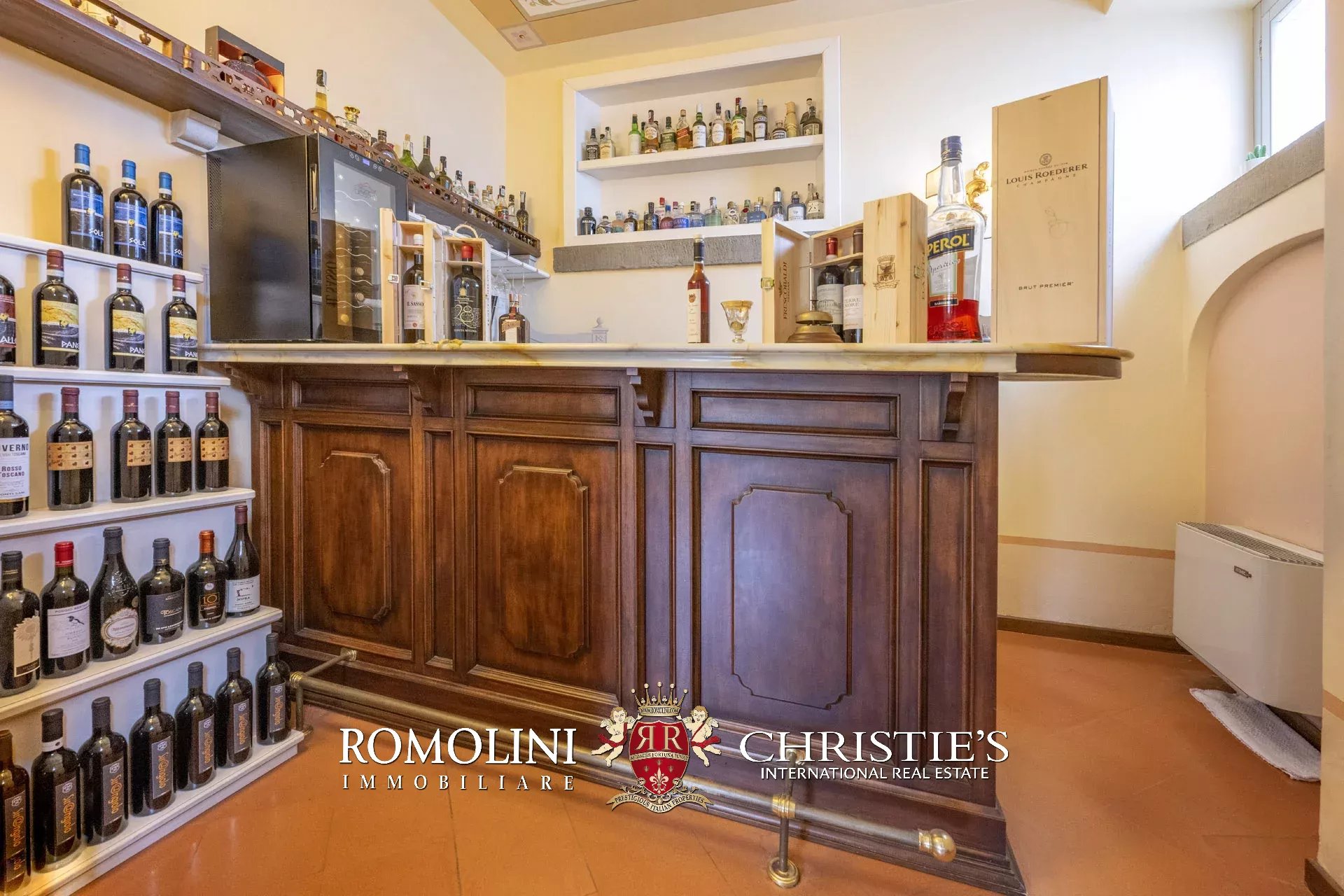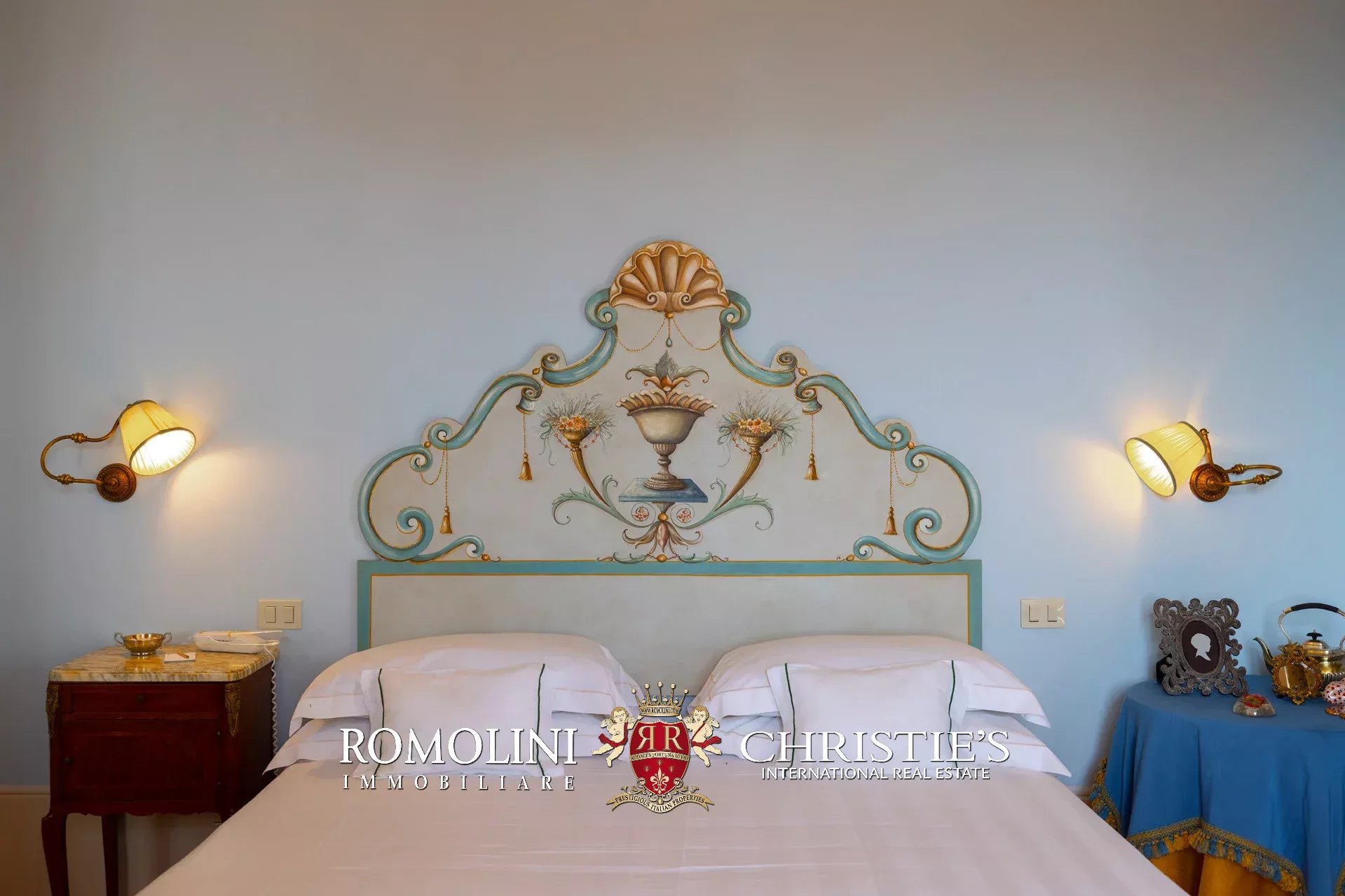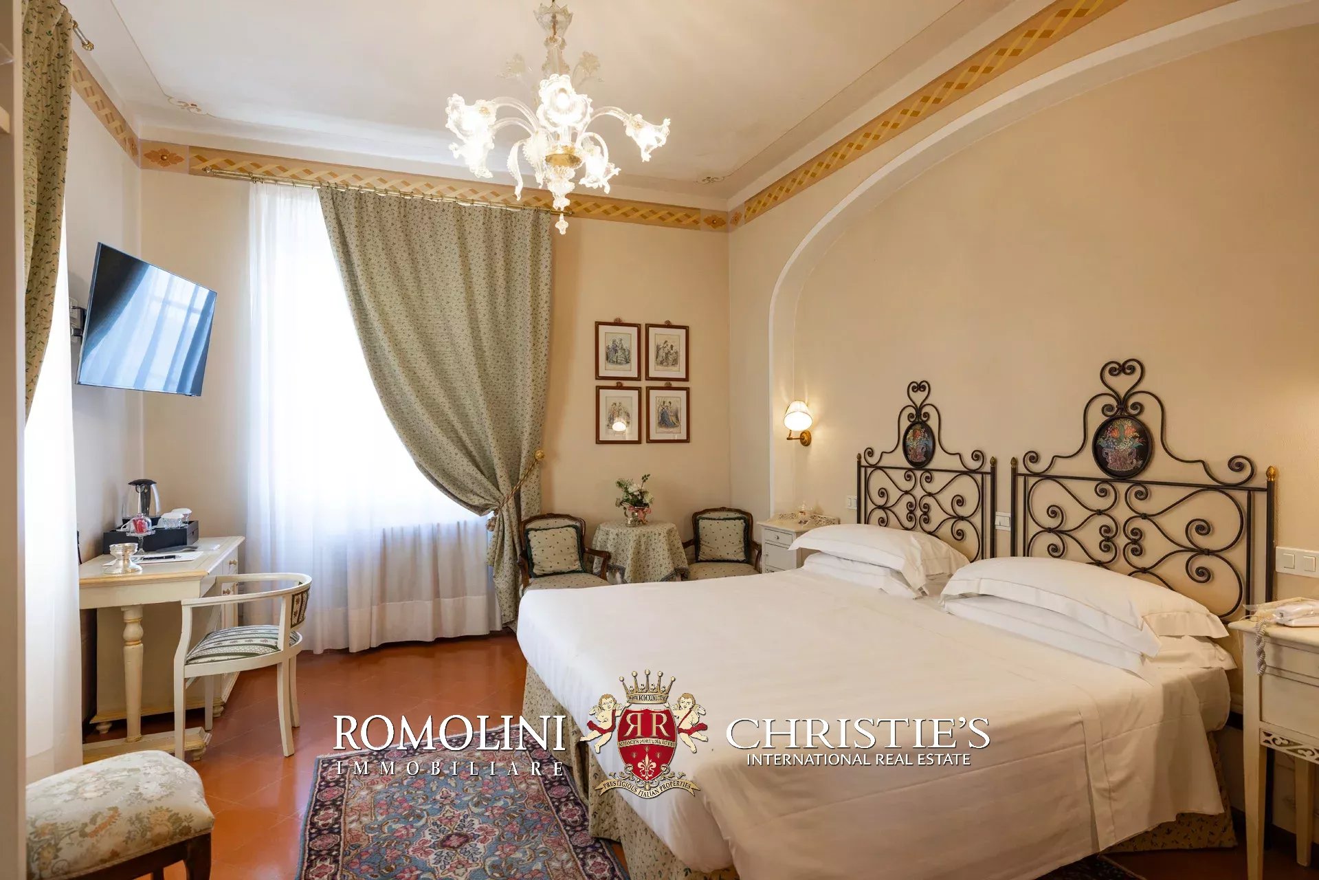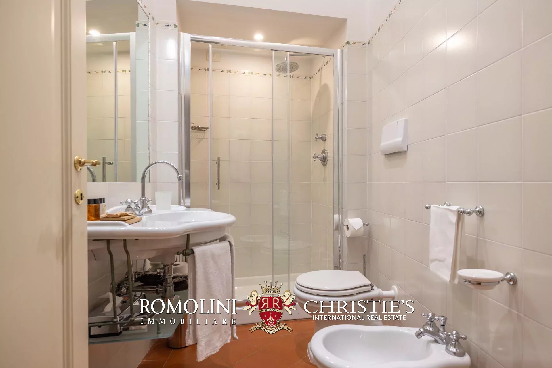 Tutto trasmette un senso di lusso e di prestigio, di ricercatezza e di eleganza. L’arredamento è composto da pezzi di alto antiquariato e tessuti preziosi, le pareti e i soffitti sono stati decorati da prestigiose maestranze toscane e i bagni realizzati rigorosamente in stile. Il riscaldamento è indipendente e zonale regolabile per ogni singola stanza.