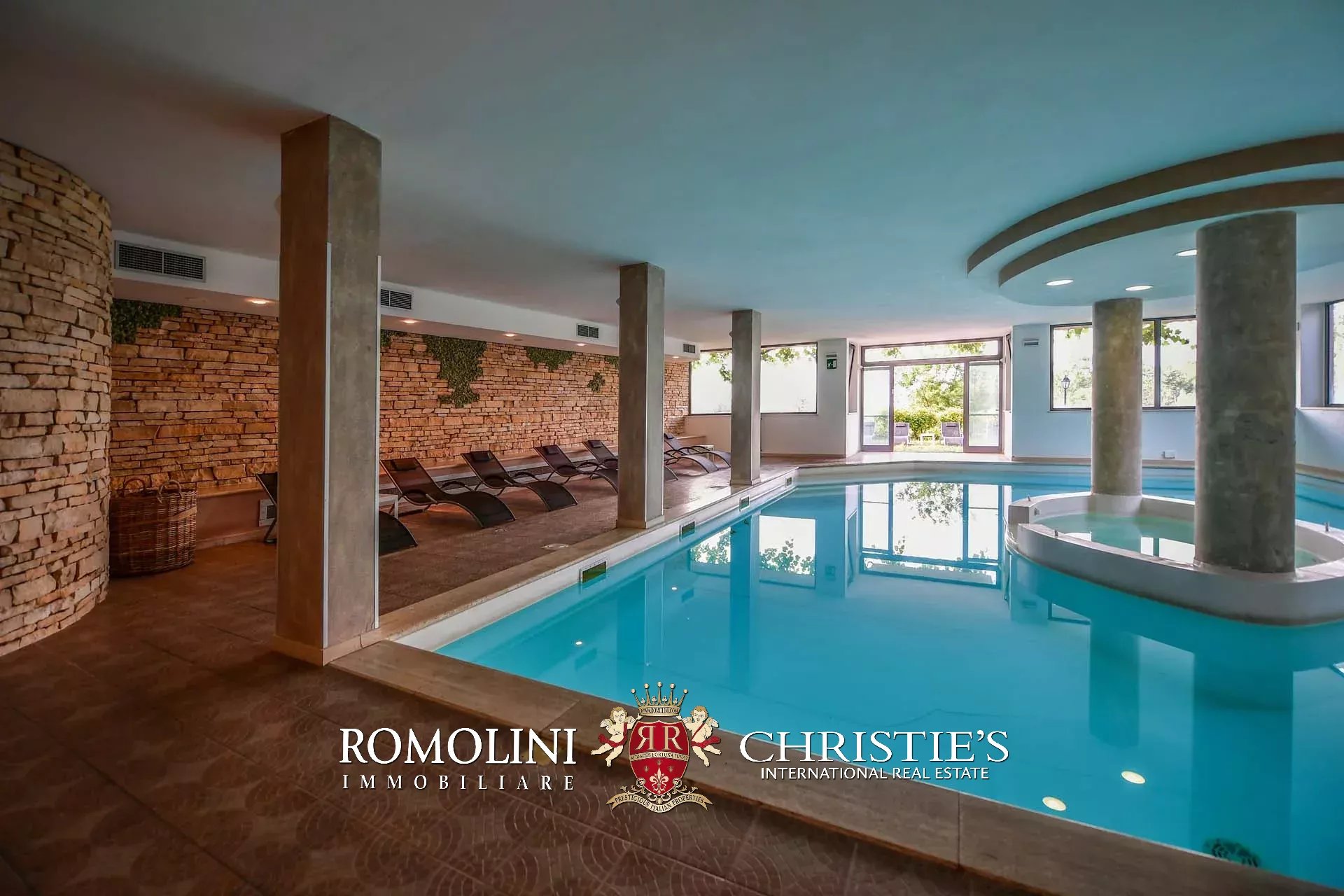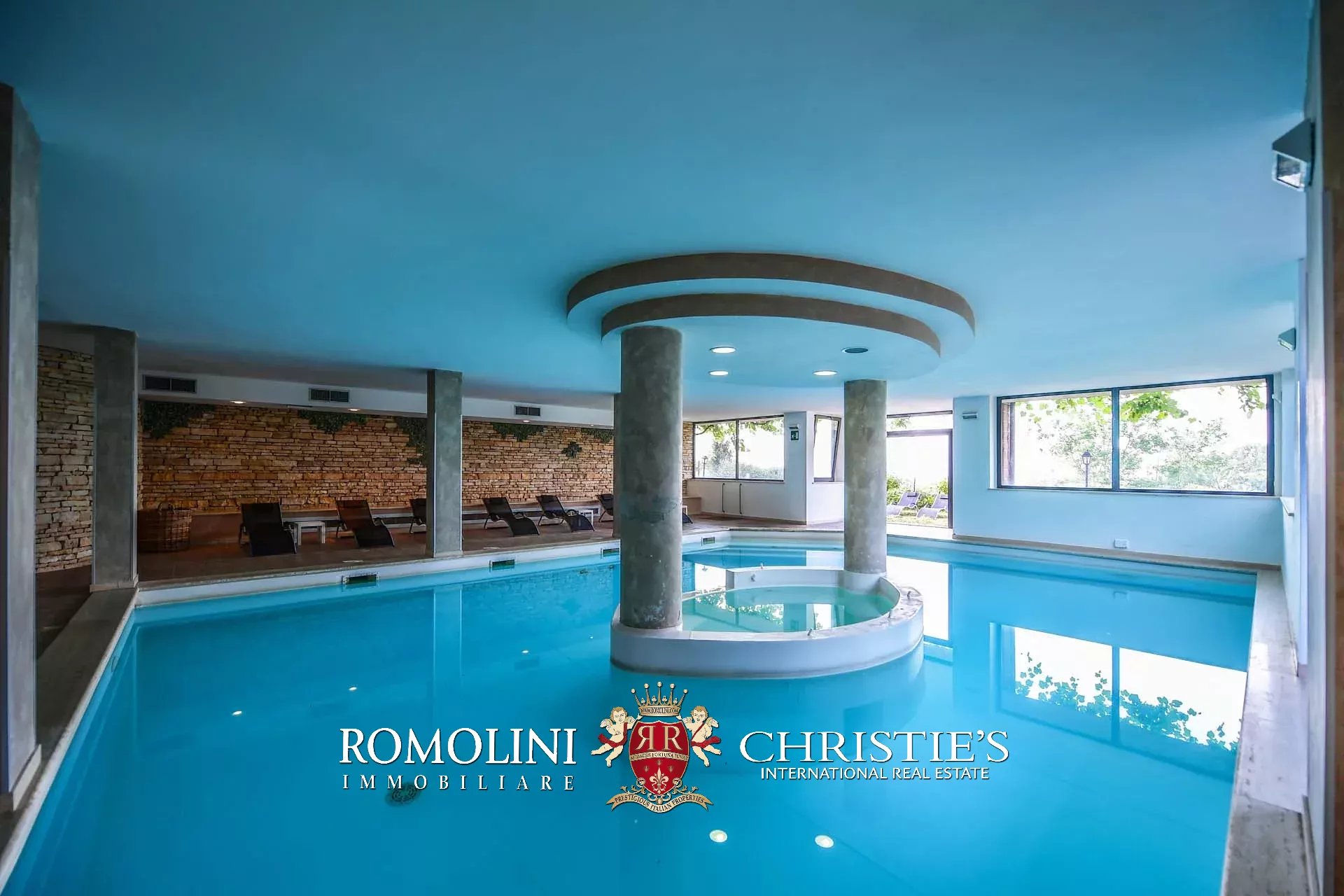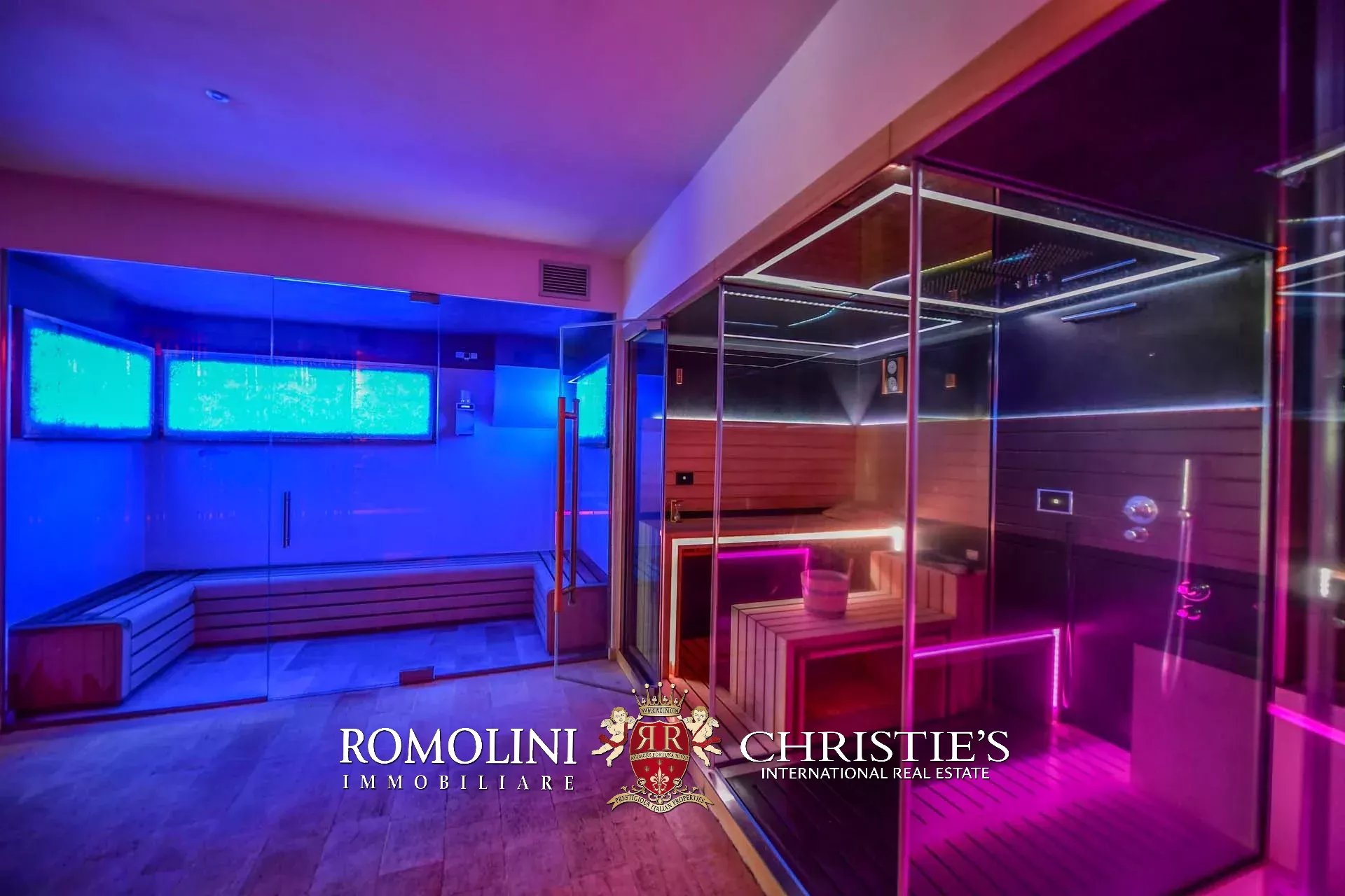 - Seminterrato: qui troviamo uno splendido centro benessere costituito da un’ampia sala piscina (90 mq) con vasca idromassaggio, una Sasha Jacuzzi a tre vani (sauna, bagno turco e doccia emozionale), grotta di sale, grotta per cromoterapia in pietra a spacco, percorso Kneipp e zona relax con lettini. Completano il piano un ampio garage, cantine, magazzini, tre bagni e locali tecnici per la struttura.