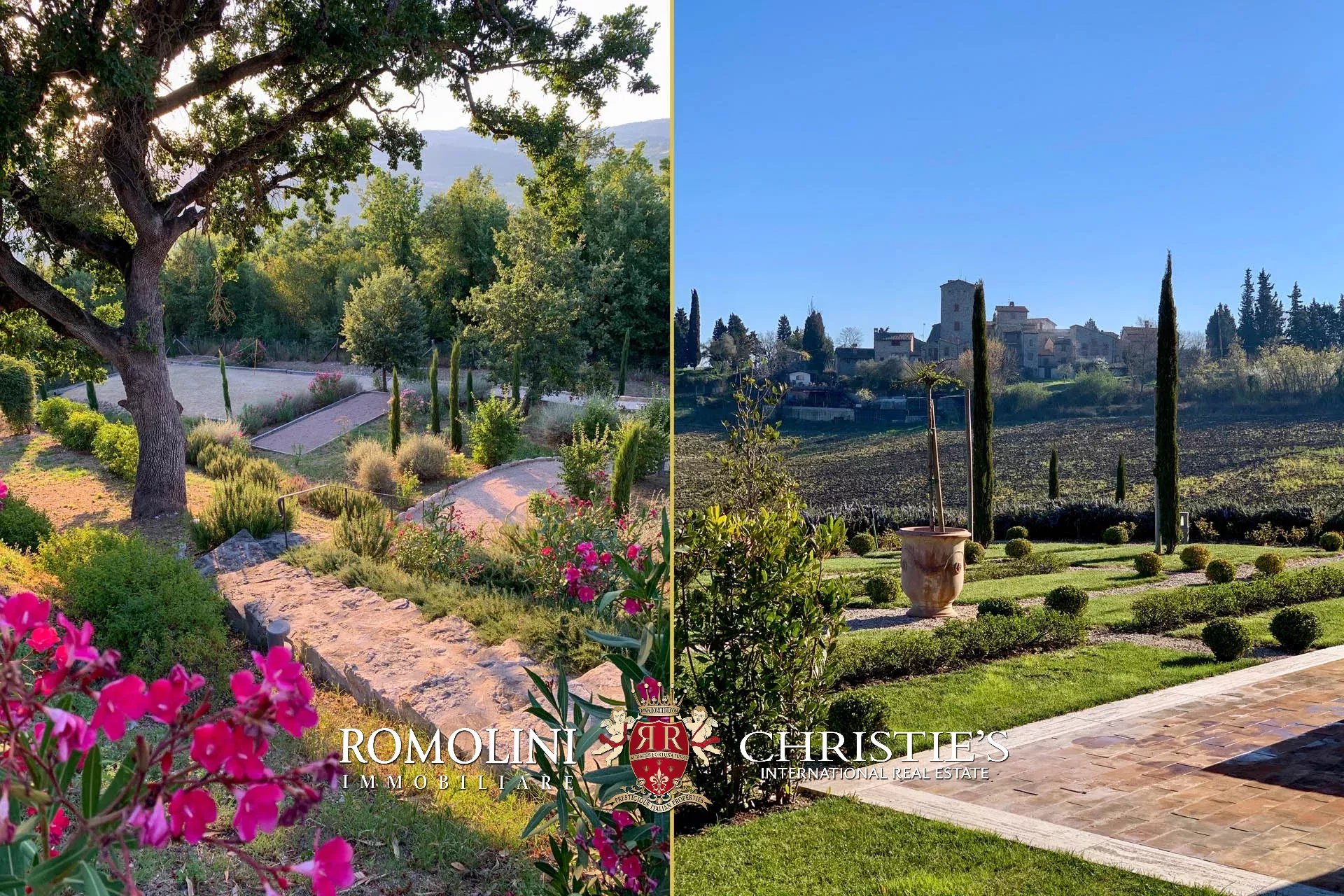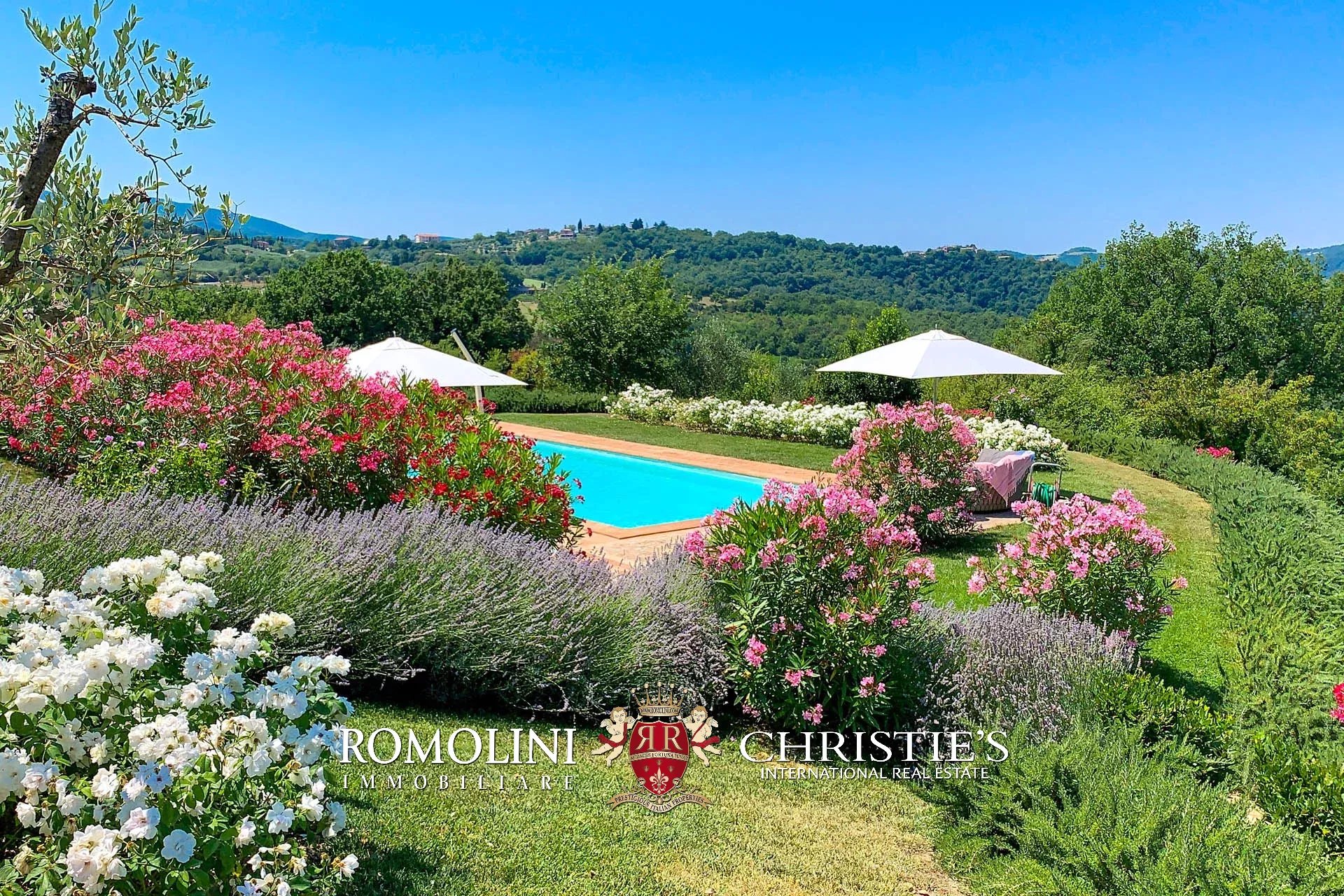 La tenuta copre circa 6,7 ettari, interamente recintati e circondati da alberi che garantiscono privacy e riservatezza. Il giardino, ben curato, è una colorata composizione di aiuole, siepi di lavanda, tipici cipressi, oliveti e prati. La piscina 12 × 4,5 m è posta a distanza perfetta dalla villa principale, protetta da un lato da un muretto in pietra e aperta sulla valle sottostante. Esiste anche un progetto per la realizzazione di un laghetto privato che potrebbe essere usato per raccogliere l’acqua piovana e irrigare così i terreni.