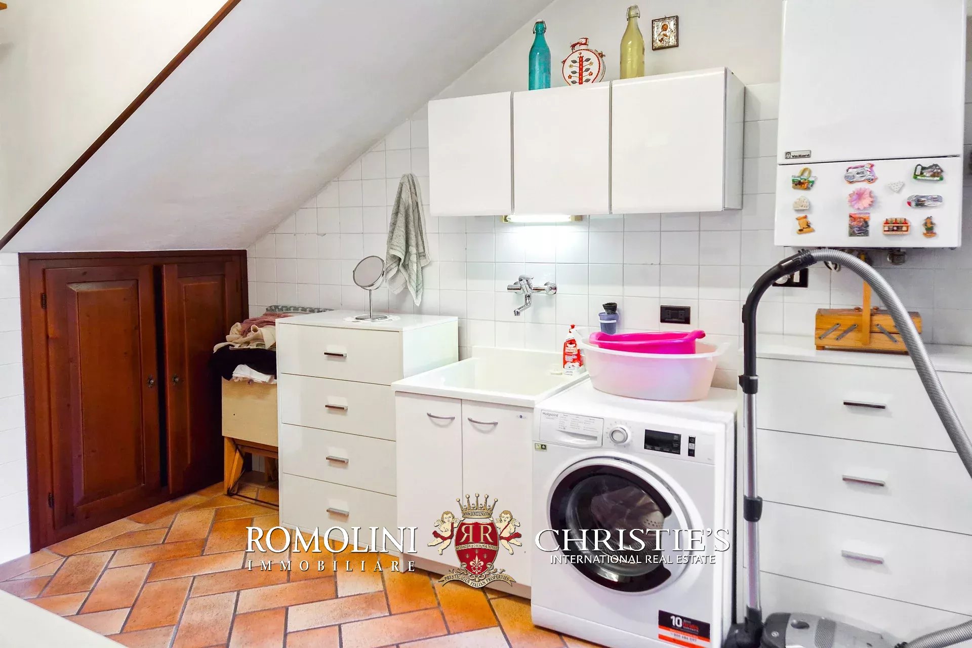 L’altro braccio della L è invece destinato a cantine (76 m², tre locali interconnessi) e garage (40 m²). Sopraelevato sopra questo locale è a disposizioni un ampio spazio aperto (circa 130 m²) dove poter riporre attrezzi e strumenti.