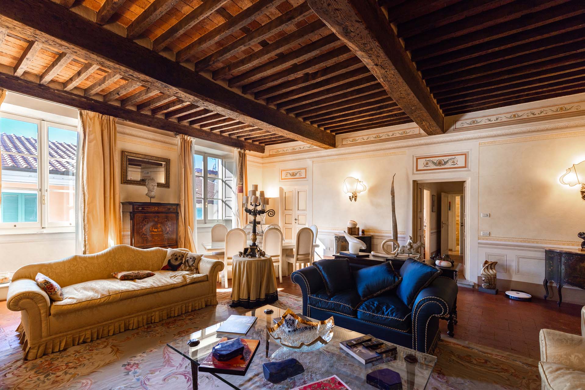 L’immobile vanta finiture di pregio che evidenziato la storia signorile dell’edificio, tutte meticolosamente restaurate e conservate in ottica di preservazione del passato. Le caratteristiche più interessanti includono i pavimenti in cotto originali, le travi in legno a supporto dei soffitti e i bellissimi camini in marmo. I bagni, anch’essi di pregio, sono rivestiti in marmo giallo e dotati di infissi pensati per armonizzarsi con il contesto storico circostante. Il grande soggiorno, cuore della proprietà, è decorato con affreschi e modanature dal gusto tipicamente Ottocentesco caratterizzate da motivi floreali e geometrici.