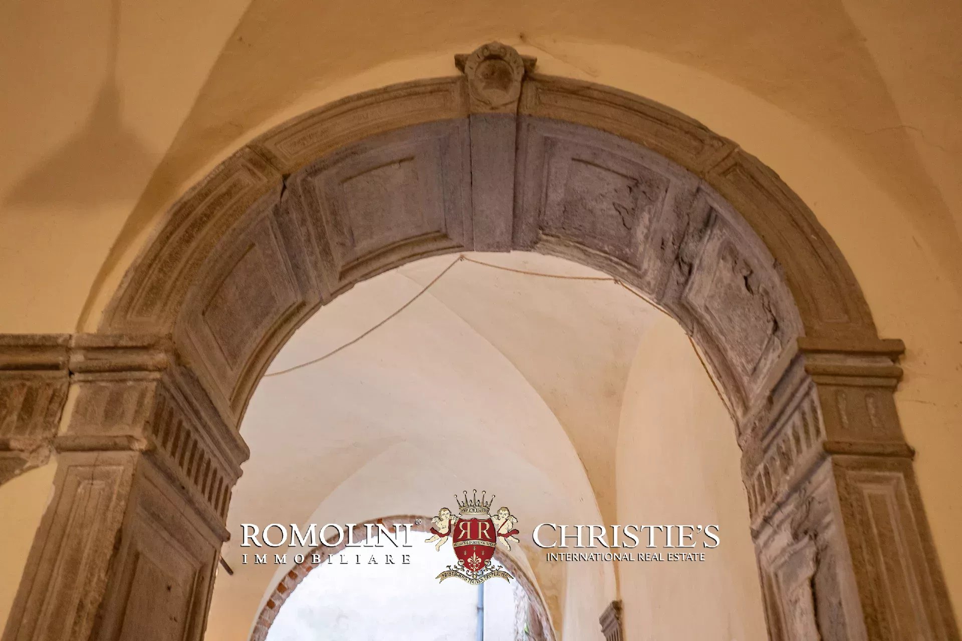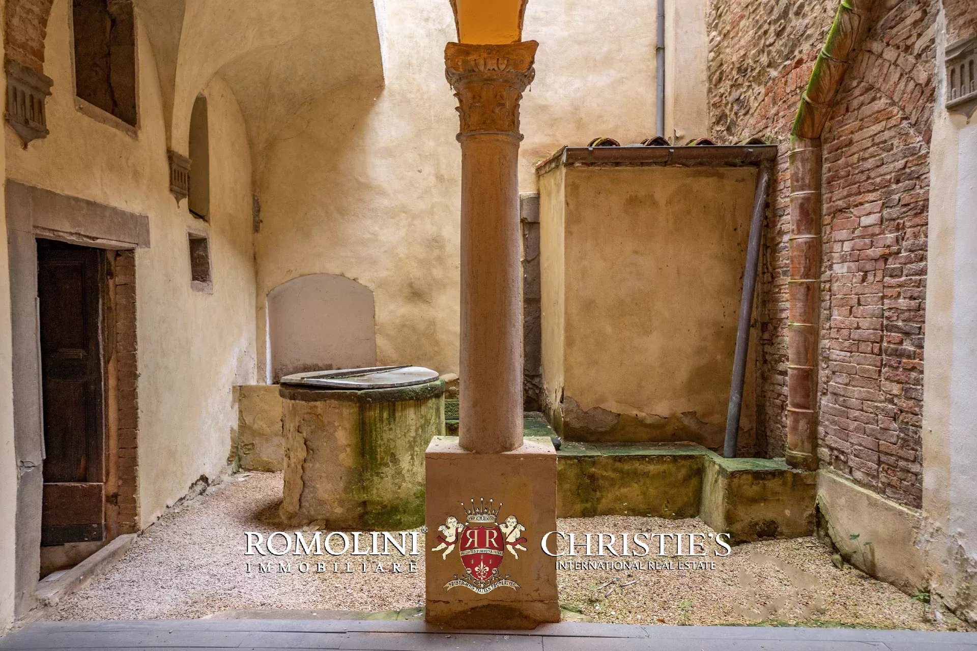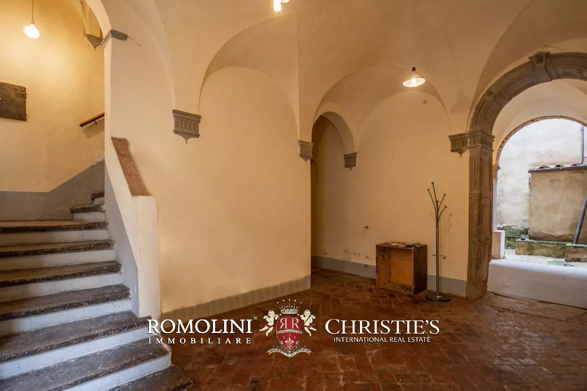 Il piano terra offre dei bellissimi spazi da vivere: il grande atrio con soffitti e colonne ad arco, tipici del rinascimento, può essere utilizzato oltre che come ingresso anche come spazio esterno. Questa zona è in parte aperta sul soffitto e potrebbe divenire una sorta di terrazzo coperto estivo, uno studio o un’area svago. Una scala scende nel seminterrato dove si trovano le cantine.