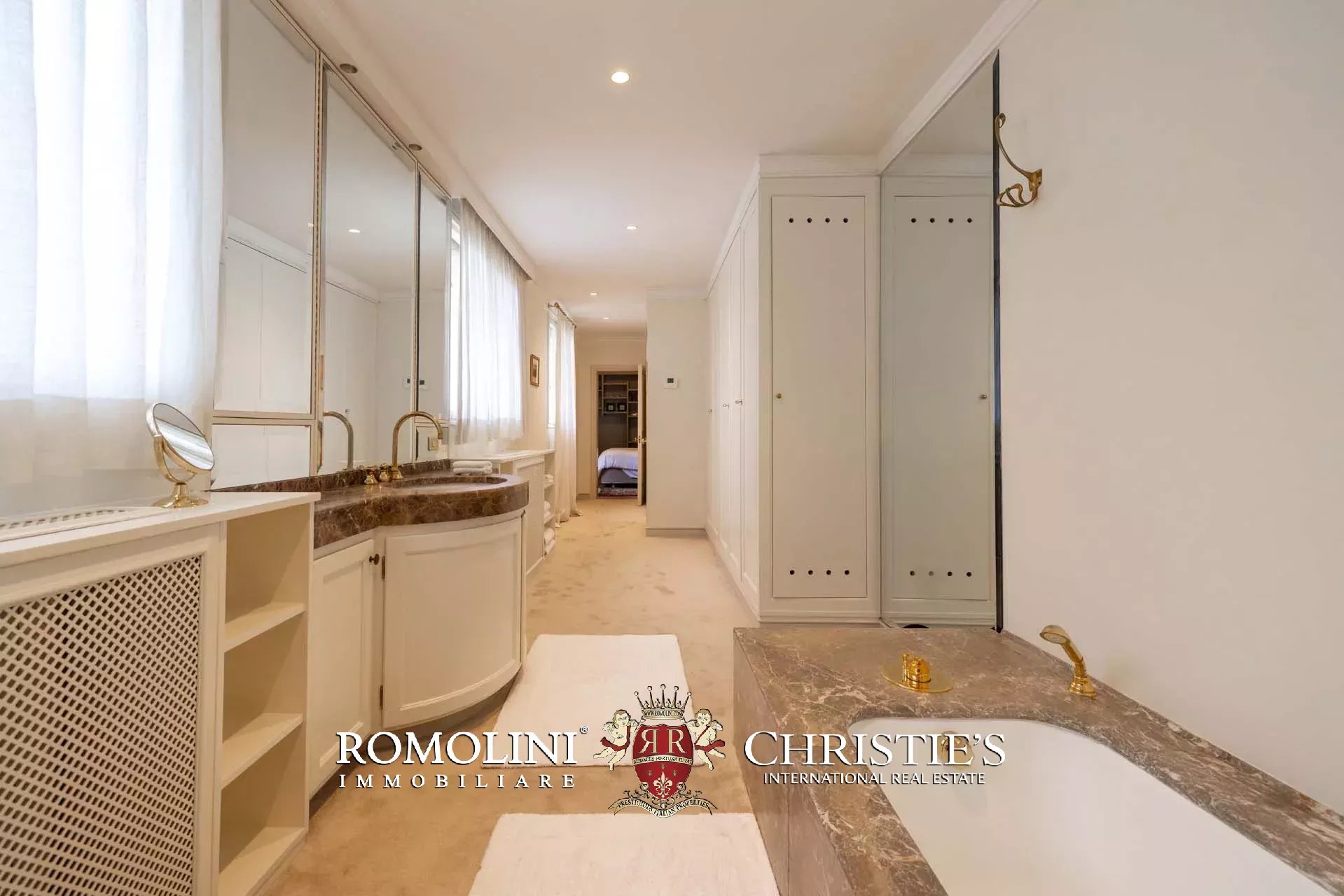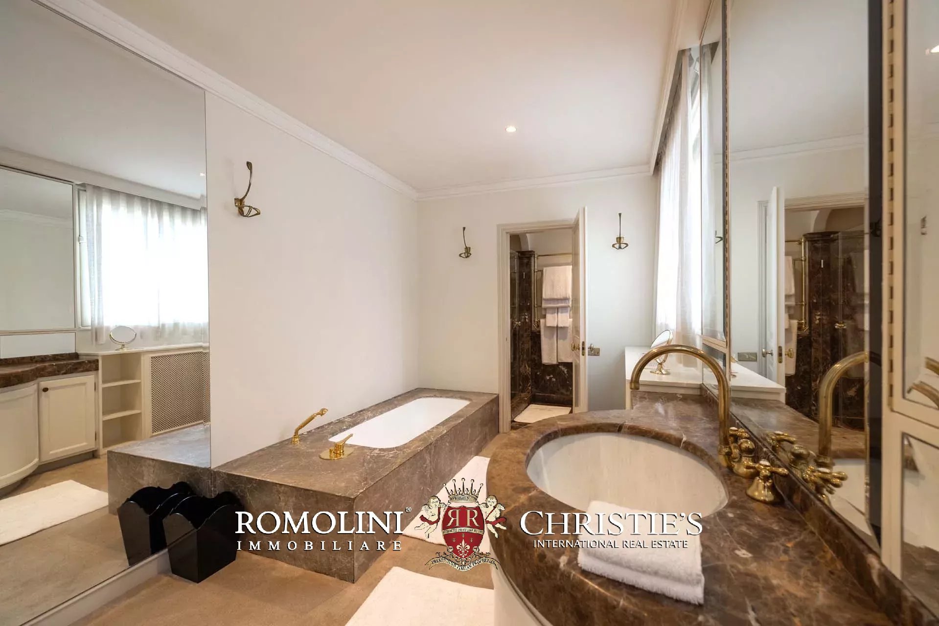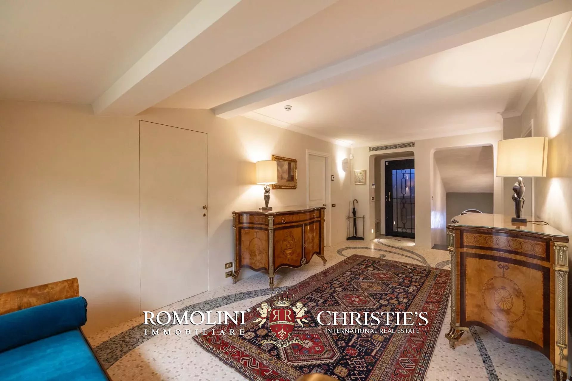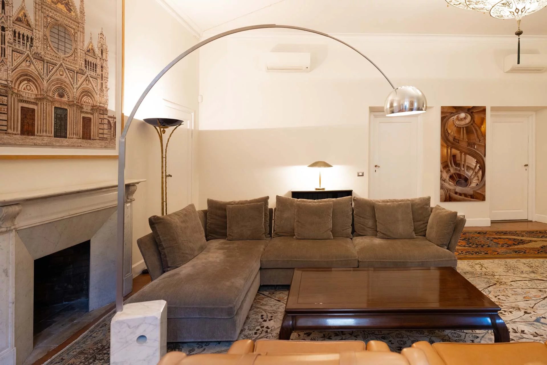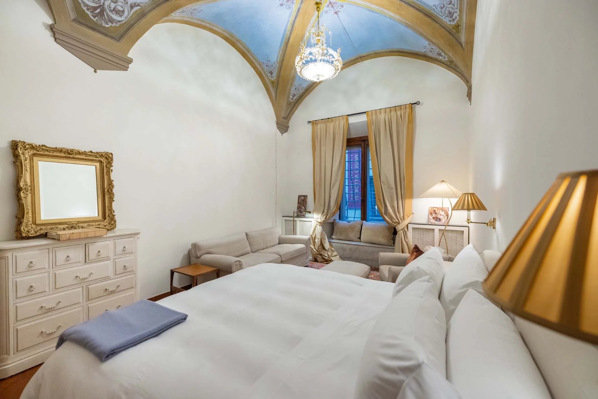 - Appartamento Vasari (257 m², 3 camere e 4 bagni): posta di fronte all’appartamento Donatello, questa unità si apre con un grande salone di rappresentanza corredato da un piccolo bagno di servizio. Da qui si passa poi alla sala da pranzo con cucina e a tre grandi camere, tutte dotate di bagno privato.