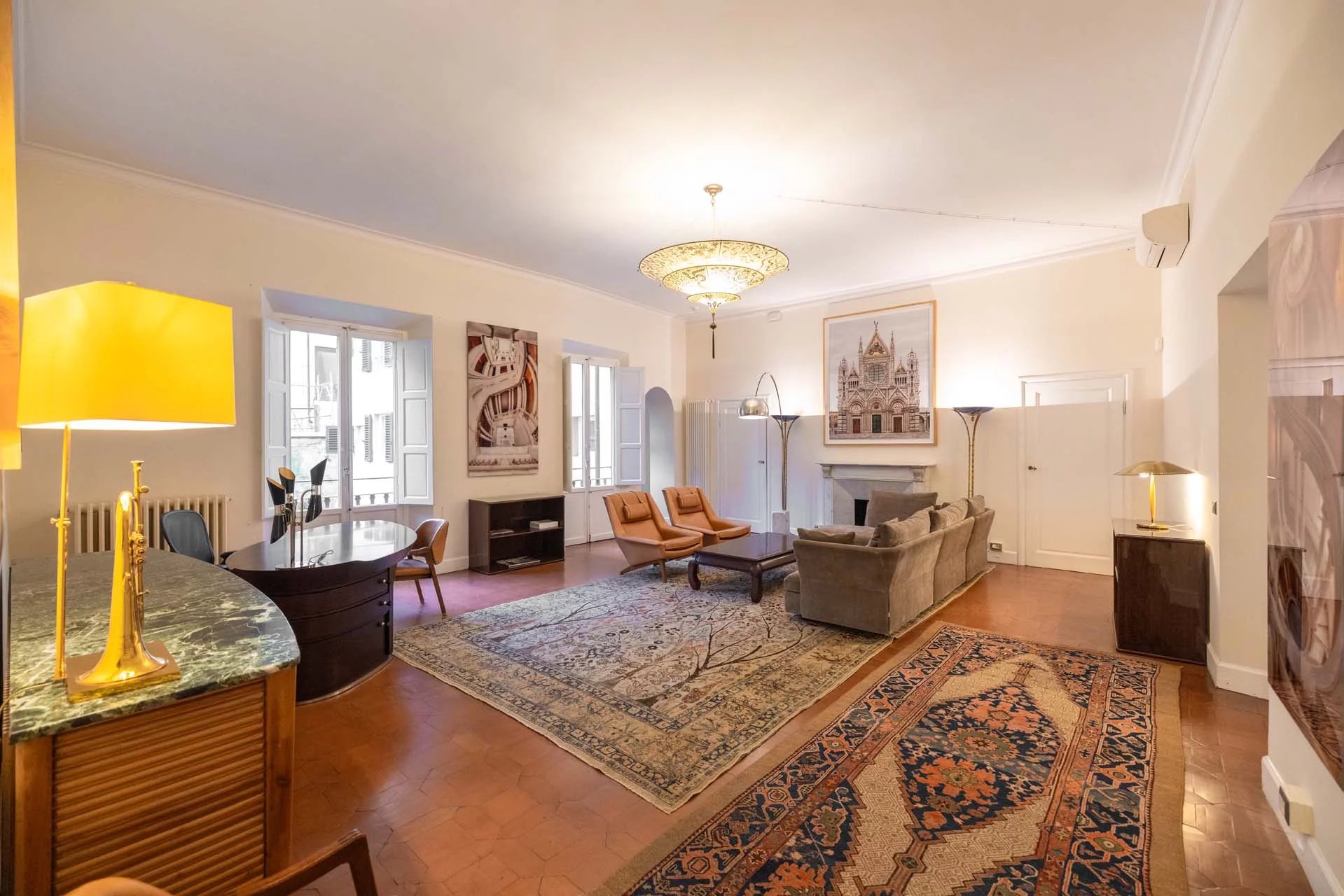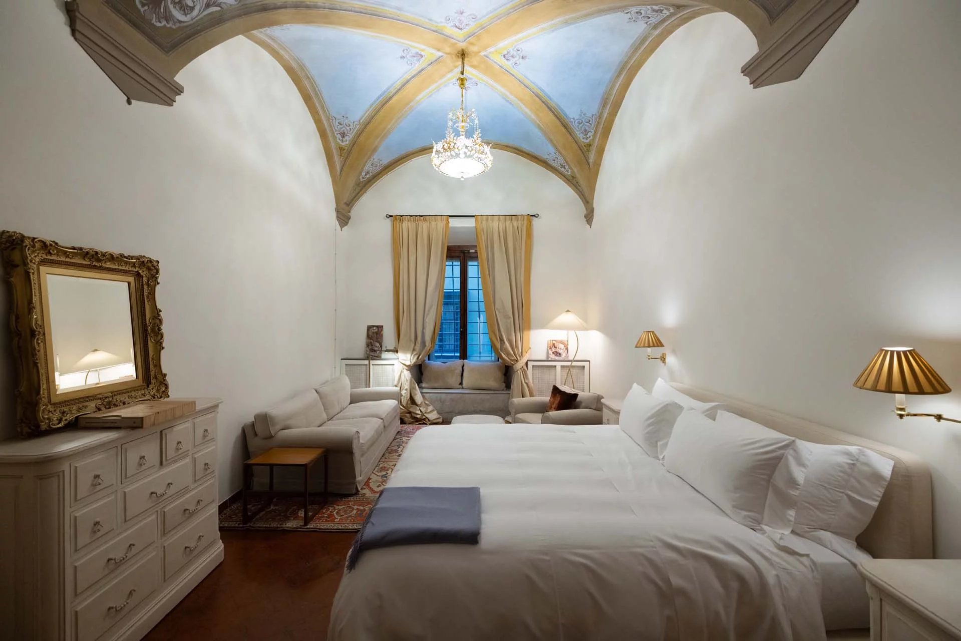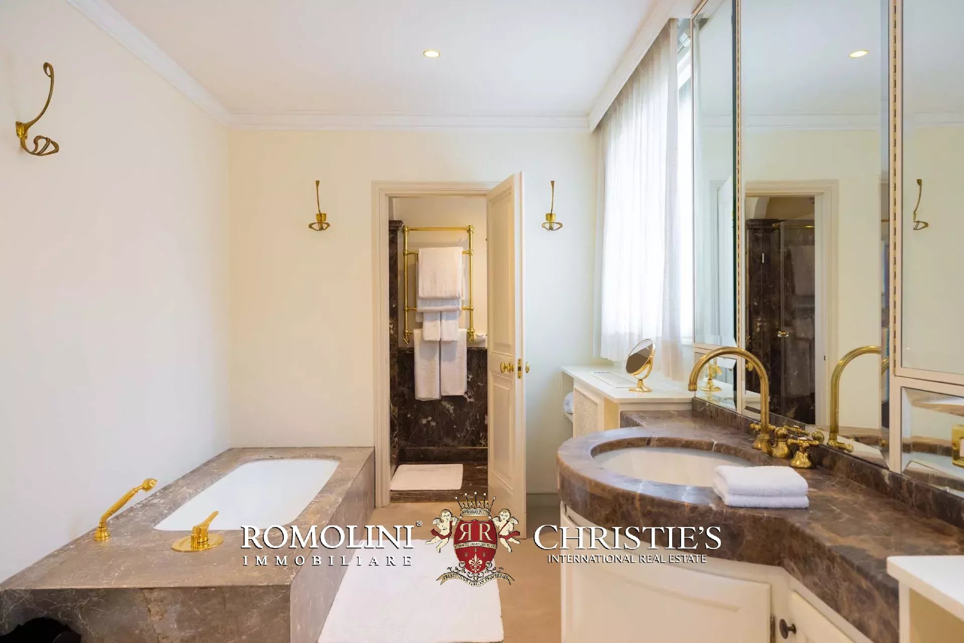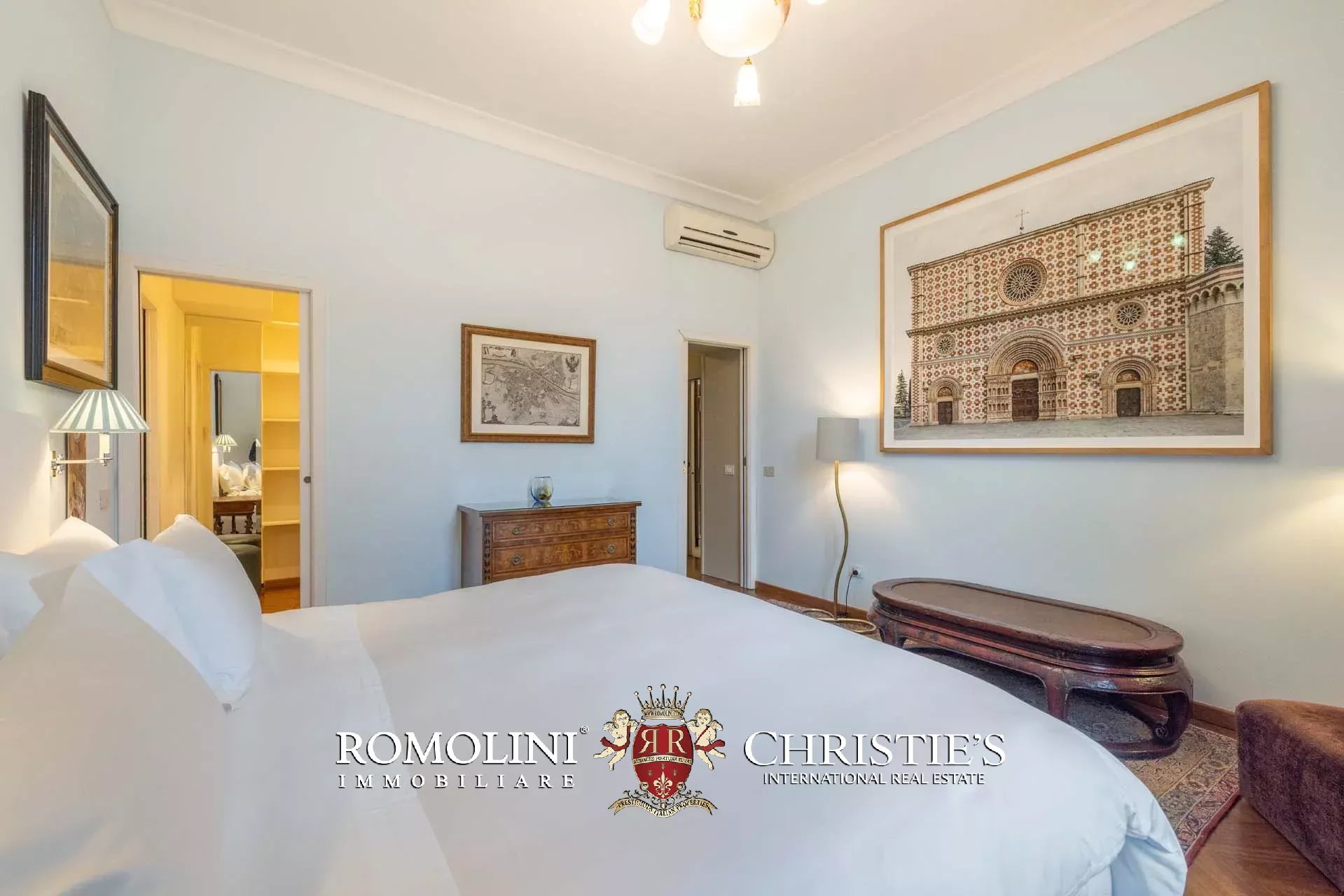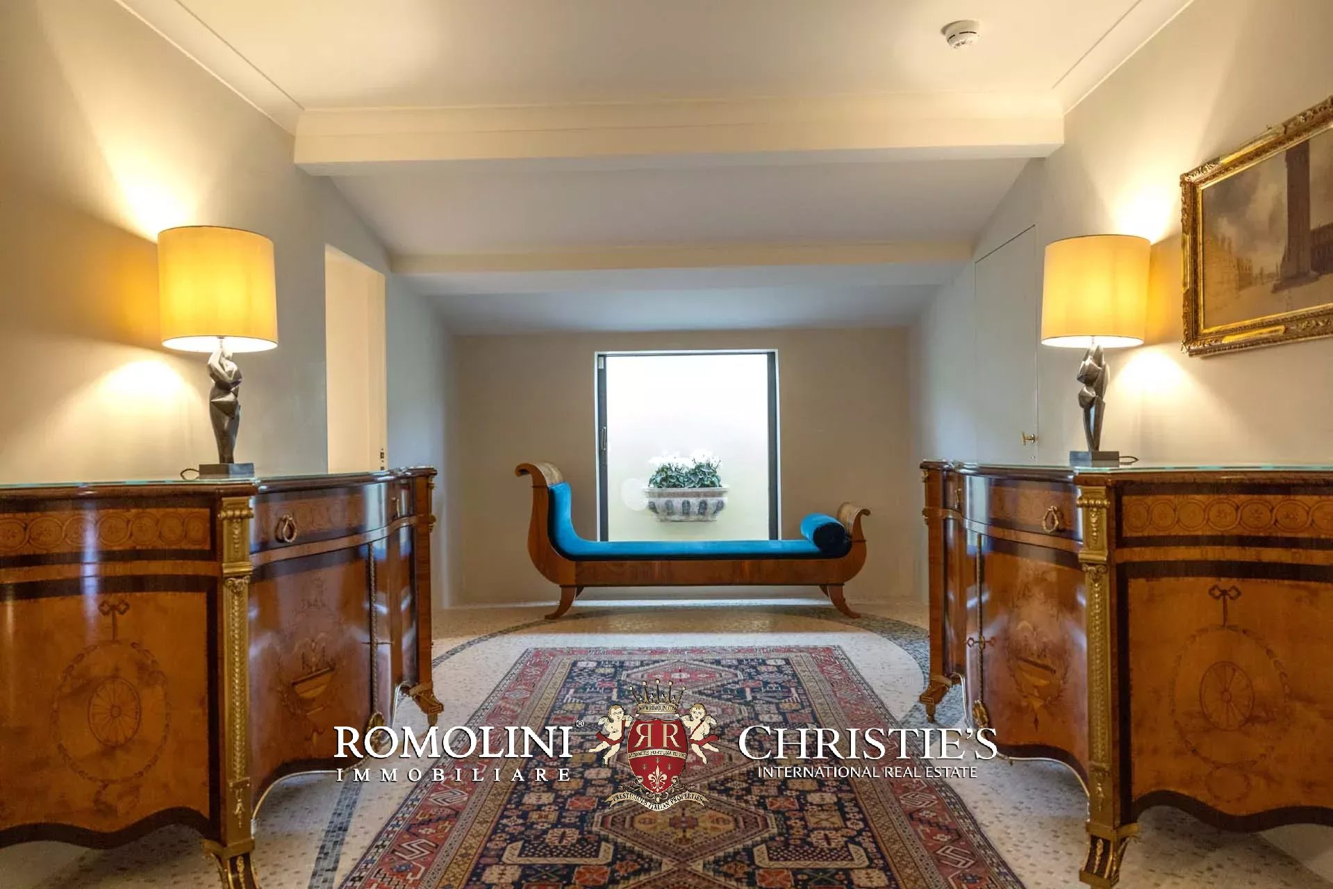 - Appartamento Vasari (257 m², 3 camere e 4 bagni): posta di fronte all’appartamento Donatello, questa unità si apre con un grande salone di rappresentanza corredato da un piccolo bagno di servizio. Da qui si passa poi alla sala da pranzo con cucina e a tre grandi camere, tutte dotate di bagno privato.