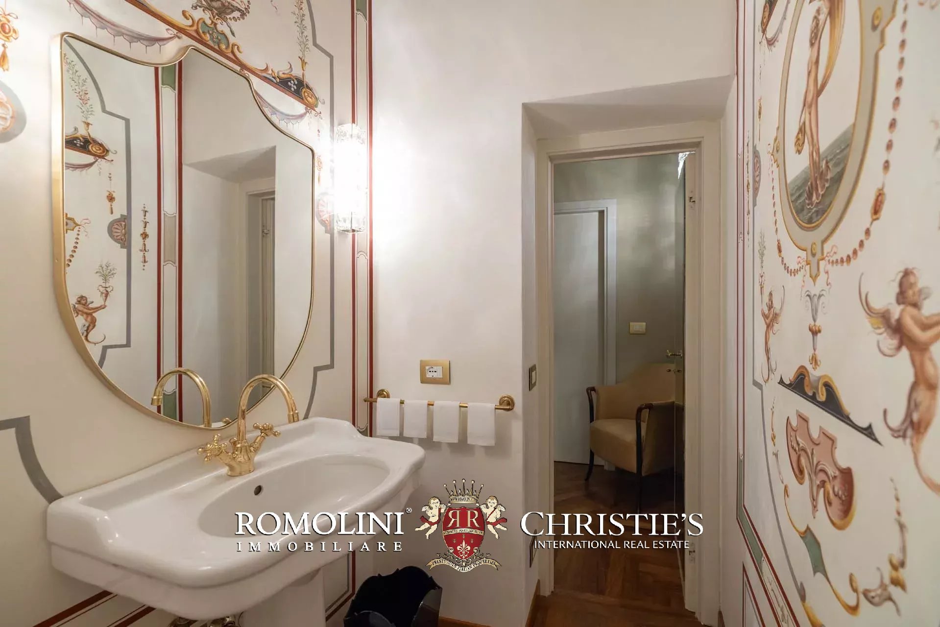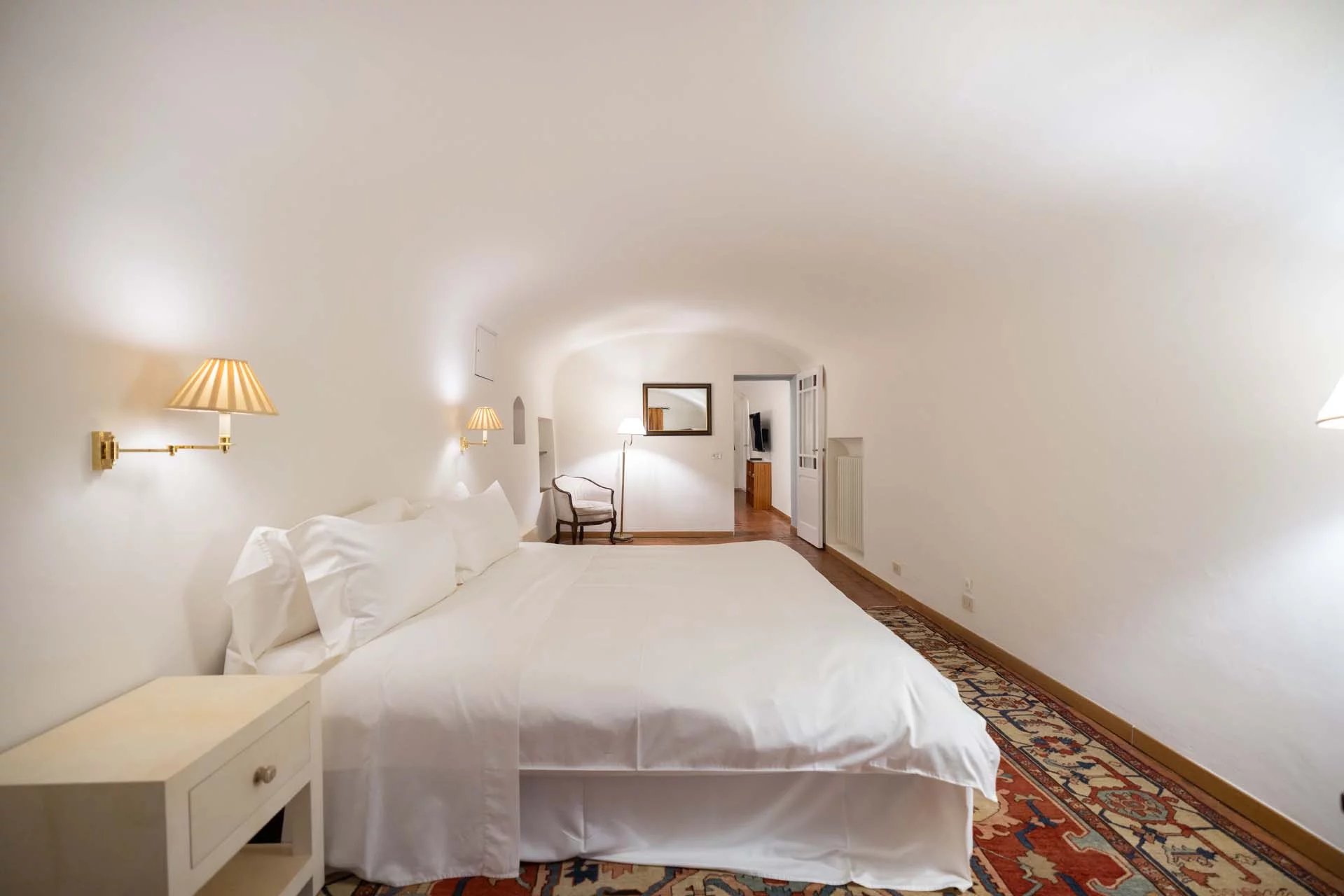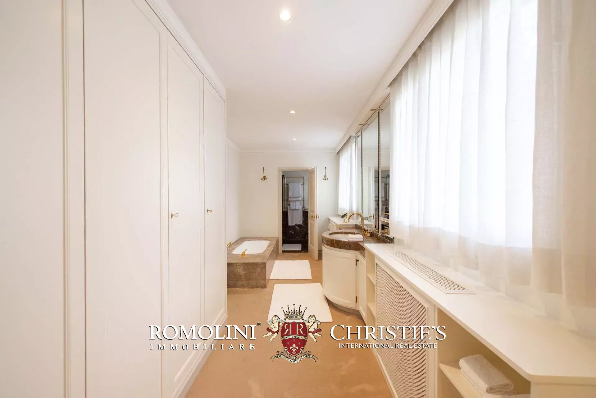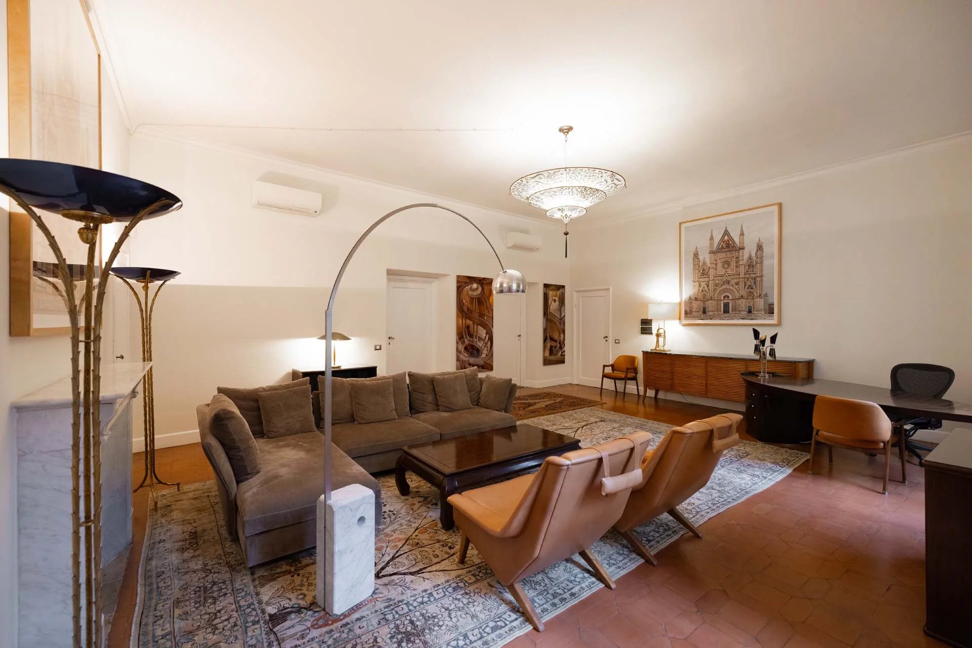 - Appartamento Vasari (257 m², 3 camere e 4 bagni): posta di fronte all’appartamento Donatello, questa unità si apre con un grande salone di rappresentanza corredato da un piccolo bagno di servizio. Da qui si passa poi alla sala da pranzo con cucina e a tre grandi camere, tutte dotate di bagno privato.