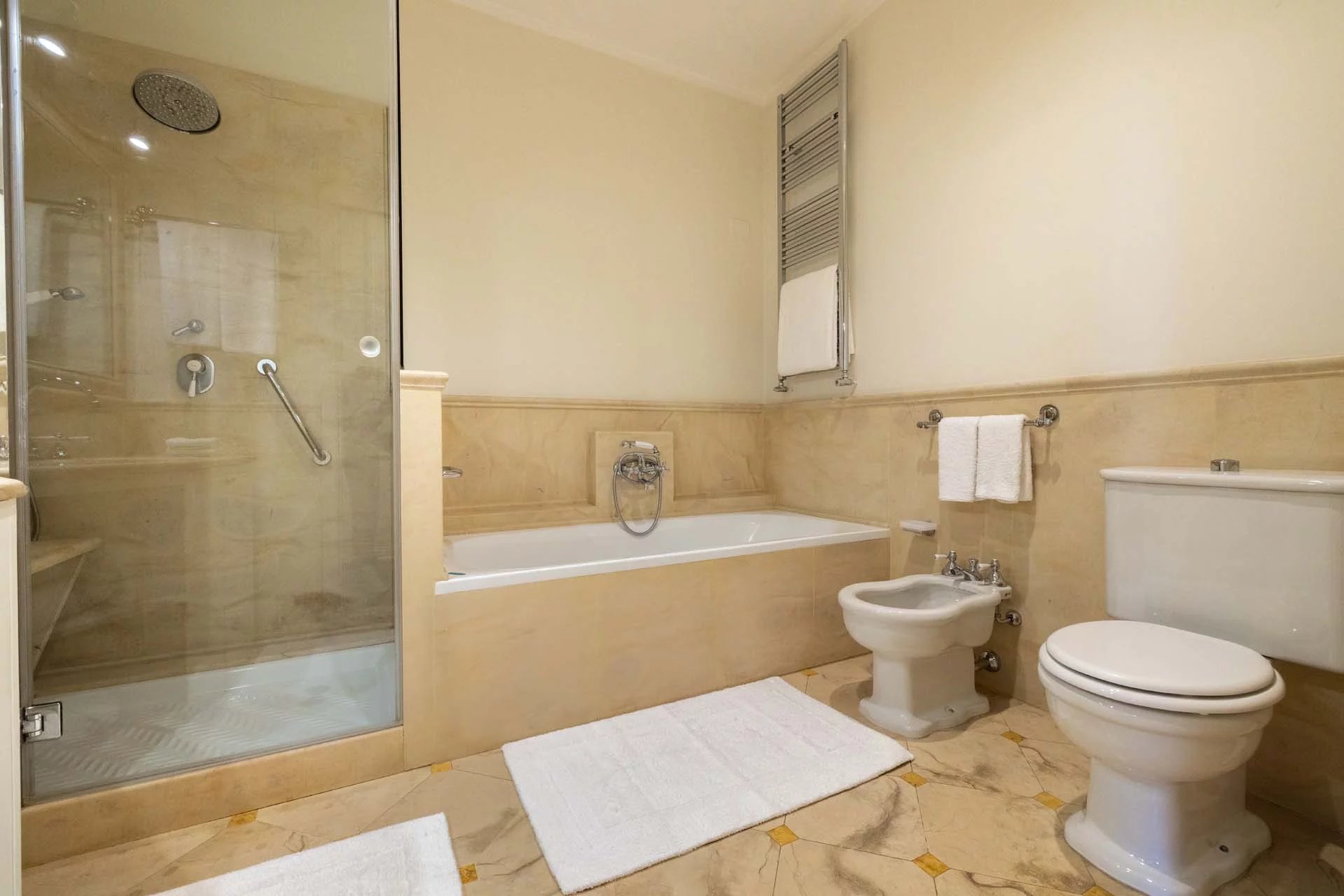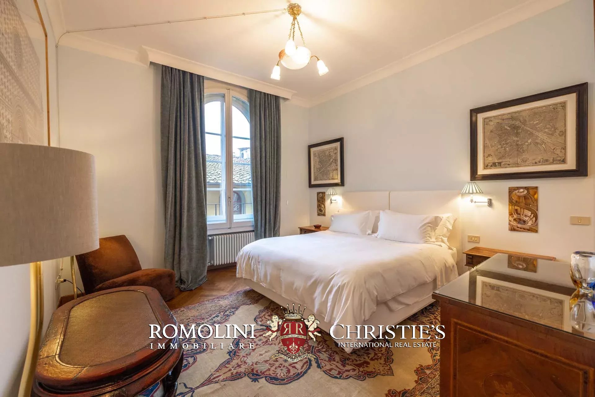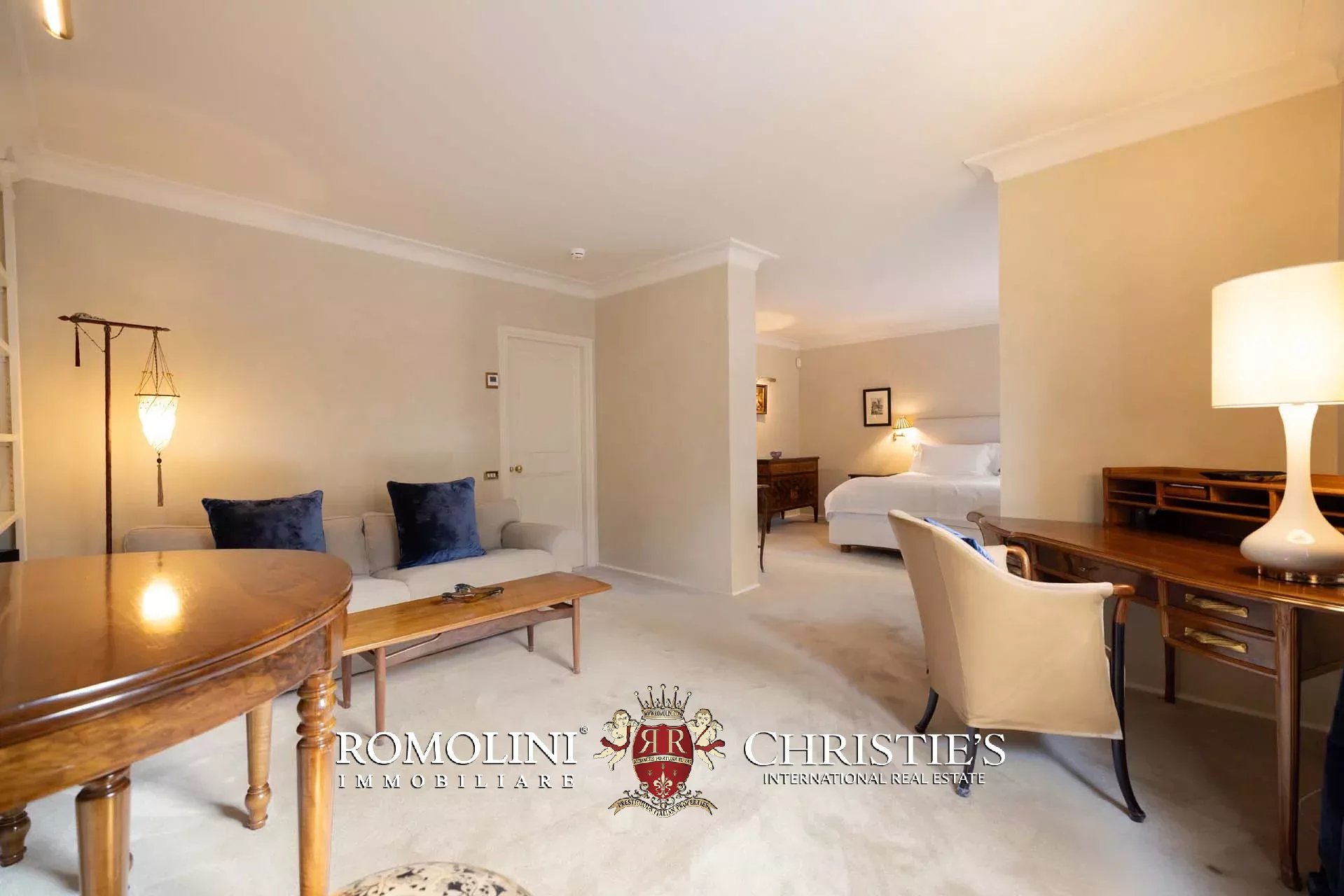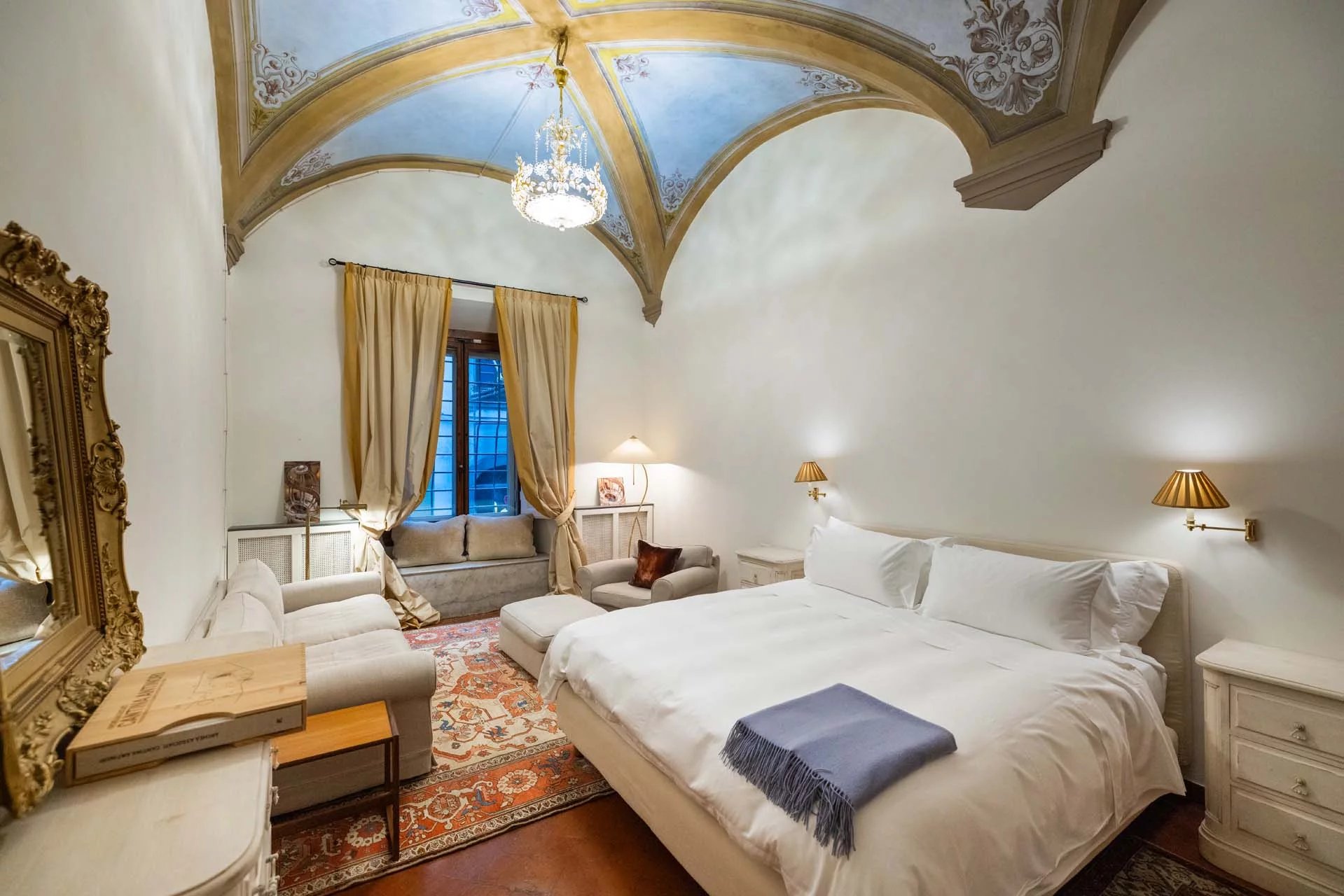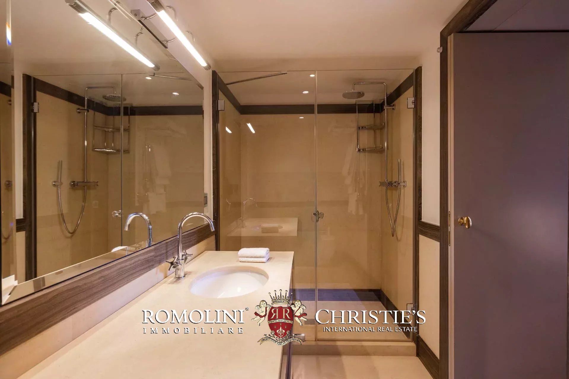 - Appartamento Vasari (257 m², 3 camere e 4 bagni): posta di fronte all’appartamento Donatello, questa unità si apre con un grande salone di rappresentanza corredato da un piccolo bagno di servizio. Da qui si passa poi alla sala da pranzo con cucina e a tre grandi camere, tutte dotate di bagno privato.