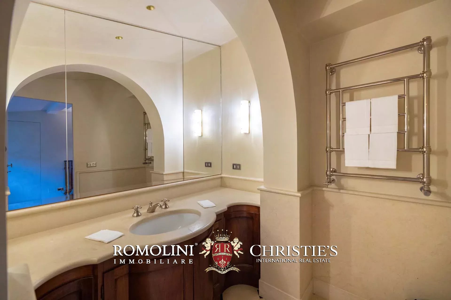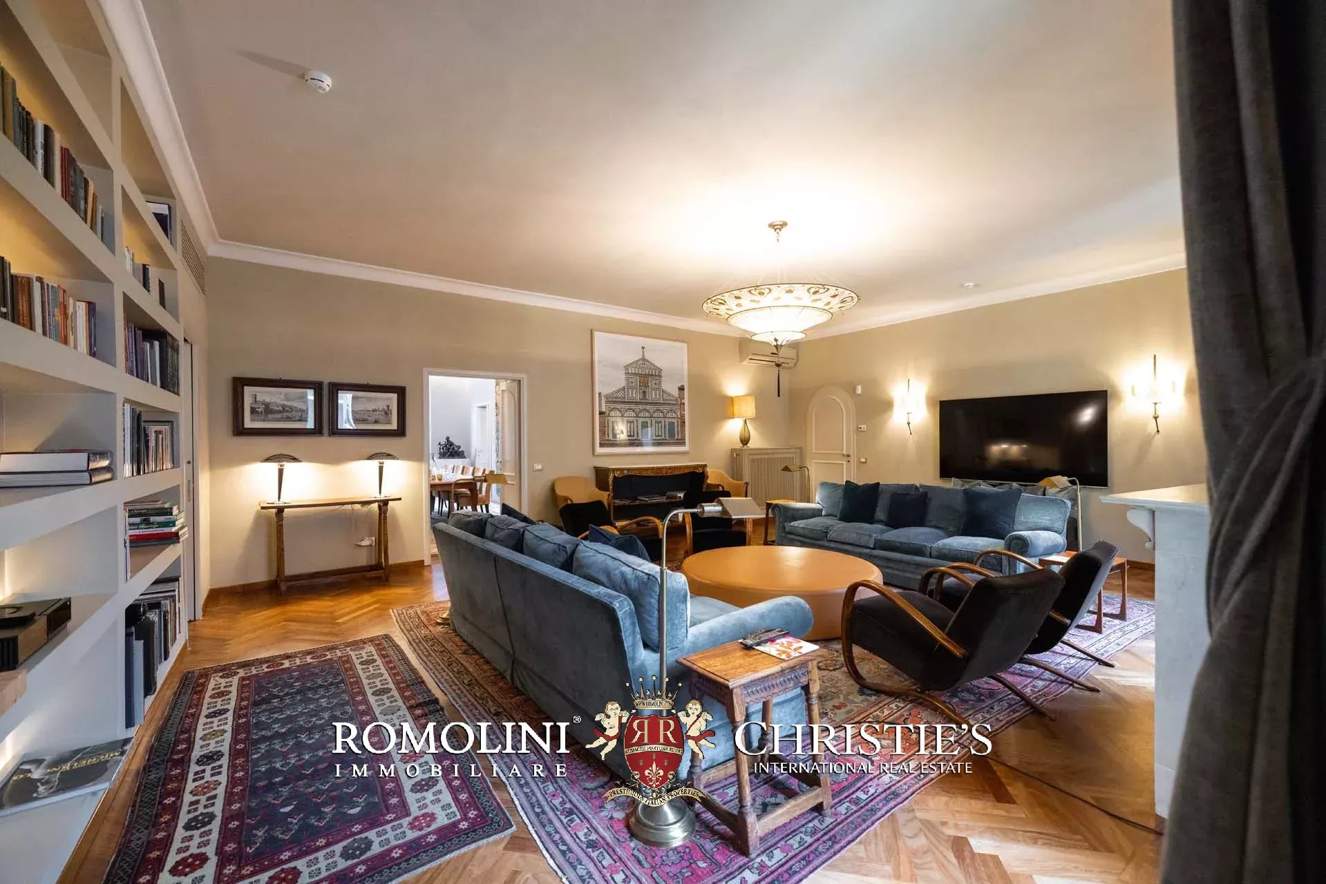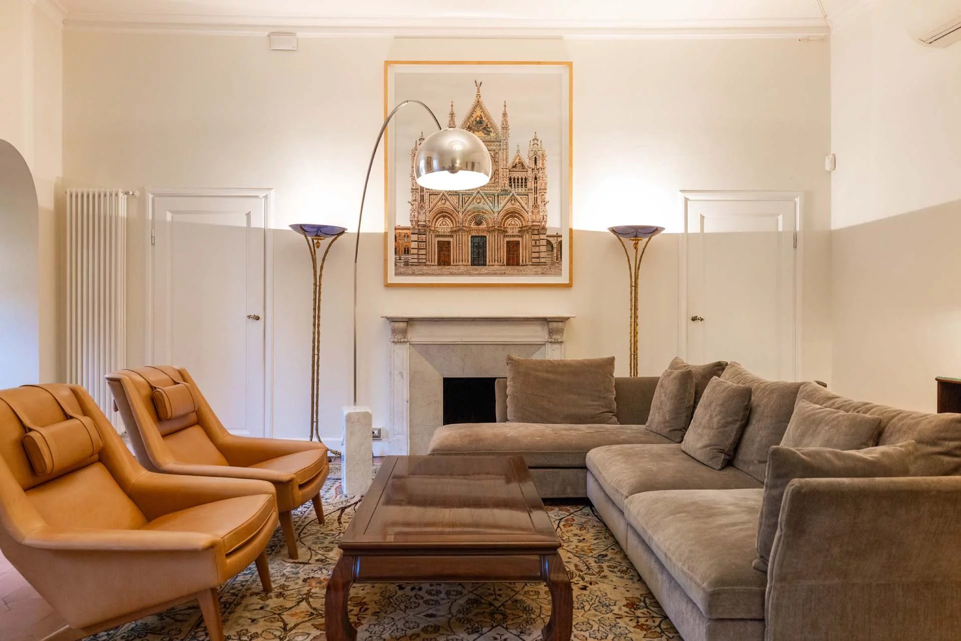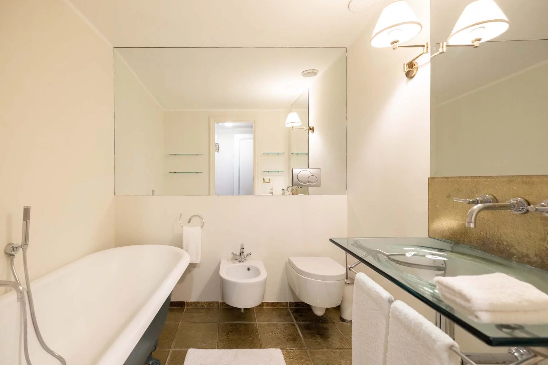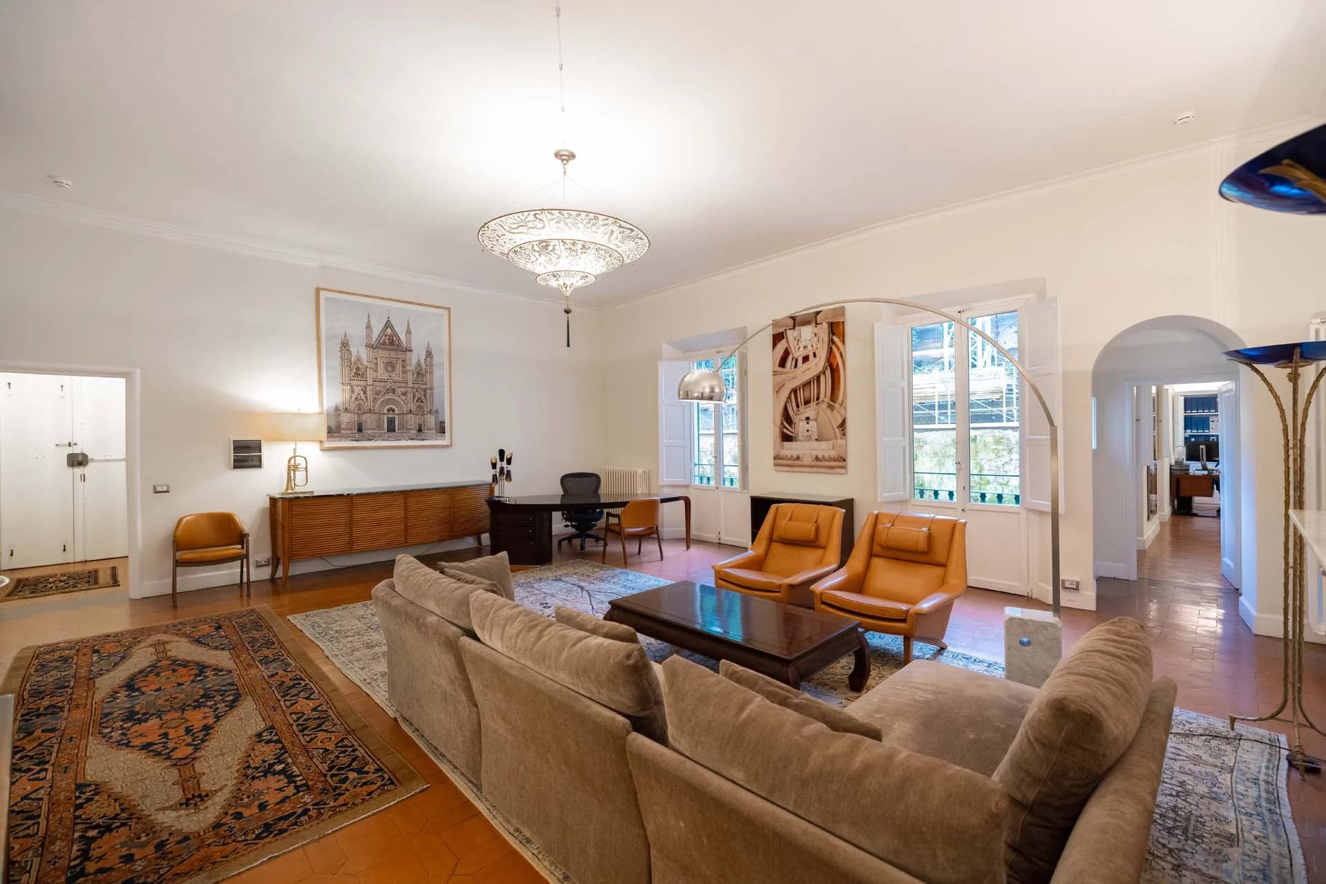- Appartamento Vasari (257 m², 3 camere e 4 bagni): posta di fronte all’appartamento Donatello, questa unità si apre con un grande salone di rappresentanza corredato da un piccolo bagno di servizio. Da qui si passa poi alla sala da pranzo con cucina e a tre grandi camere, tutte dotate di bagno privato.