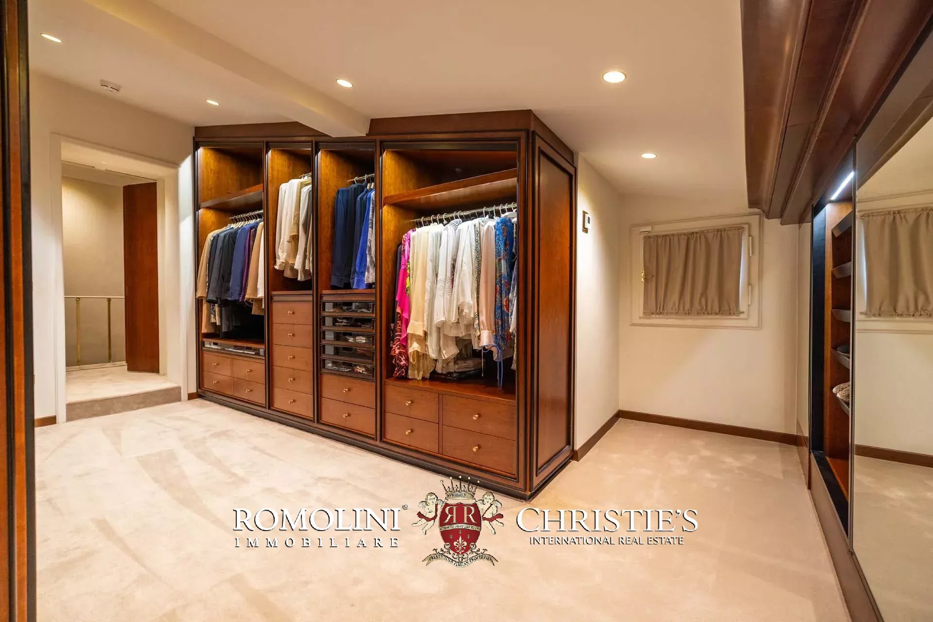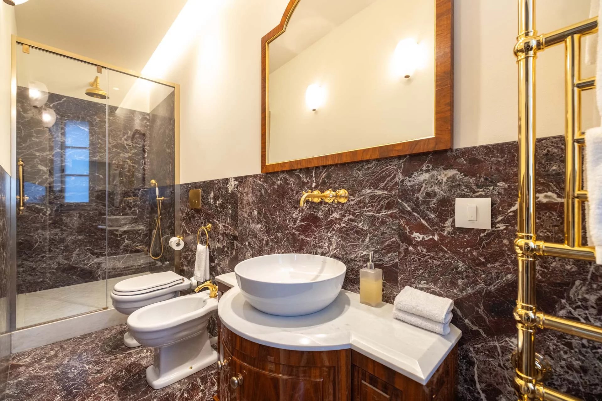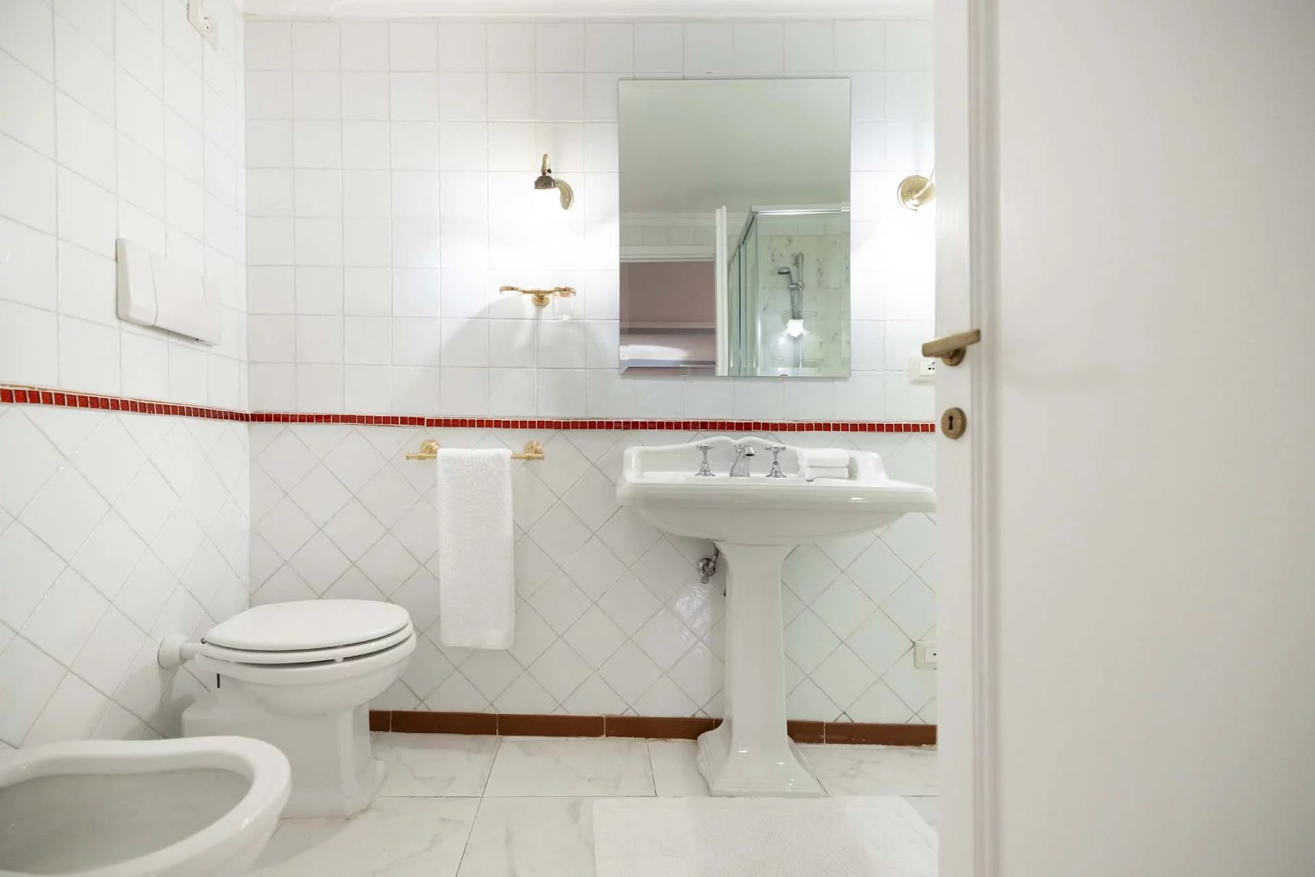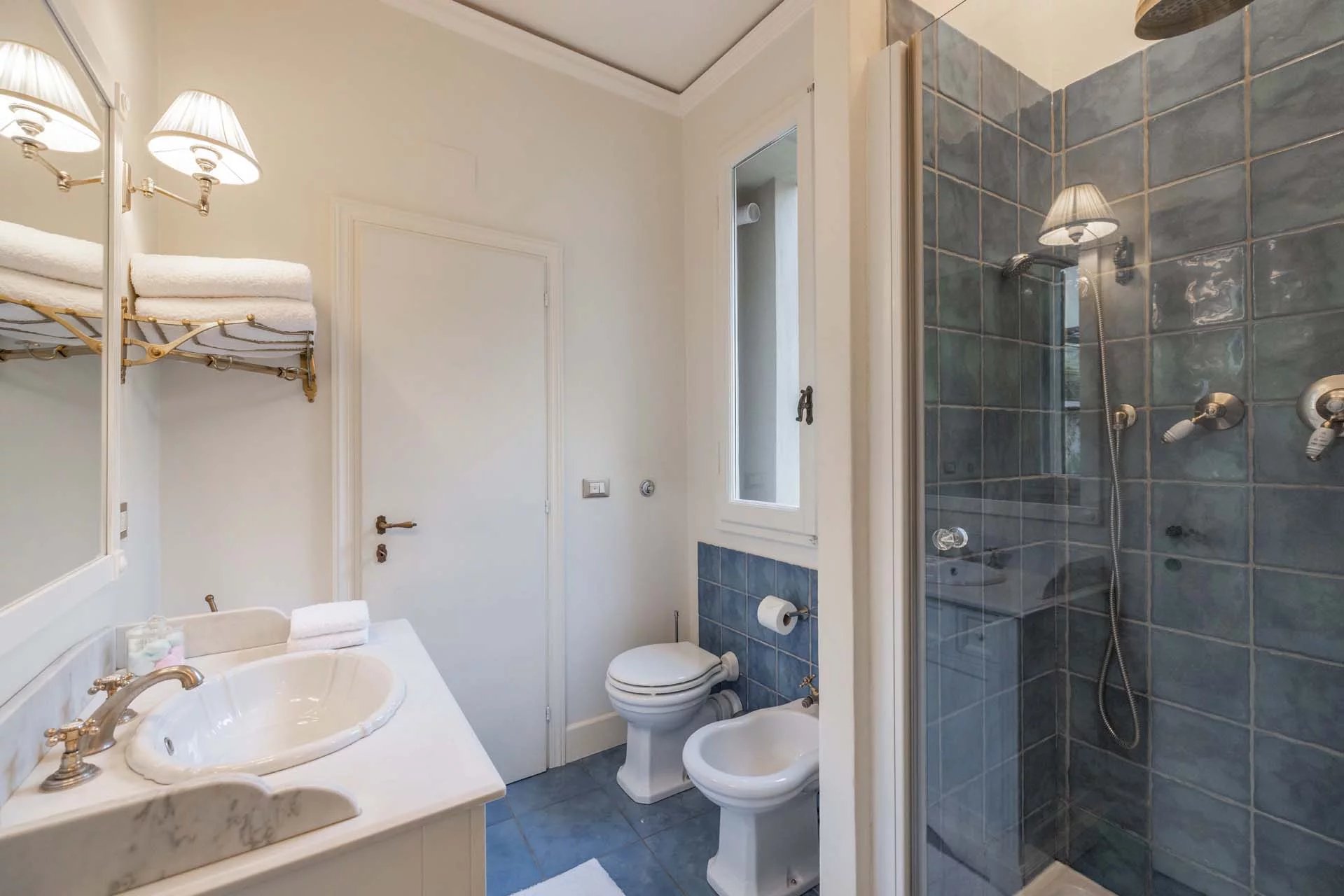 - Appartamento Vasari (257 m², 3 camere e 4 bagni): posta di fronte all’appartamento Donatello, questa unità si apre con un grande salone di rappresentanza corredato da un piccolo bagno di servizio. Da qui si passa poi alla sala da pranzo con cucina e a tre grandi camere, tutte dotate di bagno privato.