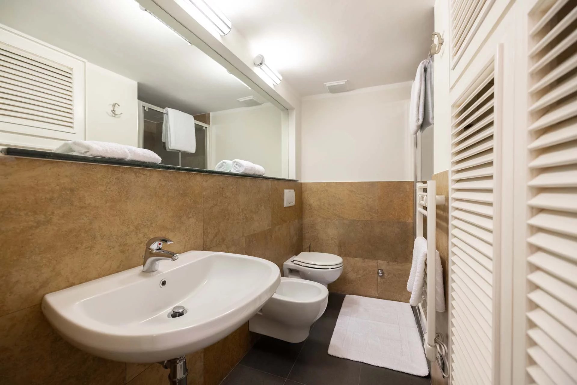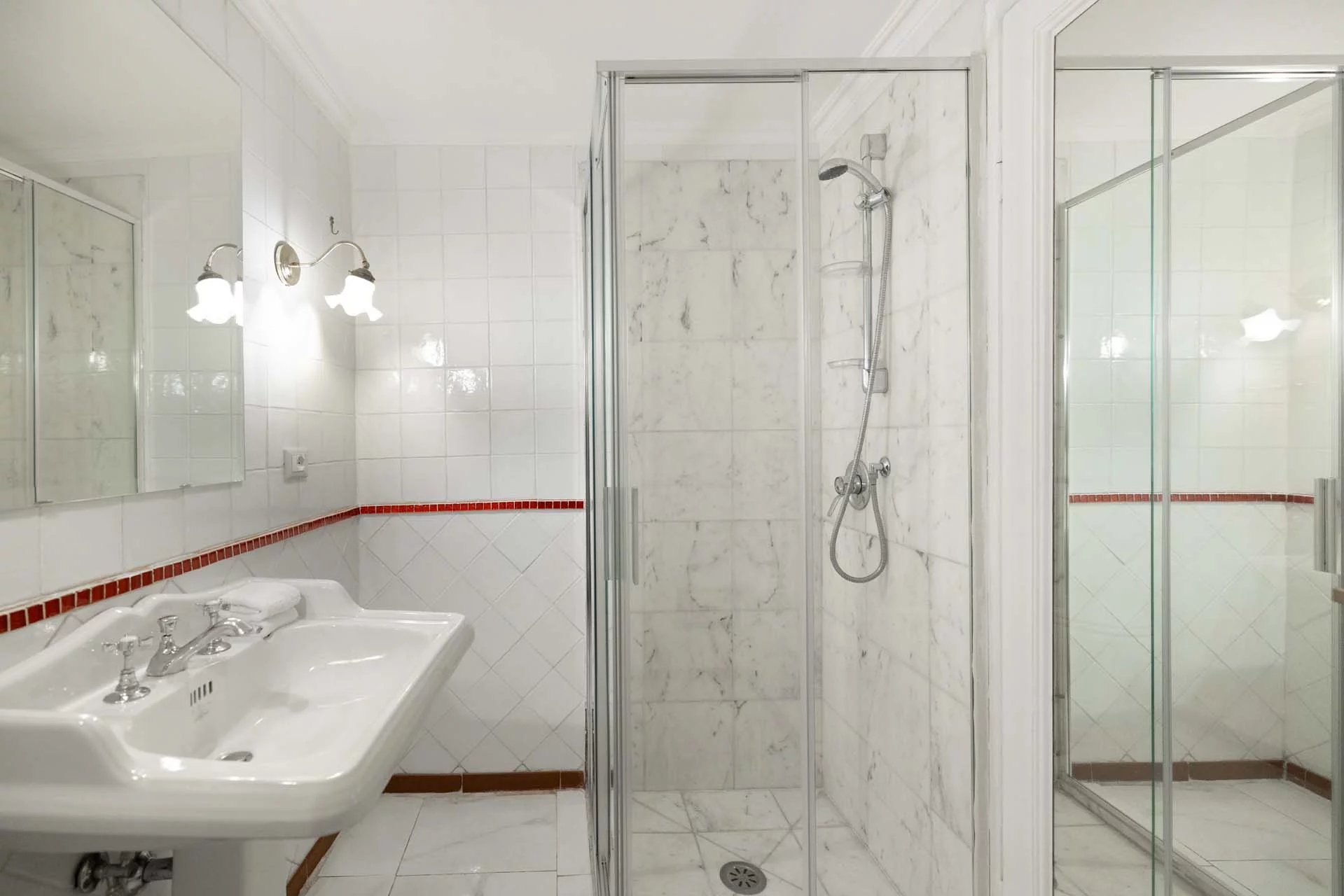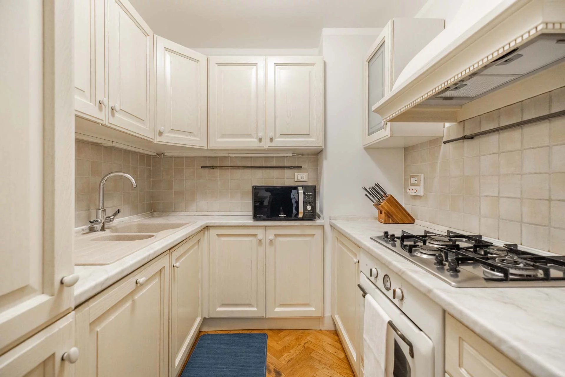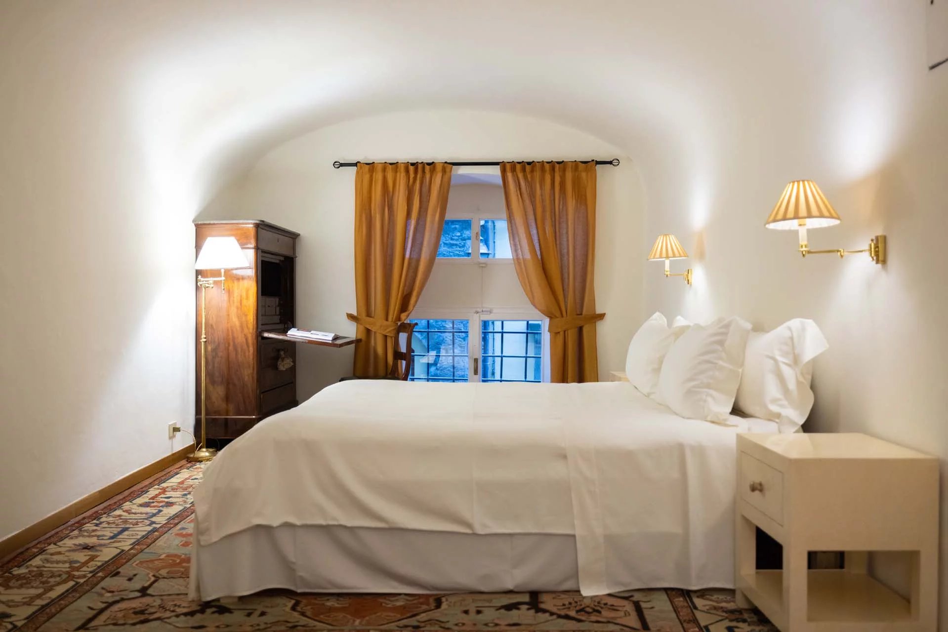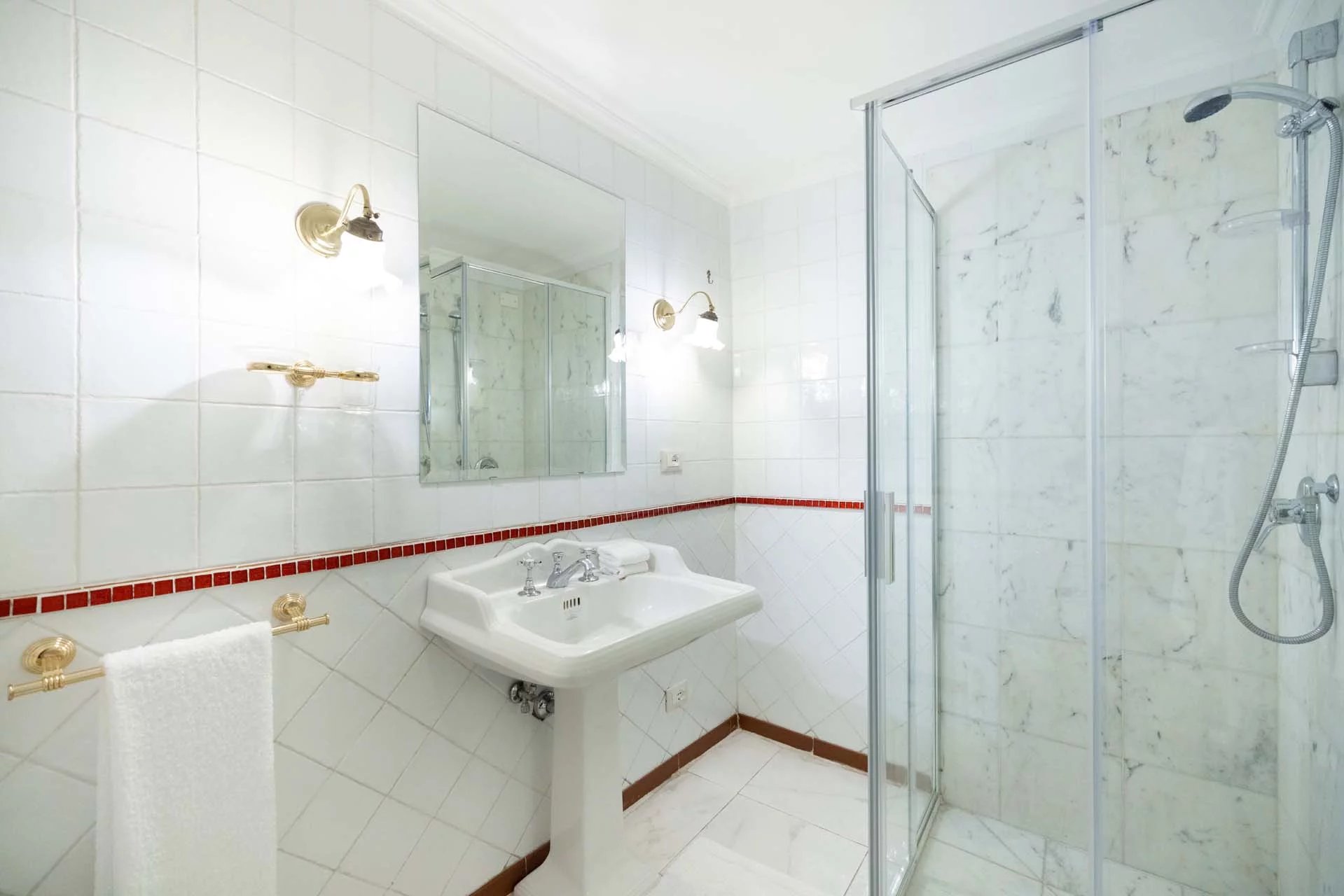 - Appartamento Vasari (257 m², 3 camere e 4 bagni): posta di fronte all’appartamento Donatello, questa unità si apre con un grande salone di rappresentanza corredato da un piccolo bagno di servizio. Da qui si passa poi alla sala da pranzo con cucina e a tre grandi camere, tutte dotate di bagno privato.