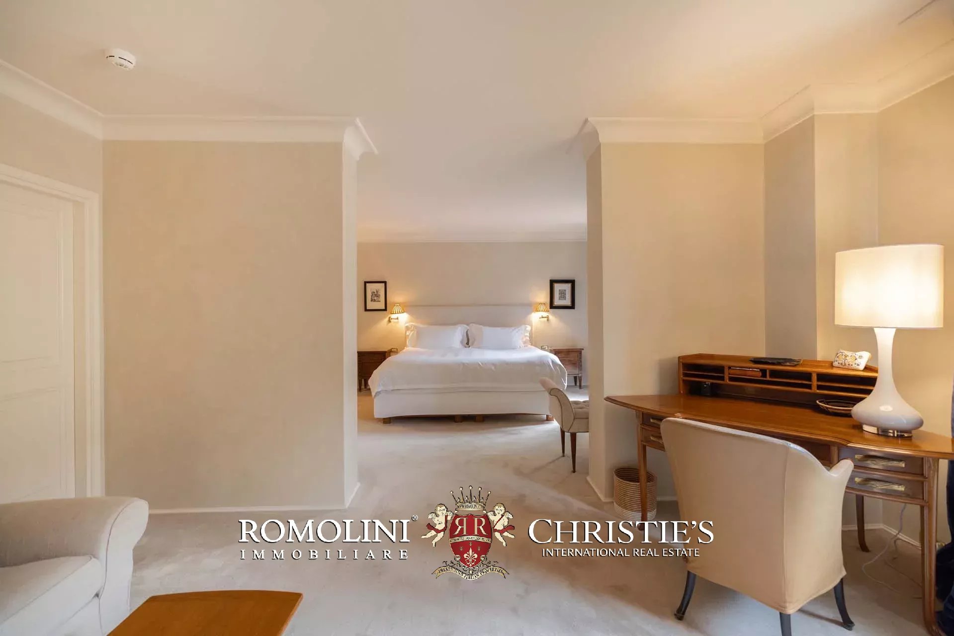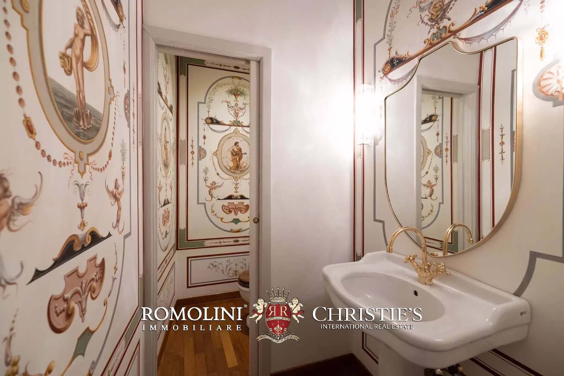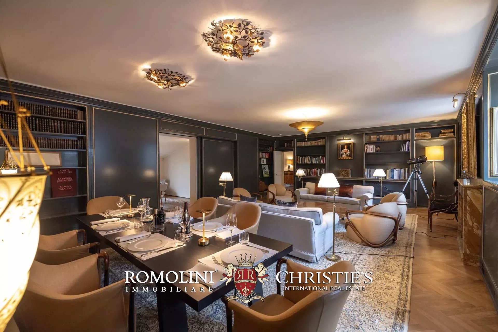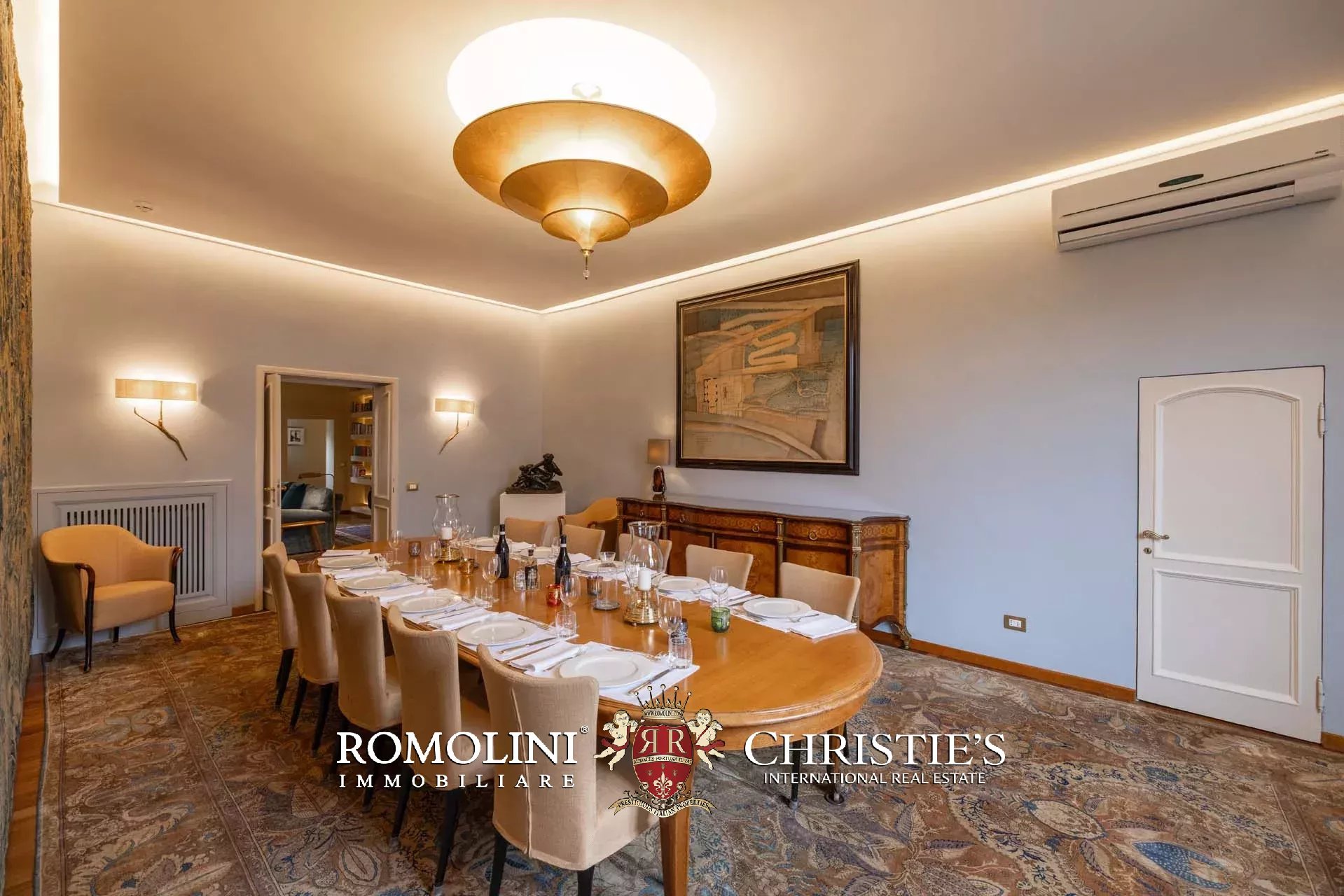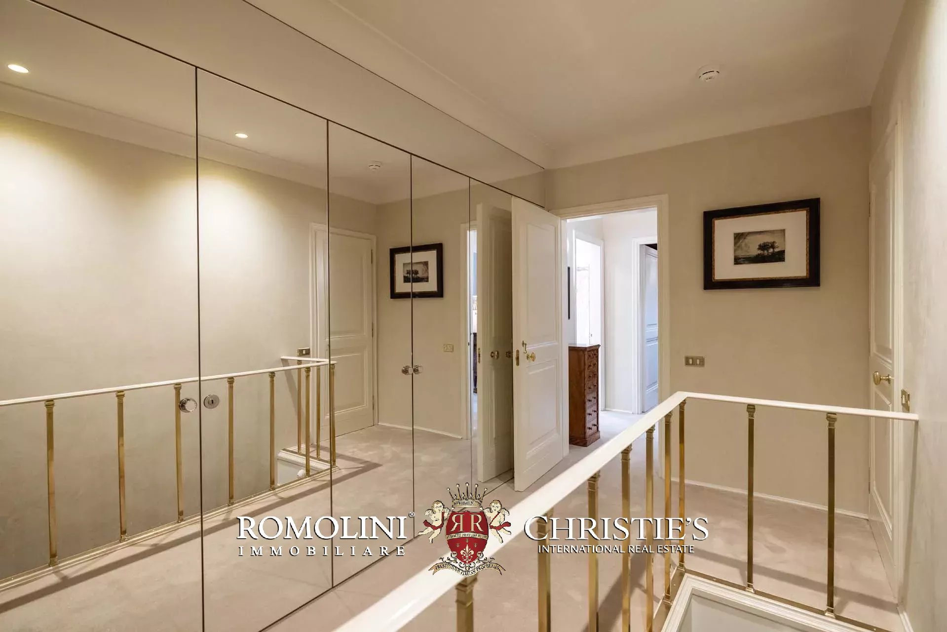 - Appartamento Botticelli (264 m², 3 camere e 4 bagni): accanto all’appartamento Leonardo, questa unità si apre con un piccolo ingresso collegato al grande salone di rappresentanza con bagno di servizio. A fianco della sala si trovano la zona pranzo e la cucina con dispensa, mentre agli angoli due porte conducono a tre camere con bagno en-suite e cabina armadio (una delle camere è accessibile scendendo una breve scala).