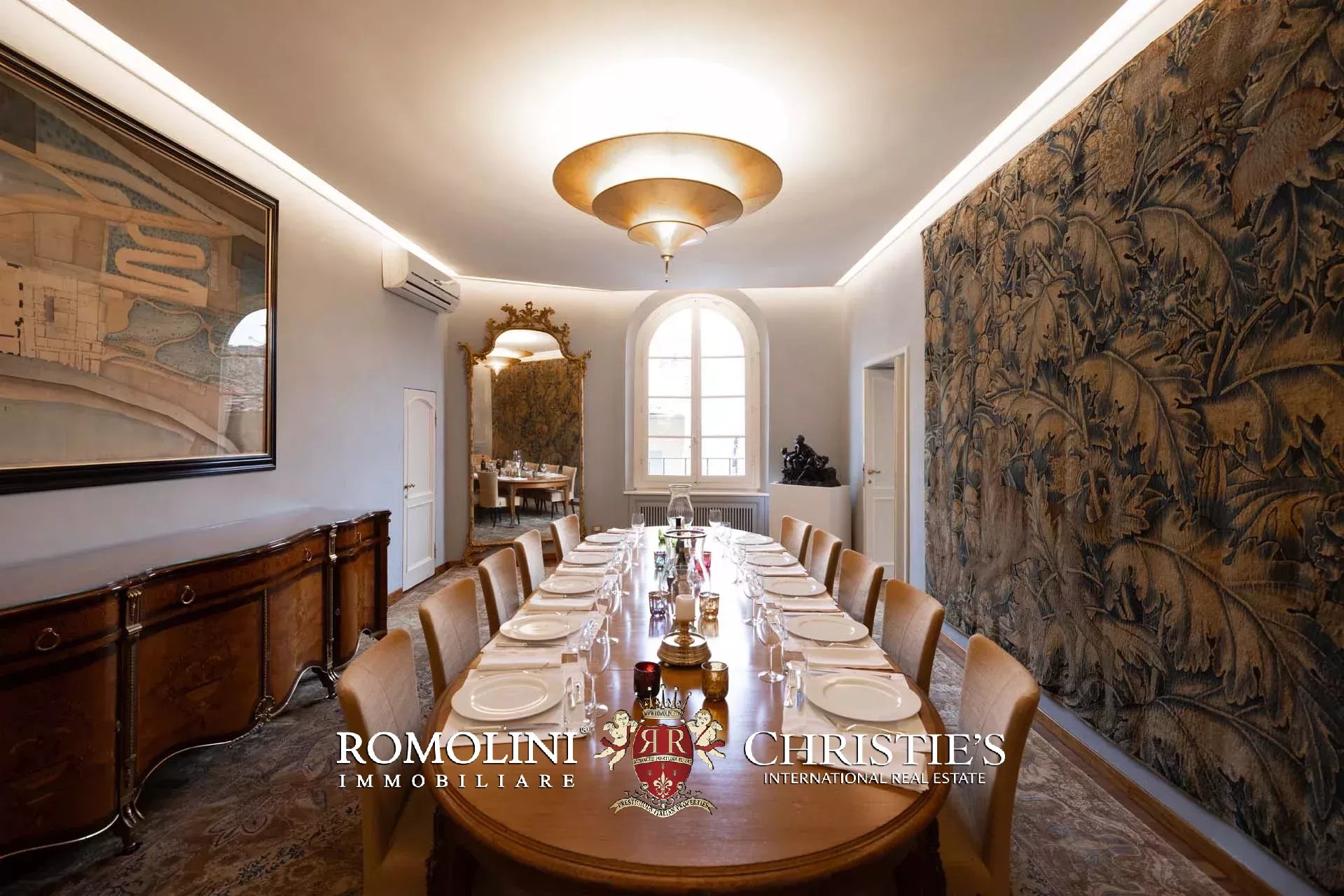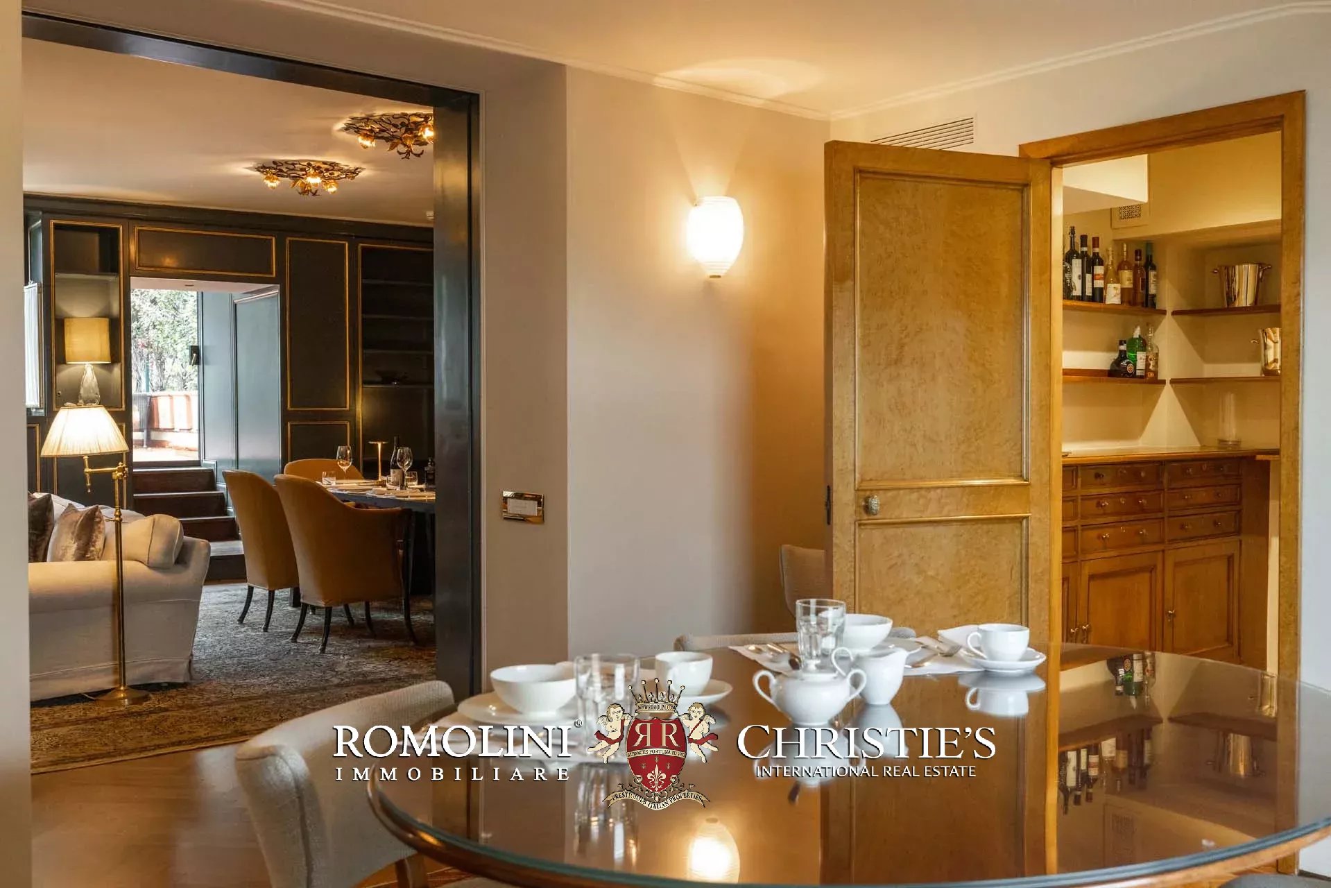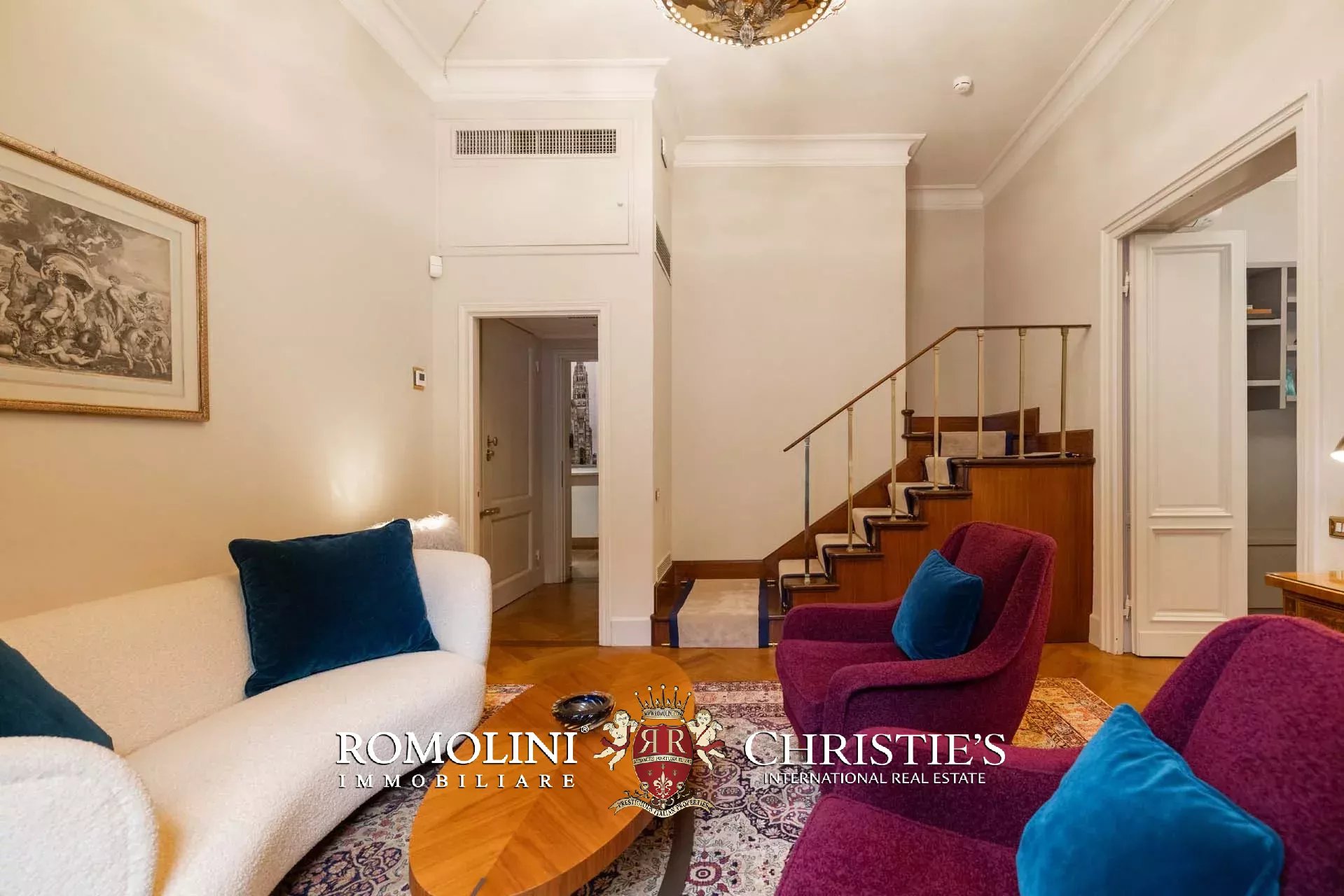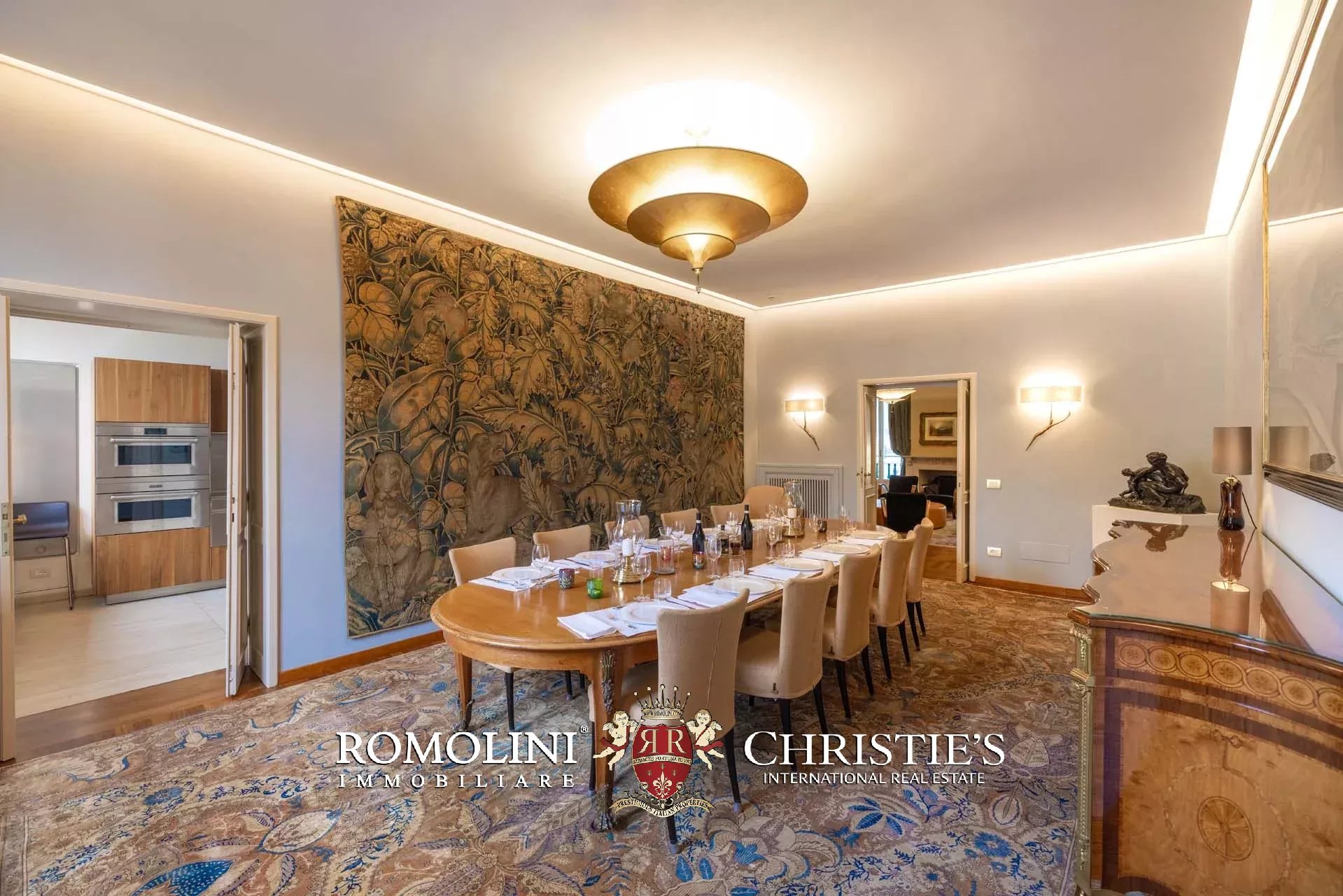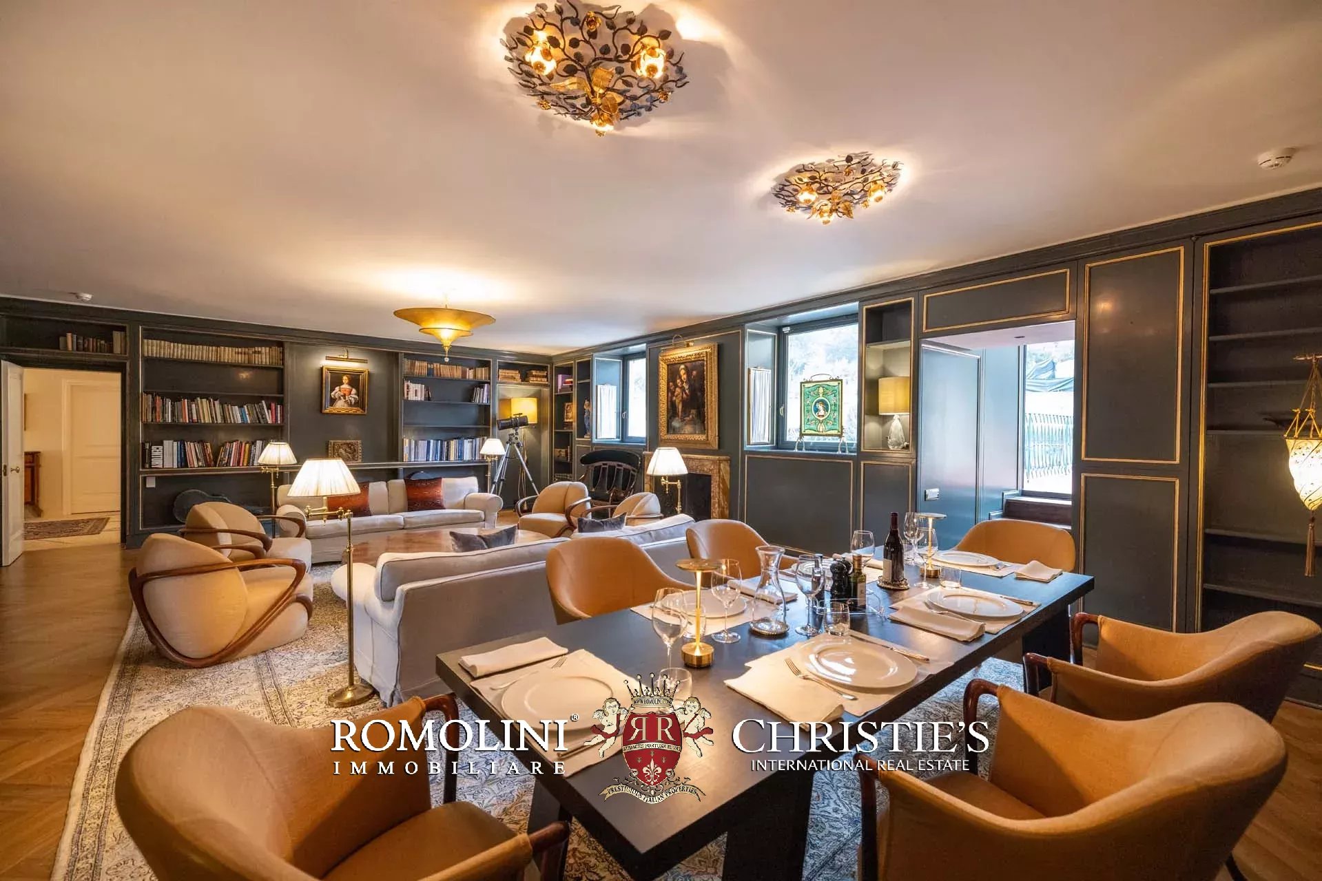 - Appartamento Botticelli (264 m², 3 camere e 4 bagni): accanto all’appartamento Leonardo, questa unità si apre con un piccolo ingresso collegato al grande salone di rappresentanza con bagno di servizio. A fianco della sala si trovano la zona pranzo e la cucina con dispensa, mentre agli angoli due porte conducono a tre camere con bagno en-suite e cabina armadio (una delle camere è accessibile scendendo una breve scala).