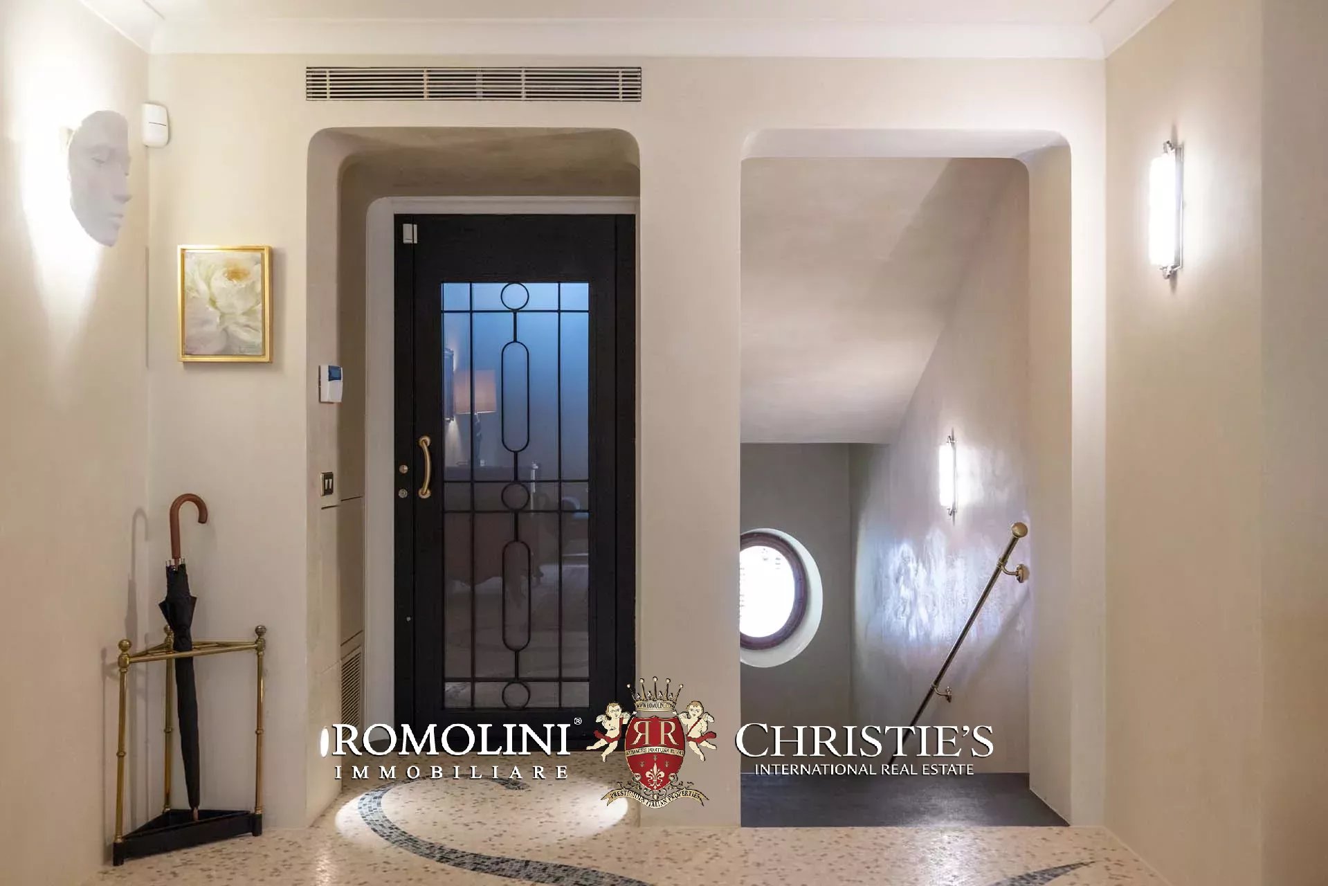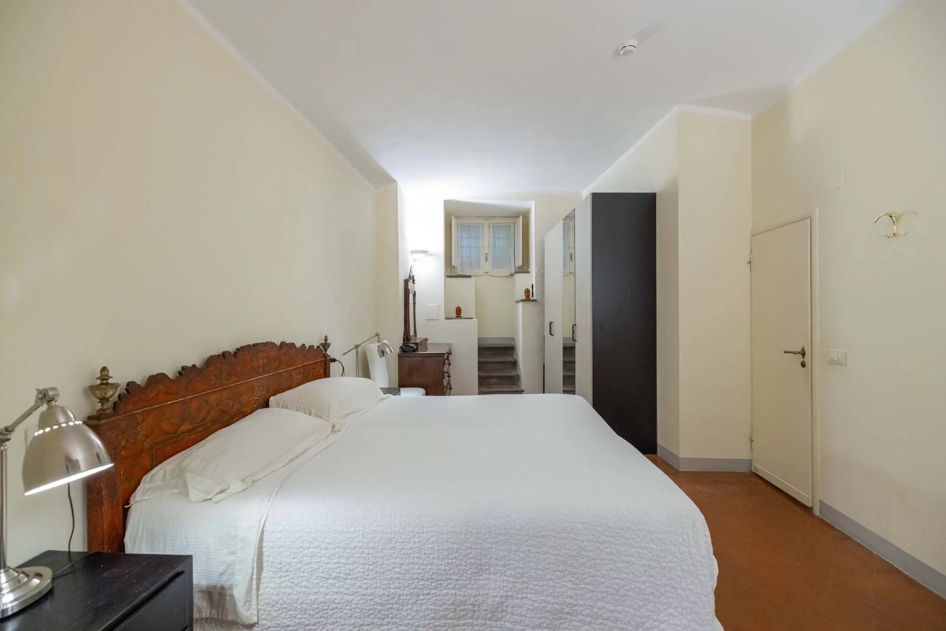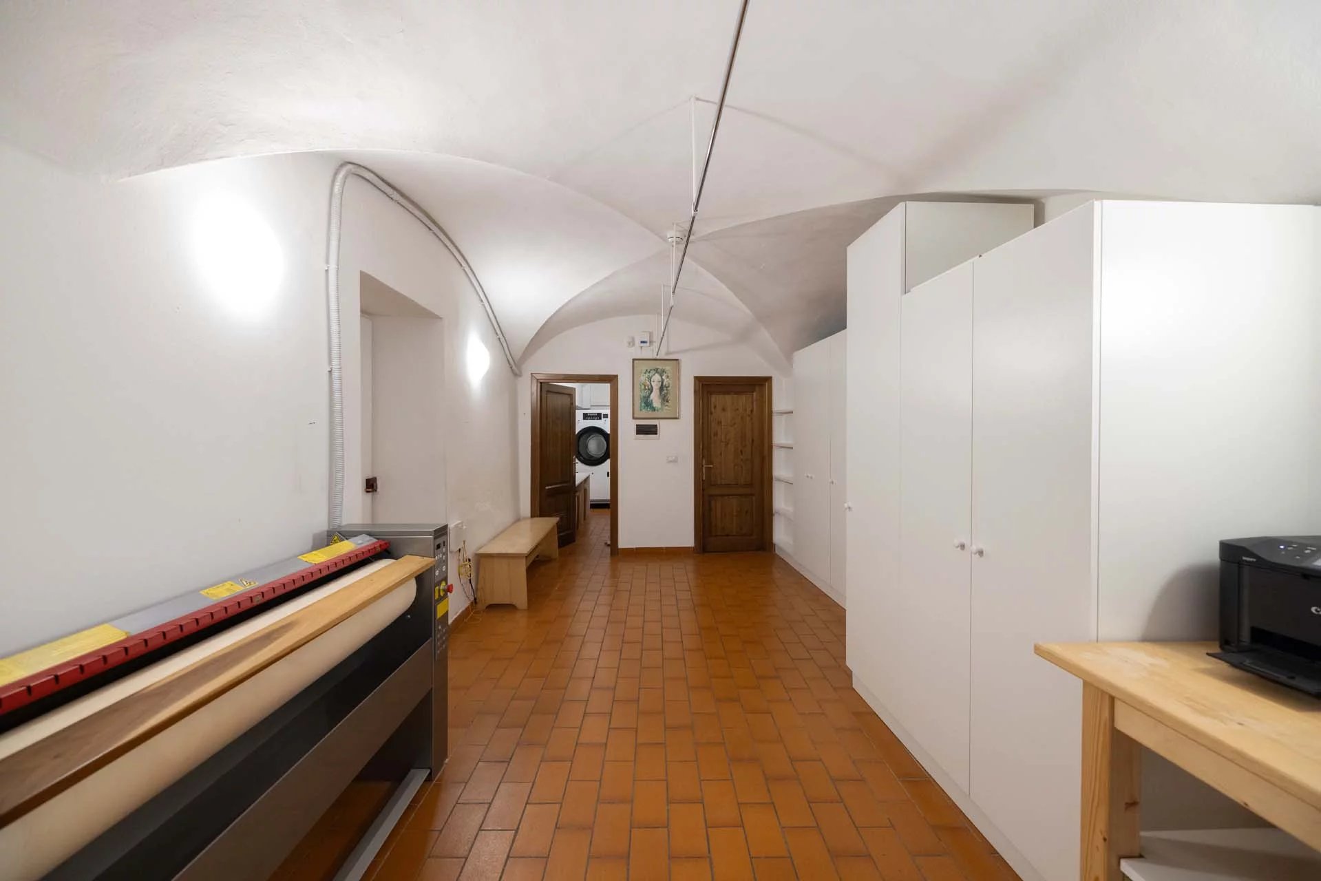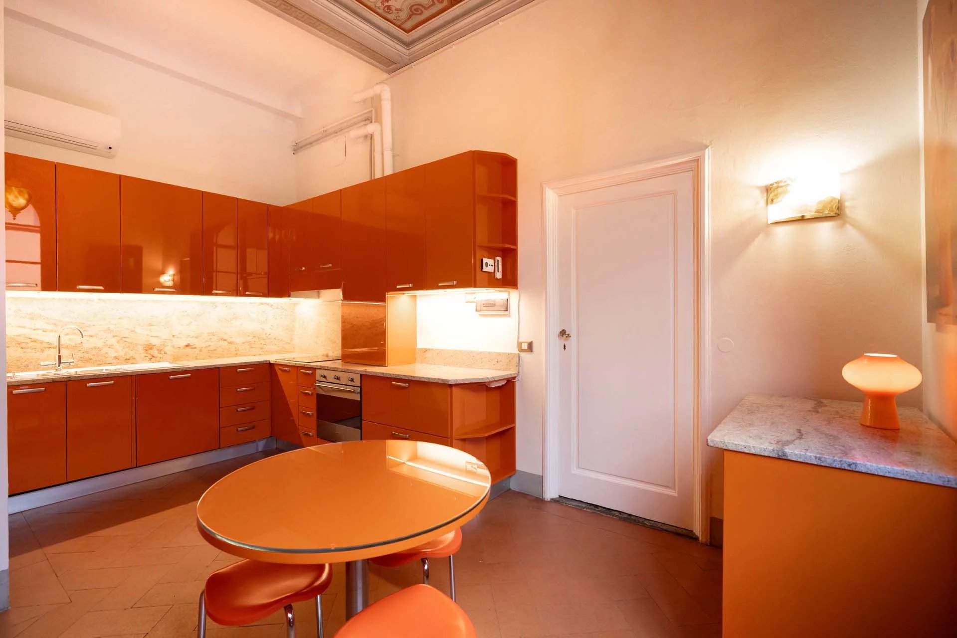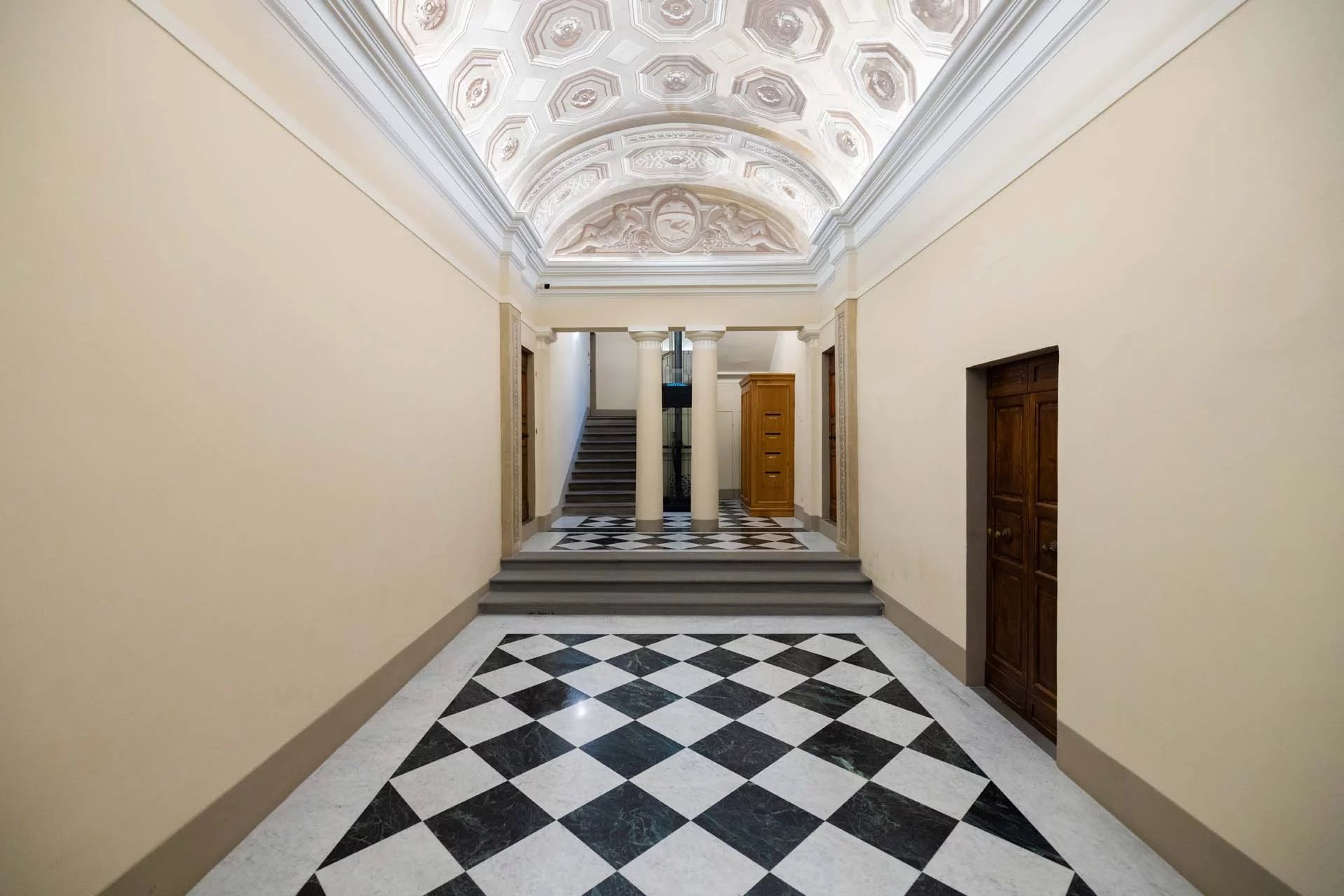 - Appartamento Giotto (147 m², 1 camera e 2 bagni): sempre al piano terra, l’unità è accessibile direttamente dalla strada o dall’androne condominiale e viene attualmente usata dai custodi della proprietà. Le due porte si aprono su un salotto con bagno, collegato posteriormente alla lavanderia. Salendo una scala interna si arriva alla sala da pranzo con annessa cucina e alla camera con bagno e cabina armadio.