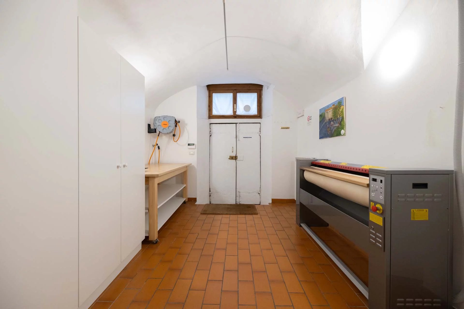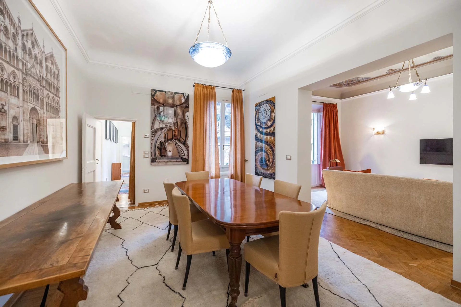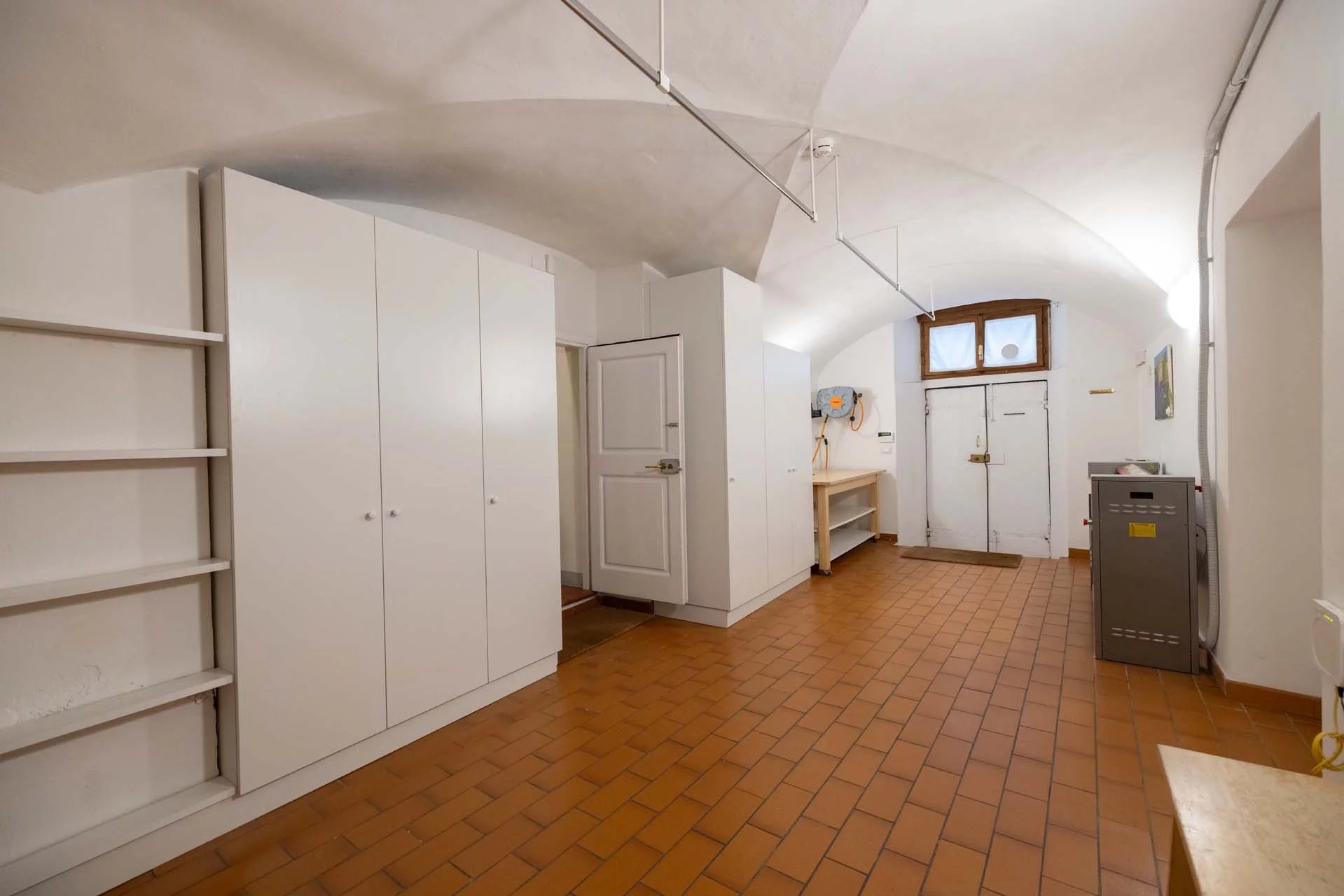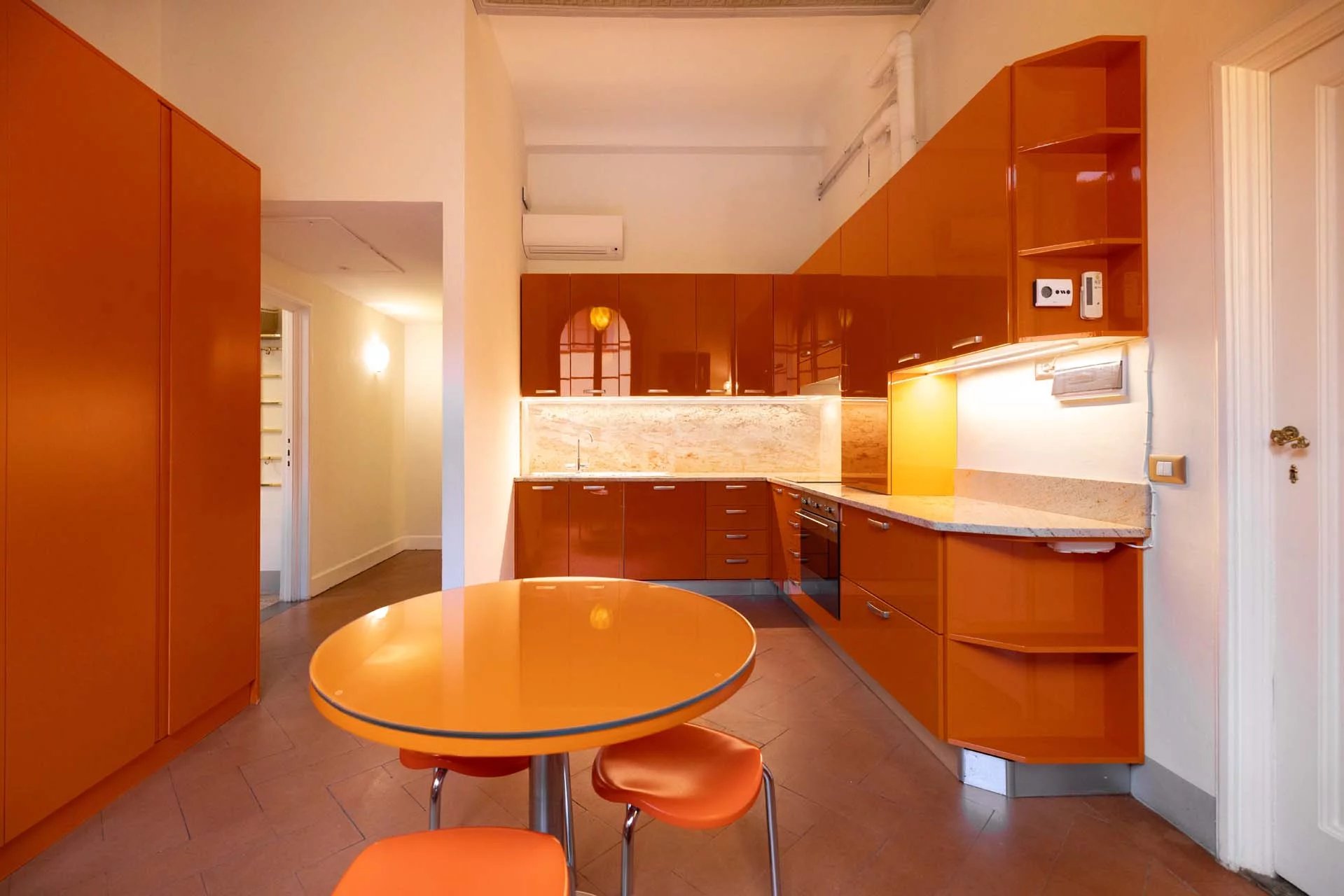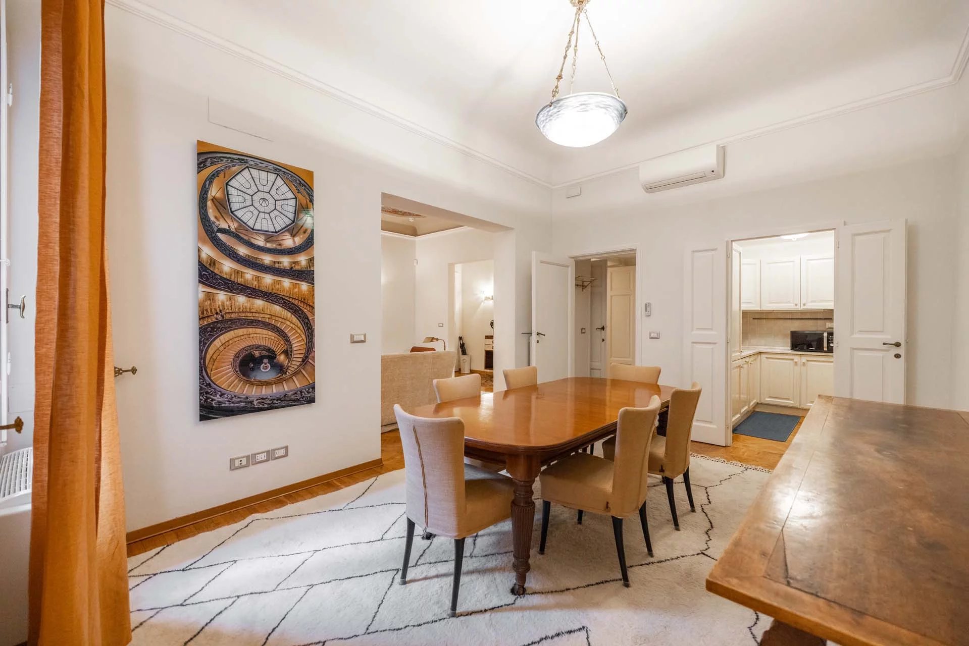 - Appartamento Giotto (147 m², 1 camera e 2 bagni): sempre al piano terra, l’unità è accessibile direttamente dalla strada o dall’androne condominiale e viene attualmente usata dai custodi della proprietà. Le due porte si aprono su un salotto con bagno, collegato posteriormente alla lavanderia. Salendo una scala interna si arriva alla sala da pranzo con annessa cucina e alla camera con bagno e cabina armadio.